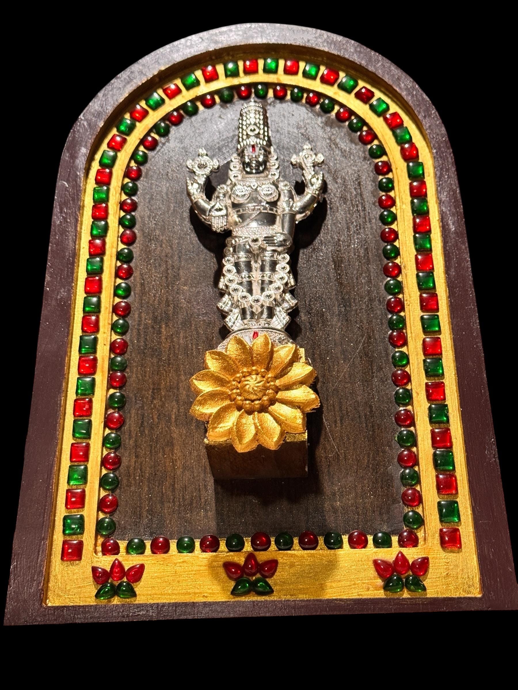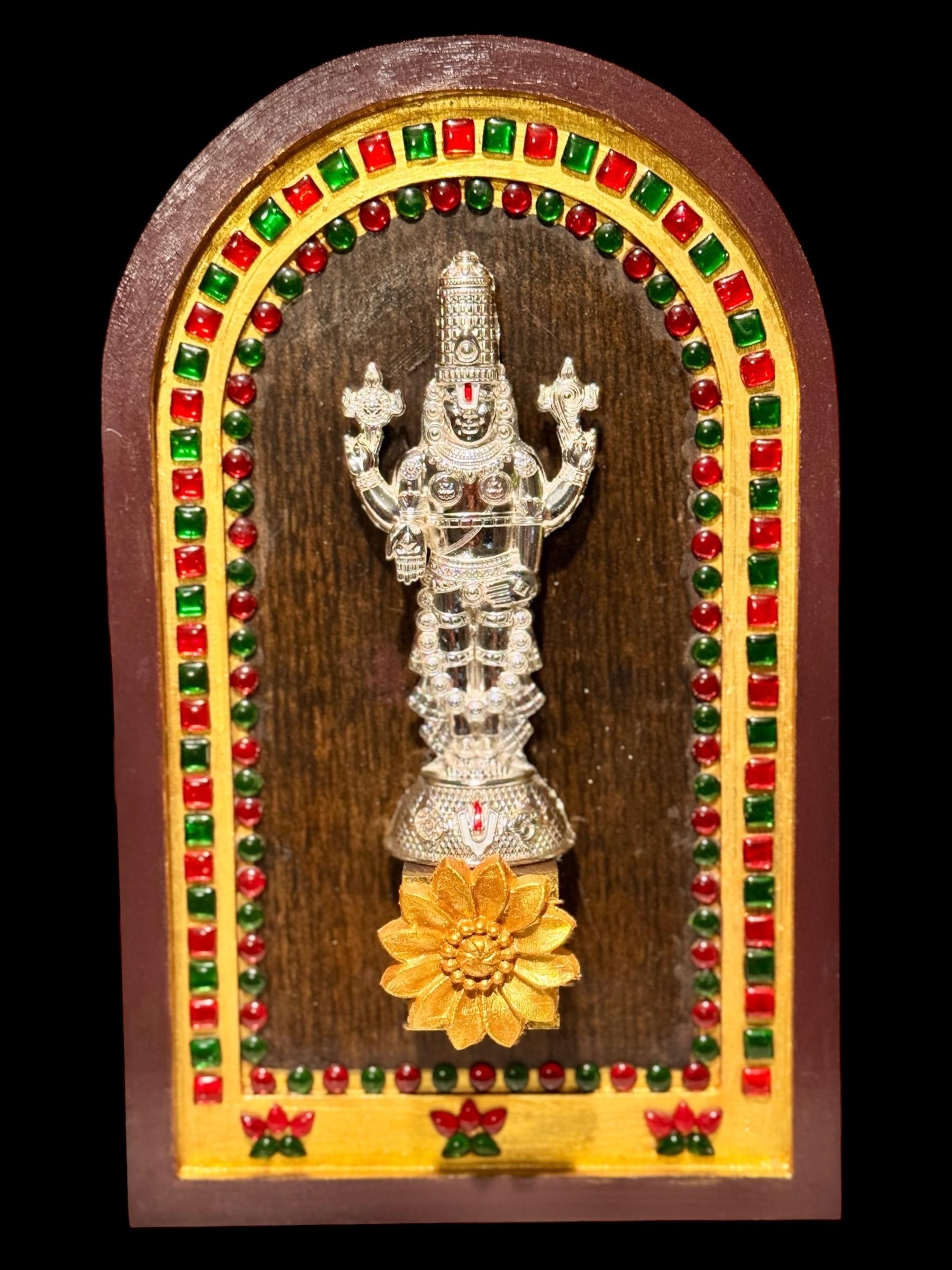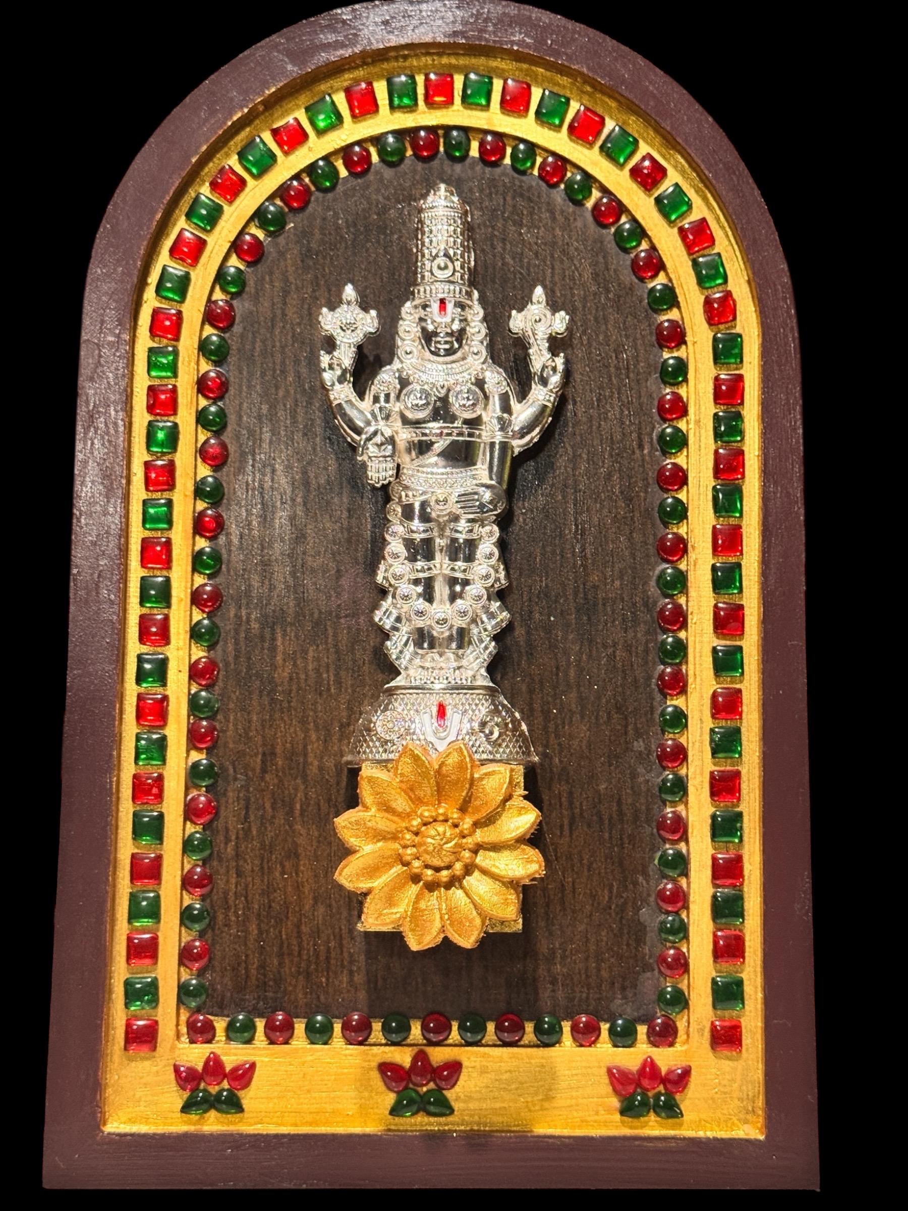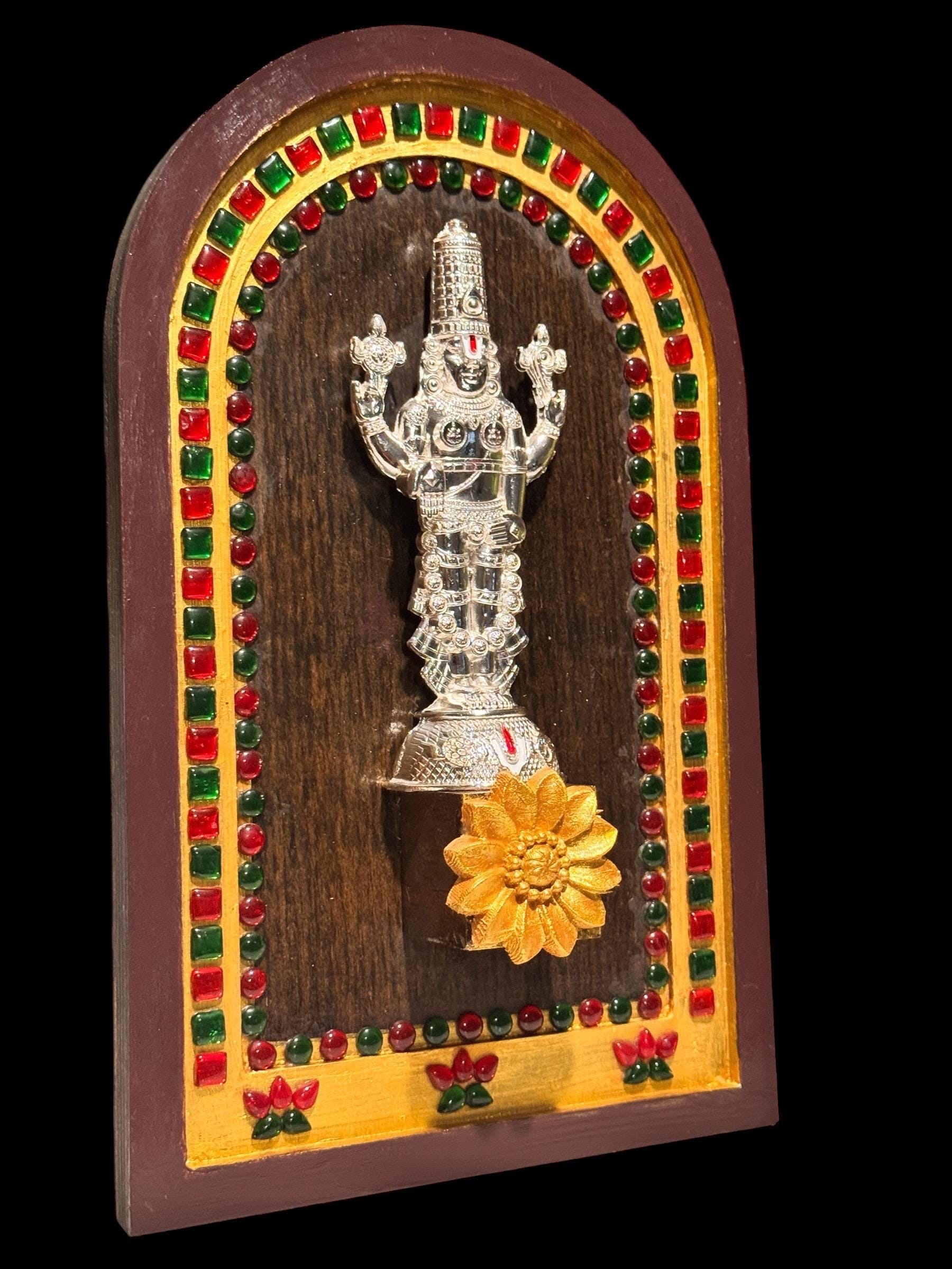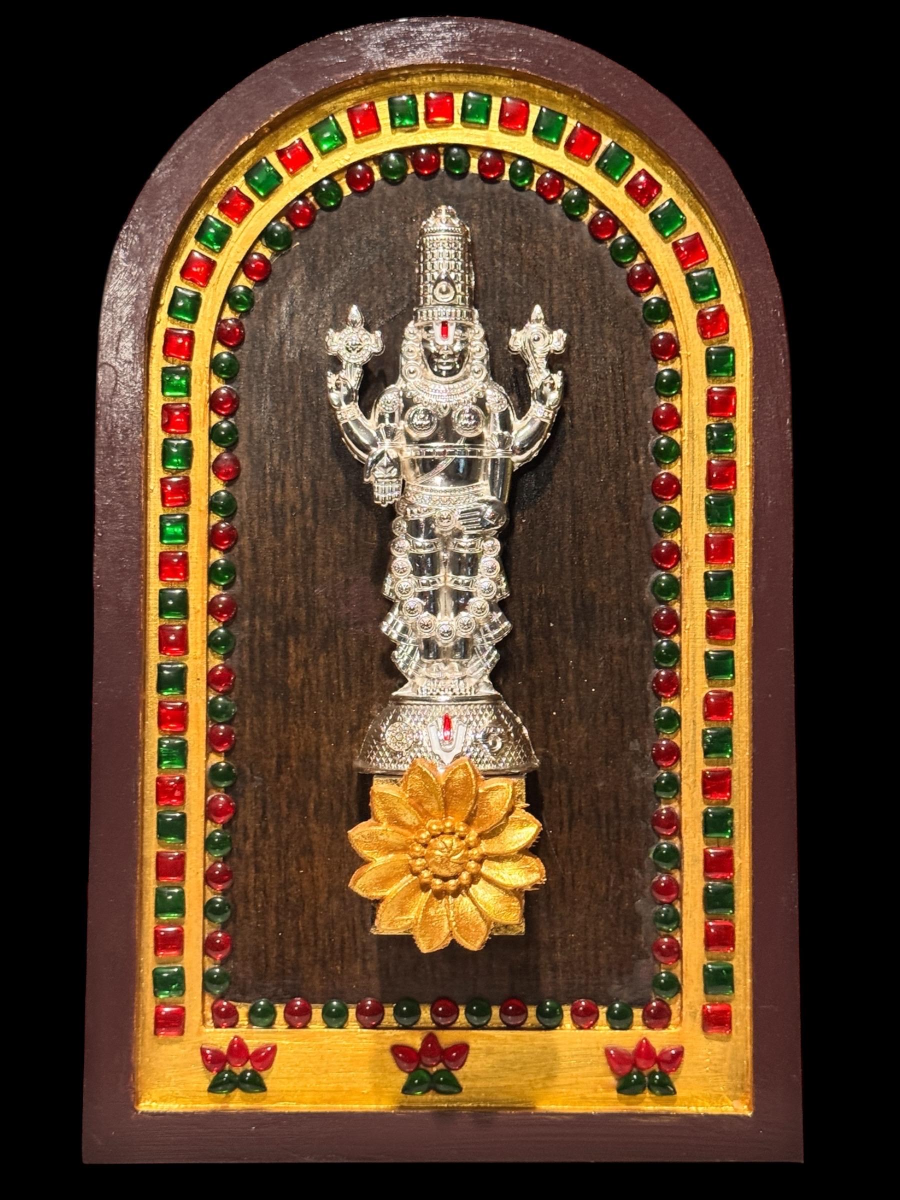 A beautiful German Silver Venkatachalapathy placed in a wooden frame. Adorned with Tanjore art stones - bringing out the divine beauty of Balaji.