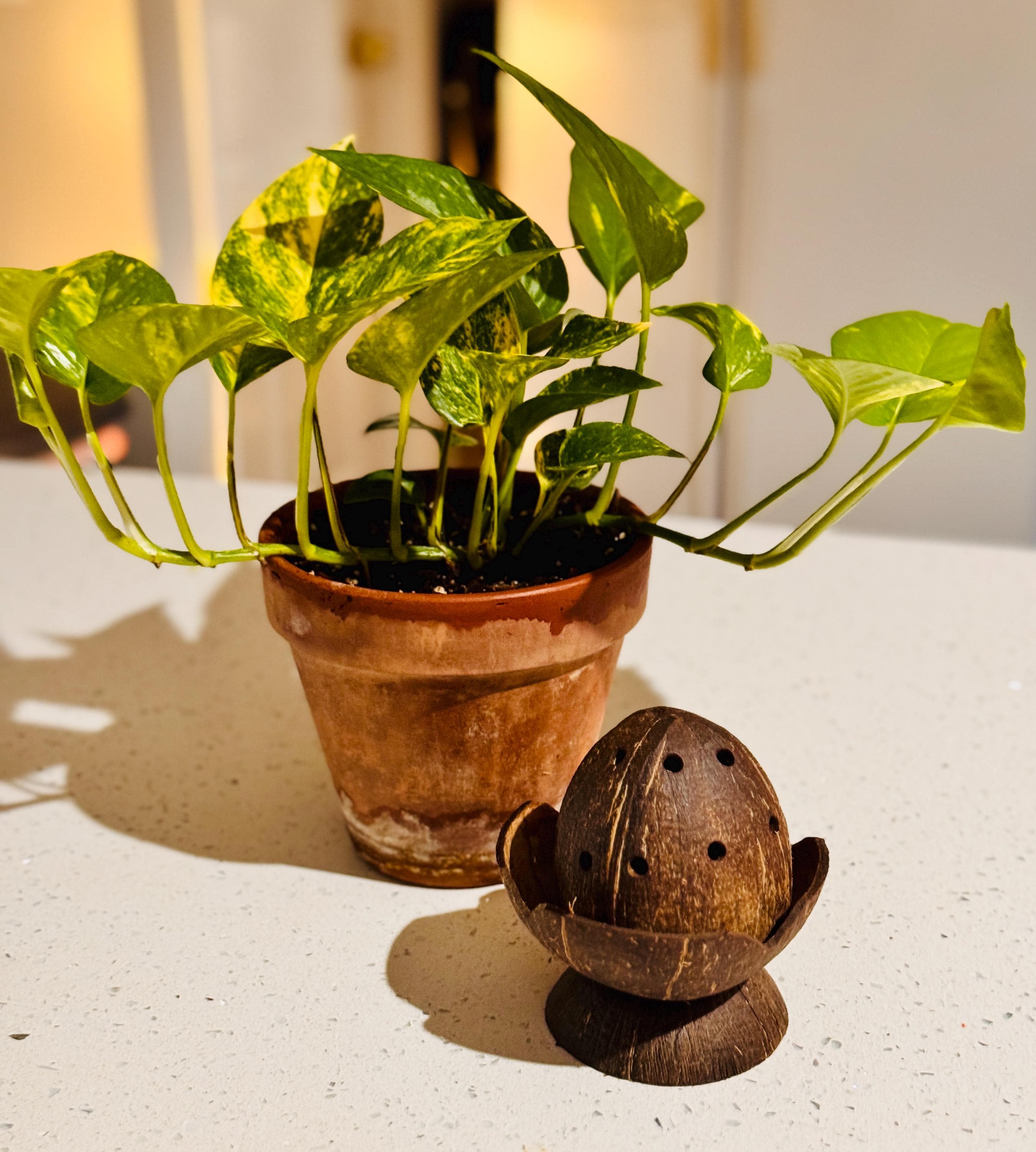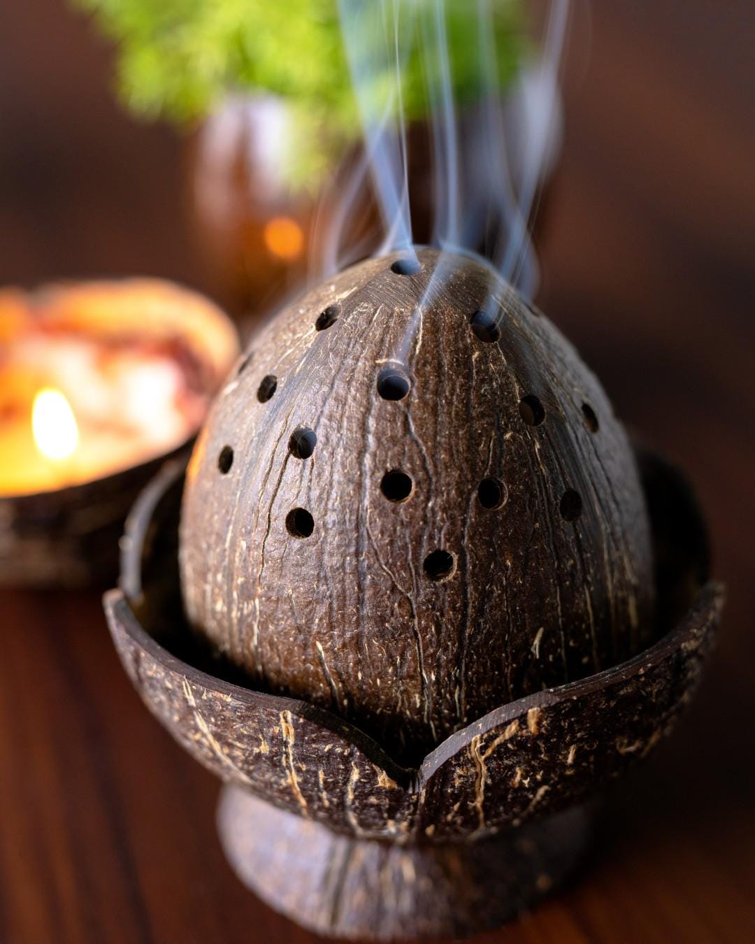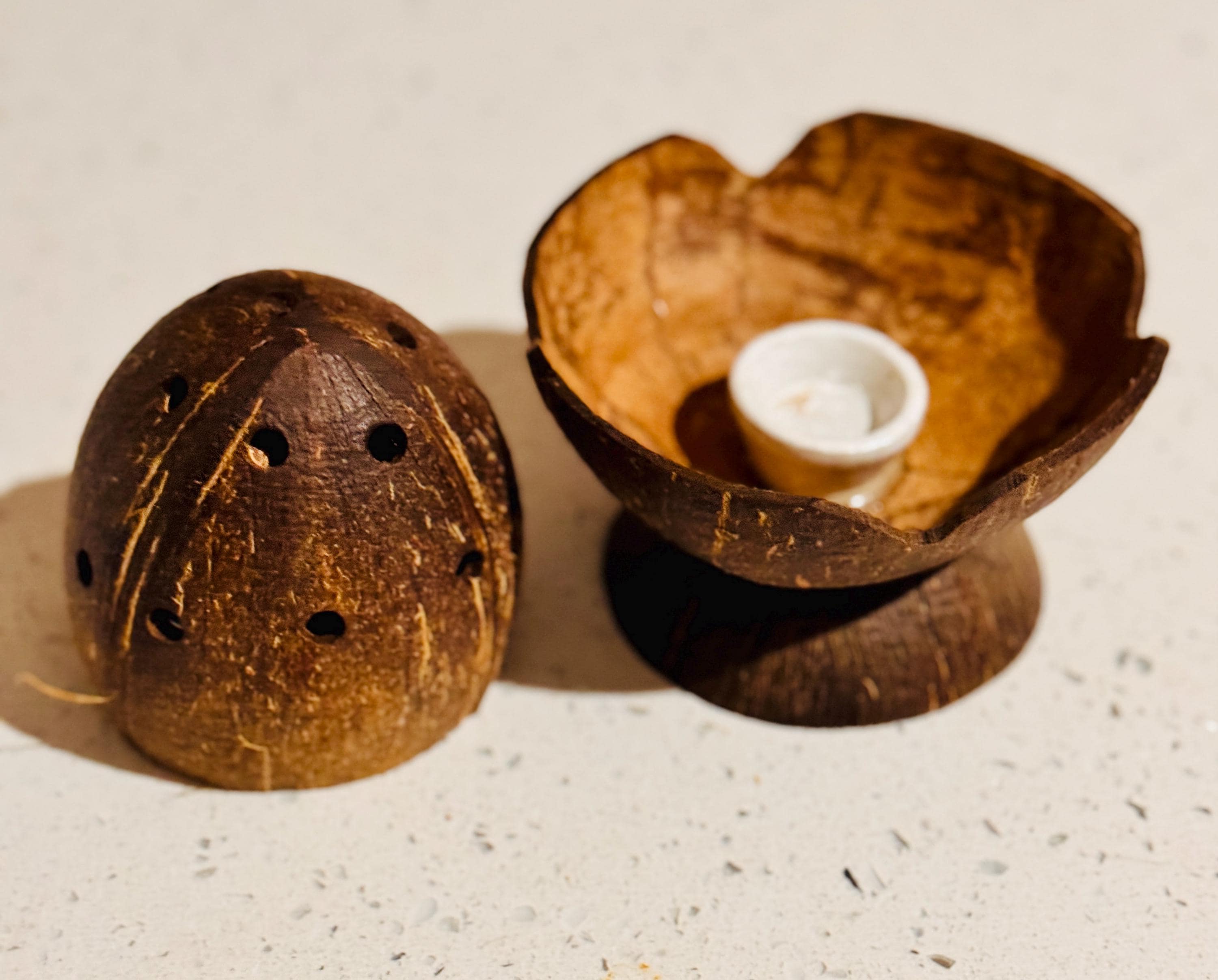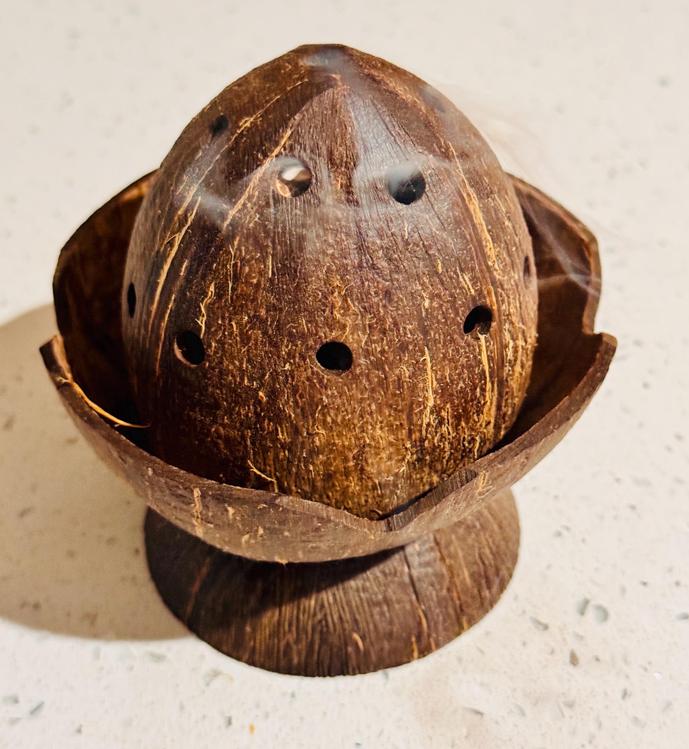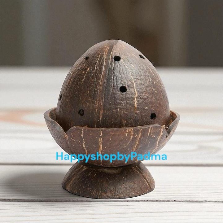 Eco-Friendly Coconut Shell Incense Holder Handcrafted from natural coconut shell and wood, this incense stand adds rustic charm to your home, office, or pooja room. Its stable design and built-in ash catcher keep your space clean while enhancing your rituals with calming fragrance. A thoughtful, sustainable choice for everyday serenity.
