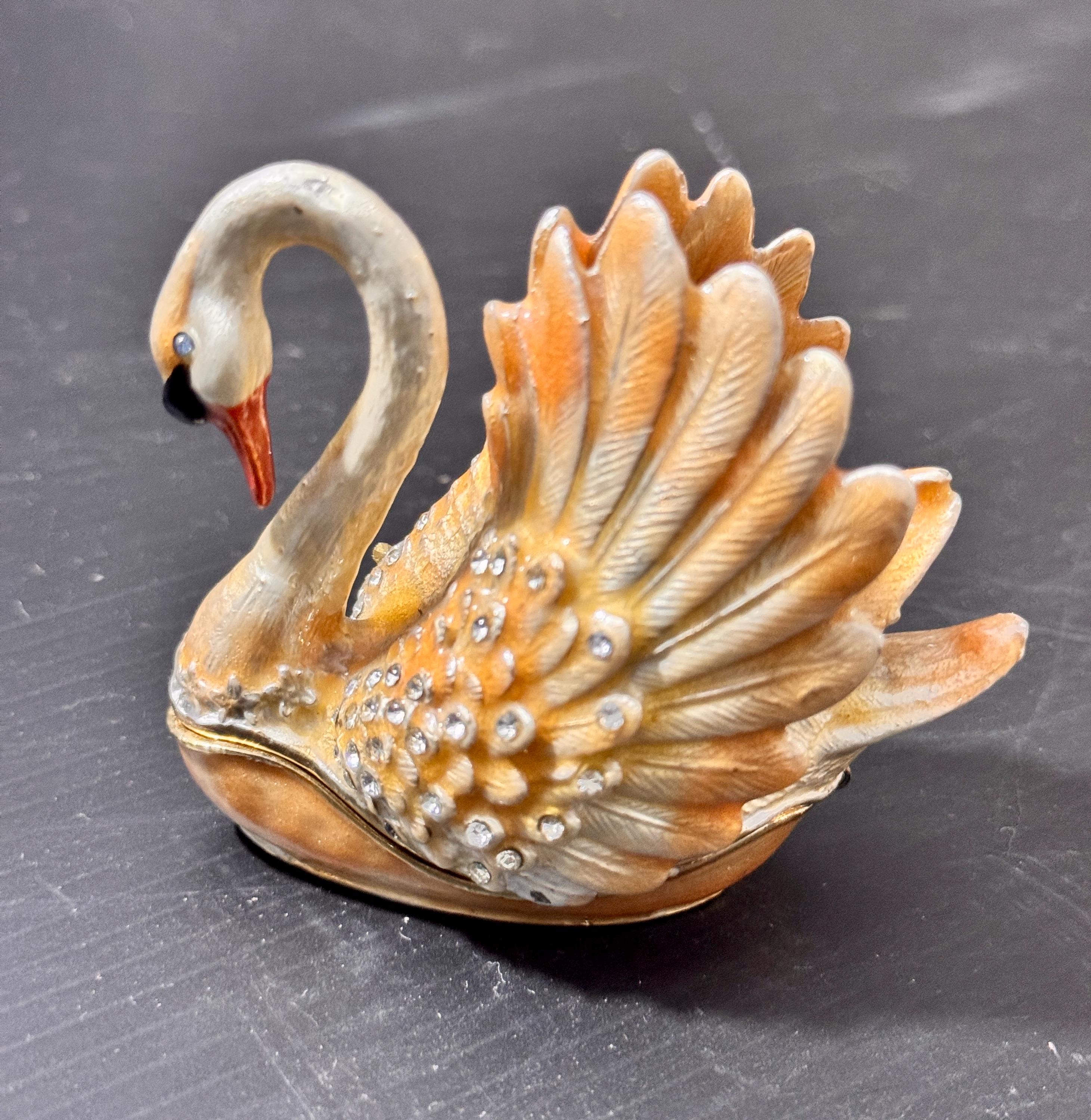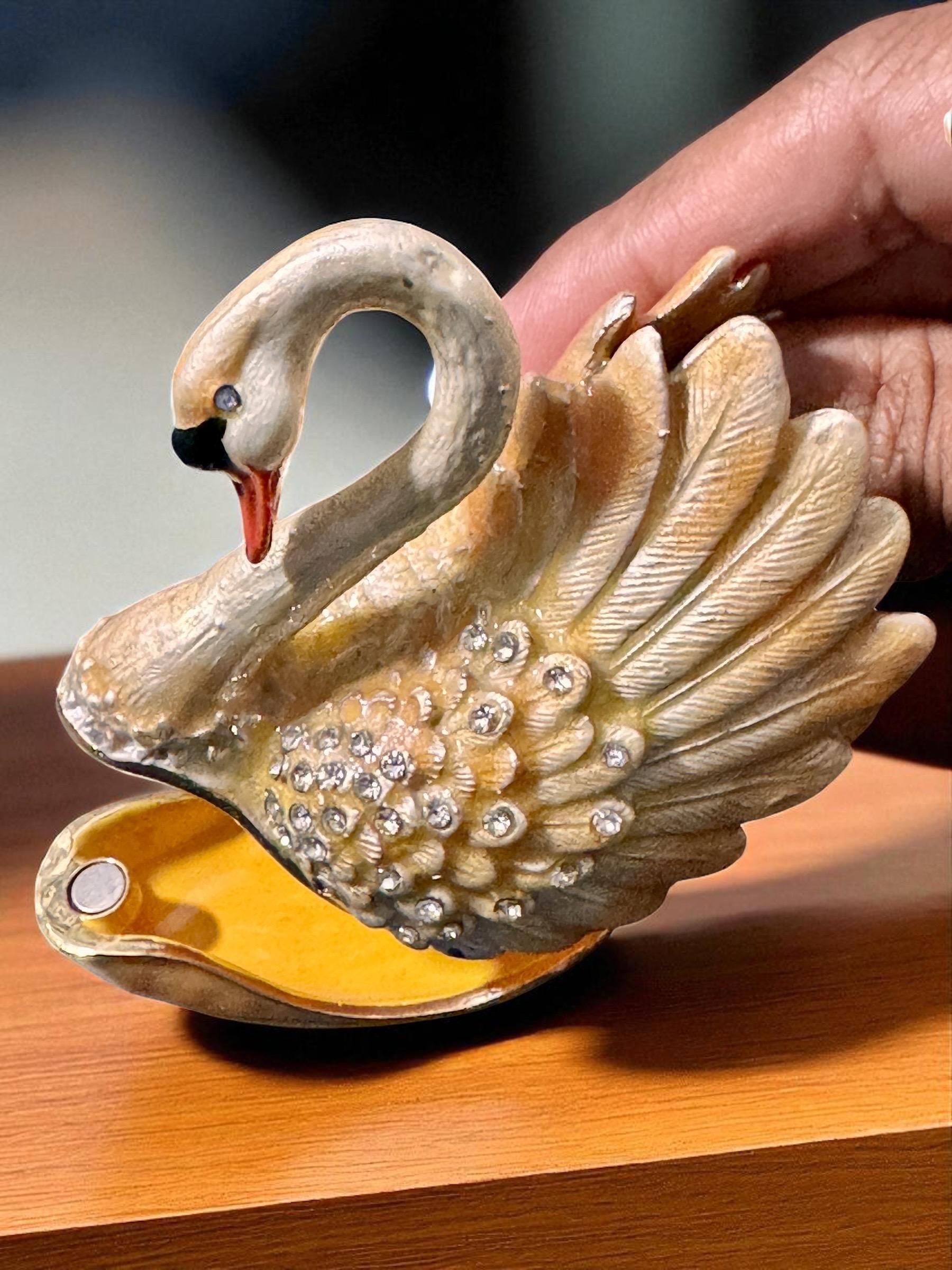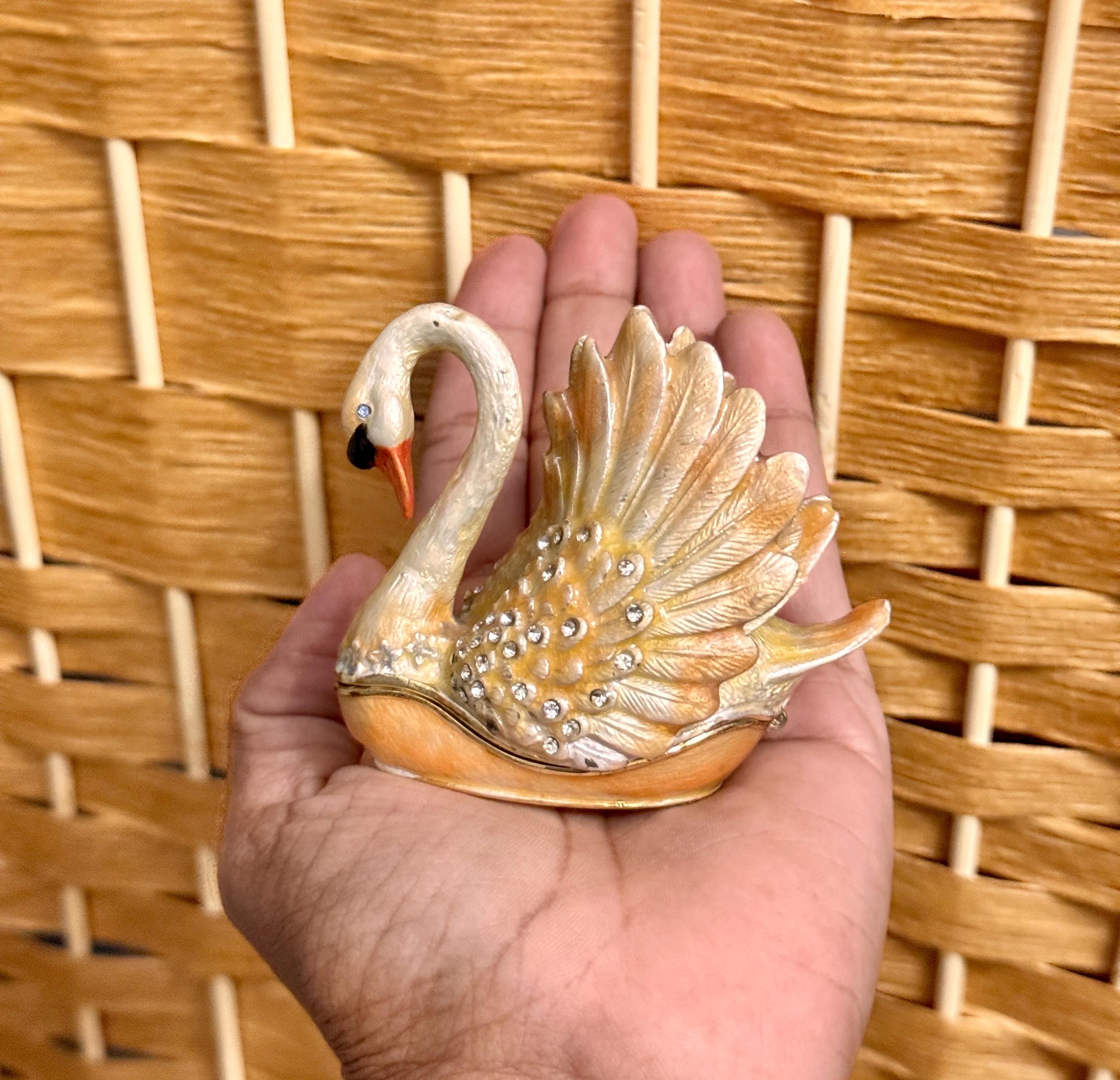 * Vibrant Display: Handcrafted swan showcasing intricate enamel work with vivid colors and eye-catching details. * Very beautifully made using high quality metal & bejewelled with stones. * Size - Height-8 Cms. Width-8 Cms. Length (approx)-5 Cms. Weight-180 Grams Approx. * This Bejeweled Swan Showpiece Has 1 secret wish compartment on the top.Opening the compartments reveals a secret compartment (magnetic) where one can place written desires in hopes of having them fulfilled. * Premium Alloy Materials: The trinket box made by eco-friendly alloy and high quality crystals, nickel-free and lead-free, non-toxic and safe * Handmade Craft: The jewelry box is thick plated, enameled with different colors, and mosaic with crystals- detailed, vivid and realistic, last for long time * Home Decorations:Very suitable for home decoration;Great Gifts: The trinket box come in a nice gift box, for the one who love wearing jewelry and love animals, wonderful present for wedding, anniversaries, birthday, holidays, or any other gift giving occasions;