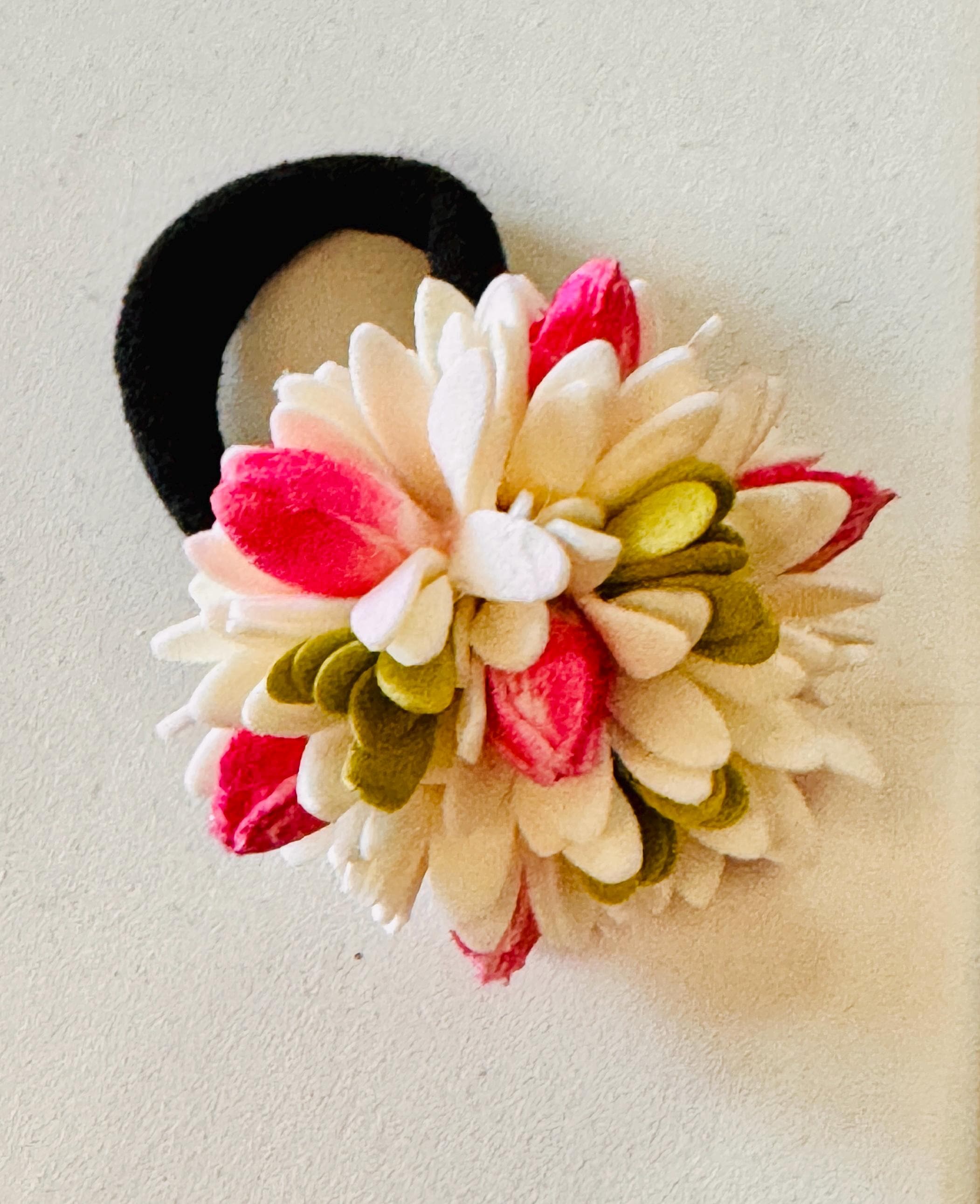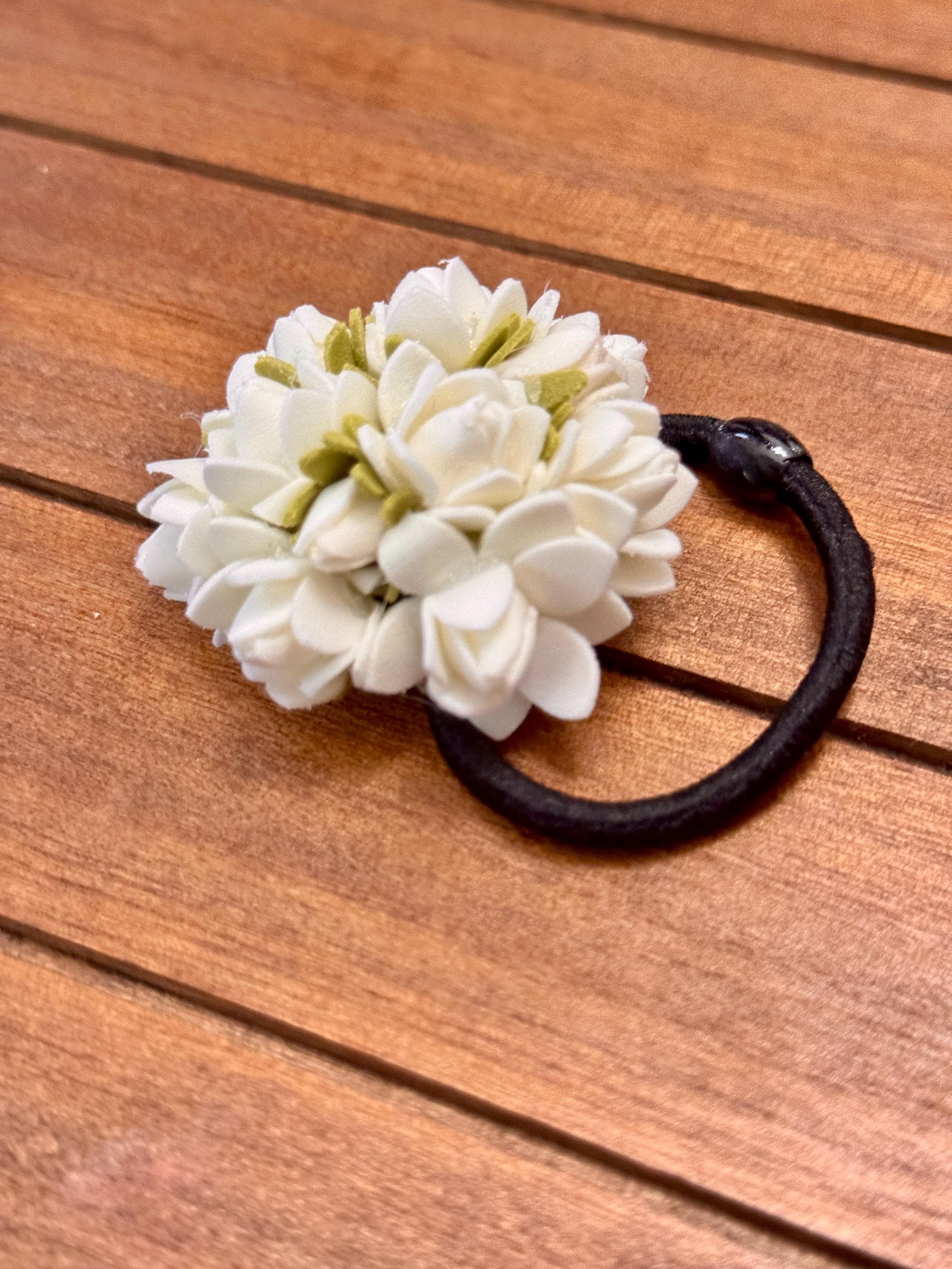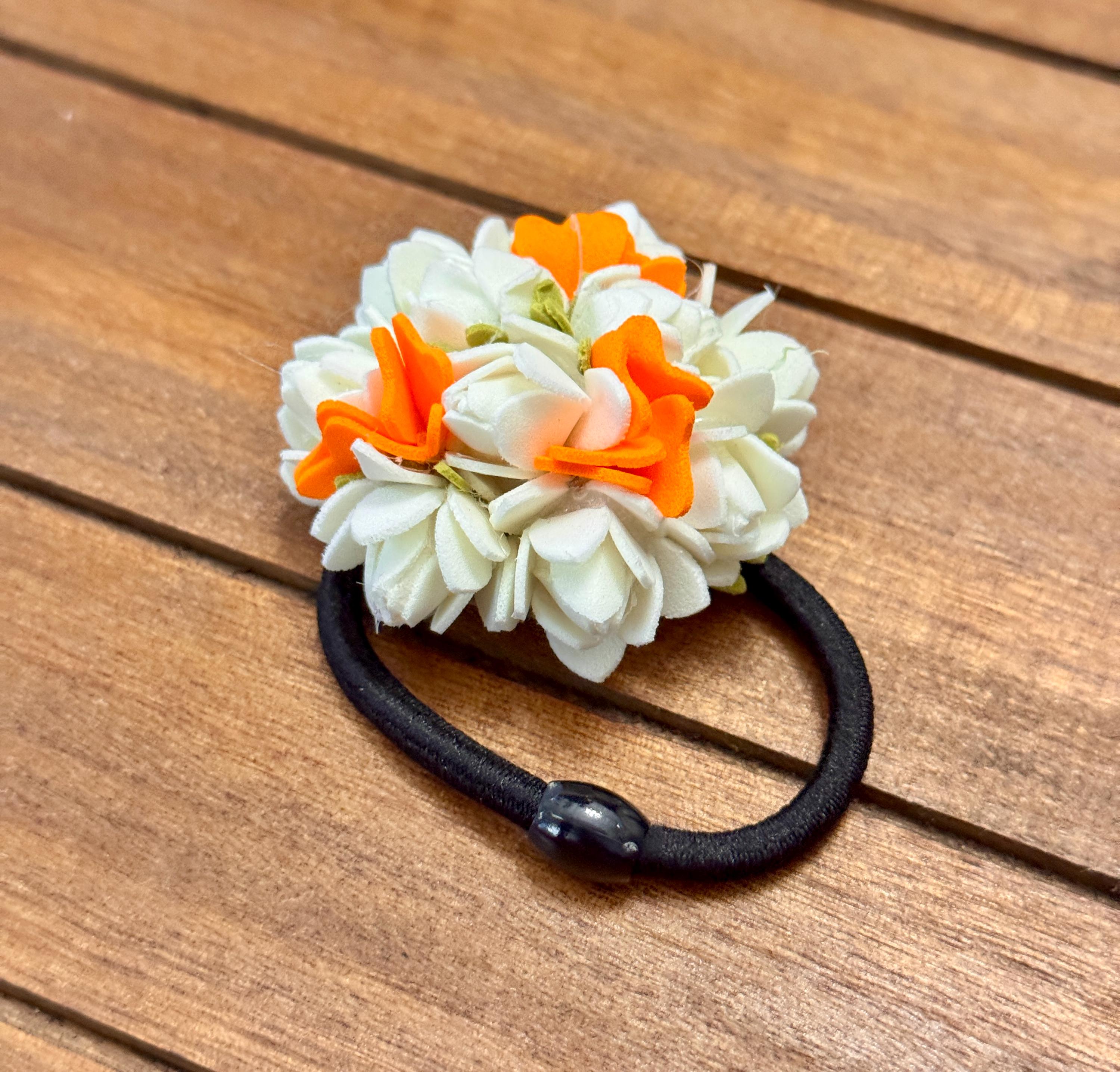 A beautiful floral arrangement woven into a hair tie. Simple for everyday use. A simple accessory that can instantly bring charm to your hair braids, pony tails etc. Approx. circumference of the floral (coin type arrangement) is 2inches.