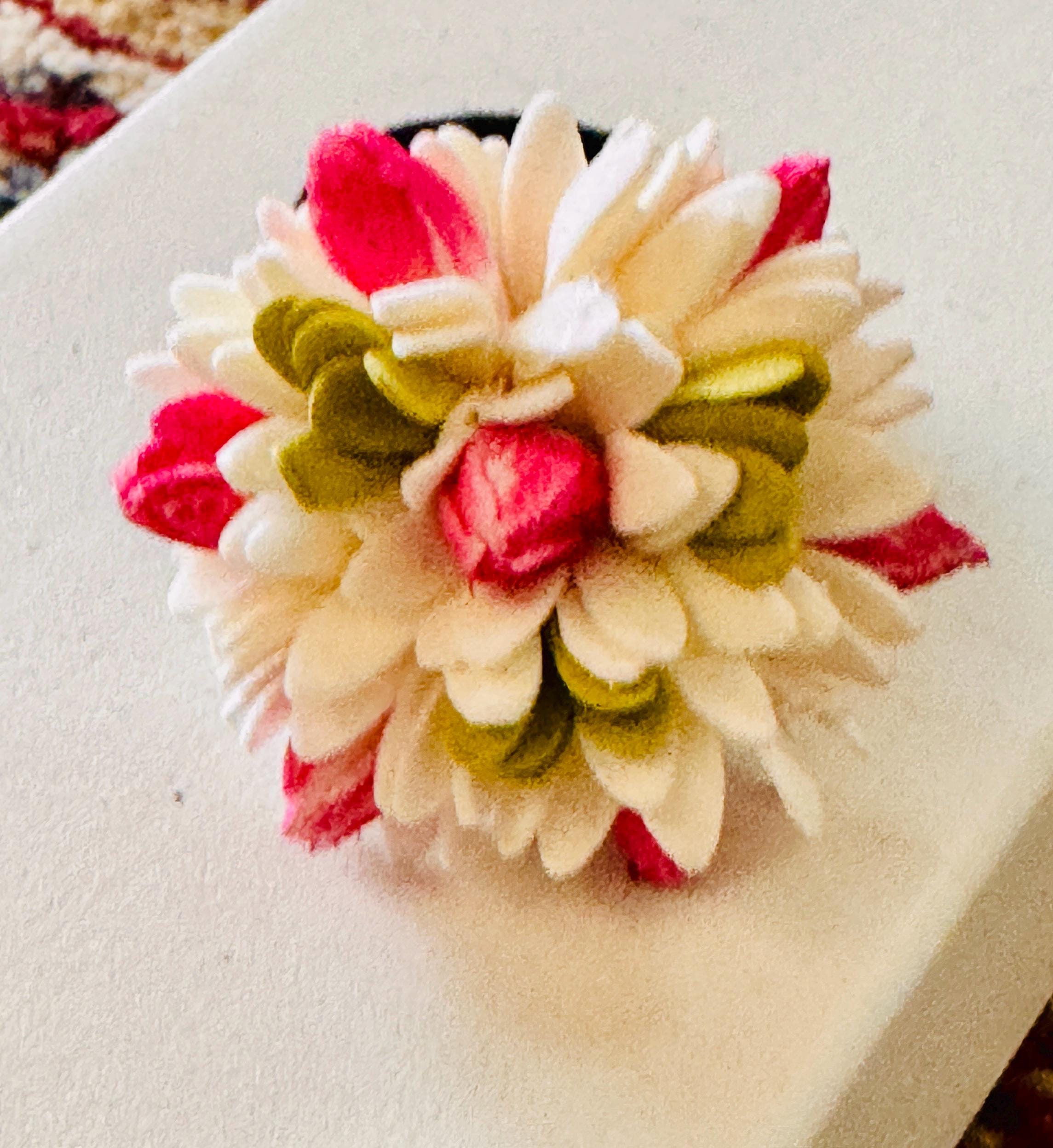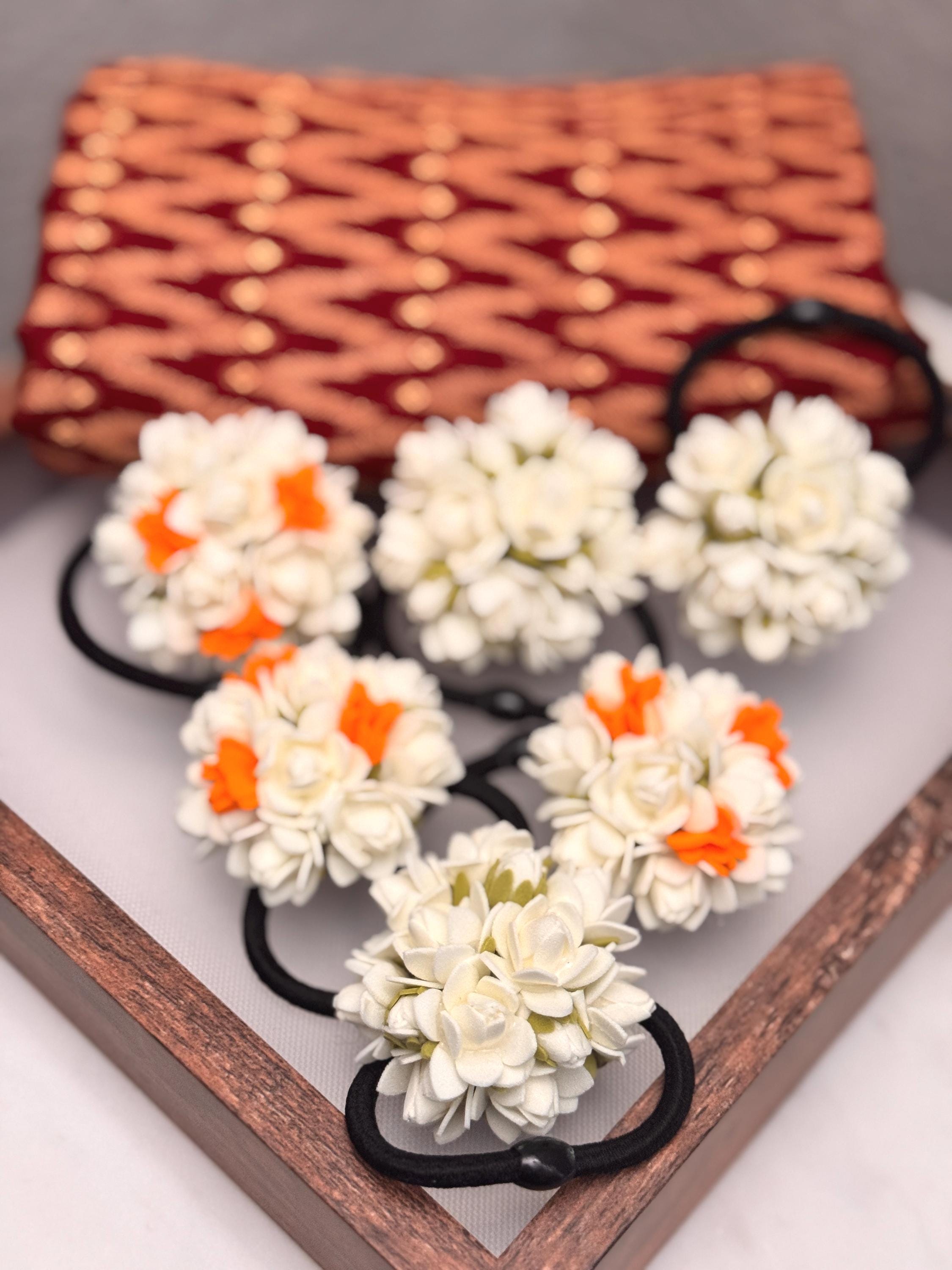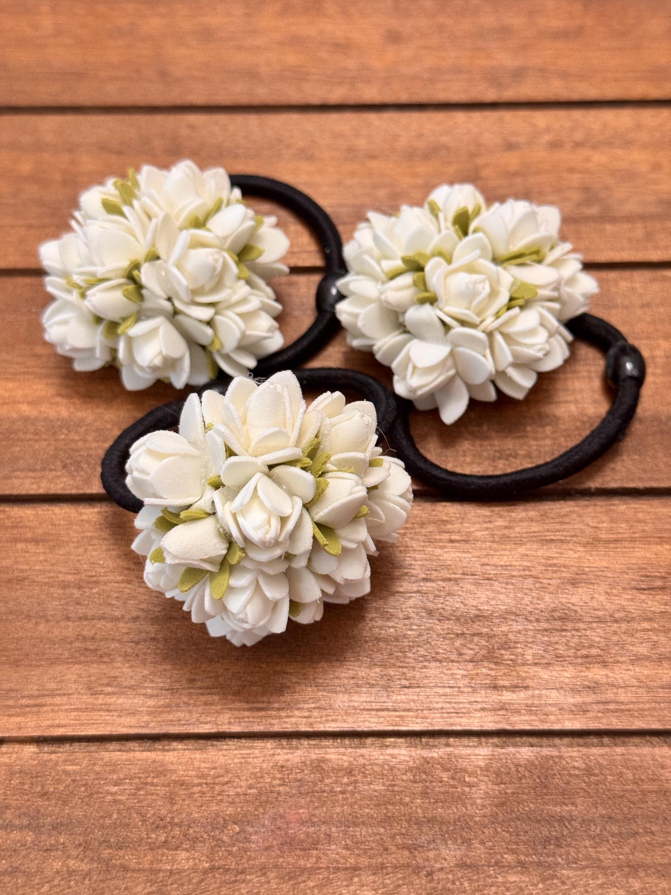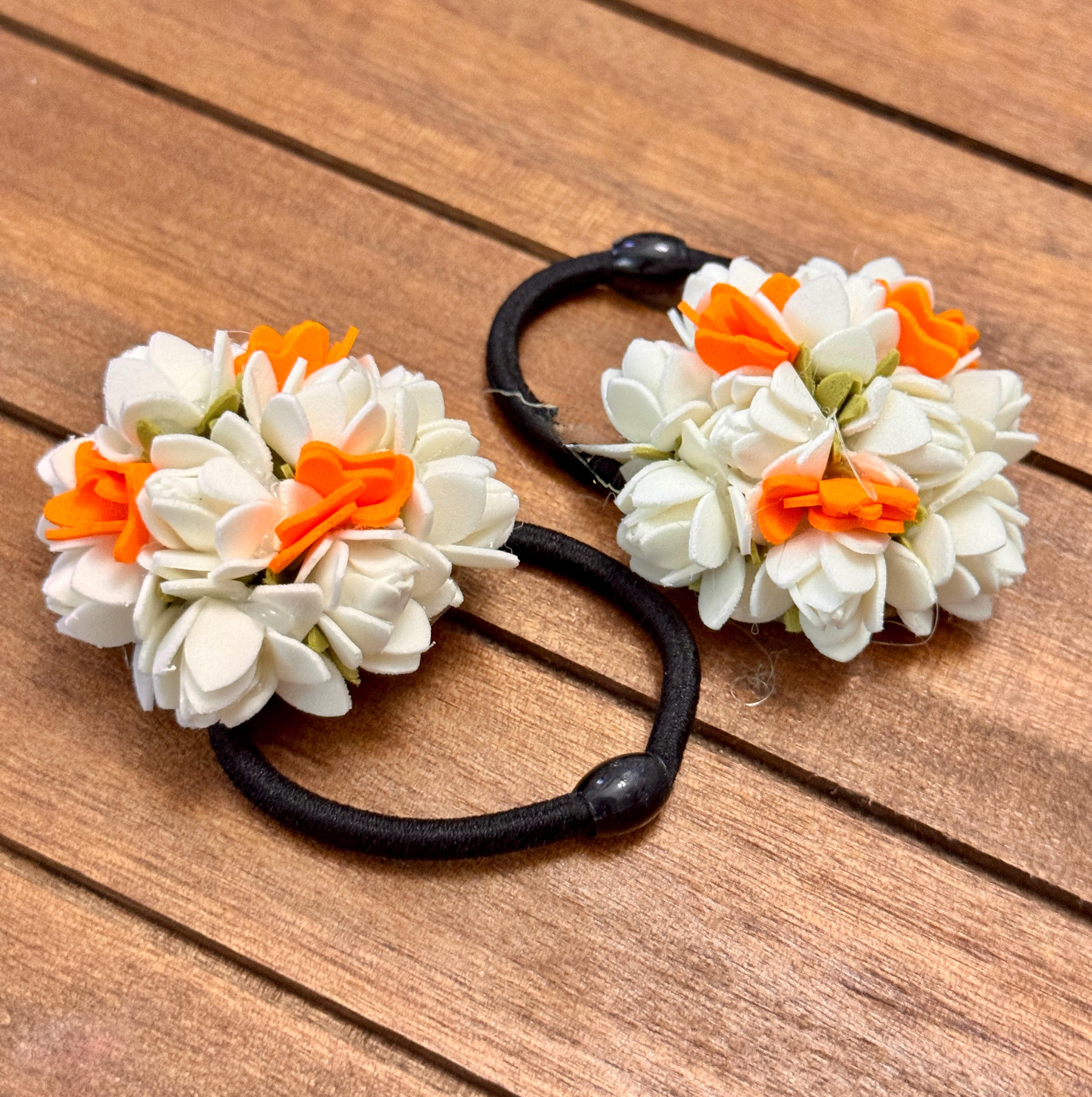A beautiful floral arrangement woven into a hair tie. Simple for everyday use. A simple accessory that can instantly bring charm to your hair braids, pony tails etc. Approx. circumference of the floral (coin type arrangement) is 2inches.