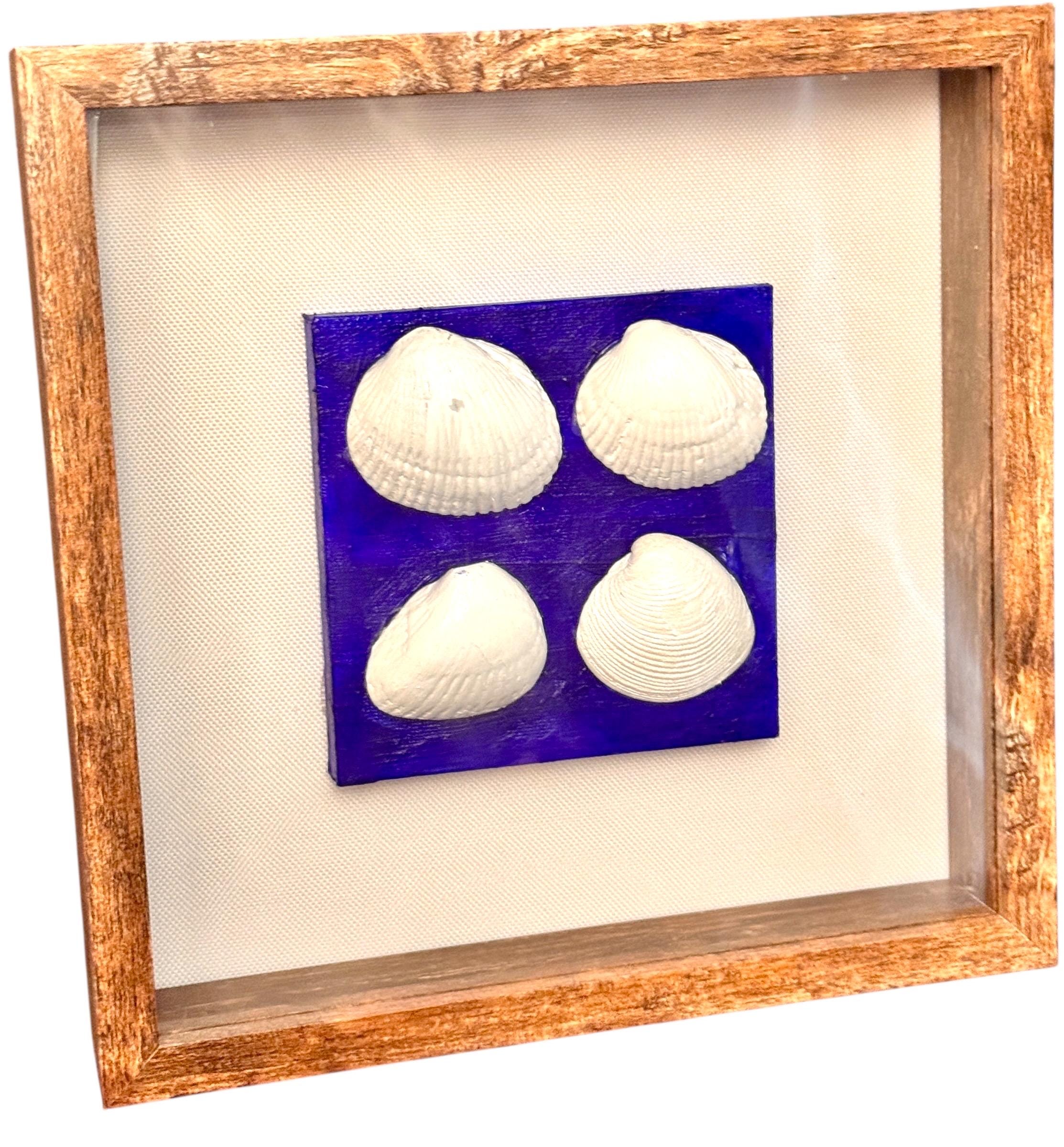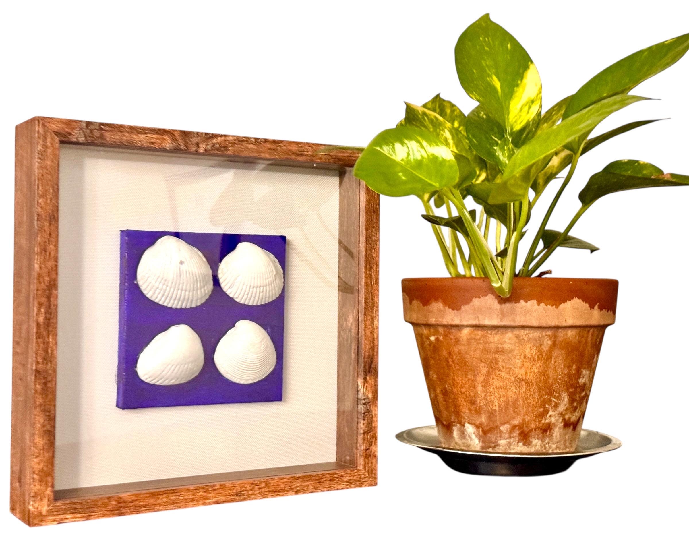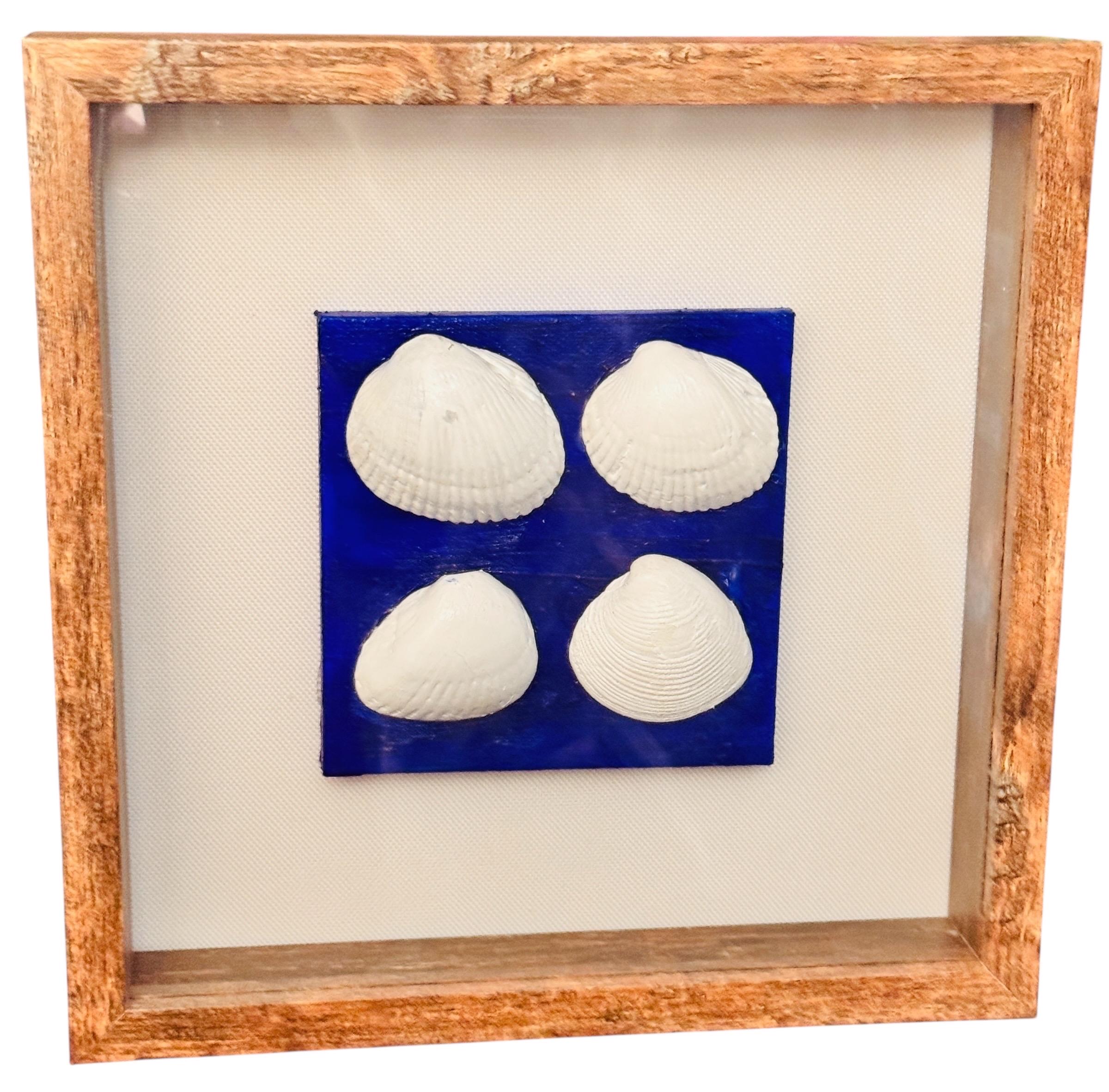 Bring a breath of the ocean into your space with this handcrafted framed seashell art. Four natural white shells are thoughtfully arranged in a harmonious 2x2 grid, set against a calming blue canvas and cradled by a rustic wooden frame. The neutral linen backdrop adds warmth and texture, making this piece a soulful accent for any interior.