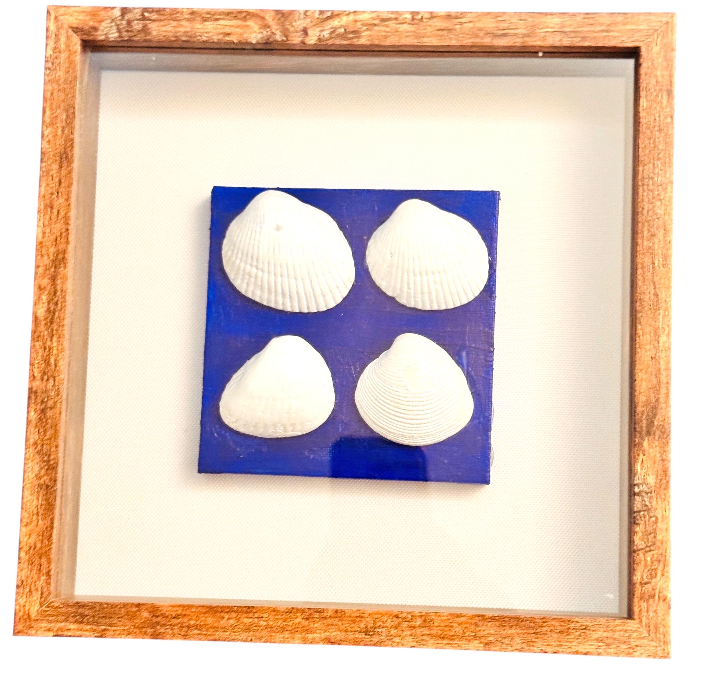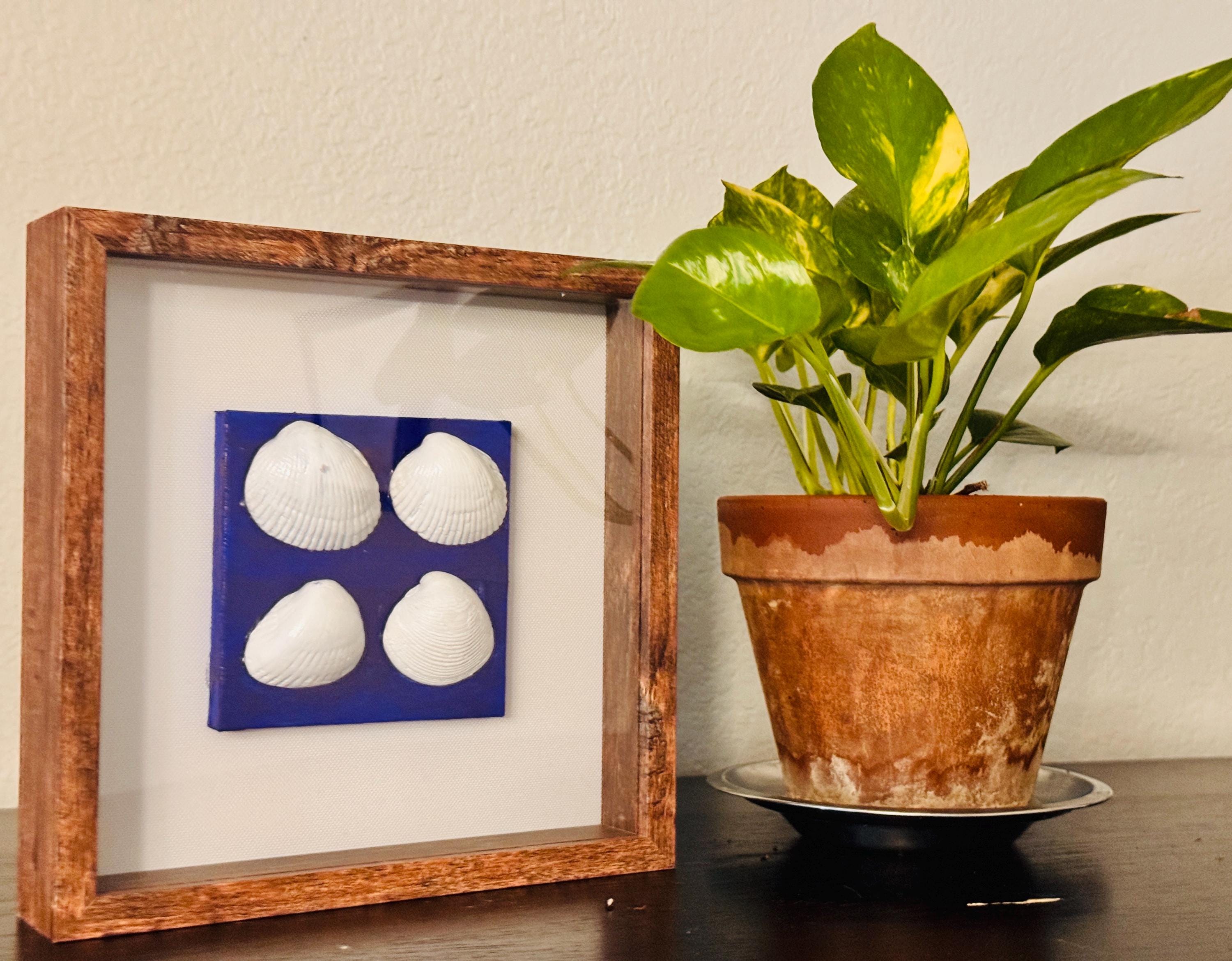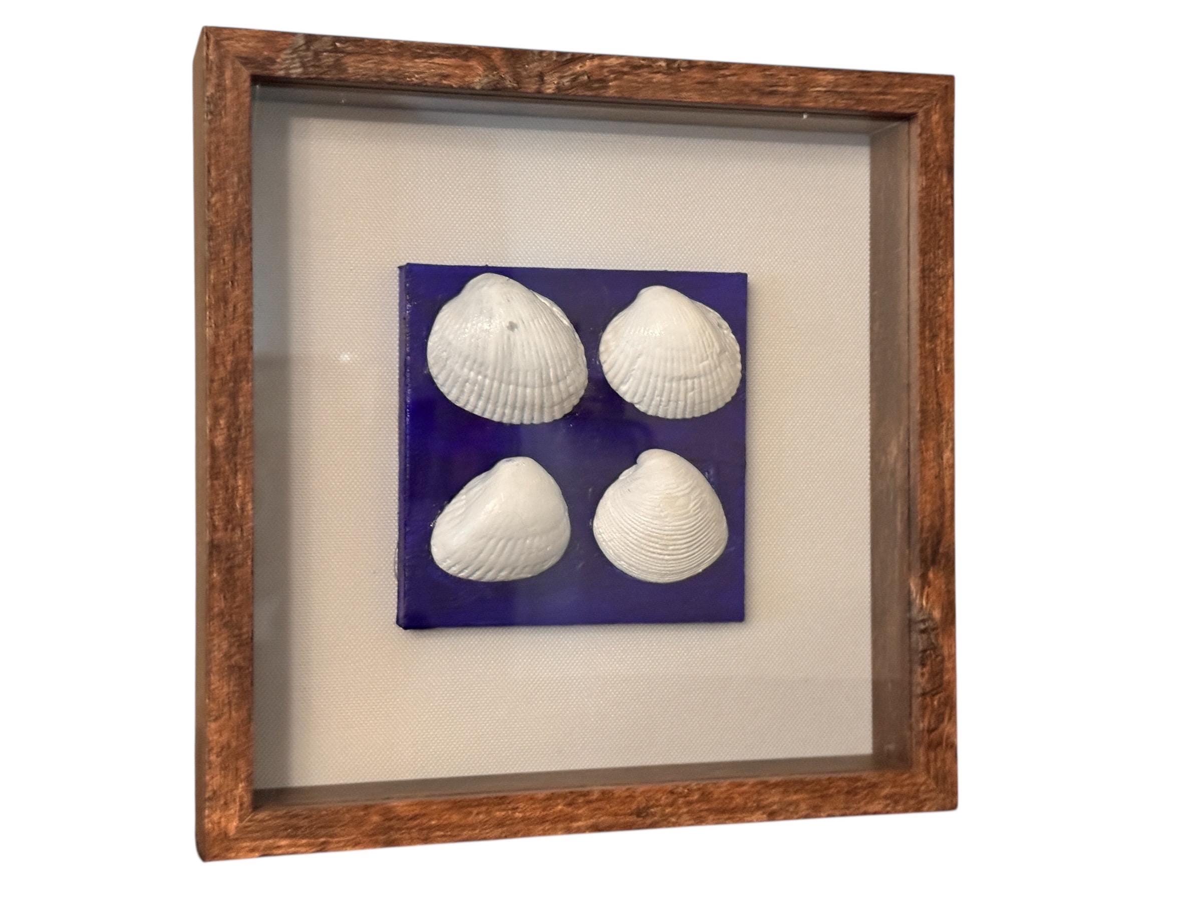 Bring a breath of the ocean into your space with this handcrafted framed seashell art. Four natural white shells are thoughtfully arranged in a harmonious 2x2 grid, set against a calming blue canvas and cradled by a rustic wooden frame. The neutral linen backdrop adds warmth and texture, making this piece a soulful accent for any interior.
