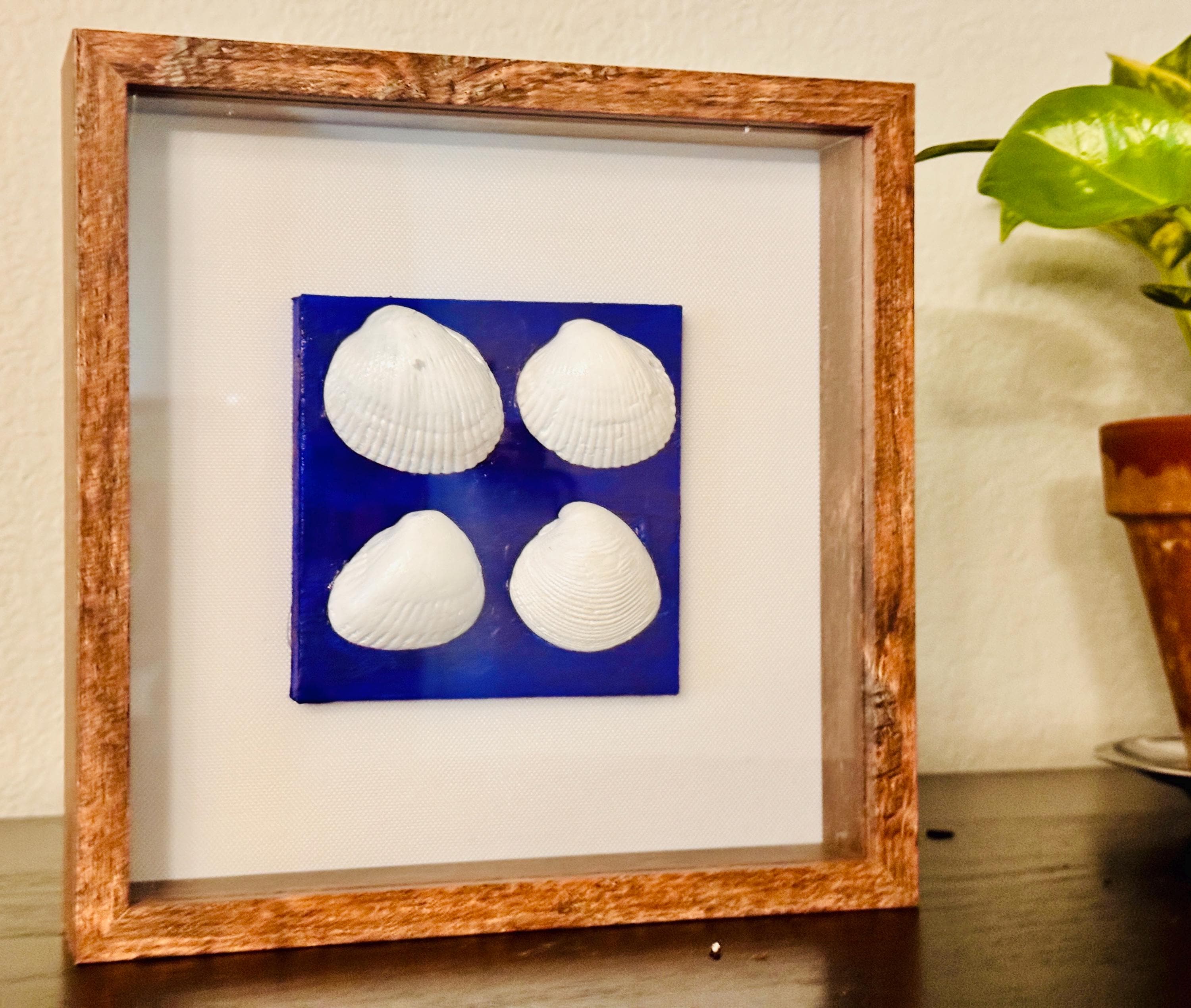Hand-framed coastal keepsake featuring natural white seashells on a serene blue canvas.