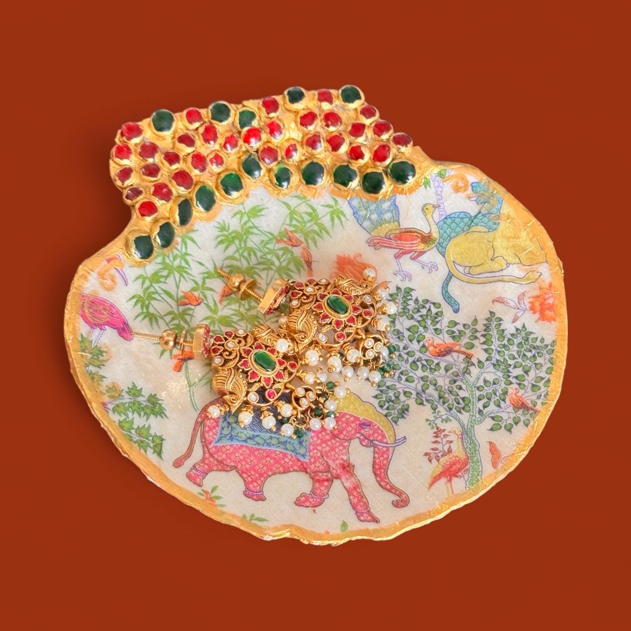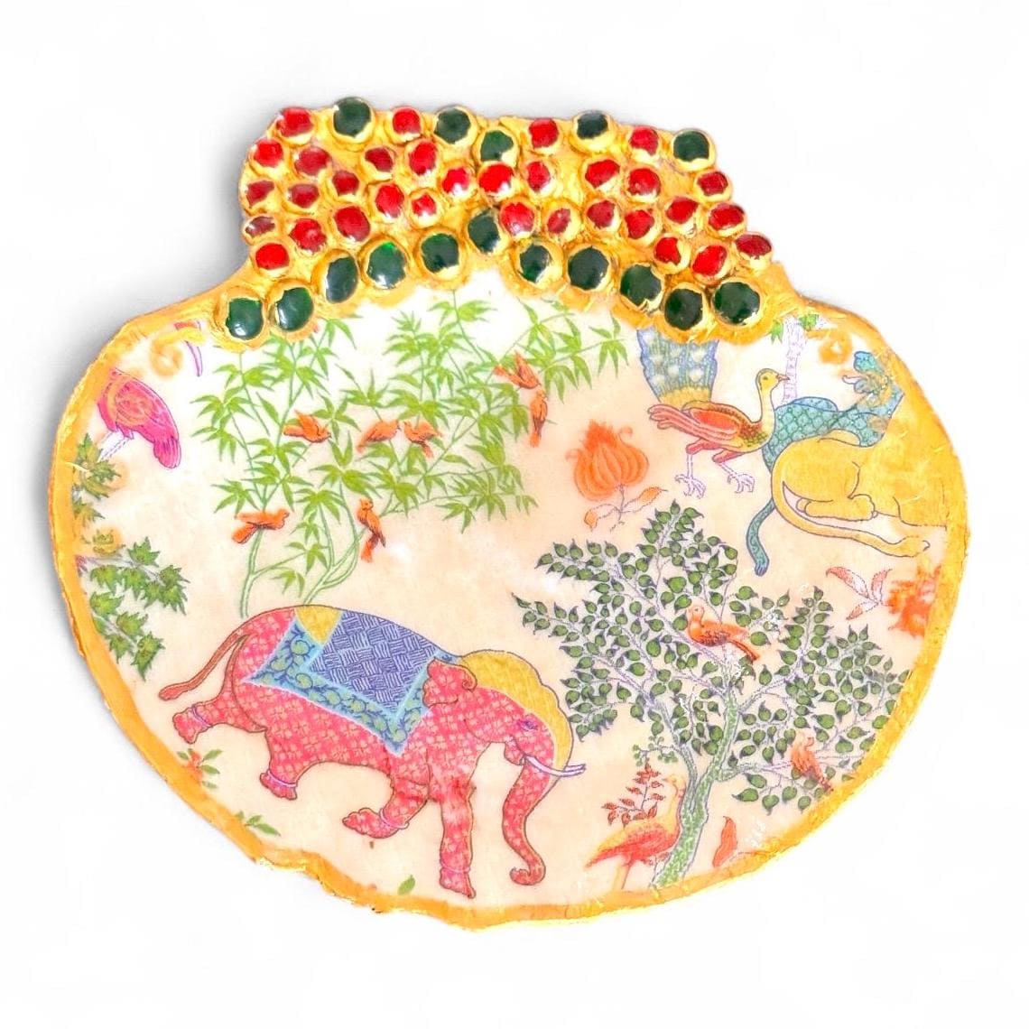 A celebration of tradition and artistry, this decorative shell is adorned with vibrant plant /animal motifs, rich gold gilding, and authentic Tanjore stones. Each piece is a miniature canvas—perfect for storing earrings, keepsakes, or gifting with soul. The blend of folk art and regal embellishment makes it a timeless treasure for your altar or tabletop. A quite unique and beautiful piece - handcrafted with love.