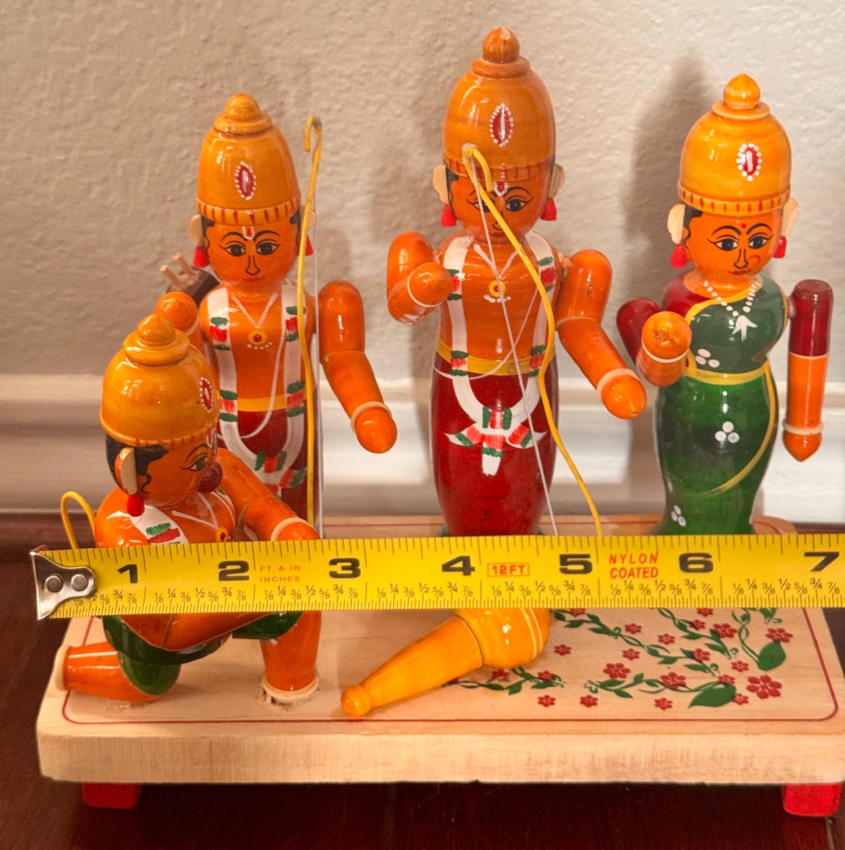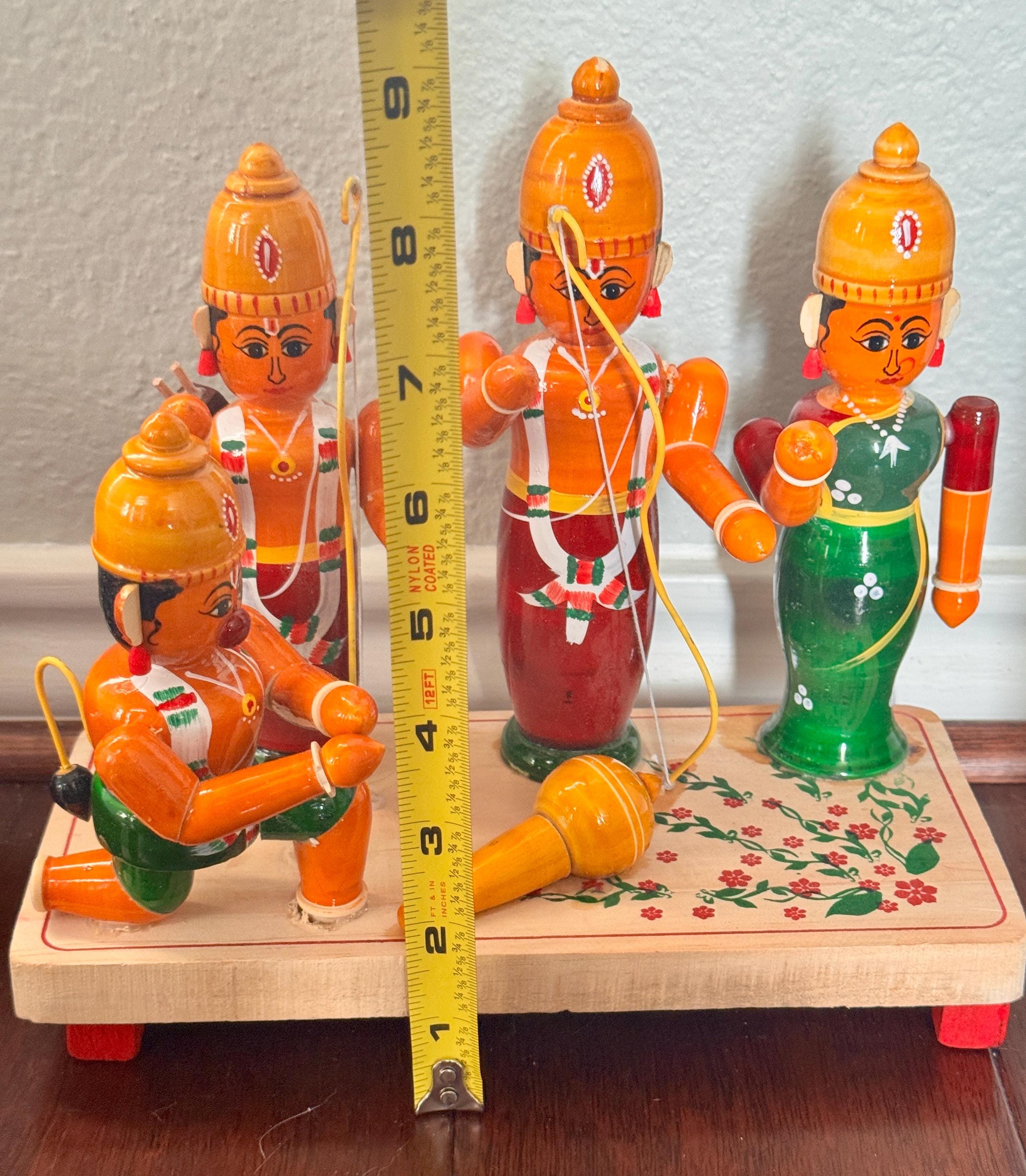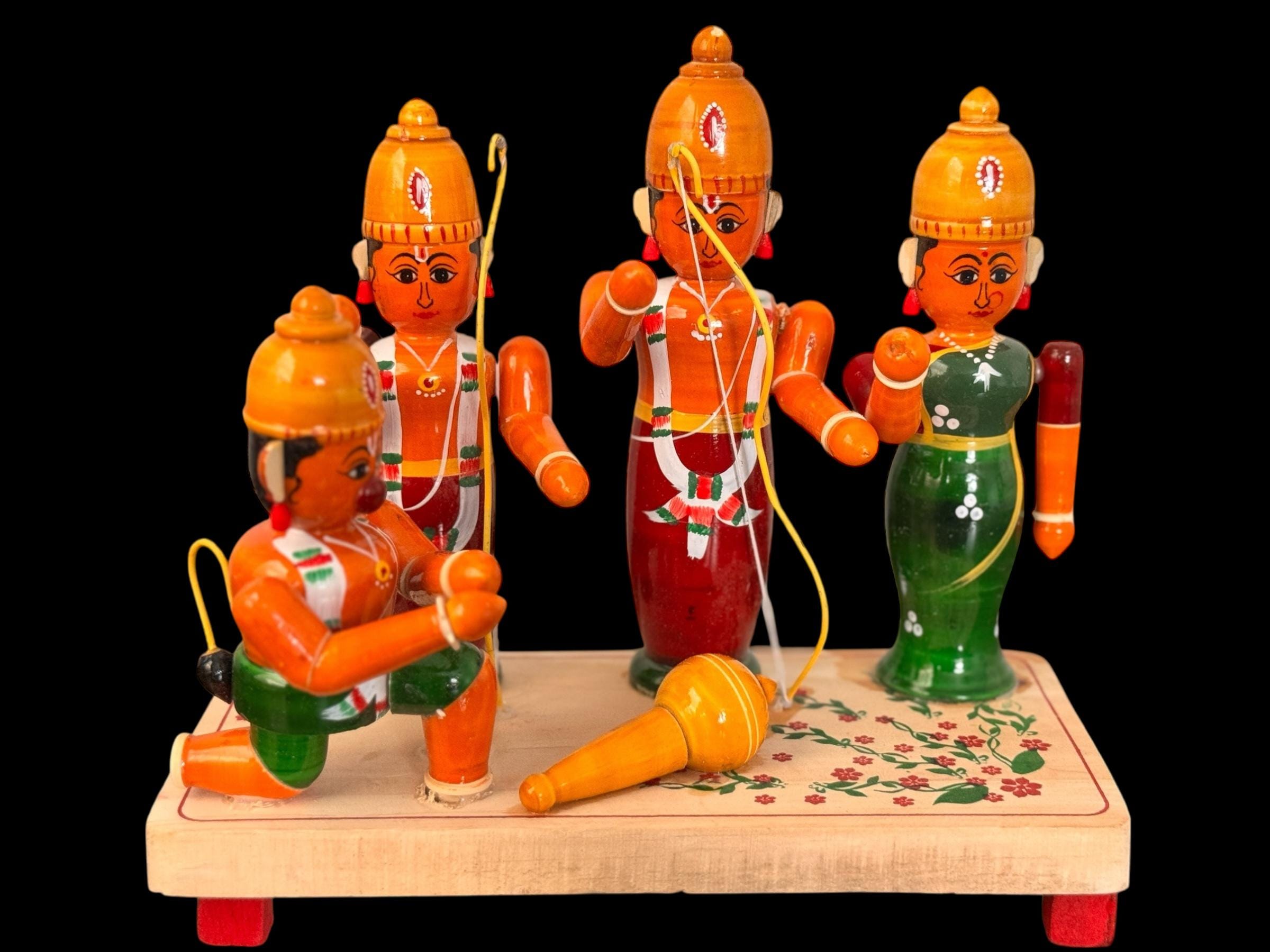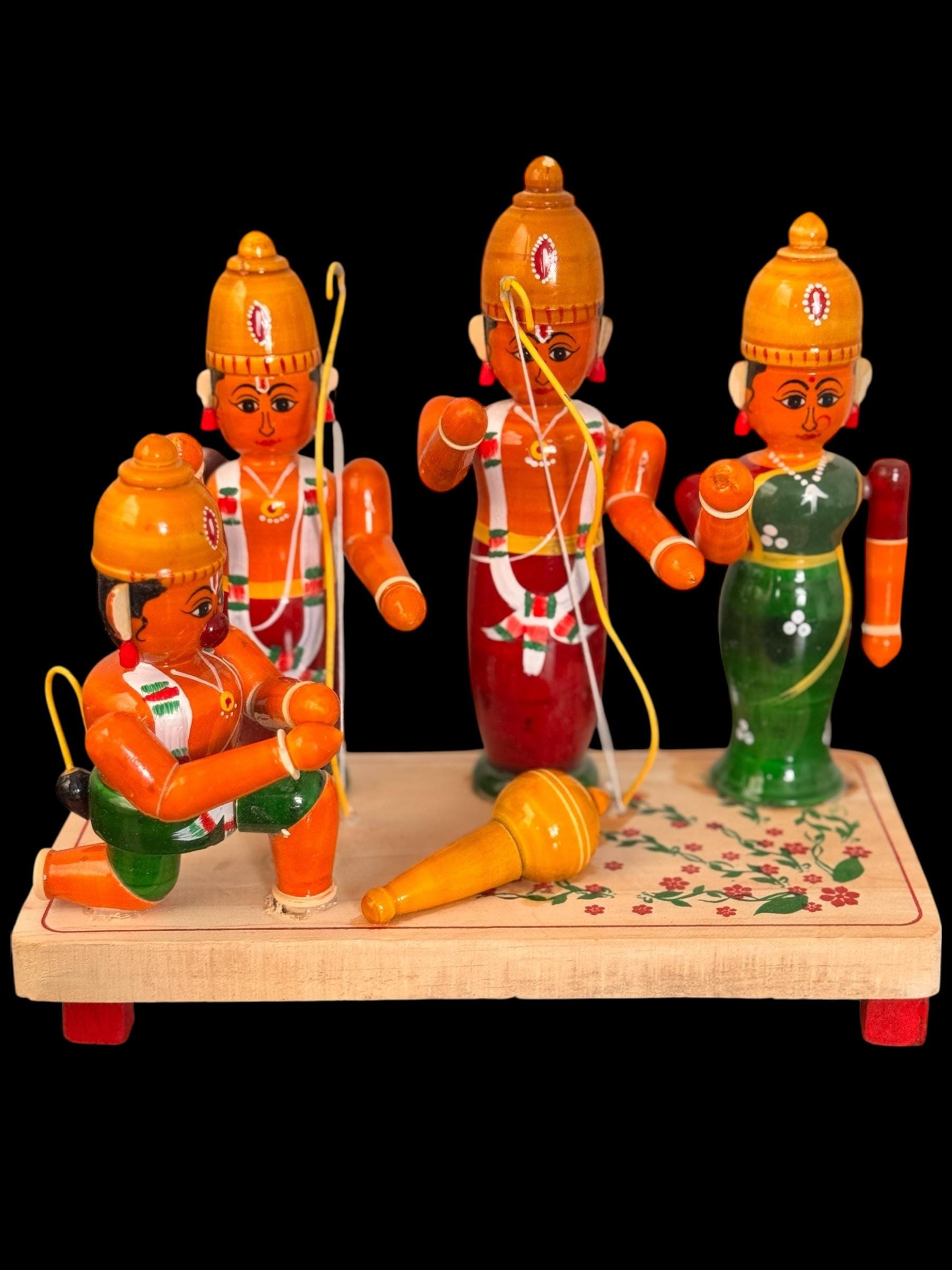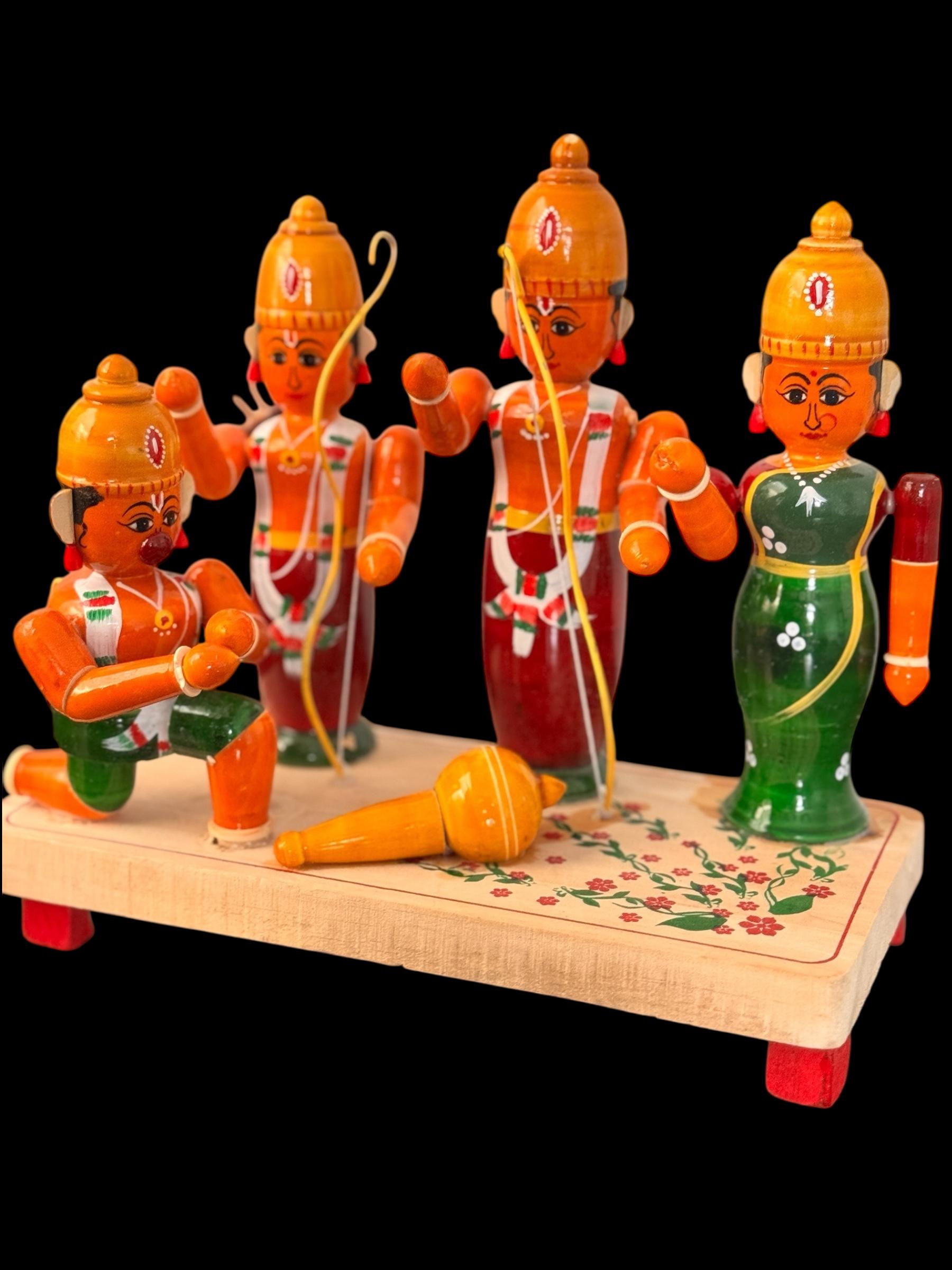 Etikoppaka Ram Darbar Set At the heart of this handcrafted set stands Sri Rama, holding his bow—a symbol of dharma and strength. To his left: Sita, the embodiment of grace and virtue. To his right: Lakshmana, the loyal brother and protector. Kneeling in front: Lord Hanuman, the eternal devotee, expressing unwavering devotion.