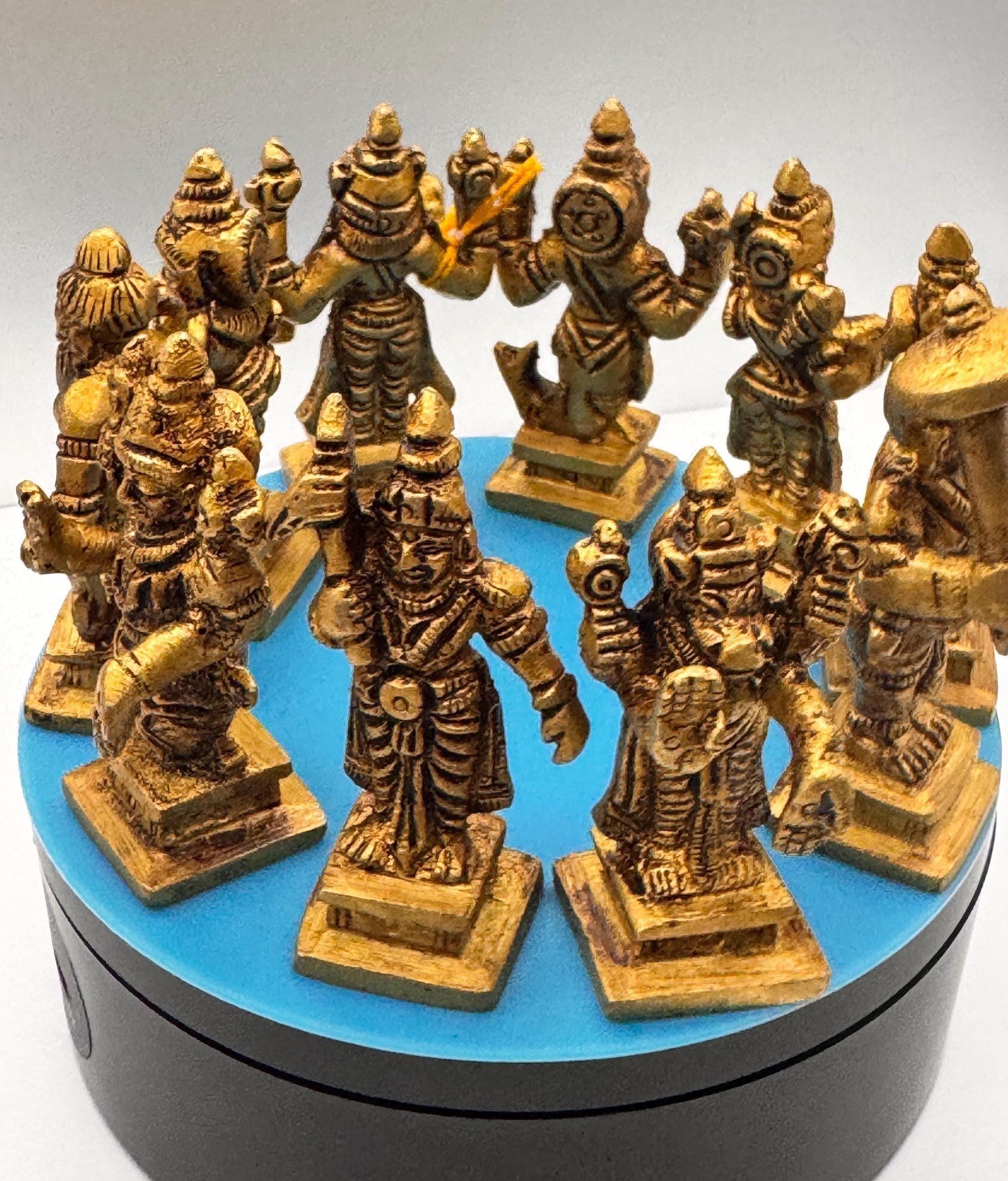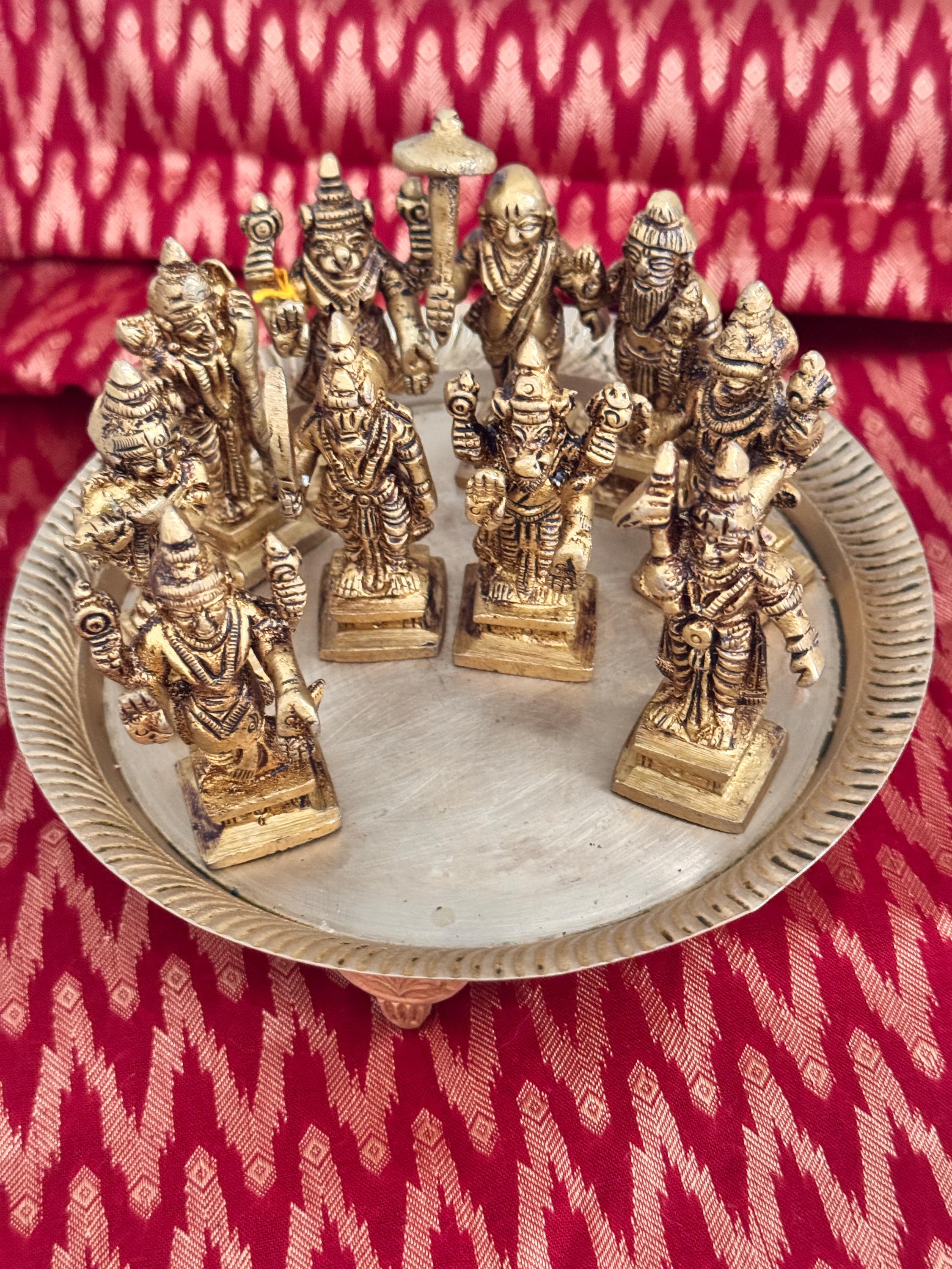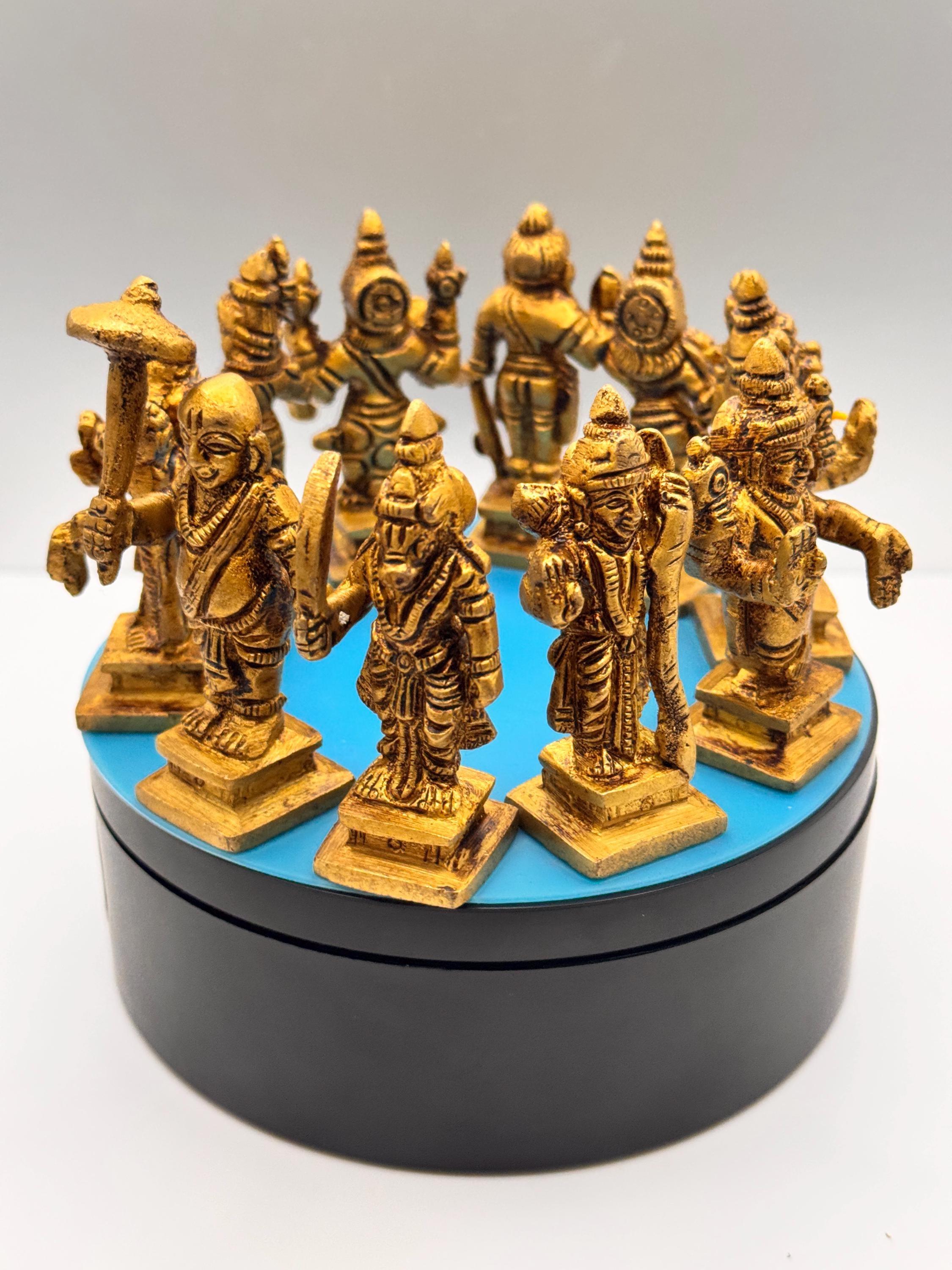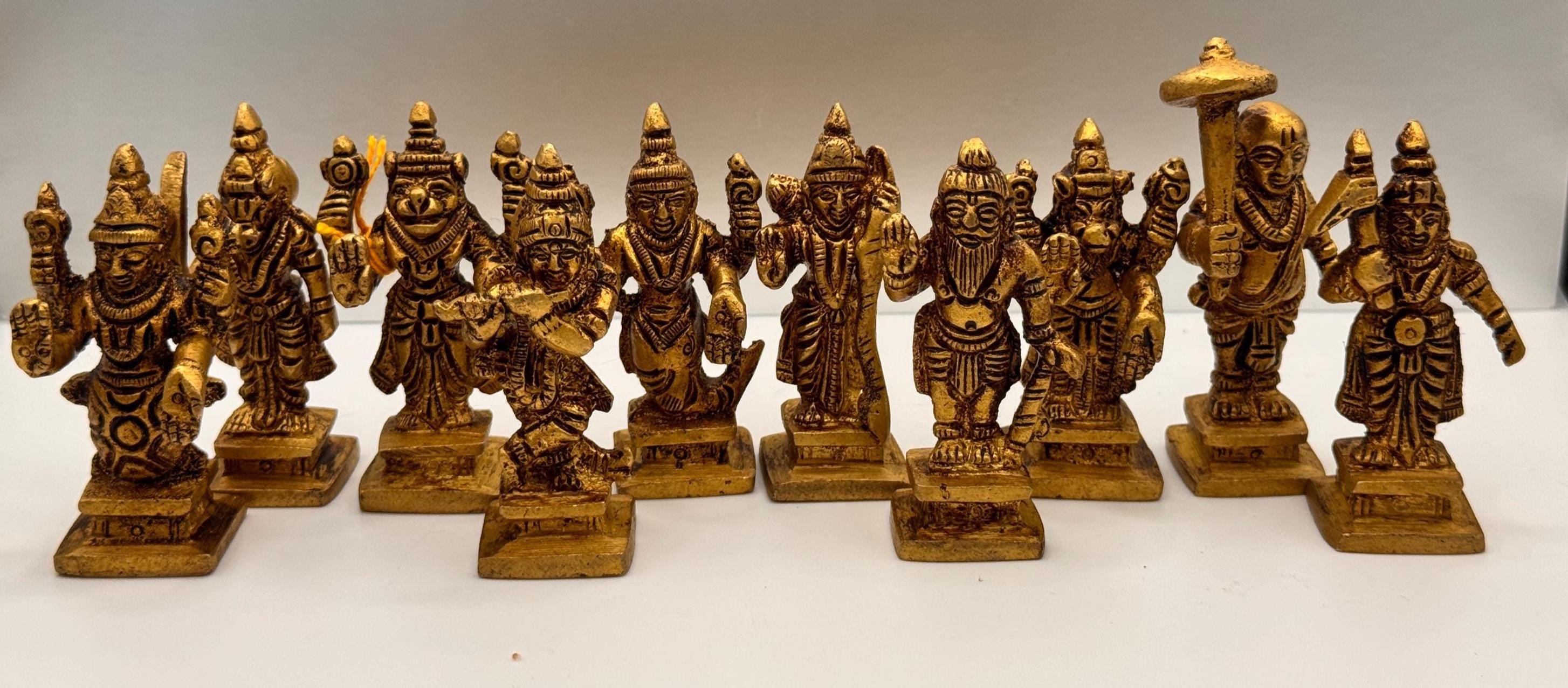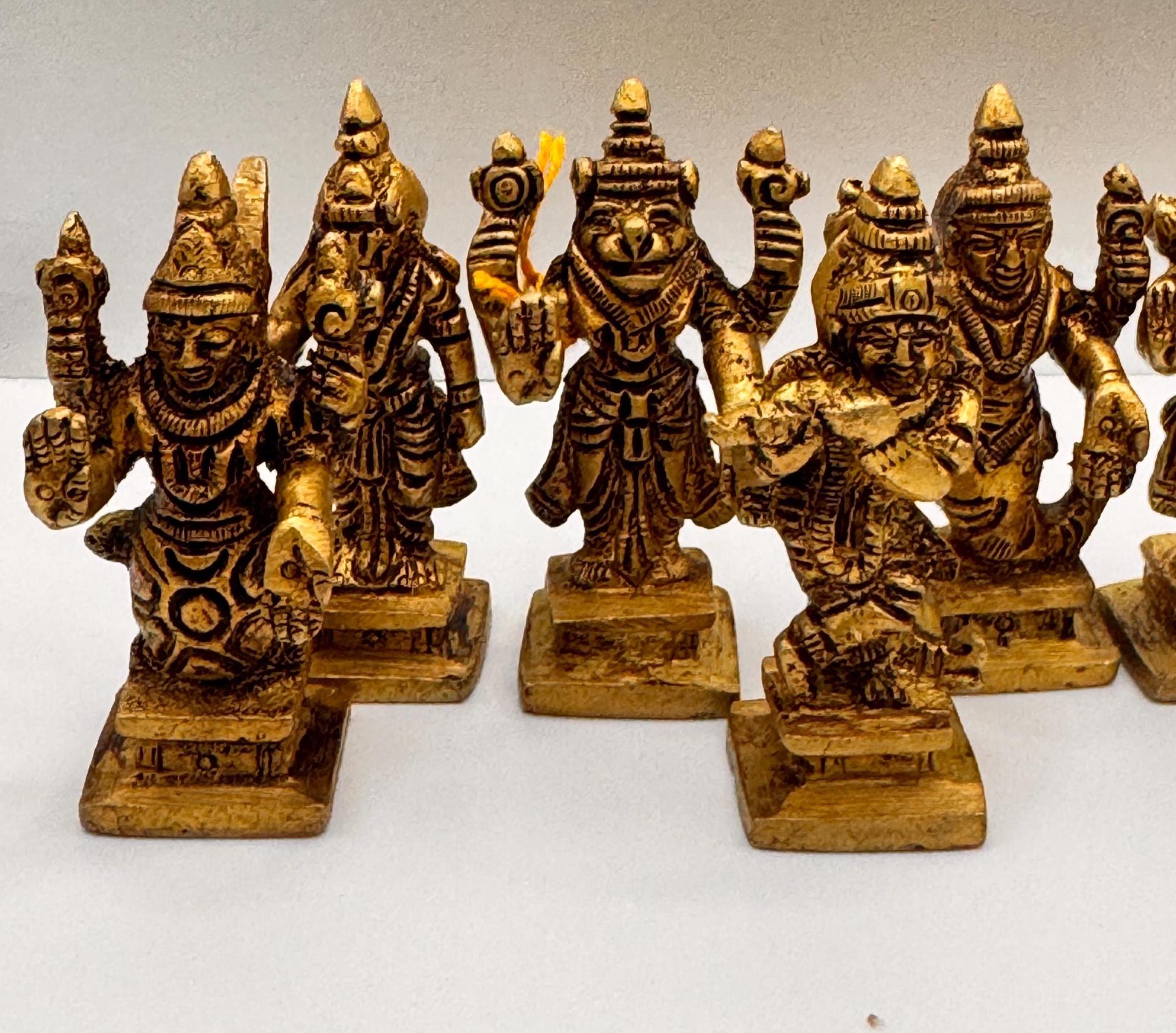 Expertly crafted with antique finish, this set of 10 Brass Dasavatharam Idols - Matsya, Kurma, Varaha, Narasimha, Vamana, Parasurama, Rama, Balarama, Krishna and Kalki. Made of high-quality brass, these idols serve as both a religious and decorative piece, adding a touch of elegance to any space. Height :2.5 Inches for each idol.