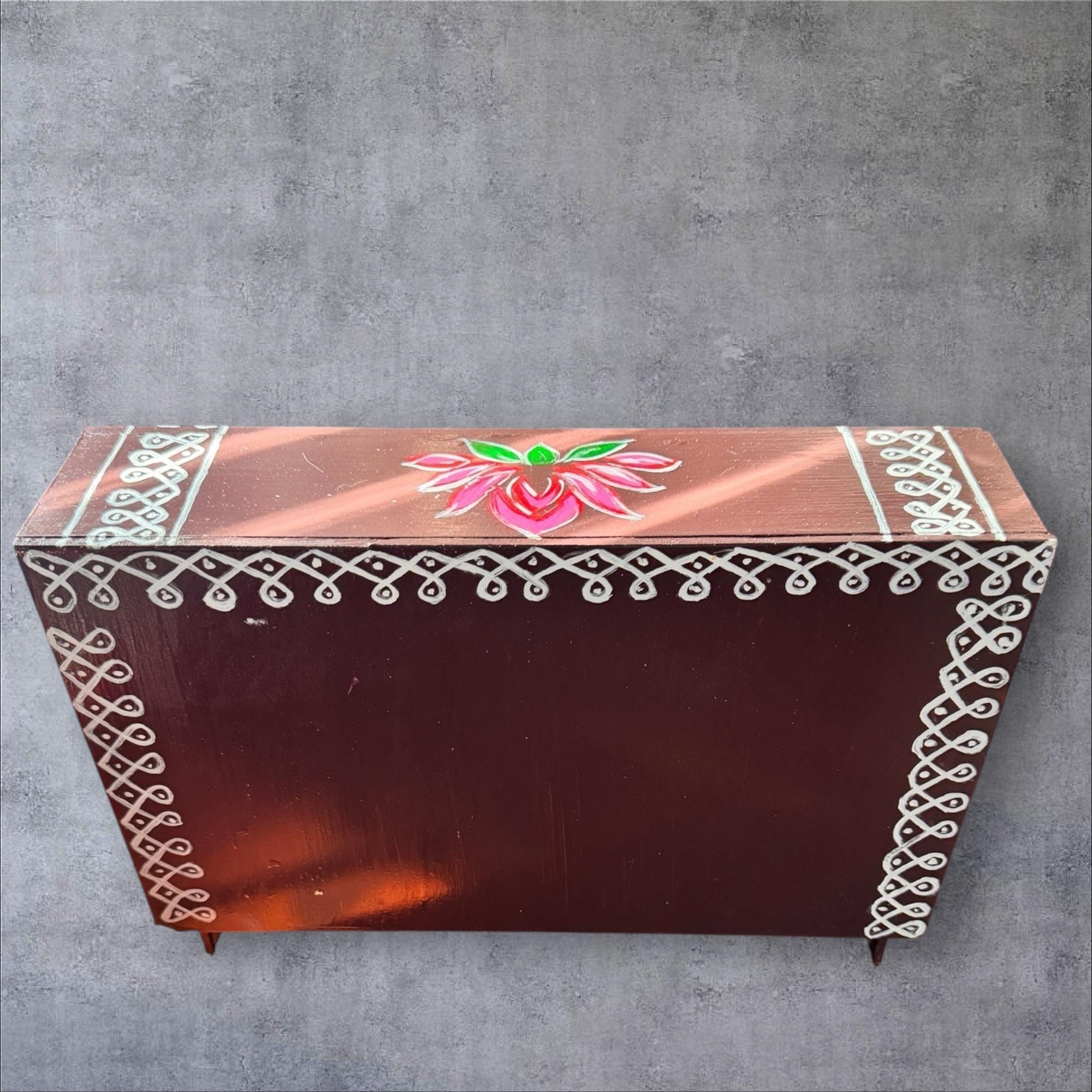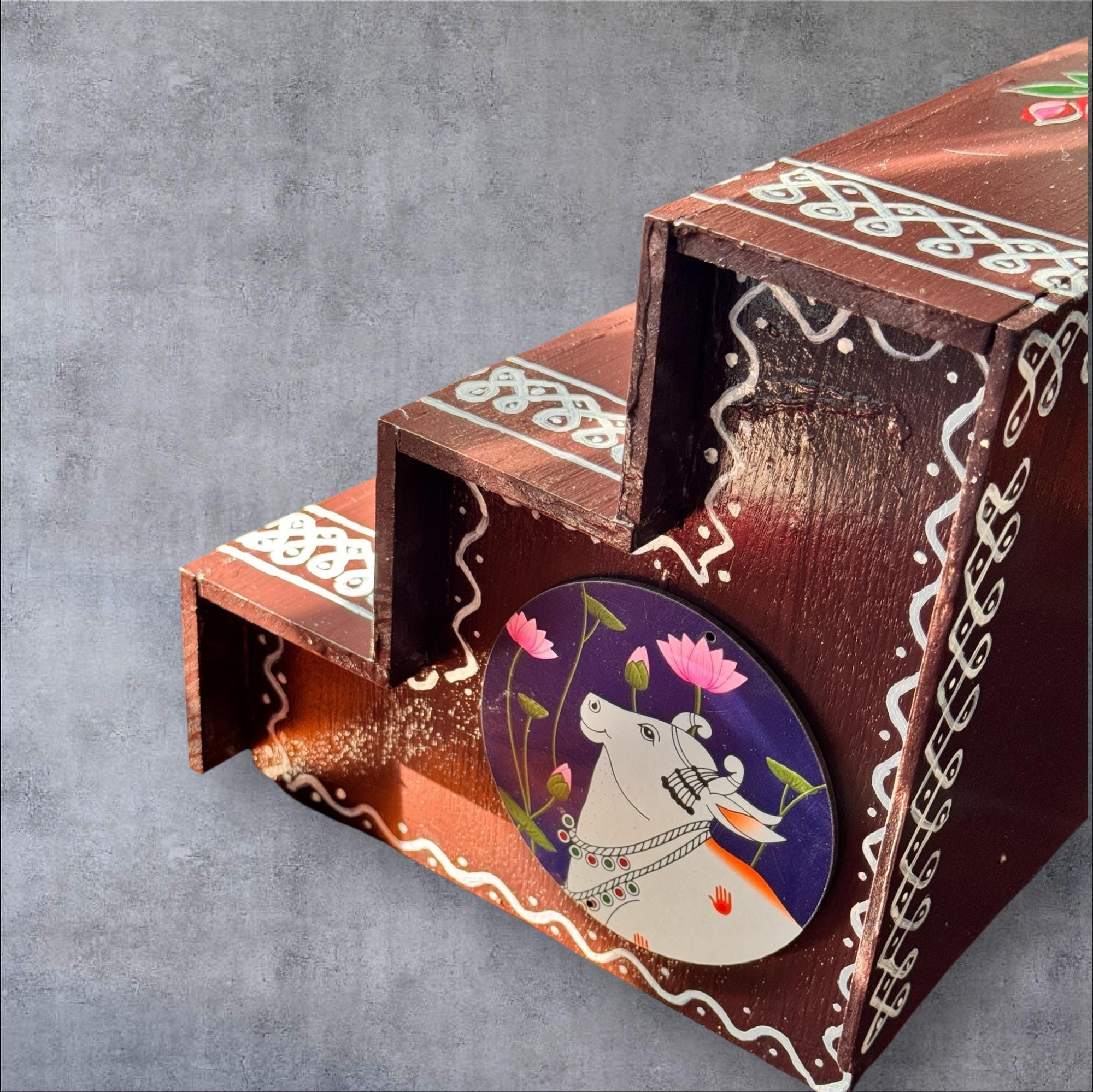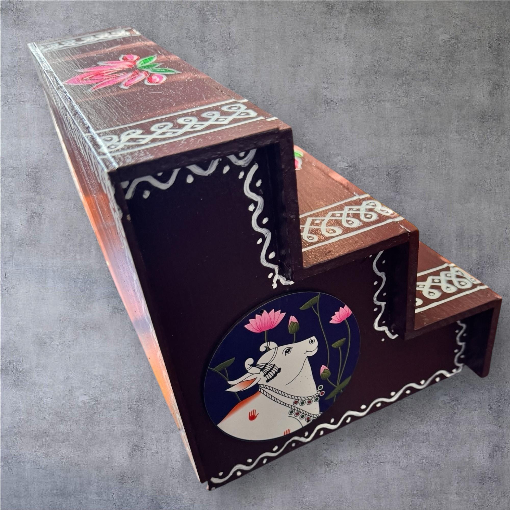 This 3 tiered shelf is made of wood and handpainted with traditional kolam designs and a pichwai styled cow motiff on the side to accentuate the overall look. Gold paint accentuates the color of the wood and gives it a fabulous look, that will compliment your puja or prayer room. It can also be used to keep your prayer idols for regular use. Varnished to retain the beautiful color and accents for years to come.