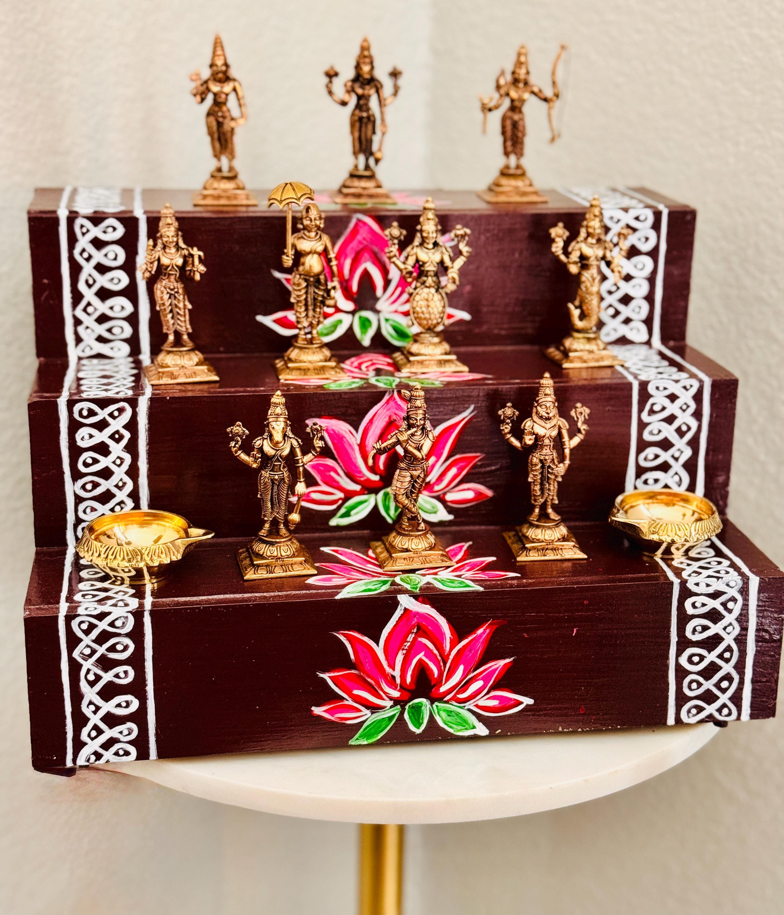 Commonly called as "Golu Padi" broadly referring to a tiered display stand used during the South Indian festival of Navaratri Golu, especially in Tamil Nadu, Andhra Pradesh, and Karnataka. It’s the heart of the doll arrangement tradition known as Bommai Golu or Bommala Koluvu, where families showcase dolls and figurines in a storytelling format.