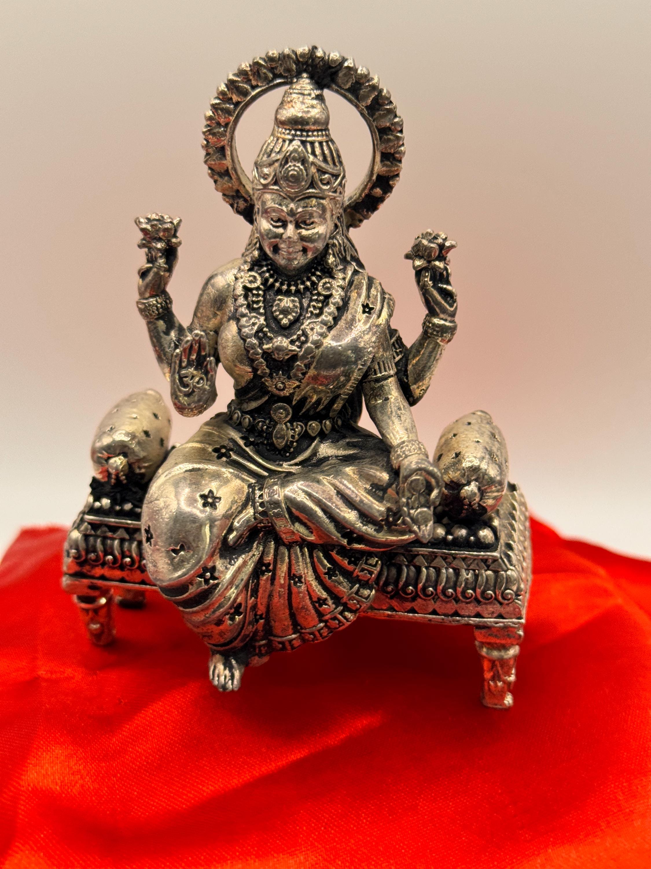Antique Finish German Silver Lakshmi Idol Exquisitely crafted in German silver with a regal antique finish, this Lakshmi idol radiates timeless elegance and divine grace. Depicted sitting on a beautiful peetam (engraved base), Goddess Lakshmi holds symbols of abundance and protection, making it a perfect centerpiece for worship, festive décor, or auspicious gifting. The antique polish enhances every intricate detail, bringing a touch of tradition and spiritual charm to your space. A perfect addition to your pooja room or festive décor, this idol brings blessings and elegance to any sacred space.