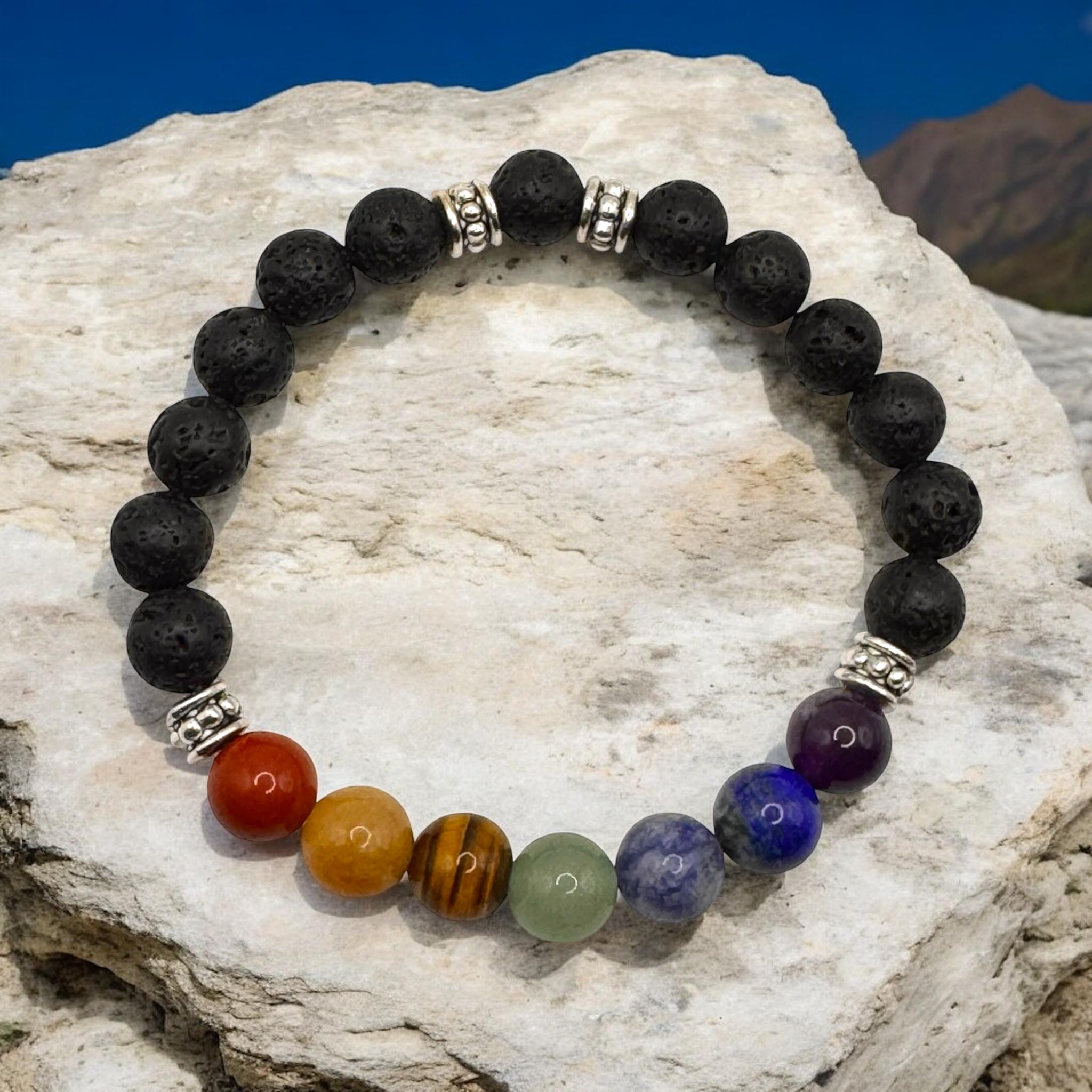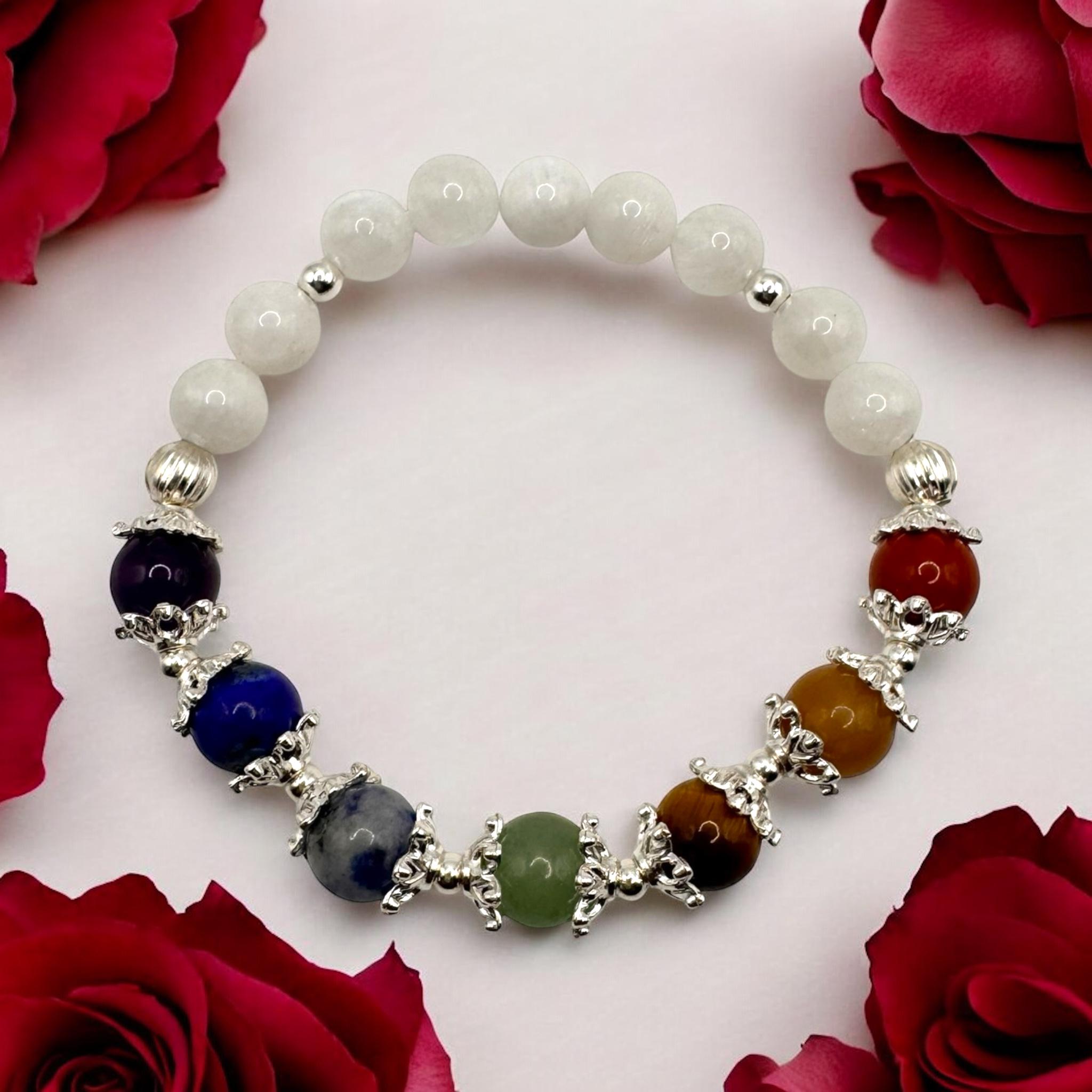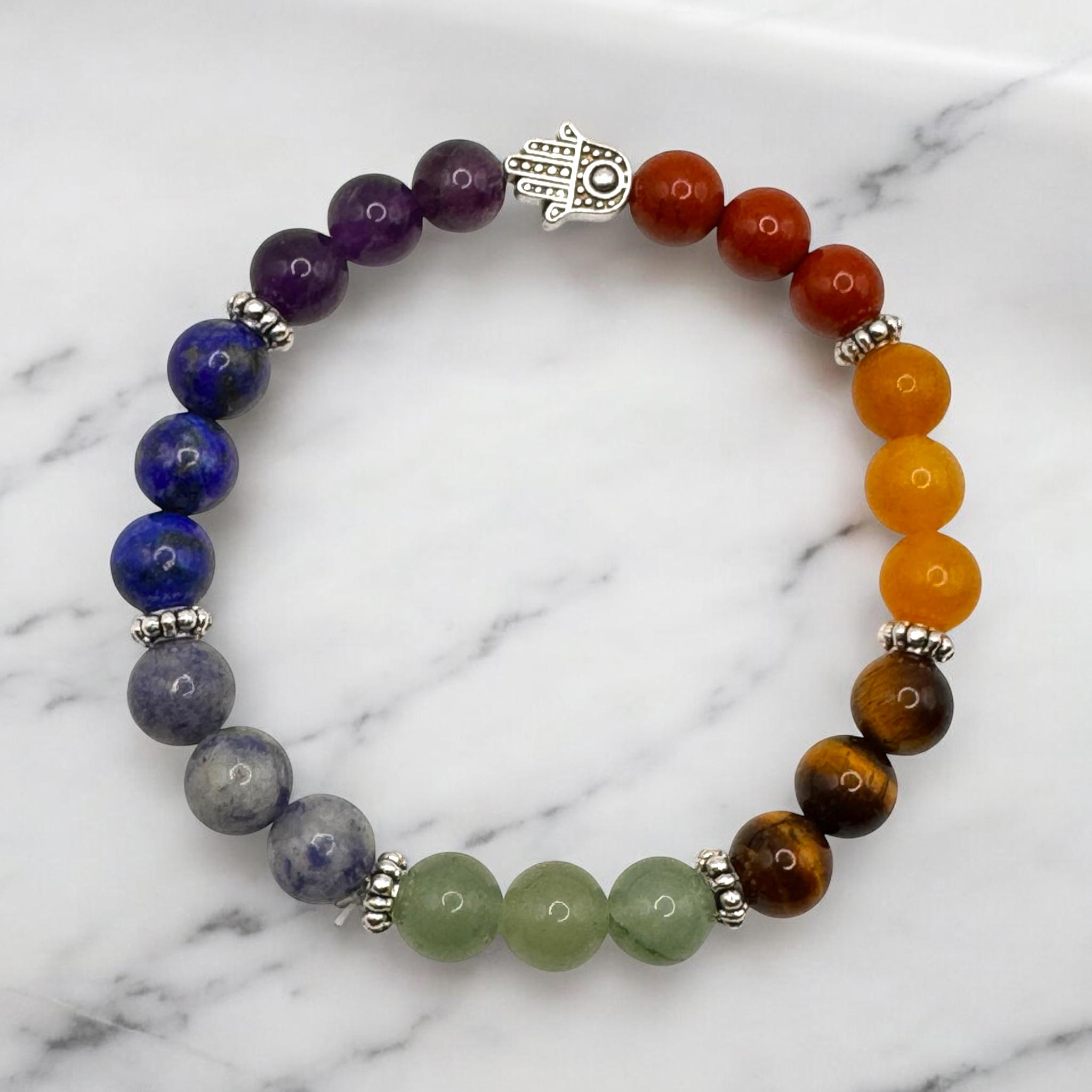 7 natural stones represent the 7 Chakras: Amethyst, (the Crown); Lapis (Third Eye); Sodalite (Throat); Green Aventurine (Heart); Tiger Eye (Solar Plexus); Yellow Jade (Sacral); and Red Jasper (Root). The 7 chakras are energy centers located along the spine in the human body. Each chakra is associated with specific physical, emotional, and spiritual aspects of our being.