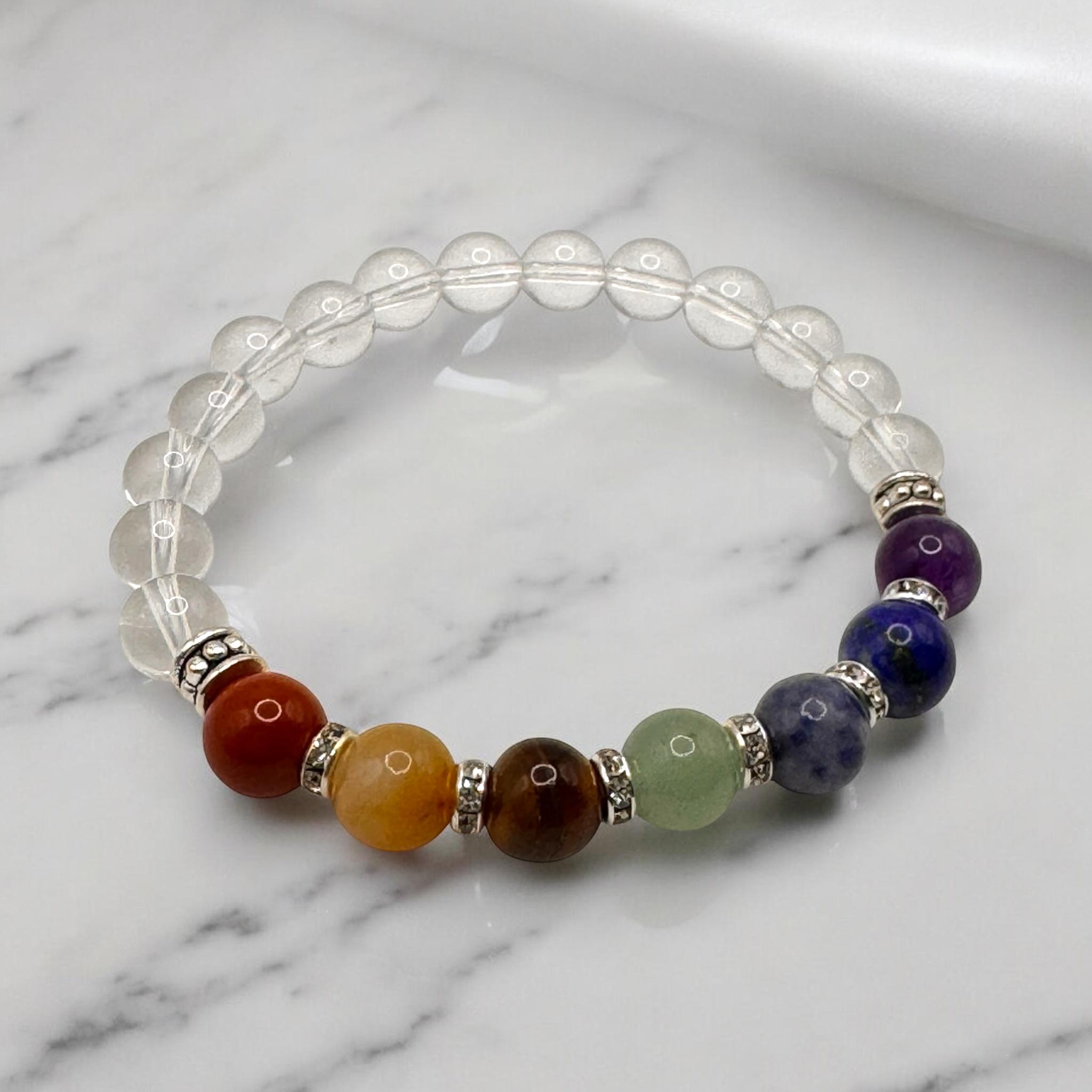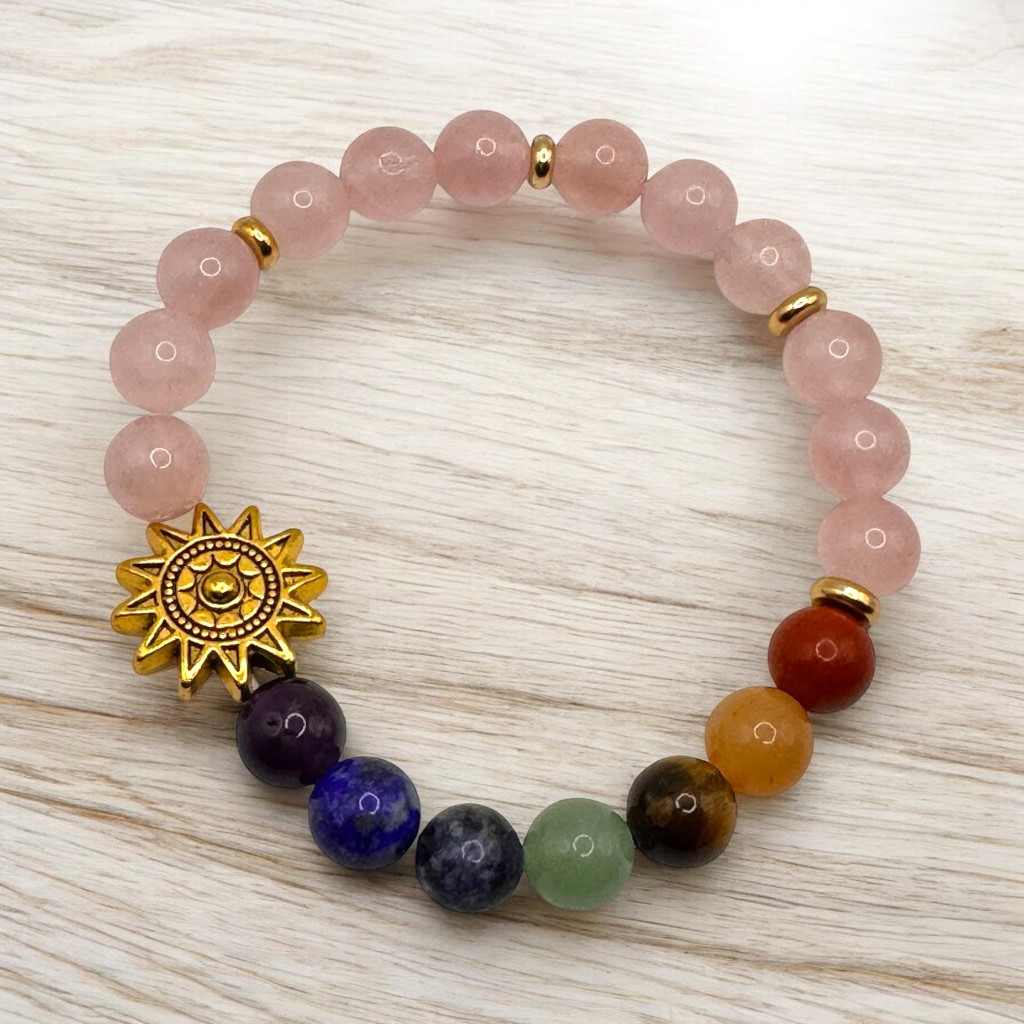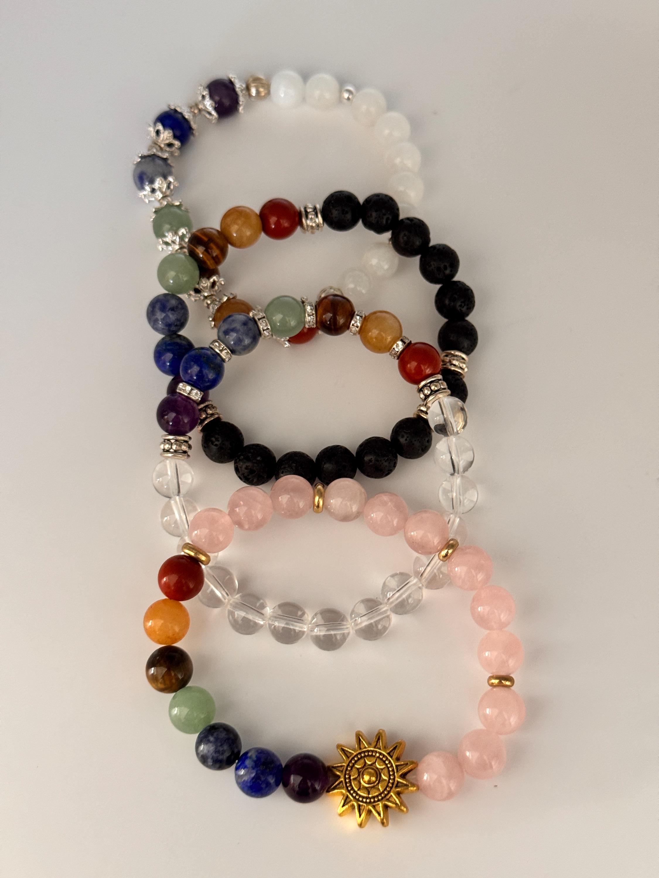 7 natural stones represent the 7 Chakras: Amethyst, (the Crown); Lapis (Third Eye); Sodalite (Throat); Green Aventurine (Heart); Tiger Eye (Solar Plexus); Yellow Jade (Sacral); and Red Jasper (Root). The 7 chakras are energy centers located along the spine in the human body. Each chakra is associated with specific physical, emotional, and spiritual aspects of our being.
