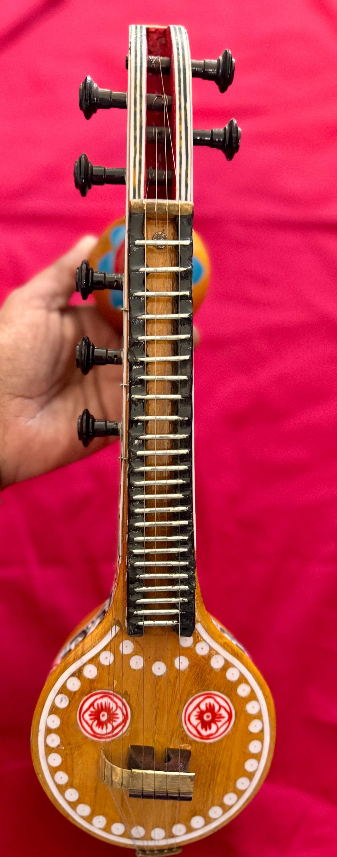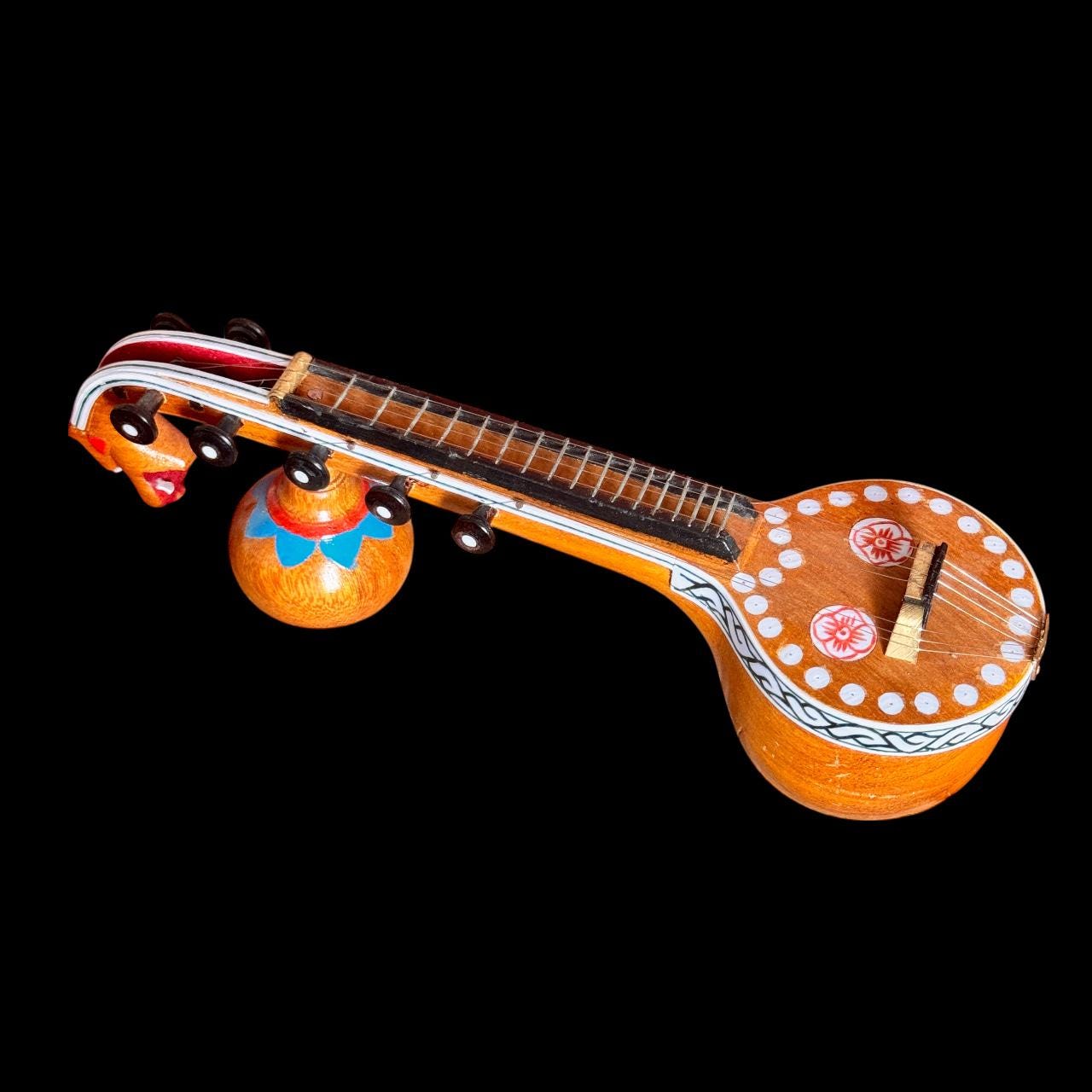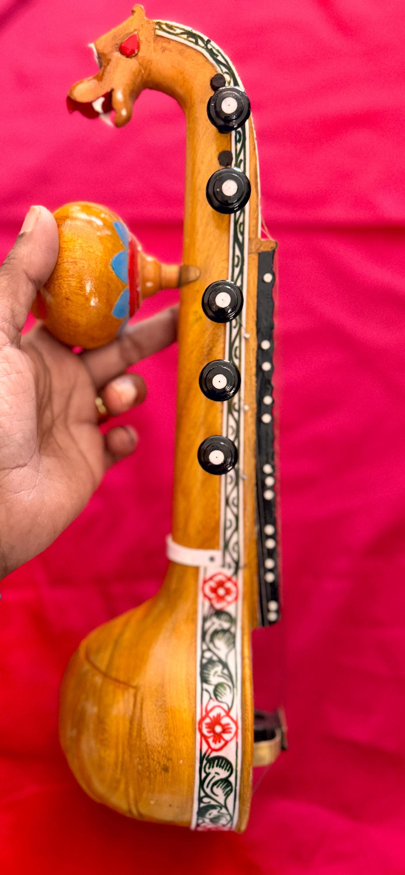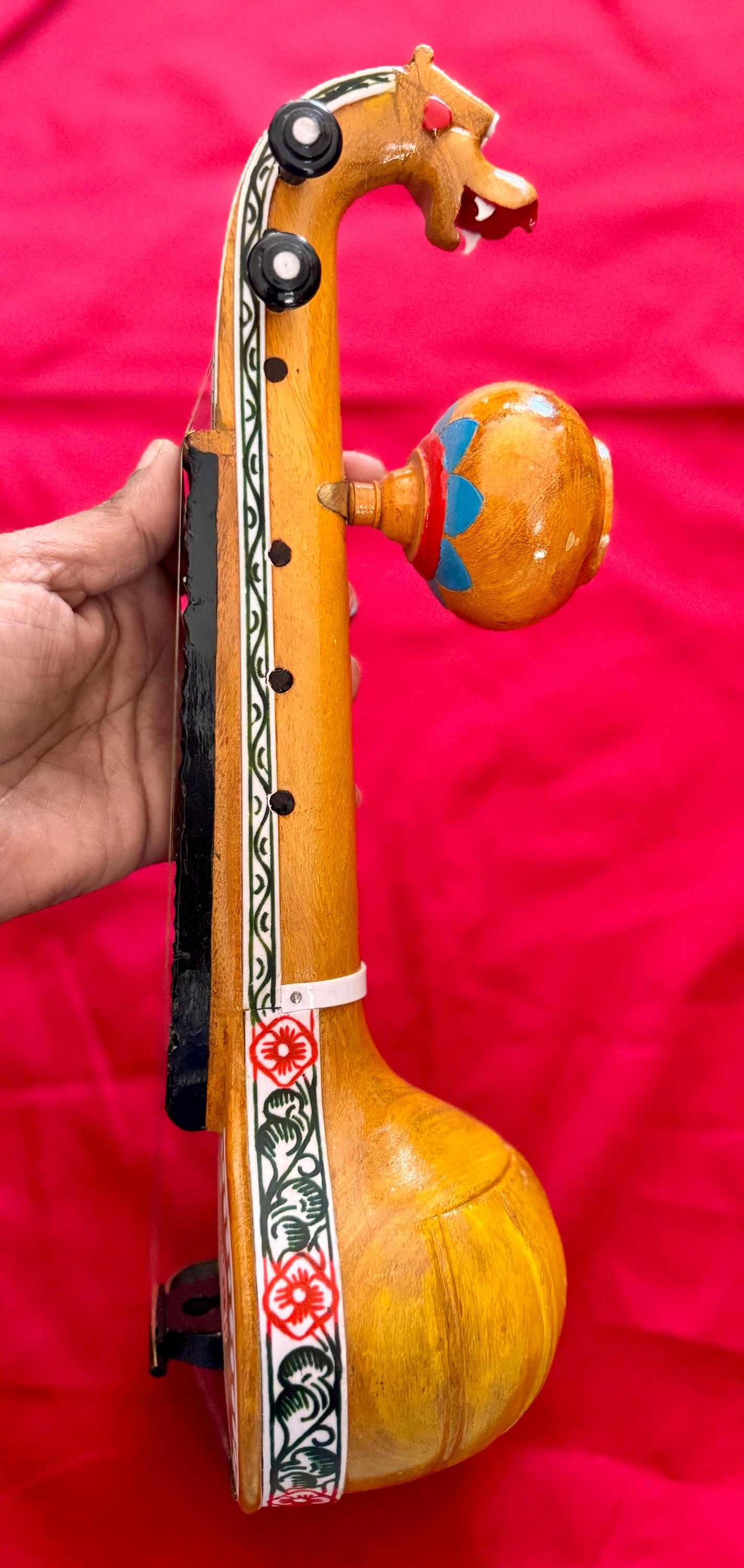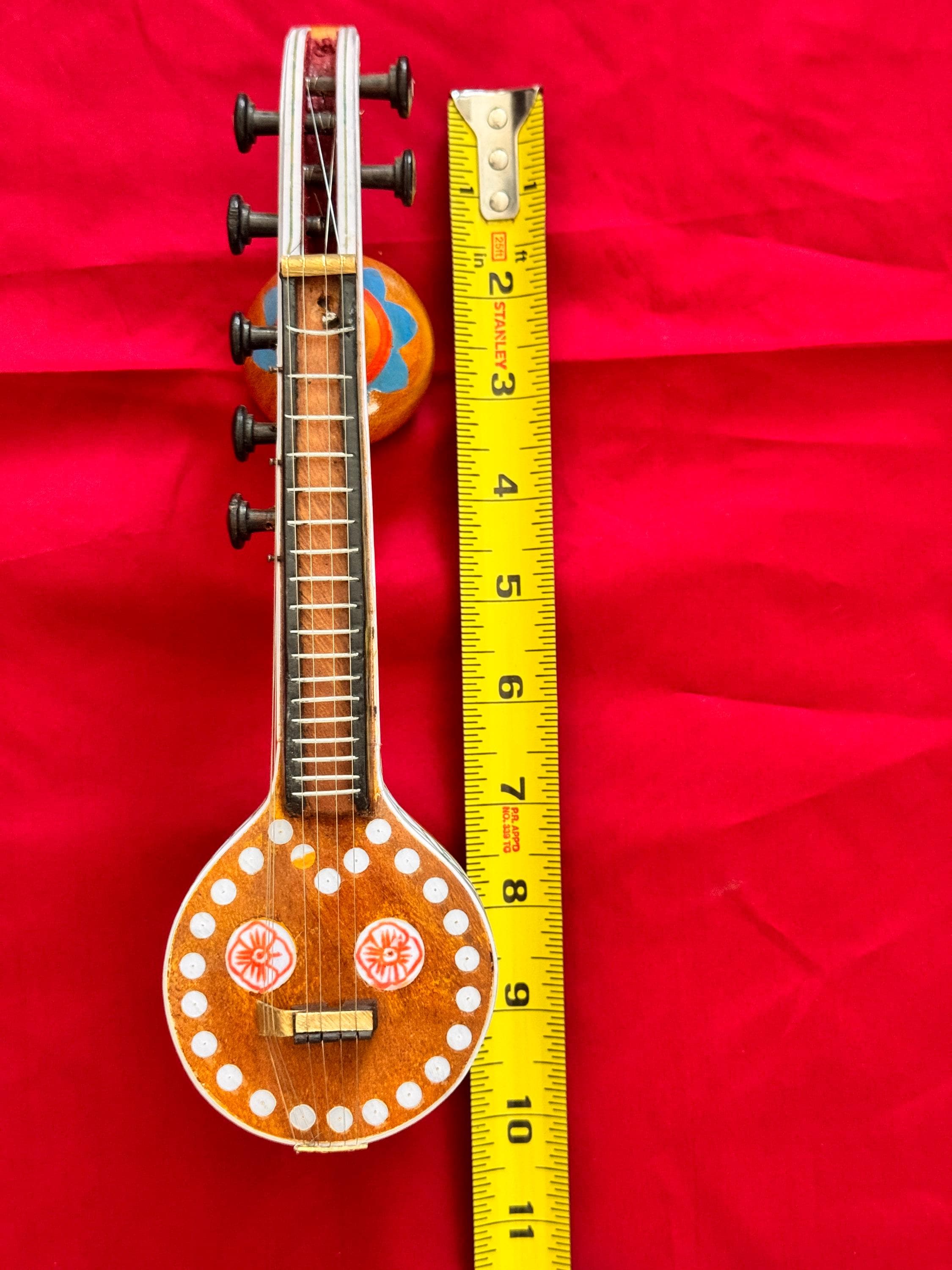 Carved from seasoned Jackfruit tree wood, the miniature Bobbili Veena radiates timeless beauty and cultural finesse. Its body is adorned with intricate inlay work that stretches gracefully along its length, culminating in a majestic lion face at the tip of the dandi, symbolizing strength and artistry. Every detail — from the precisely positioned knobs and bridges to the finely strung wires — is meticulously crafted to embody the soul of a true musical instrument. This miniature marvel is not just a visual delight, but a celebration of tradition, precision, and musical heritage. Length: 9 inches and 12 inch sizes available. These are rare collectibles. Very treasured and considered as ancestral gift for generations . Please note that these do not have any functional aspect and they cannot be played. Listing is for one veena.