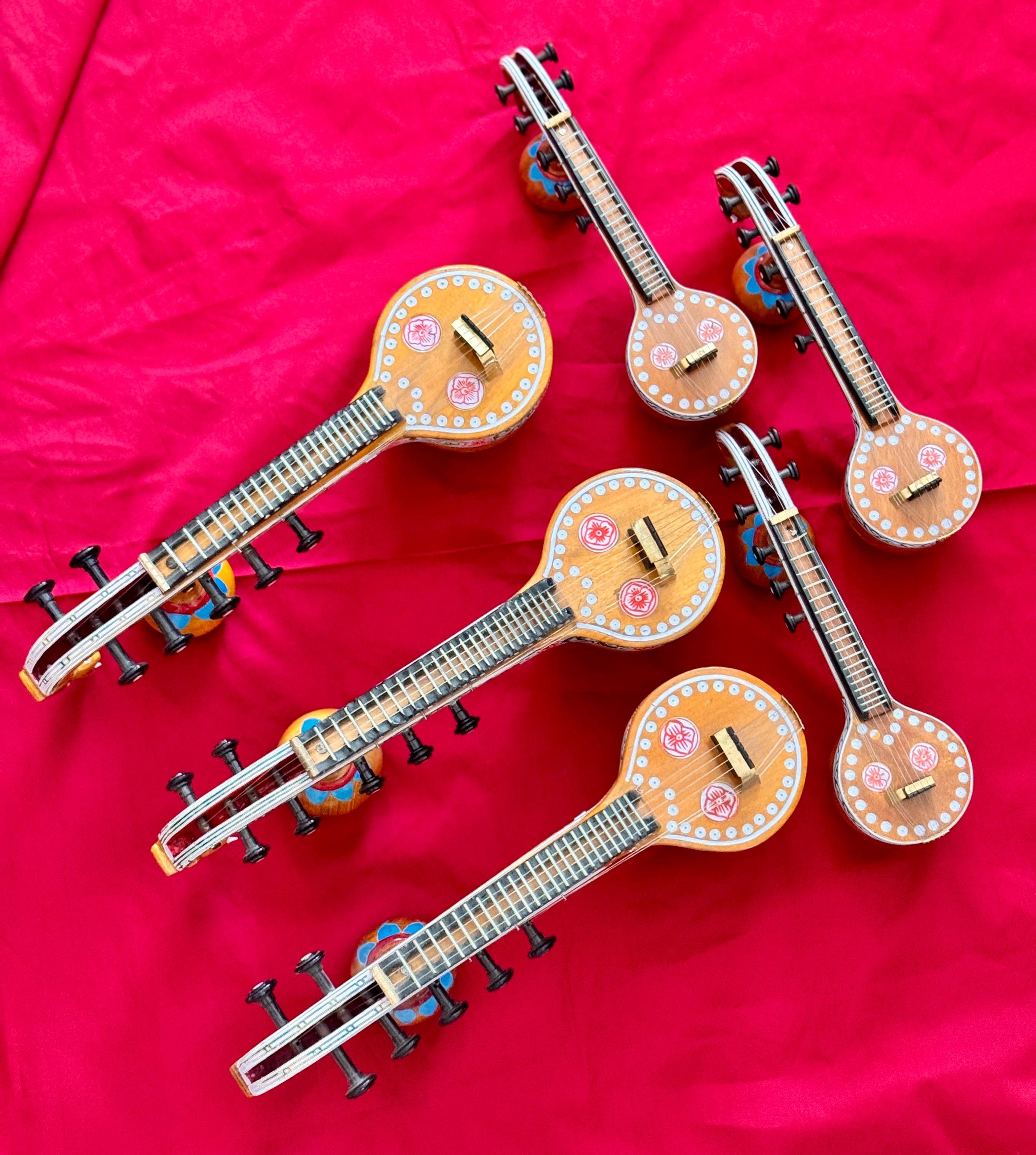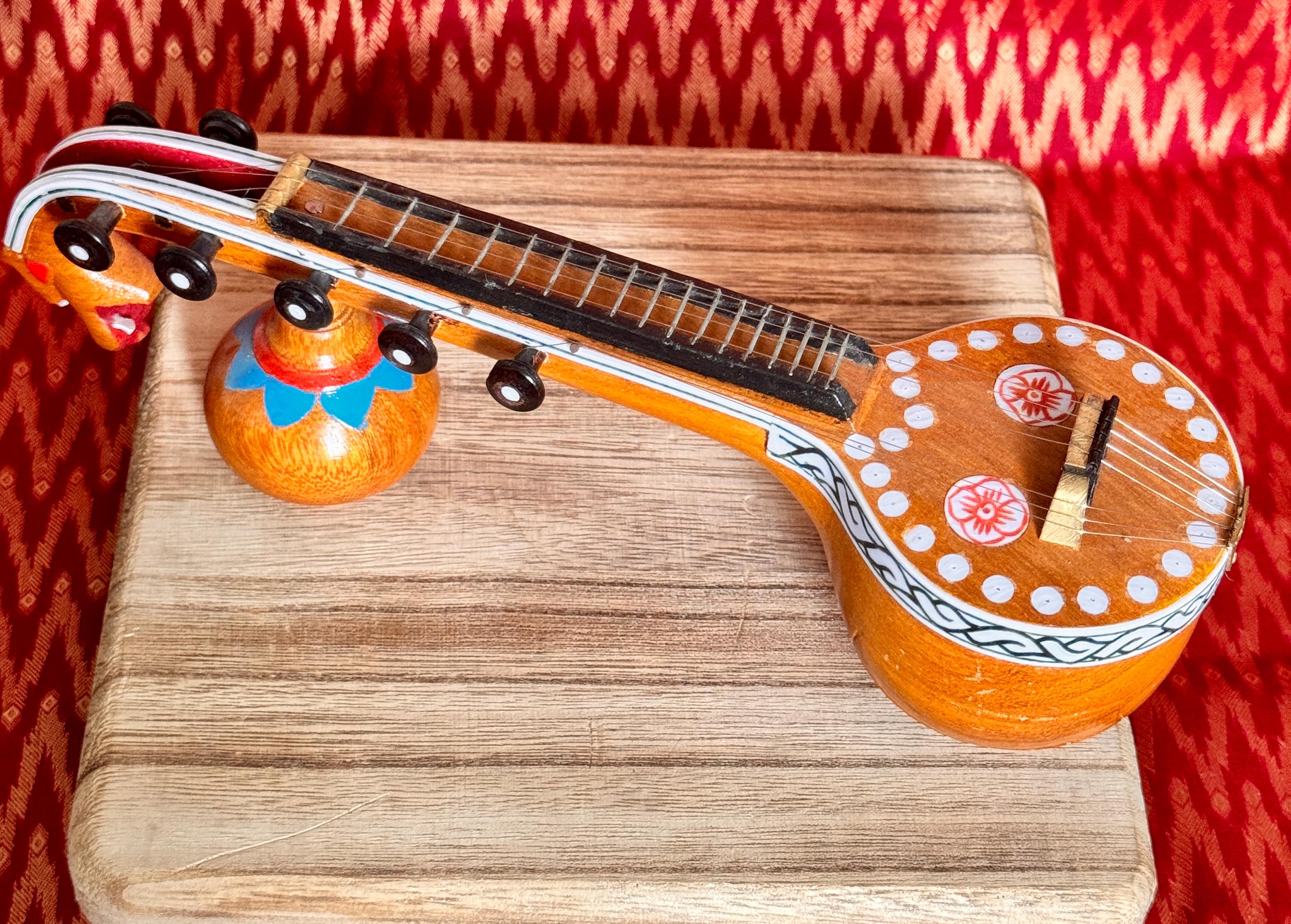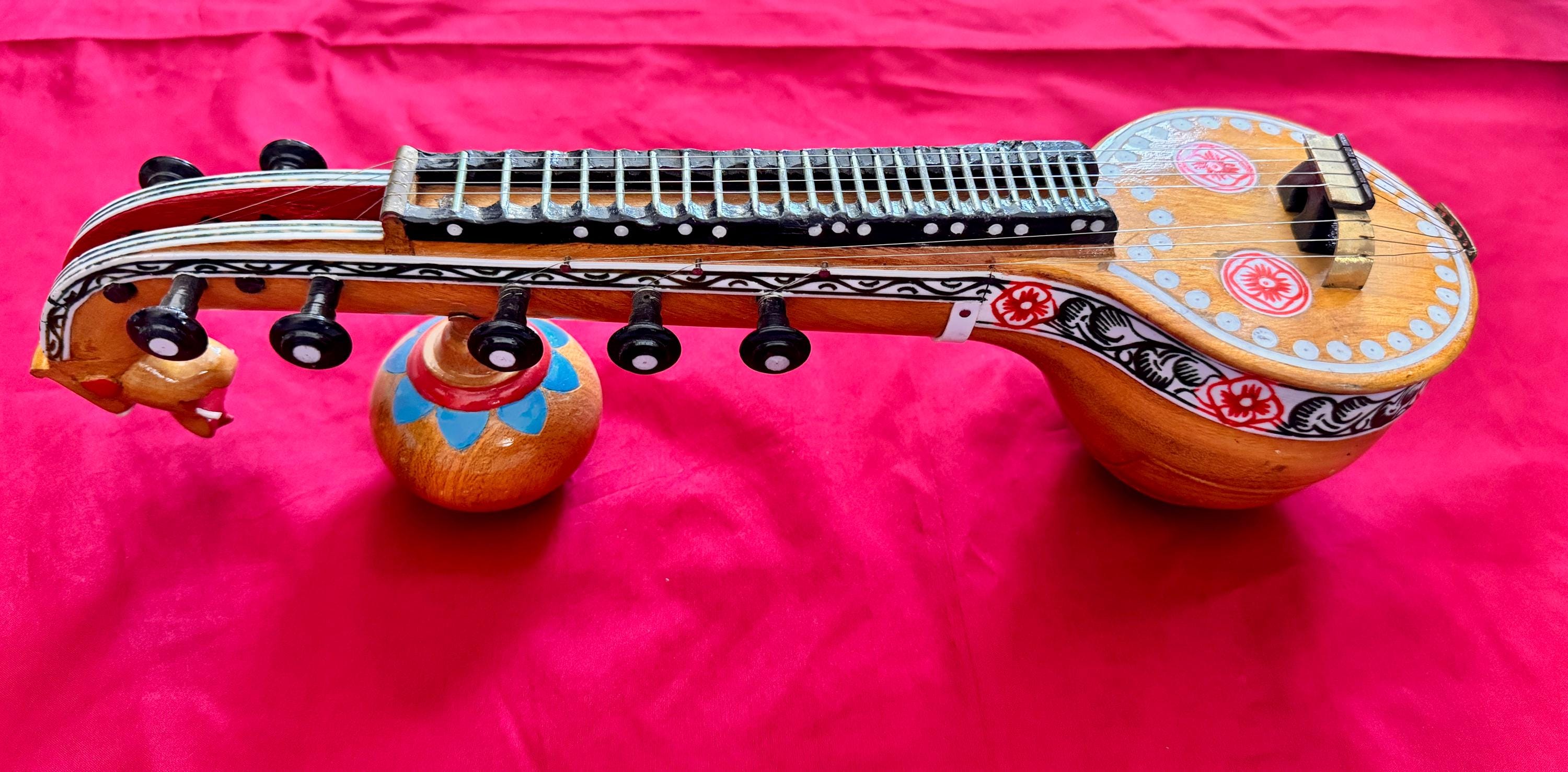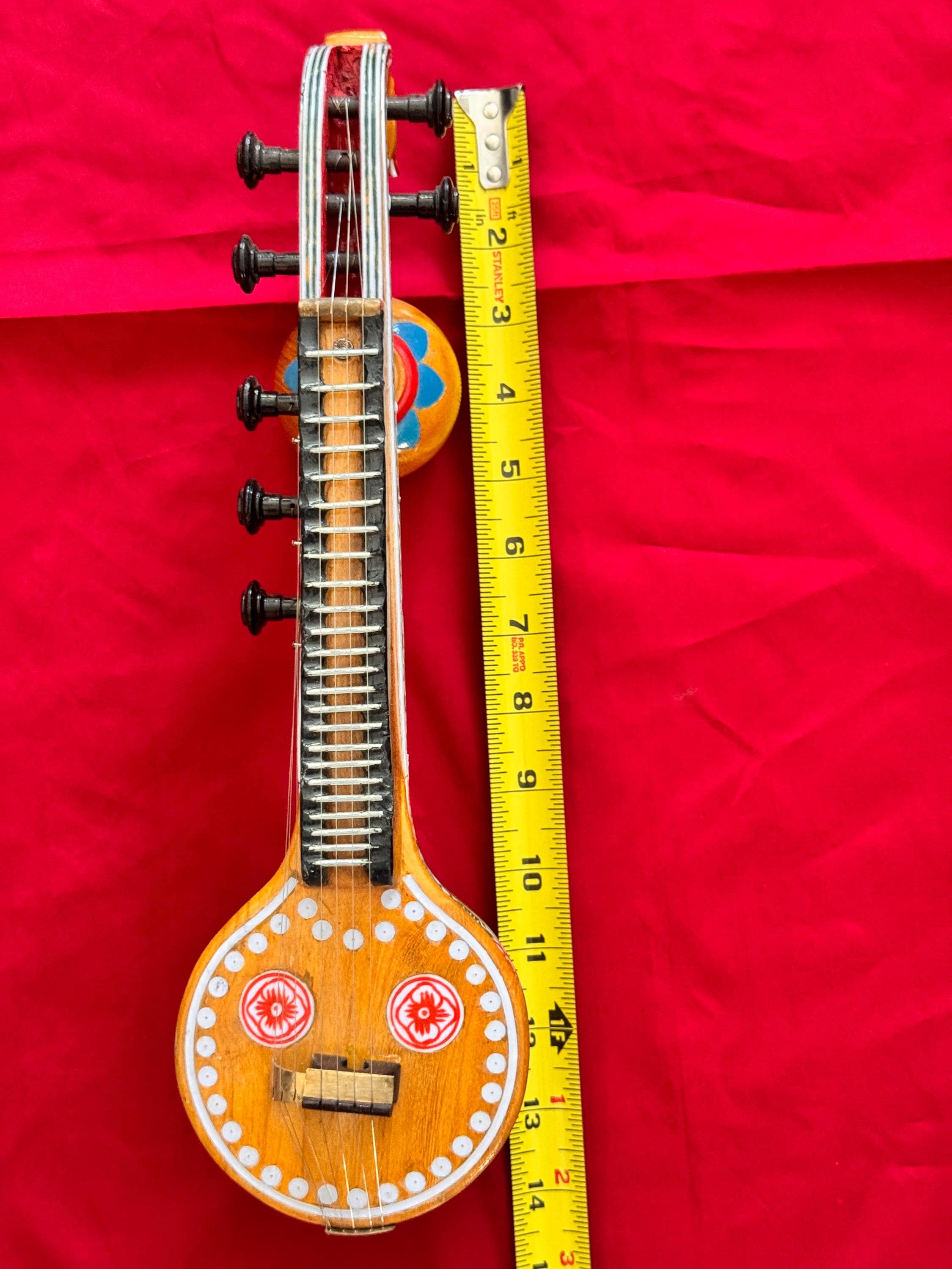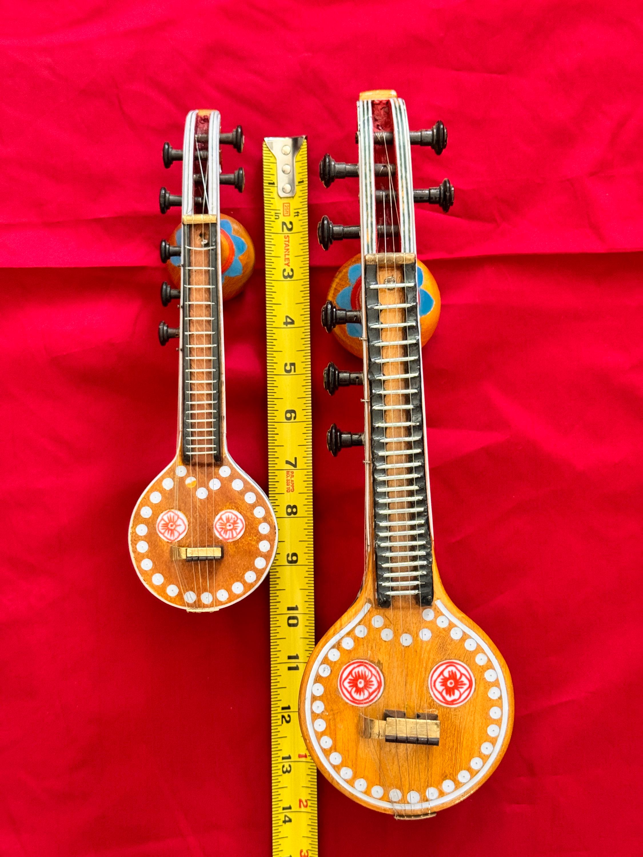 Carved from seasoned Jackfruit tree wood, the miniature Bobbili Veena radiates timeless beauty and cultural finesse. Its body is adorned with intricate inlay work that stretches gracefully along its length, culminating in a majestic lion face at the tip of the dandi, symbolizing strength and artistry. Every detail — from the precisely positioned knobs and bridges to the finely strung wires — is meticulously crafted to embody the soul of a true musical instrument. This miniature marvel is not just a visual delight, but a celebration of tradition, precision, and musical heritage. Length: 9 inches and 12 inch sizes available. These are rare collectibles. Very treasured and considered as ancestral gift for generations . Please note that these do not have any functional aspect and they cannot be played. Listing is for one veena.