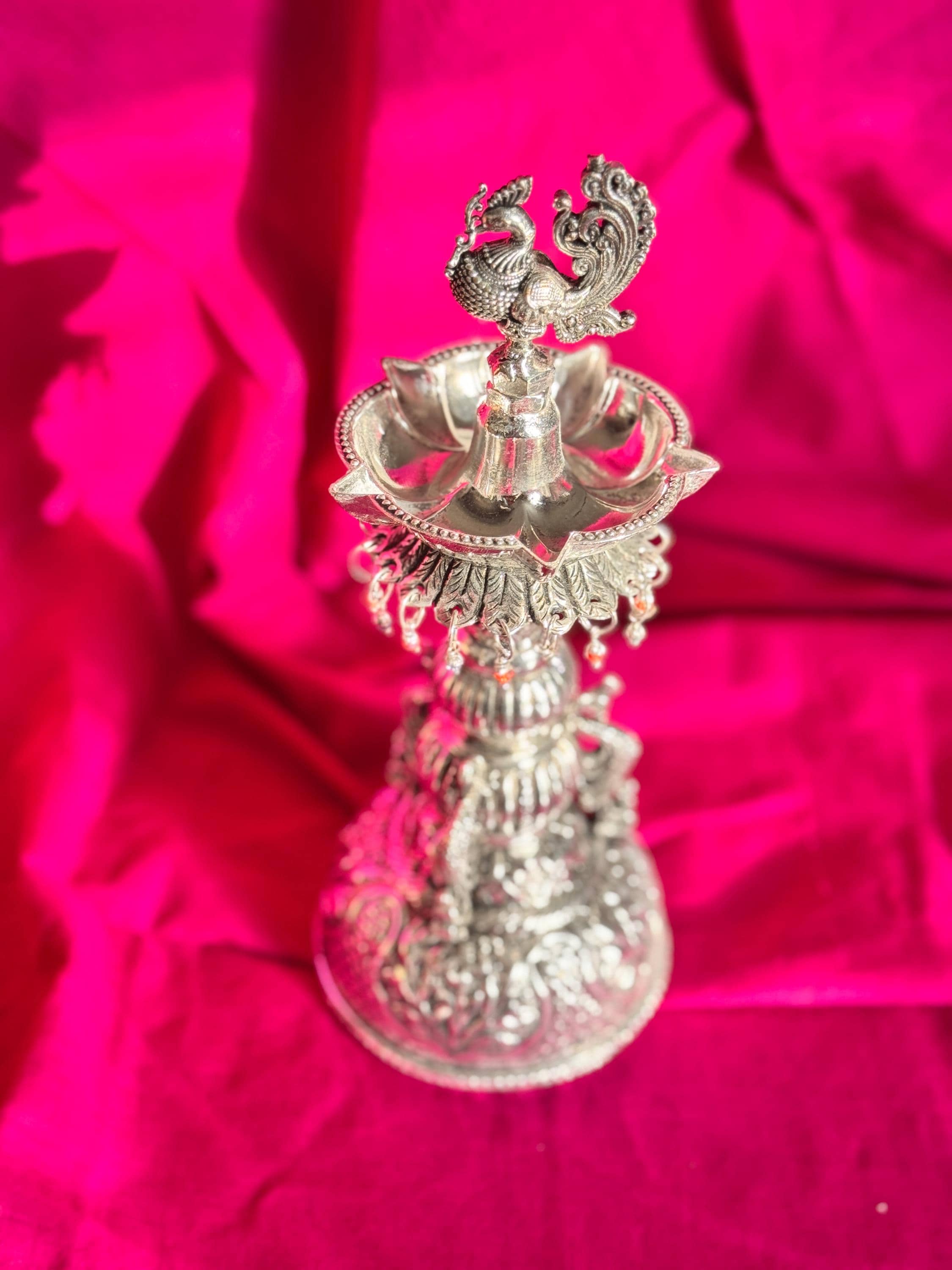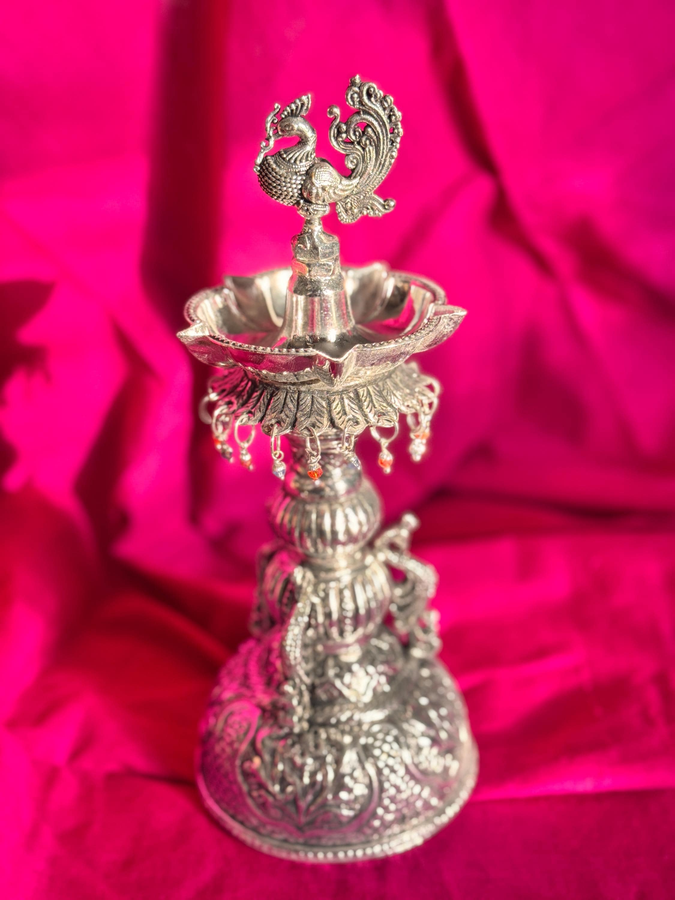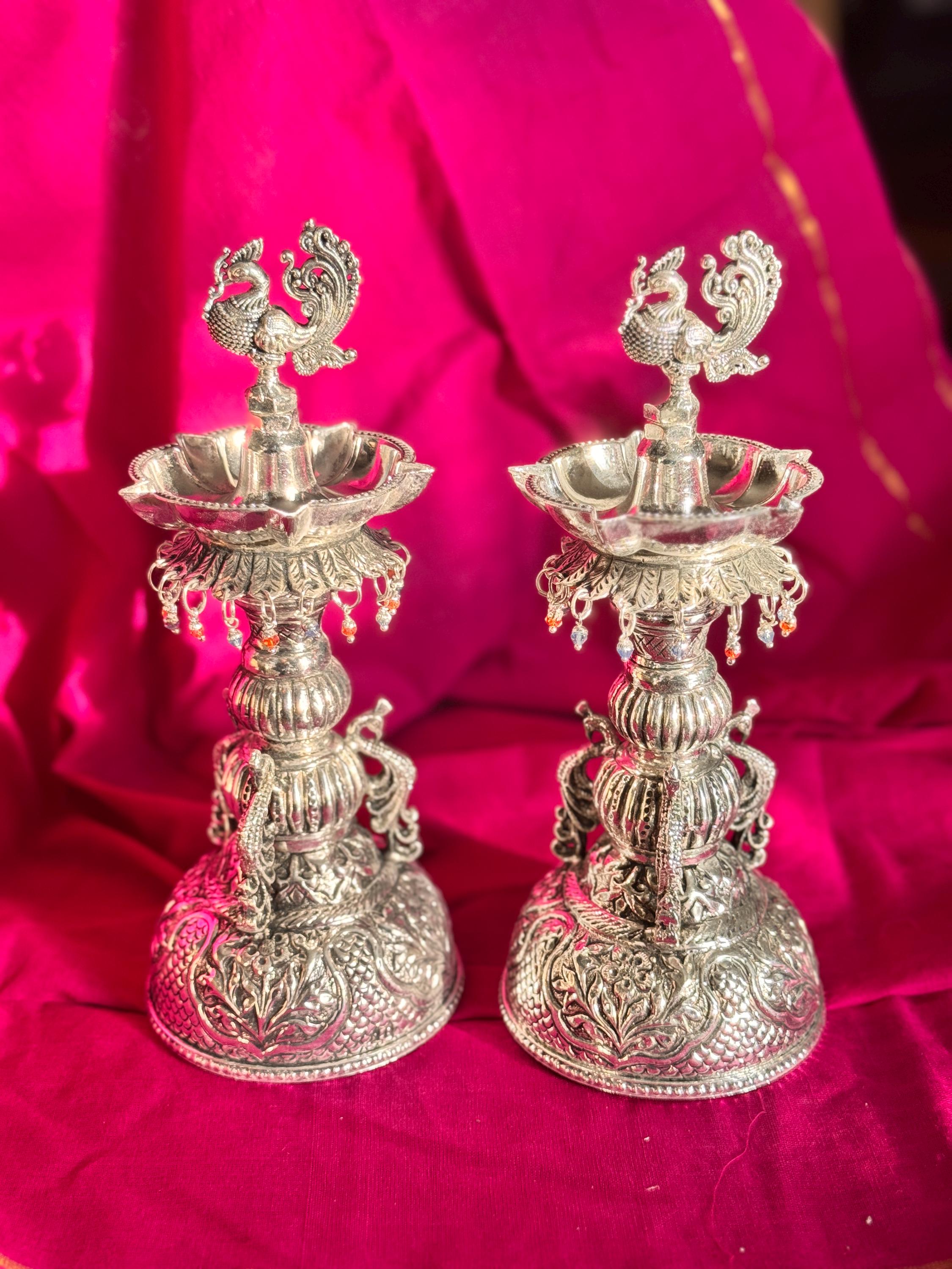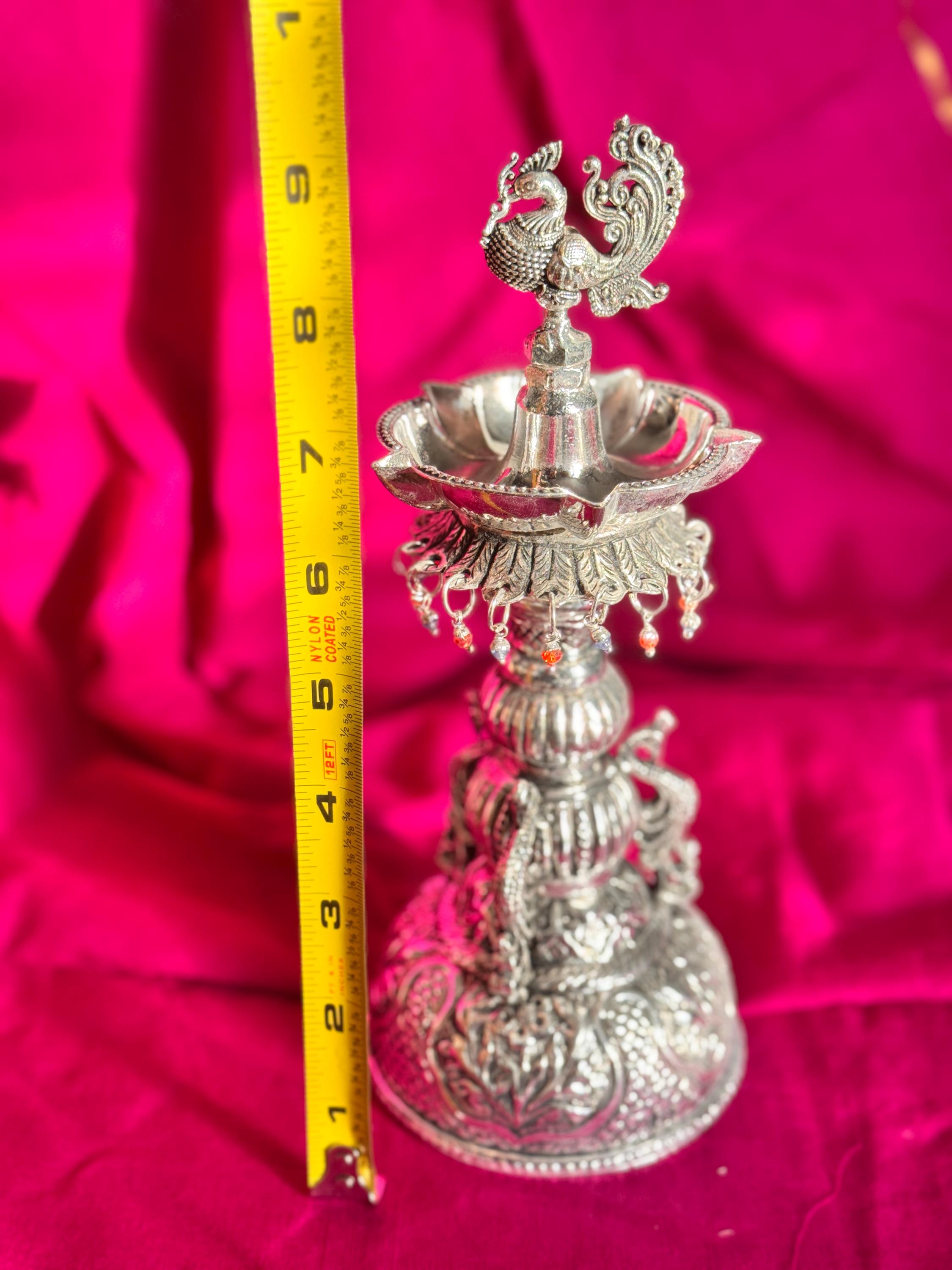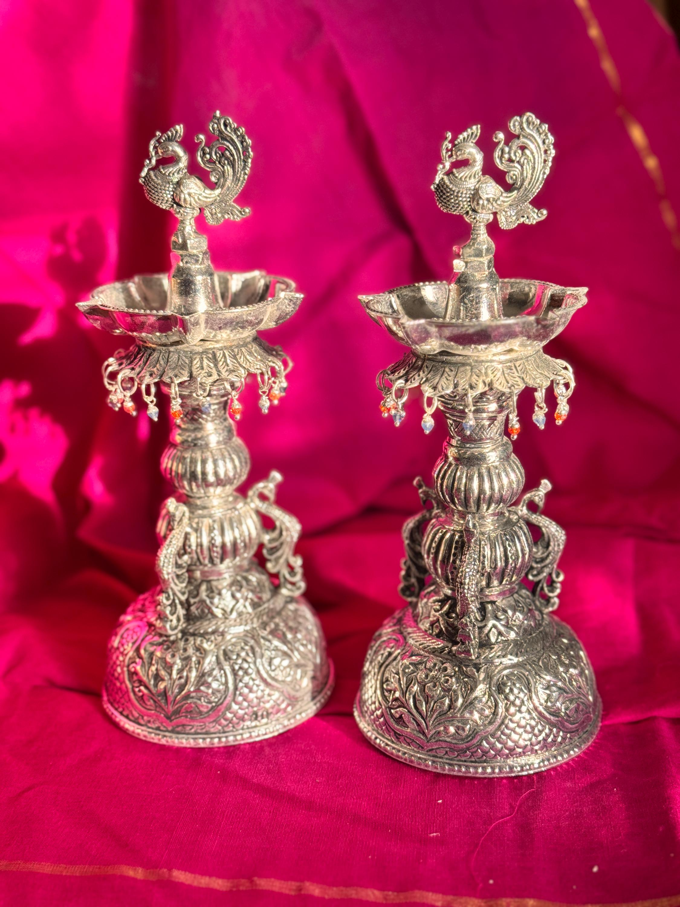 Vibrant German silver antique finish standing lamps. You will receive one pair of lamps. Auspicious for home and brings prosperity. Use in prayer room or for gifting for your loved ones. Wishing you good luck and prosperity. 🙏
