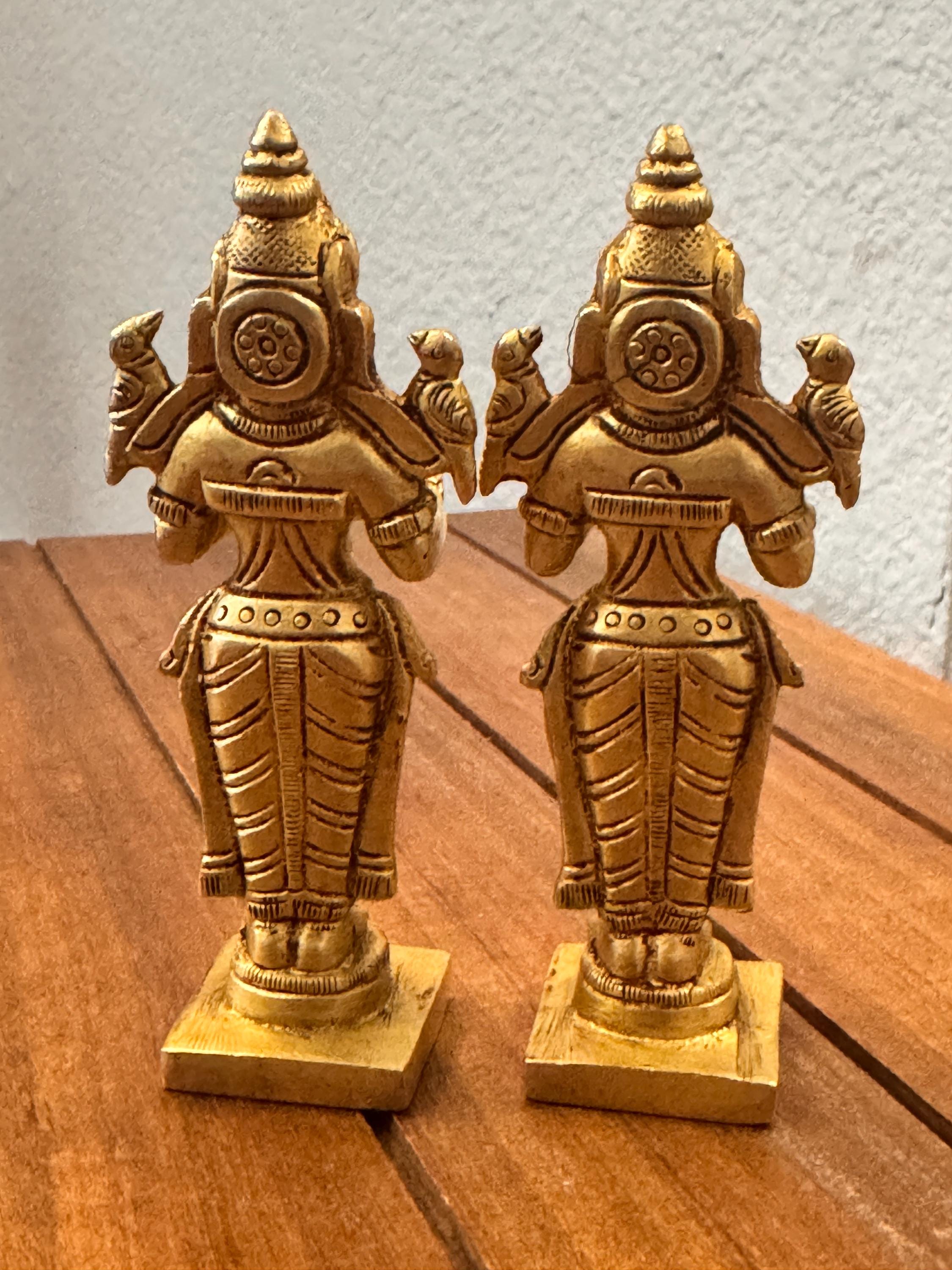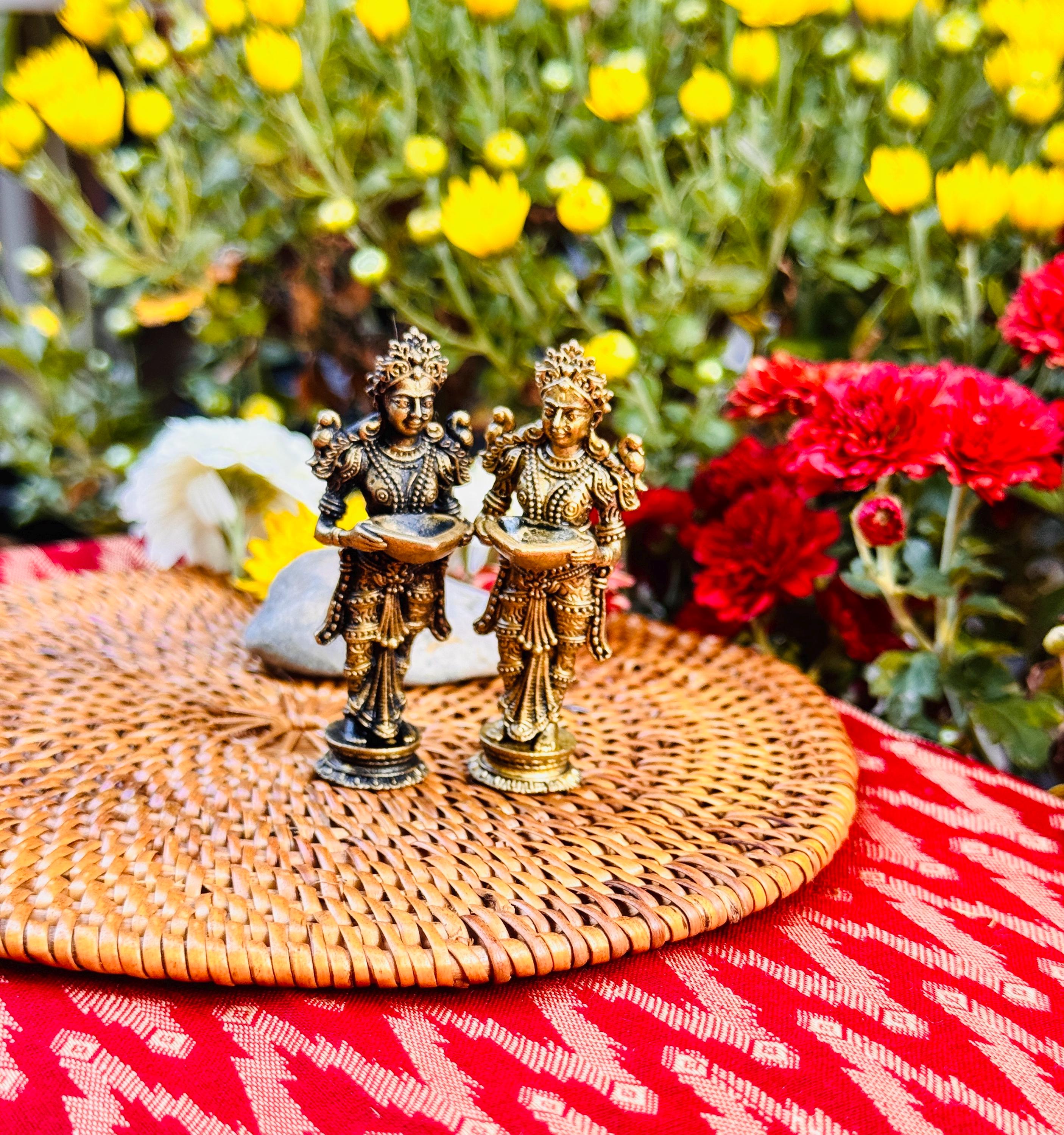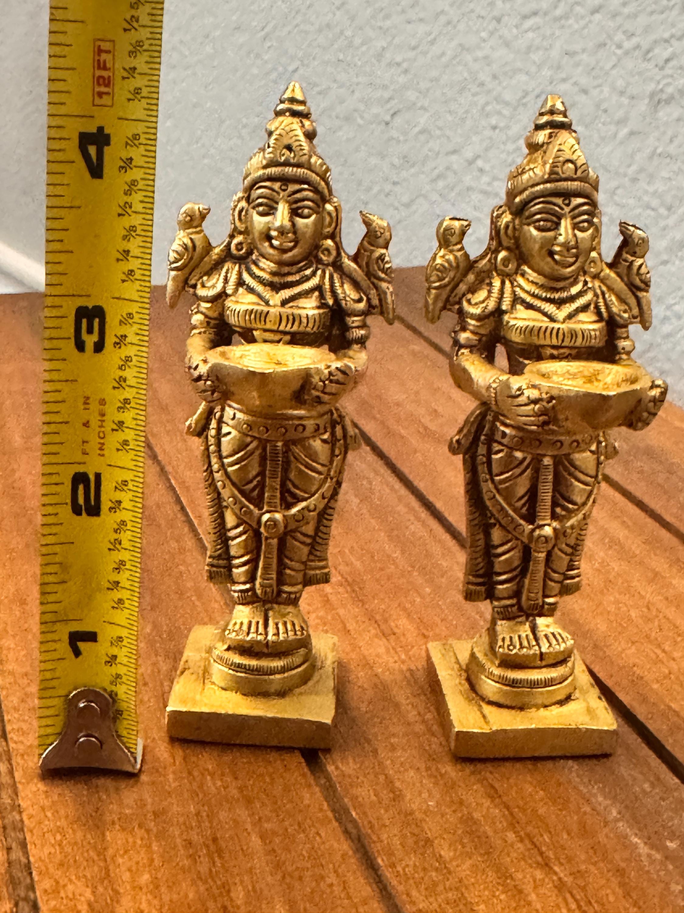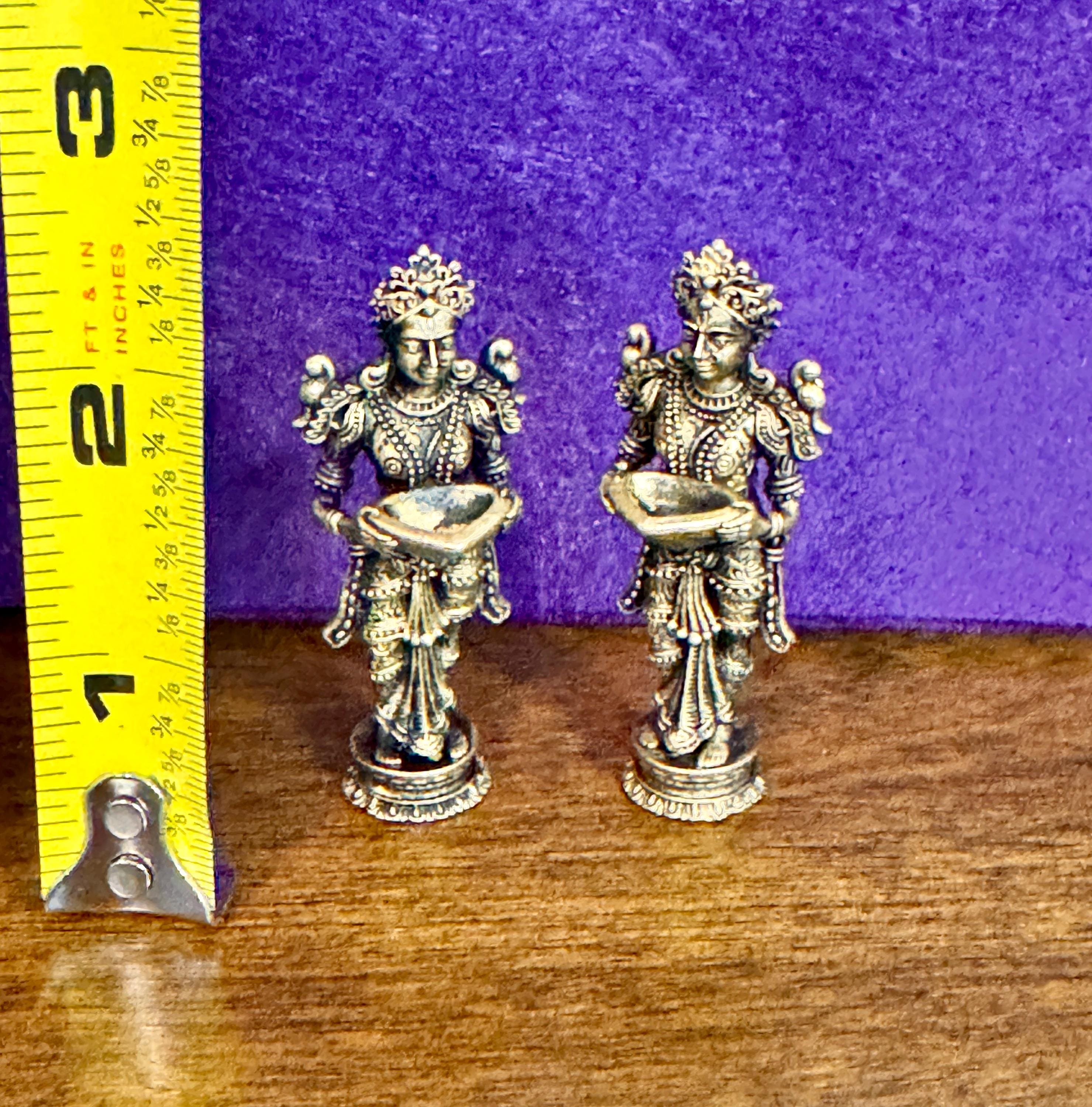 Featuring our rare collection of compact and elegant brass idols for your home. This is a rare find - beautiful pair of ladies with a lamp. Please check the pics for details of size.
