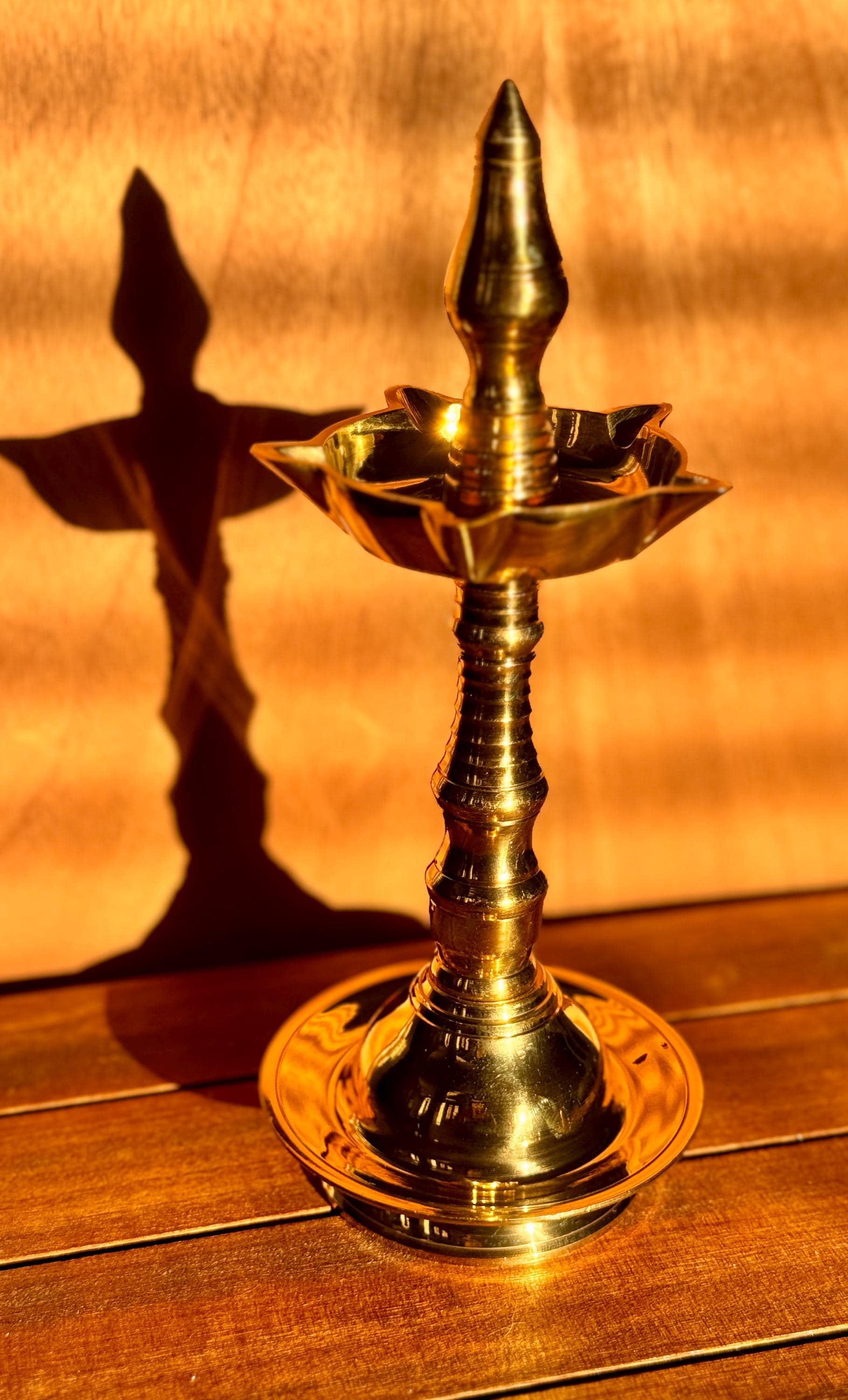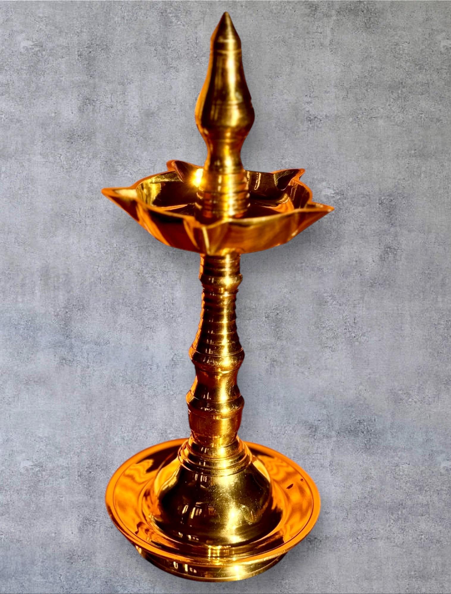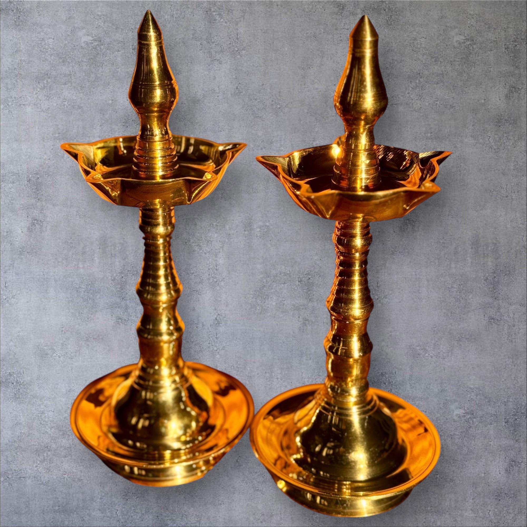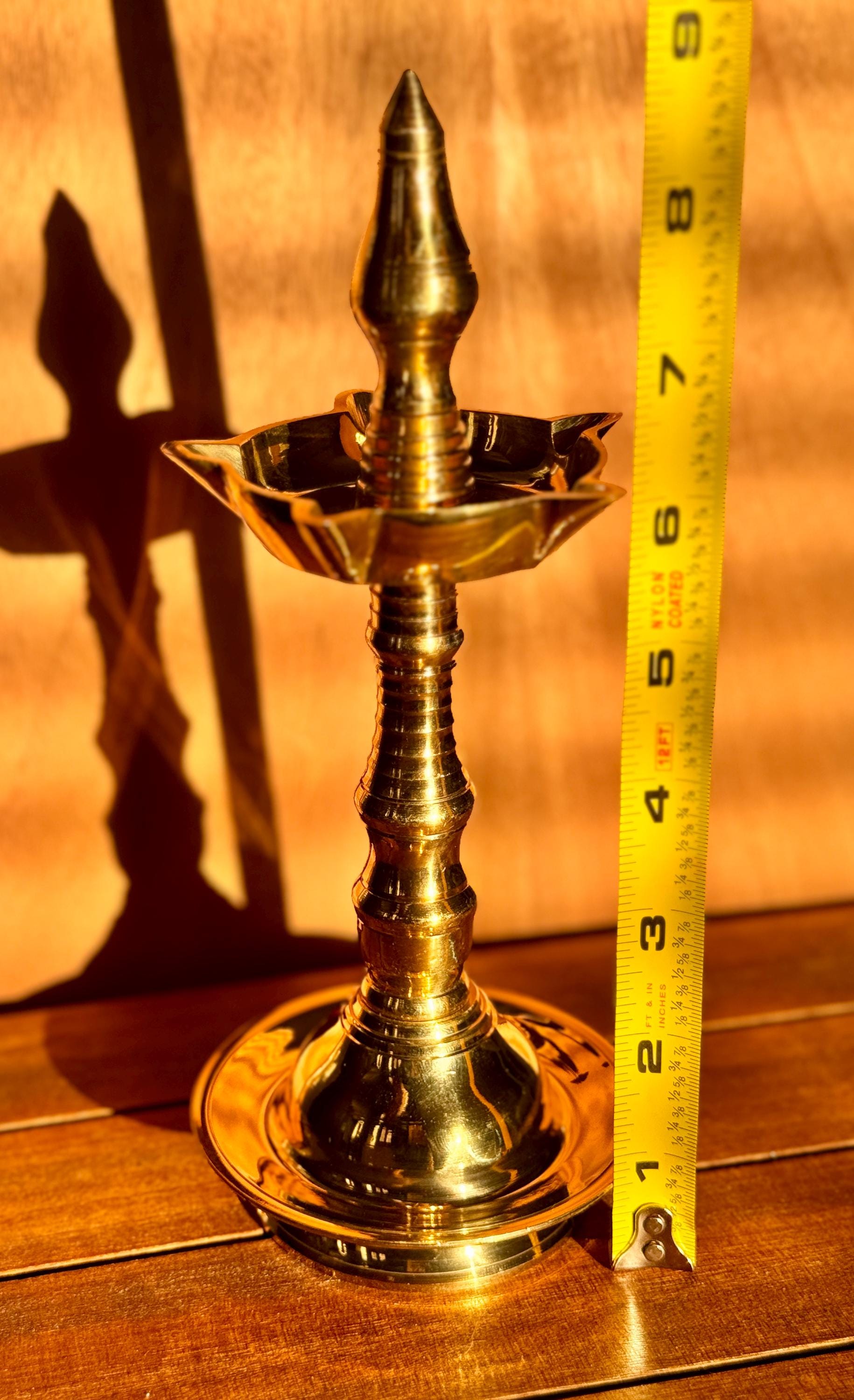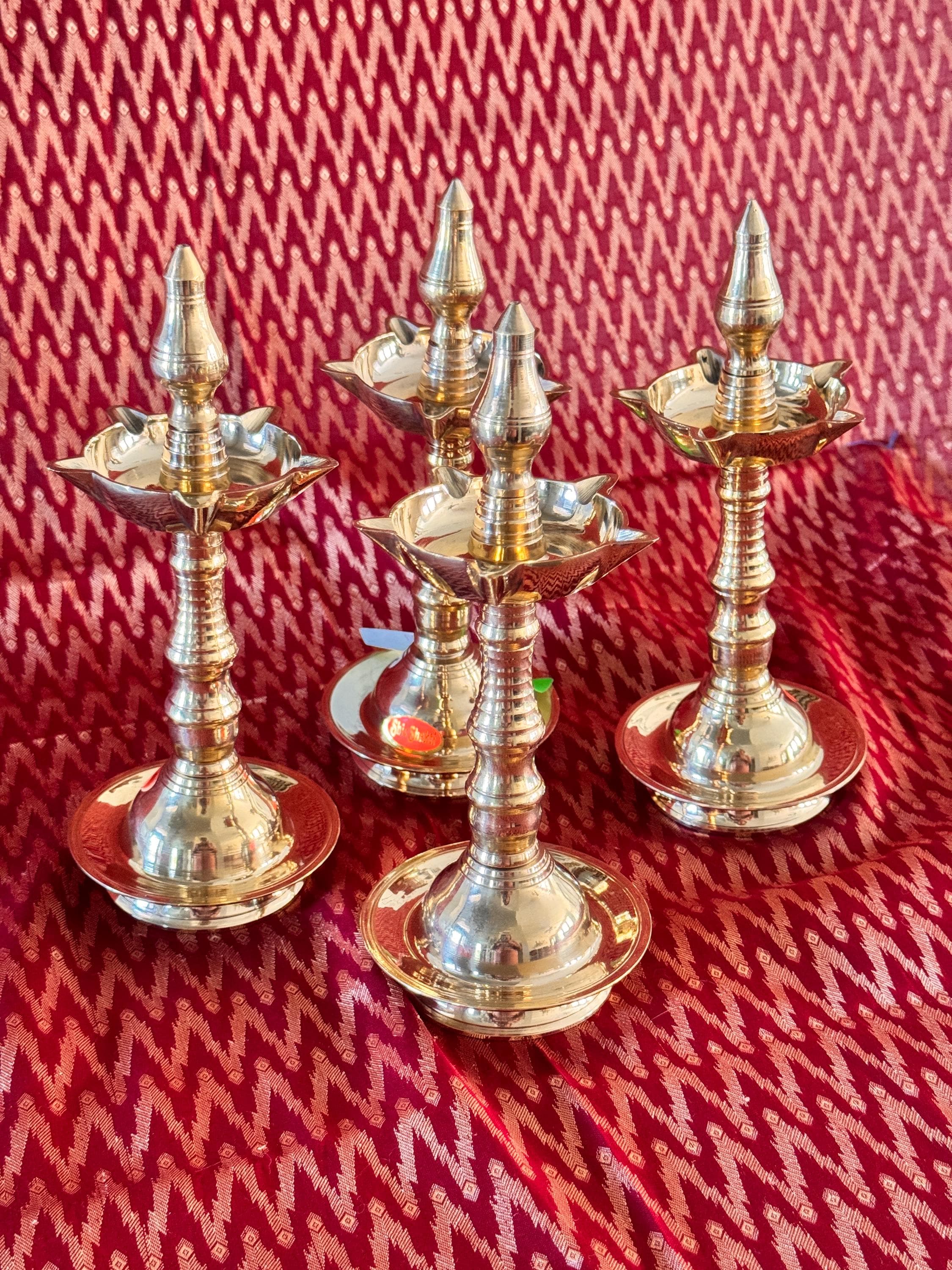 Product description: Authentic Kerala 5 wick lamp/vilakku. Original, heavy weight, high quality brass lamps. Listing is for one lamp/vilakku. Made from premium quality brass material for long time use Size: Height 9 Inches