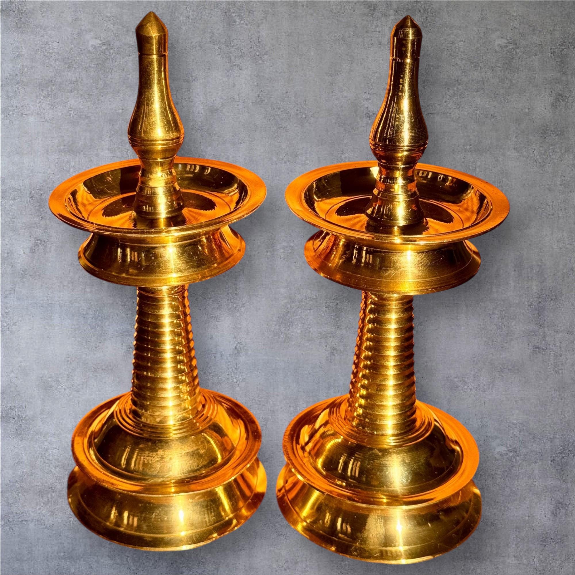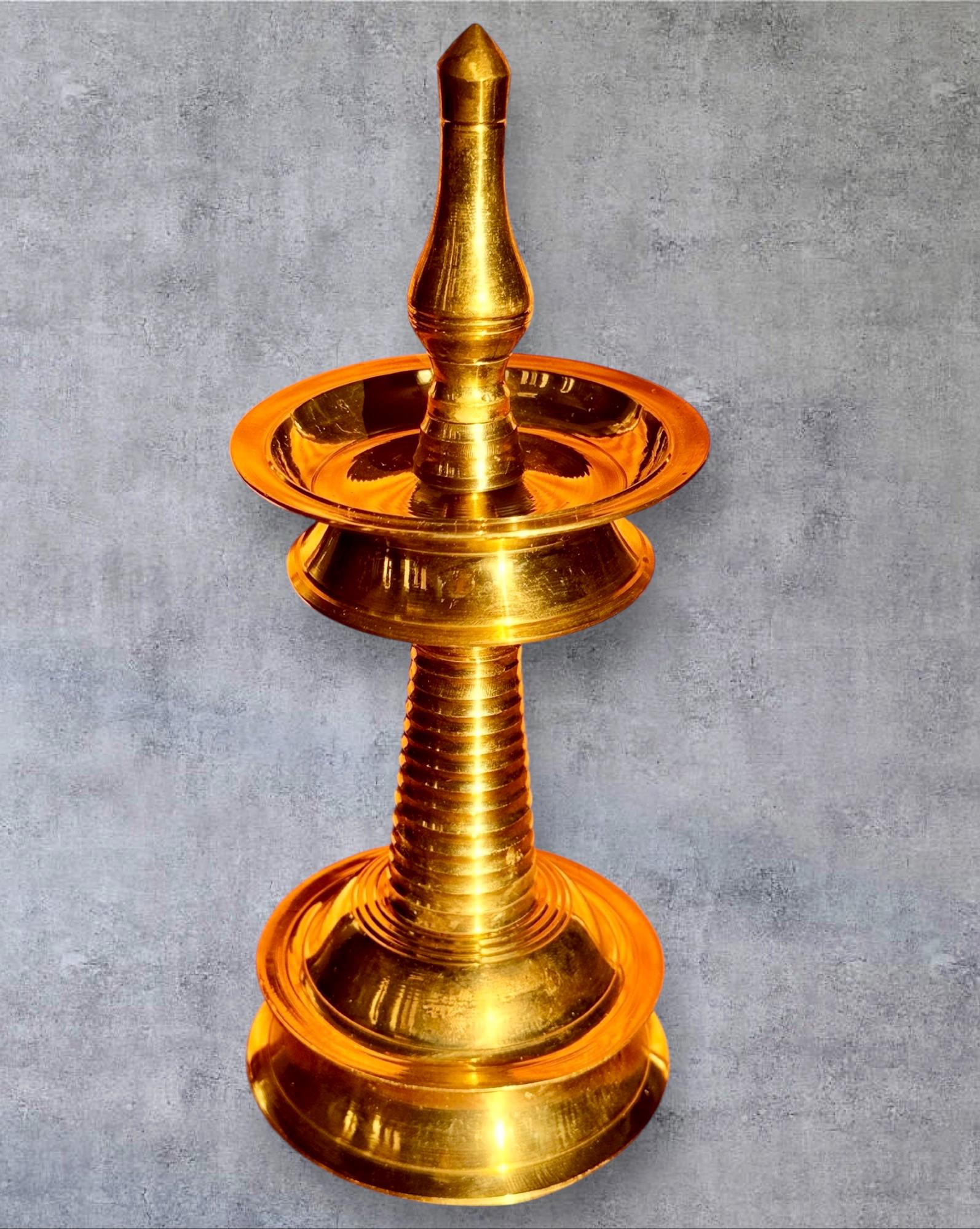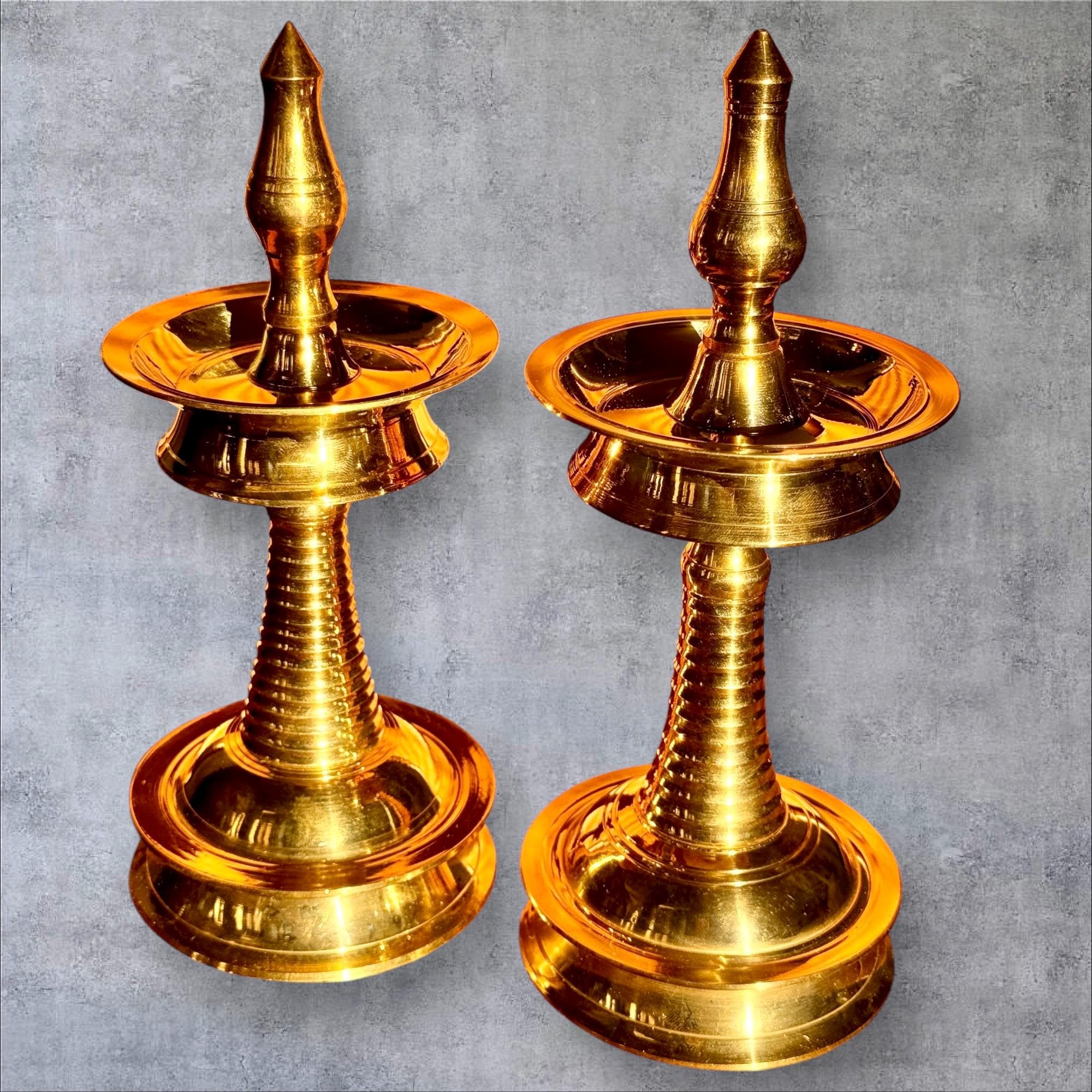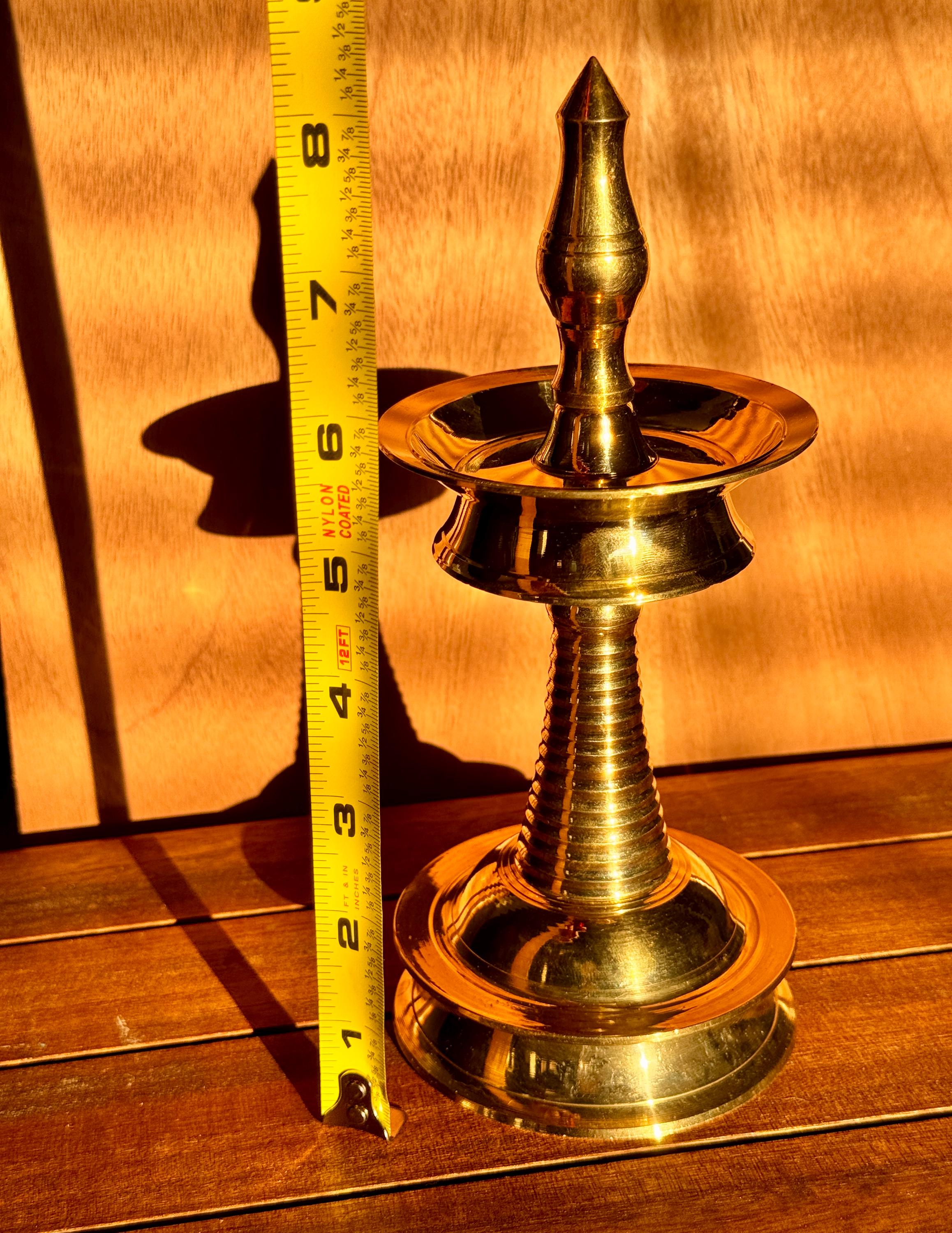 Product description: Authentic Kerala brass lamp/vilakku. Original, heavy weight, high quality brass lamps. Listing is for one lamp/vilakku. Made from premium quality brass material for long time use Size: Height 8 Inches