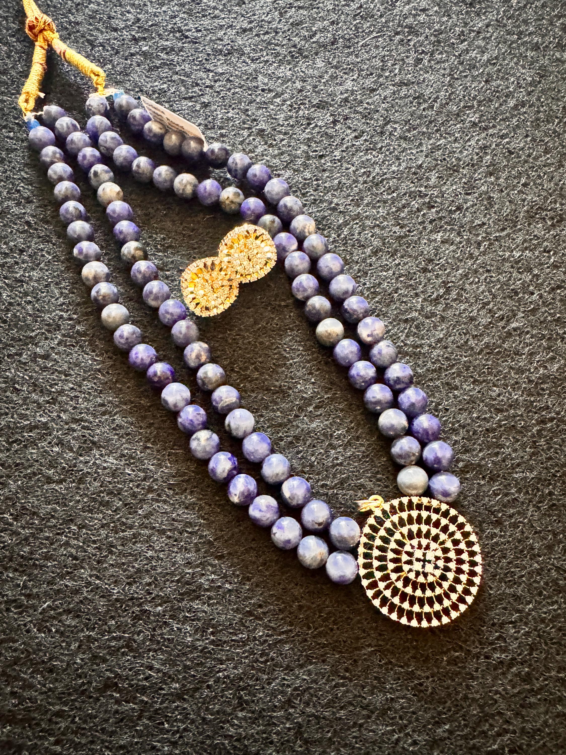Authentic "Sodalite" stones used in this beautiful jewelry collection. Comes with a pair of earrings and pendant that brings a beautiful festive look to your collection. A traditional yet unique design that comes with a worry free "certificate of authenticity" for the gemstones/ semi-precious stones. Color of the stones are in hues of blue/white making it easy to pair with any traditional/classic modern outfit. One of a kind model so each piece will be unique and a must have if you are a lover of semi-precious gemstones.