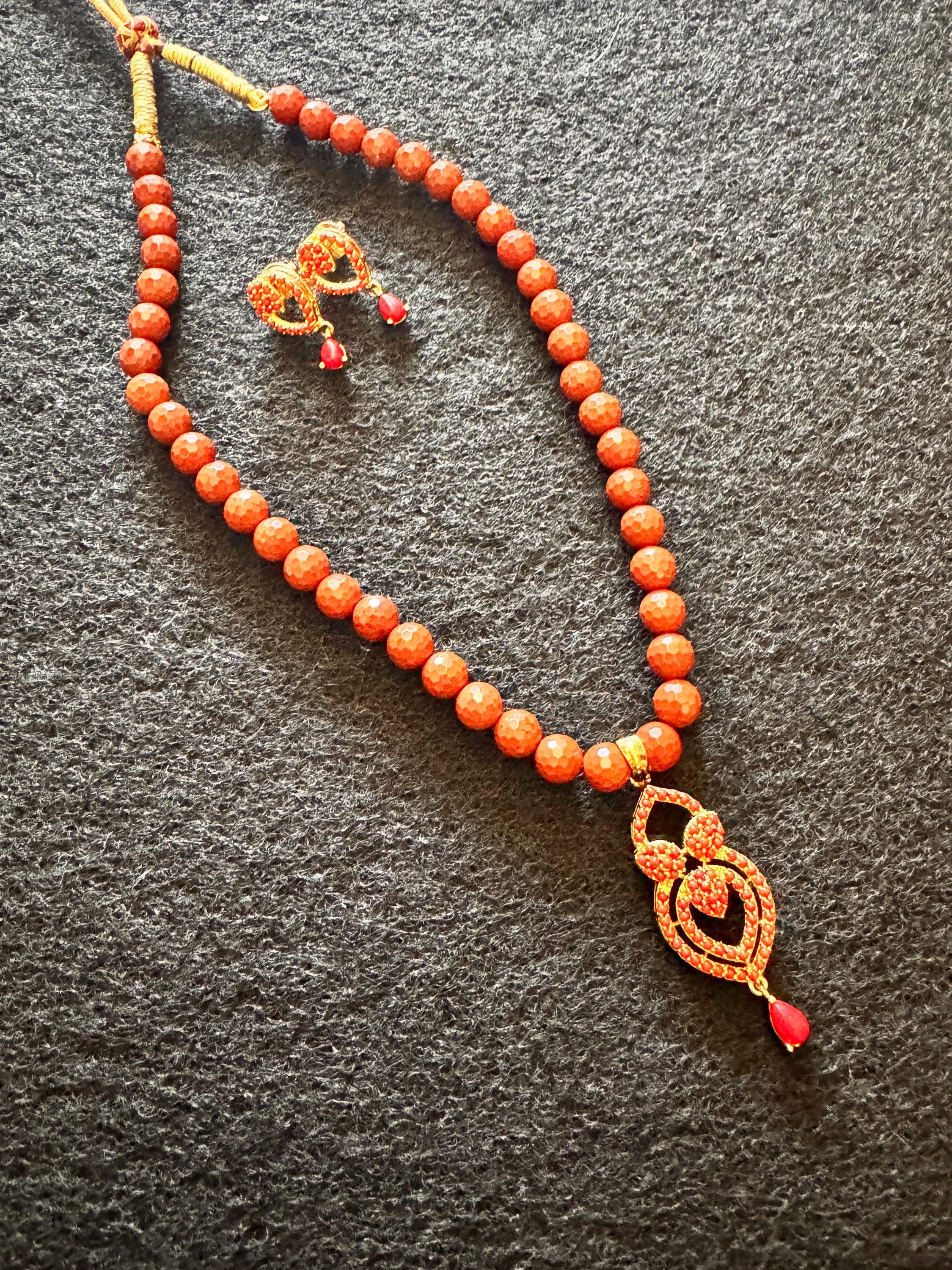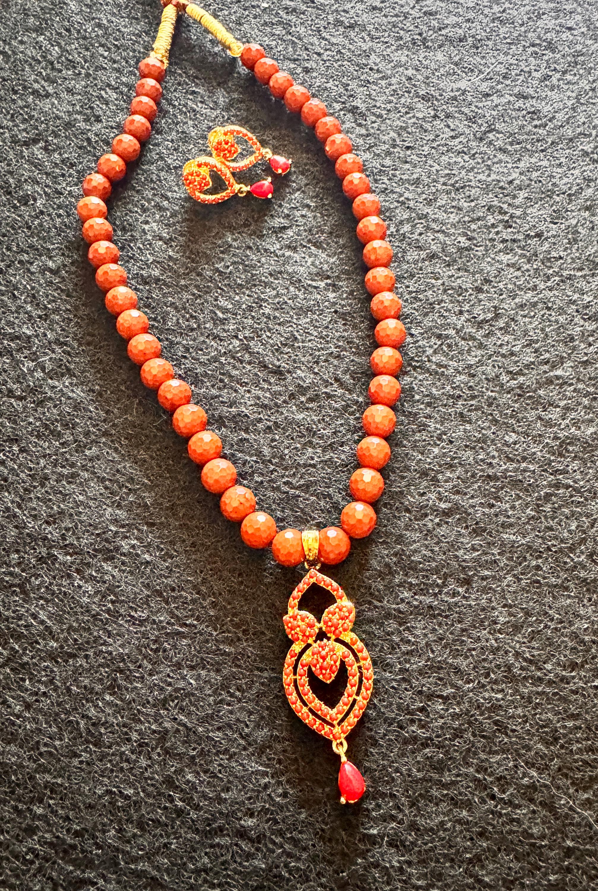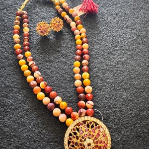 Authentic "Red Jasper" 8 mm stones used in this beautiful jewelry collection. Comes with a pair of earrings and pendant that brings a beautiful festive look to your collection. A traditional yet unique design that comes with a worry free "certificate of authenticity" for the gemstones/ semi-precious stones. Color of the stones are in hues of red/reddish brown making it easy to pair with any traditional/classic modern outfit. One of a kind model so each piece will be unique and a must have if you are a lover of semi-precious gemstones.