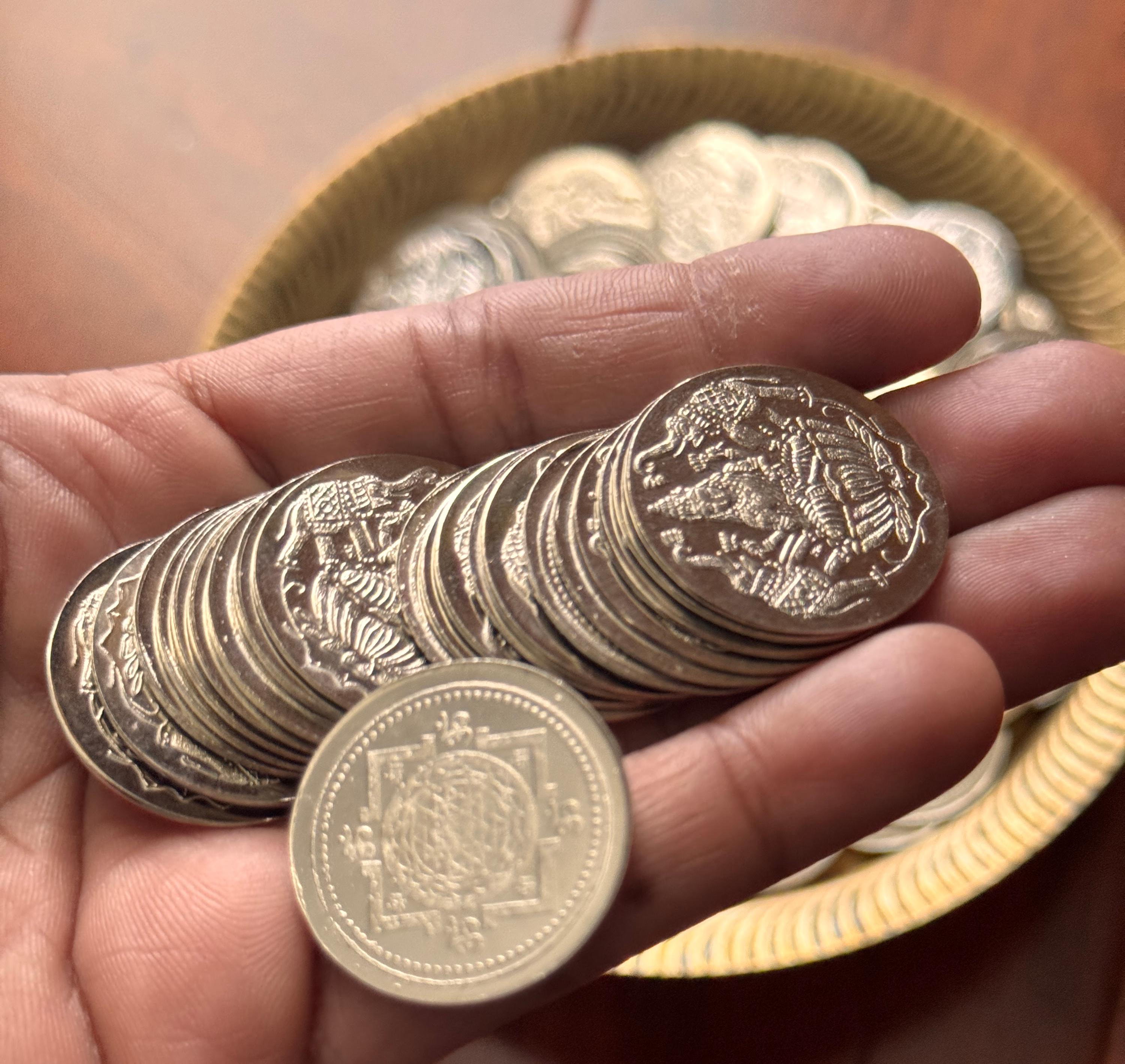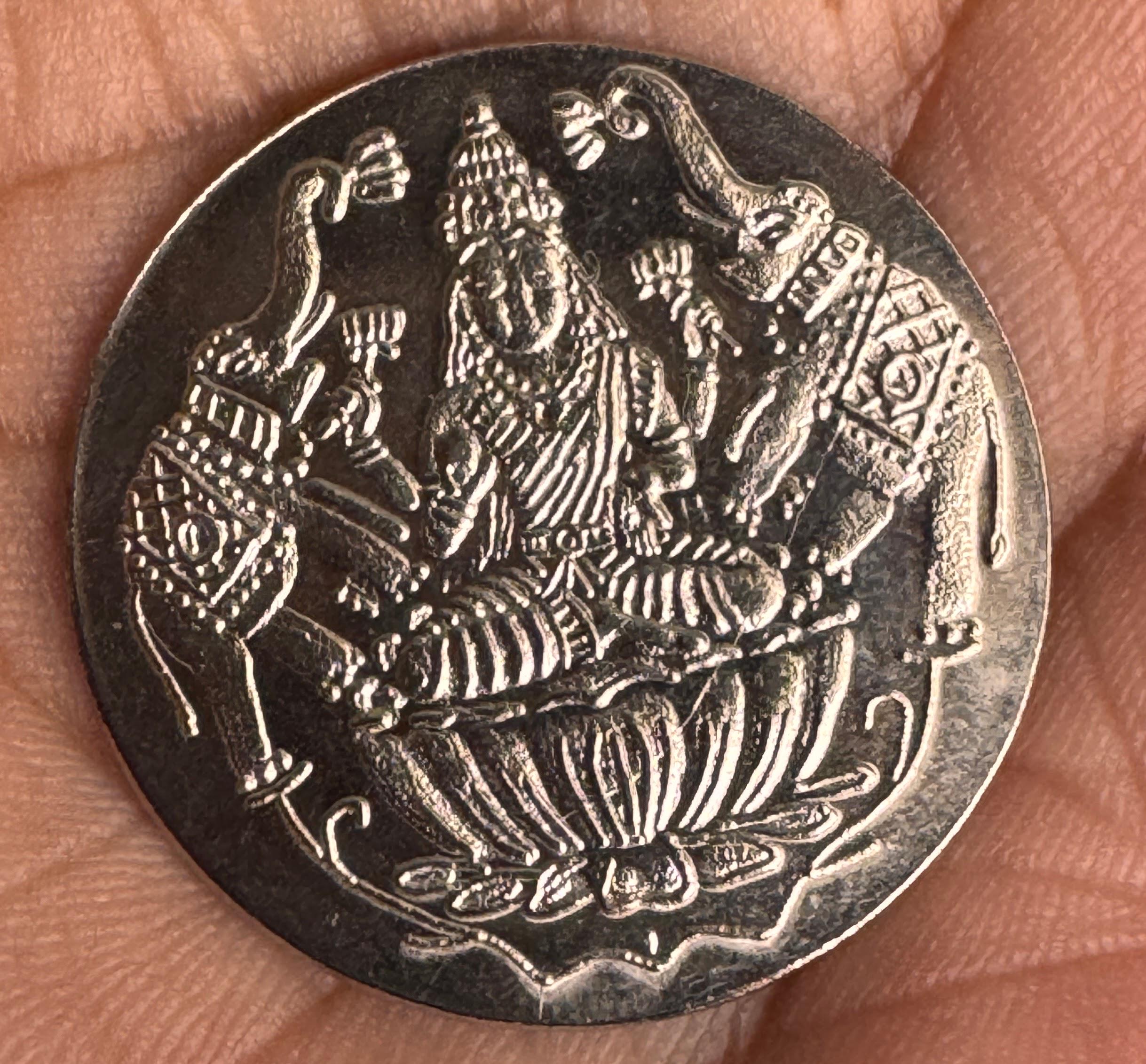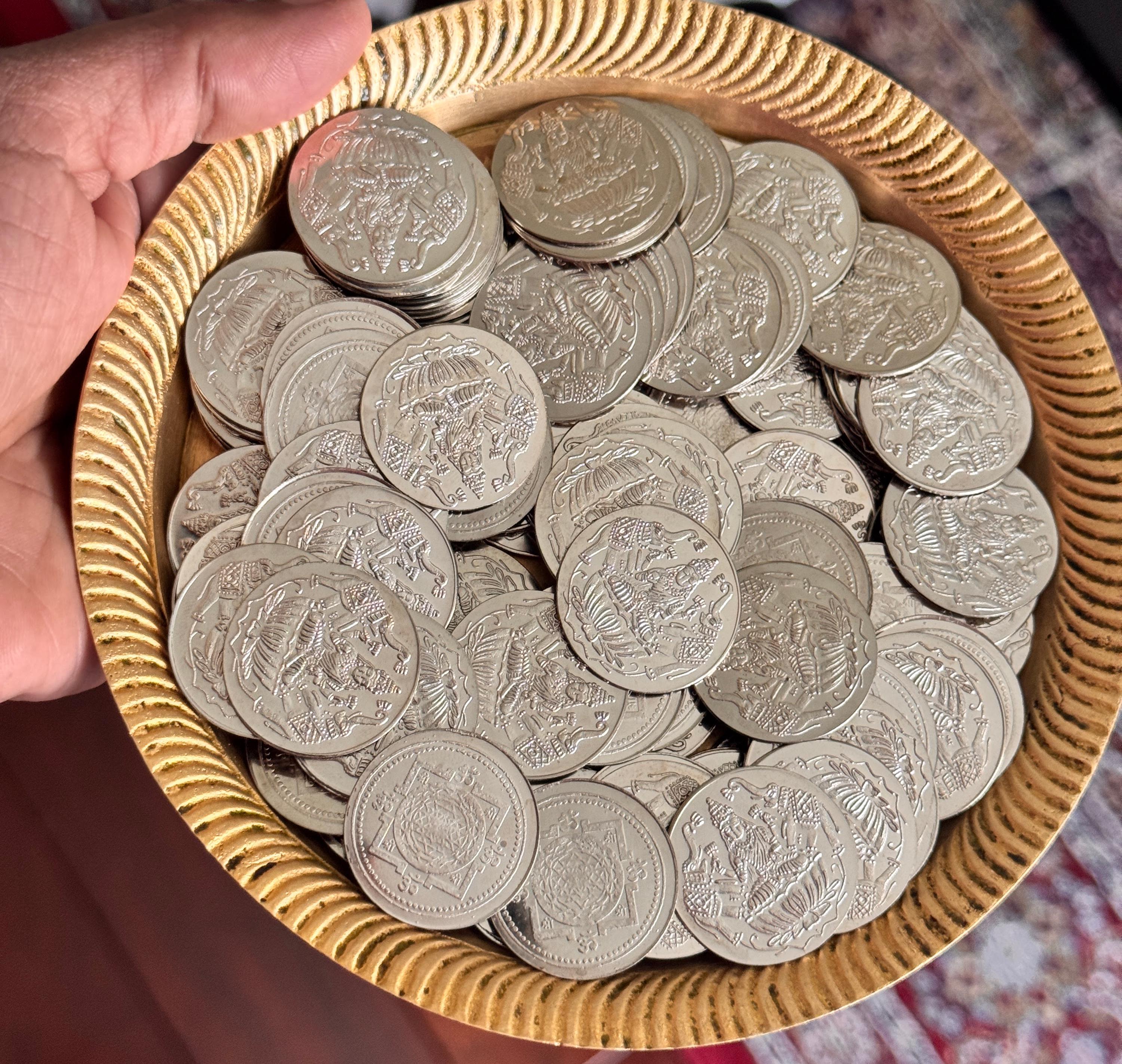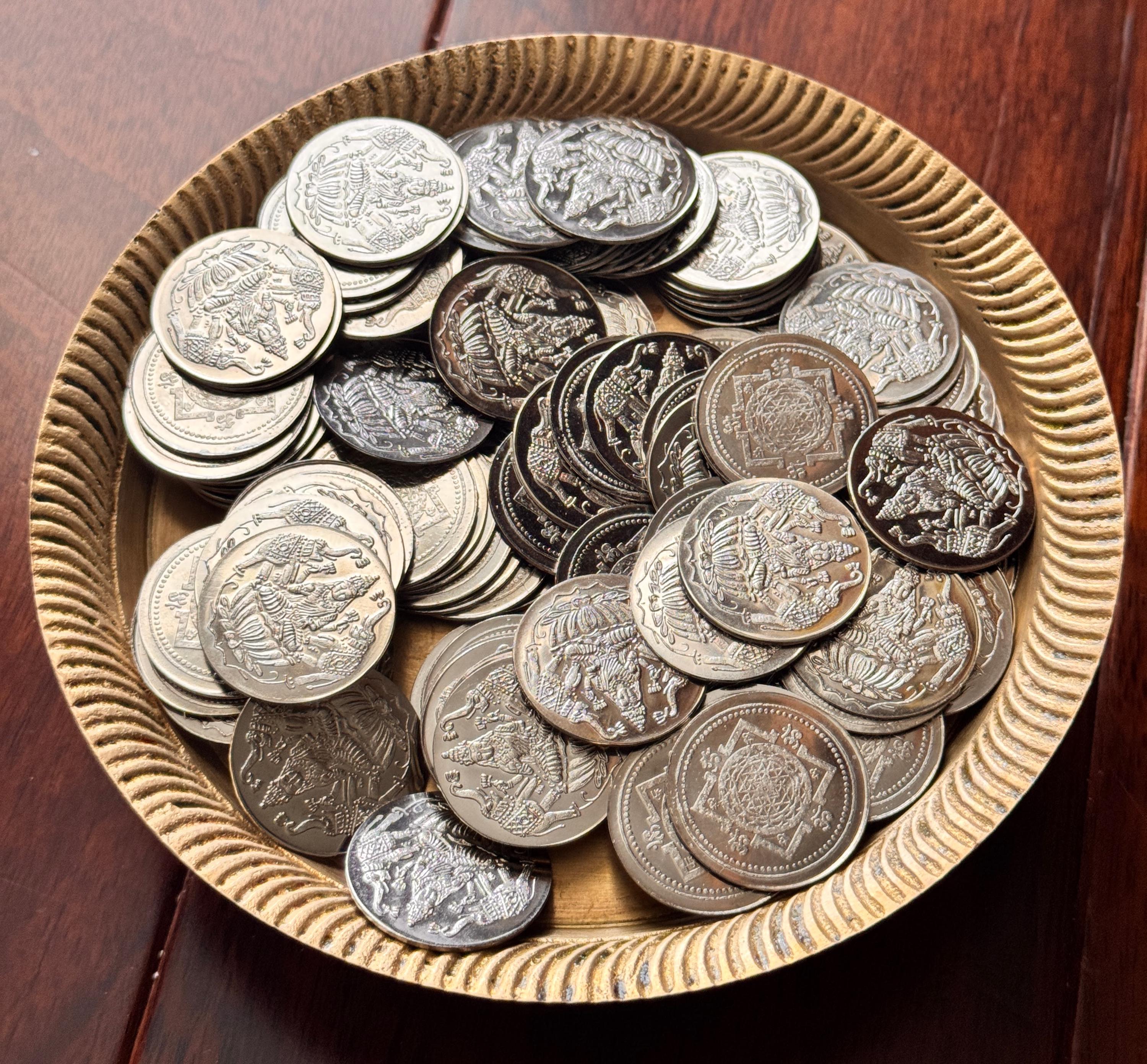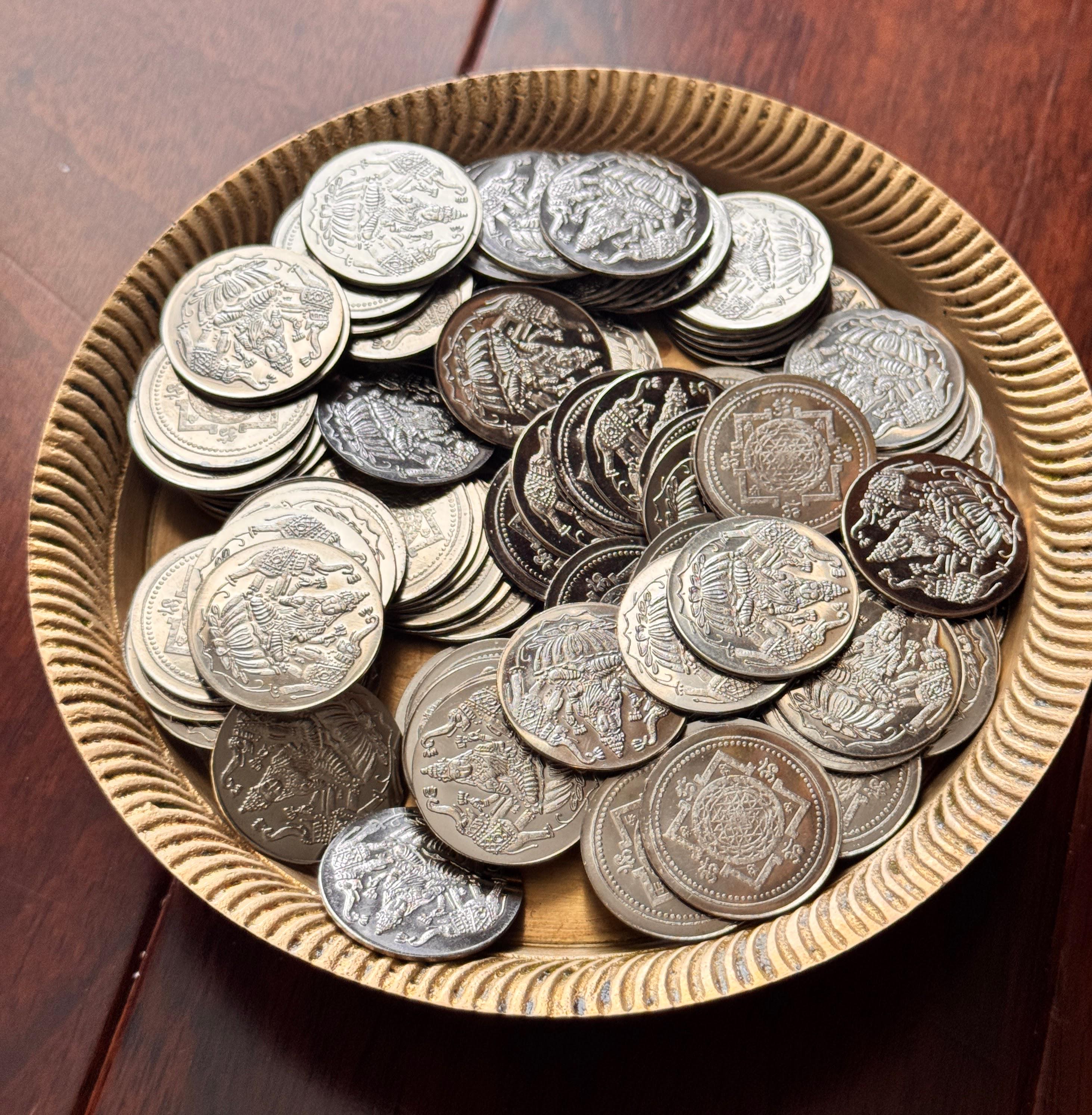 Vibrant German silver coins - 108 numbers for Ashtalakshmi puja. Auspicious for home and brings prosperity. Use in prayer room or for gifting for your loved ones.
