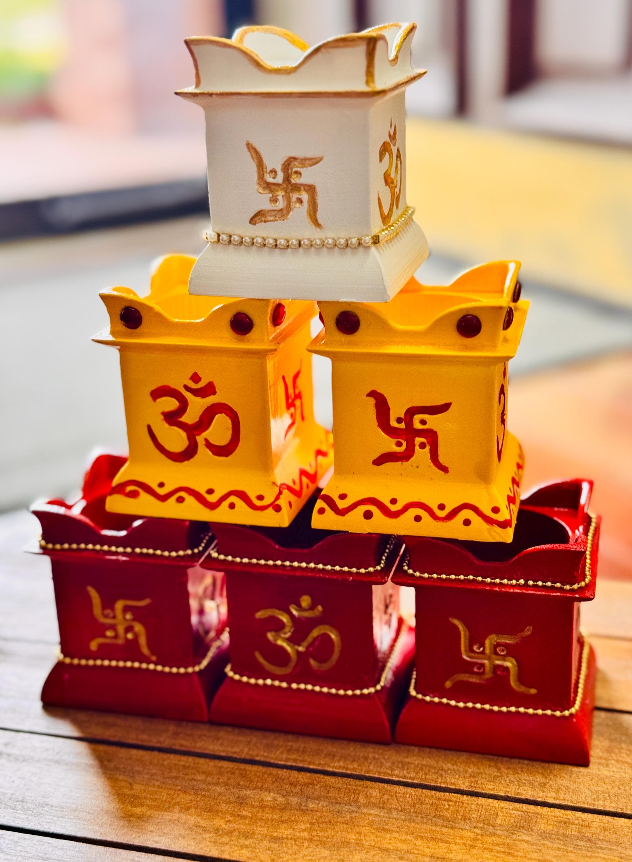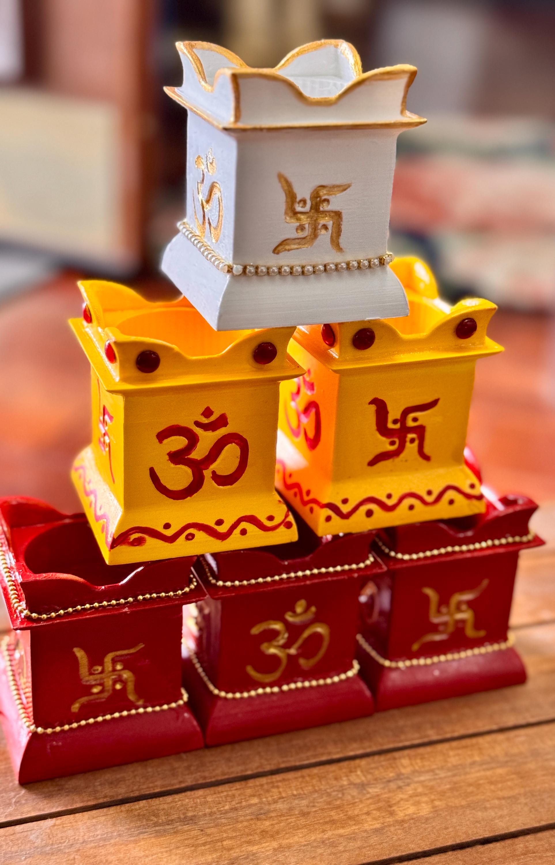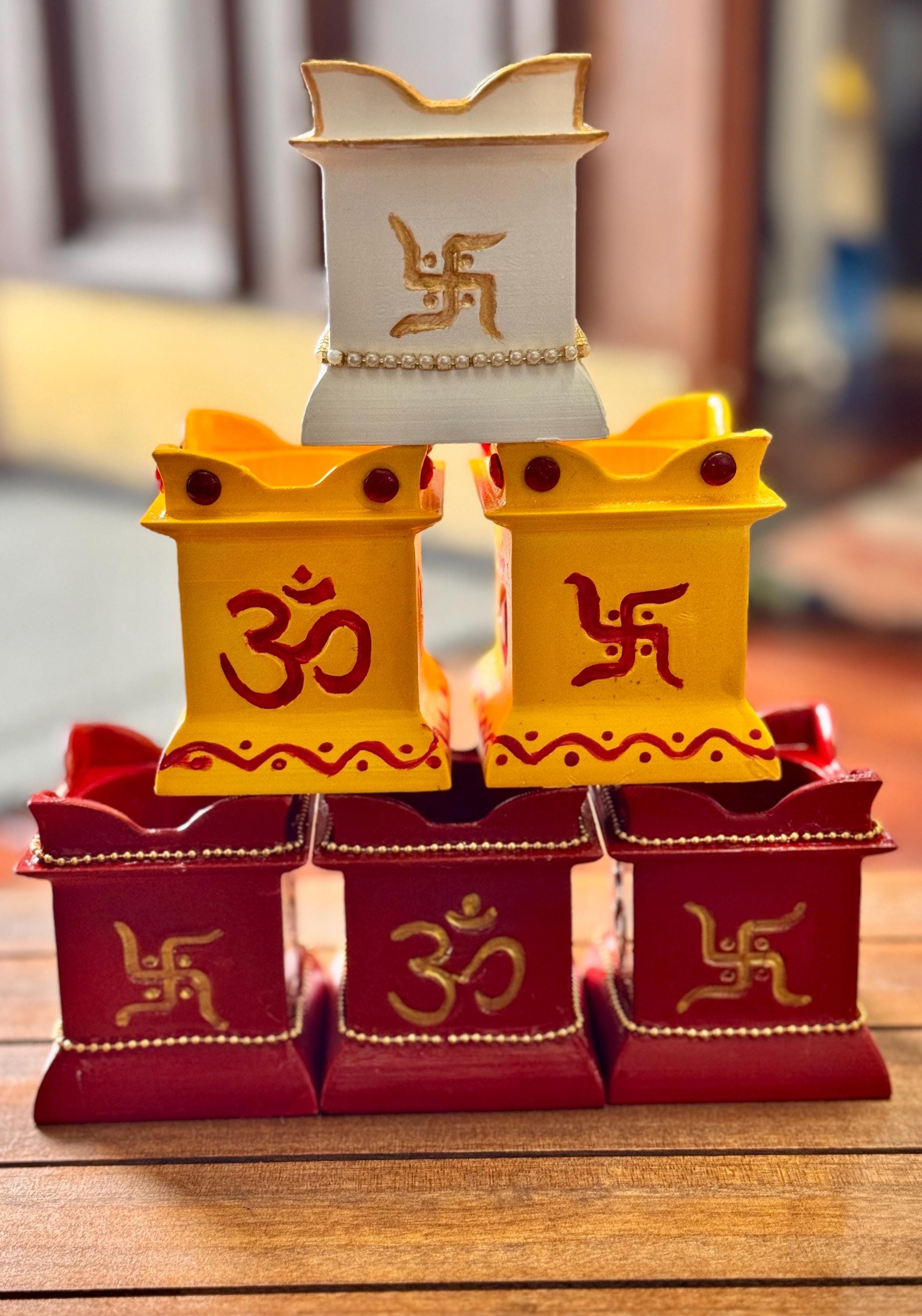 Hand painted, embellished with Tanjore stones (Yellow tulsi kota only) and filigree work. Sealed with varnish for long lasting effect. All painting / rangoli and finish is handmade with love. Above listing is for one Tulasi tea light holder. Material: Plastic. One complimentary battery-operated tea light will be provided with each purchase.