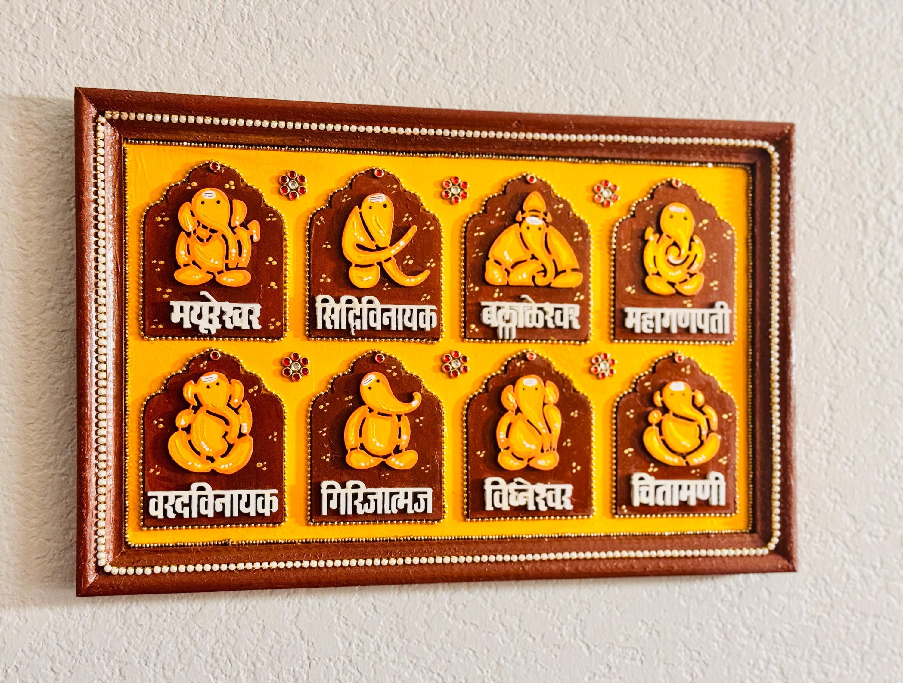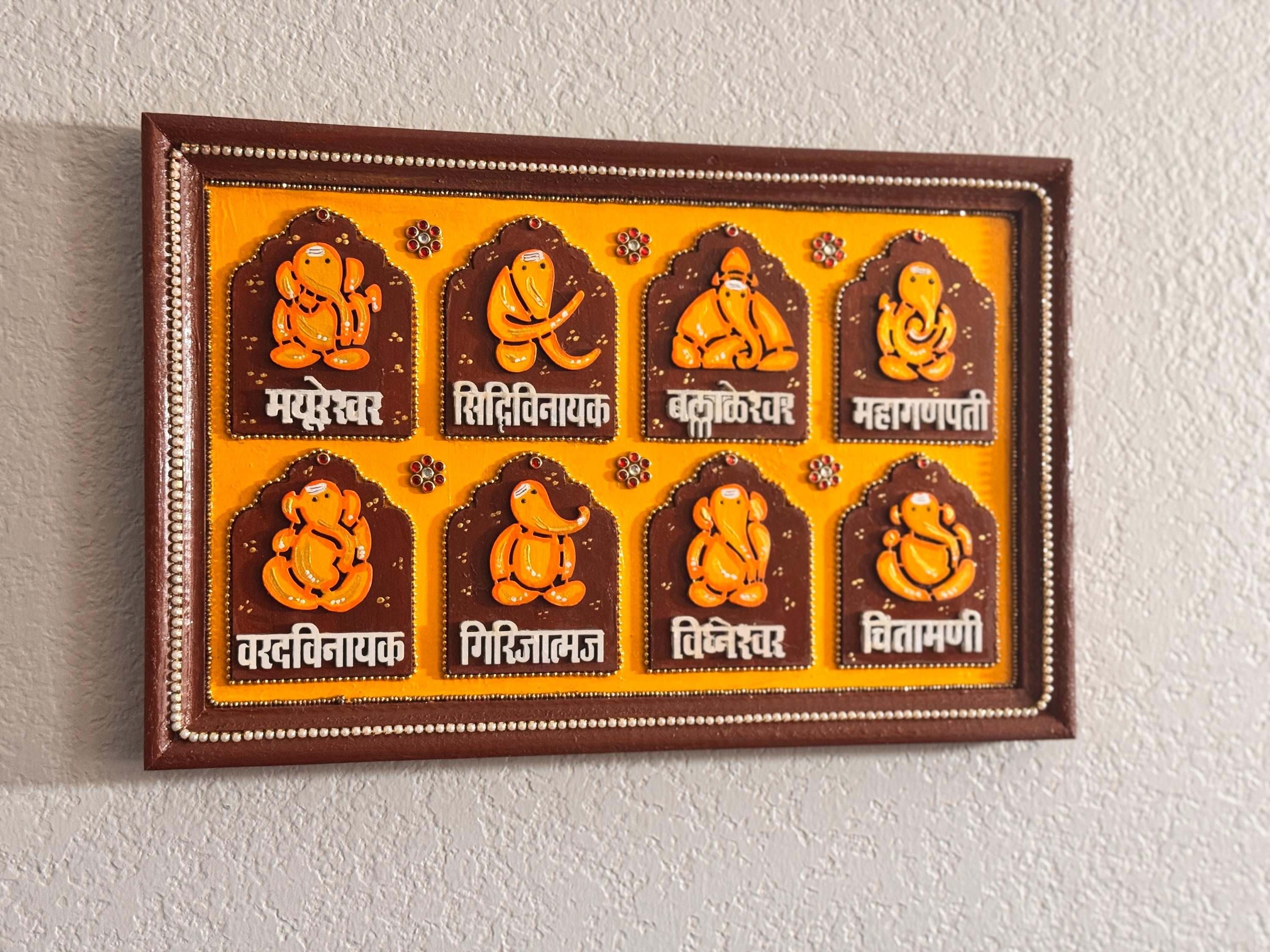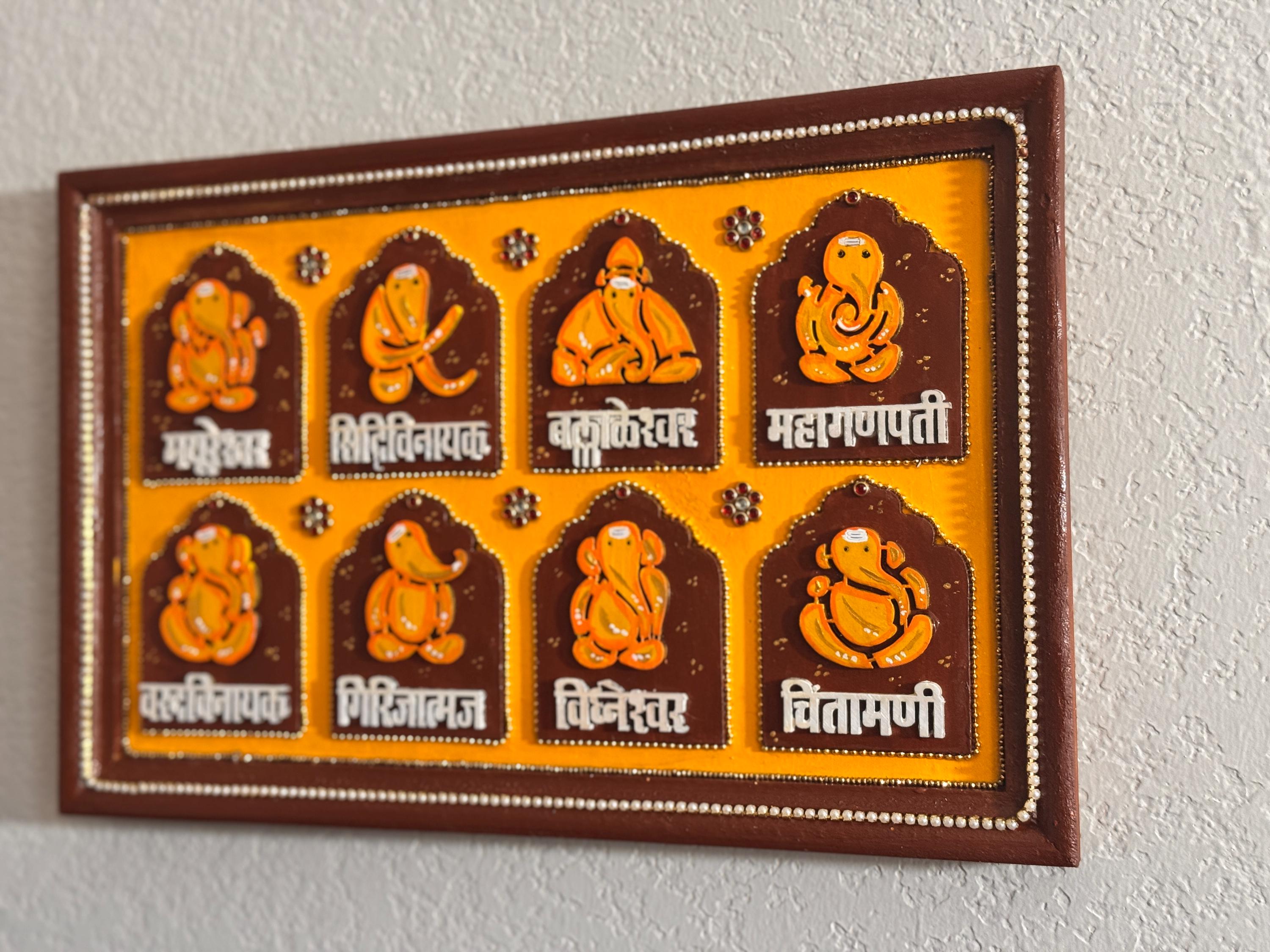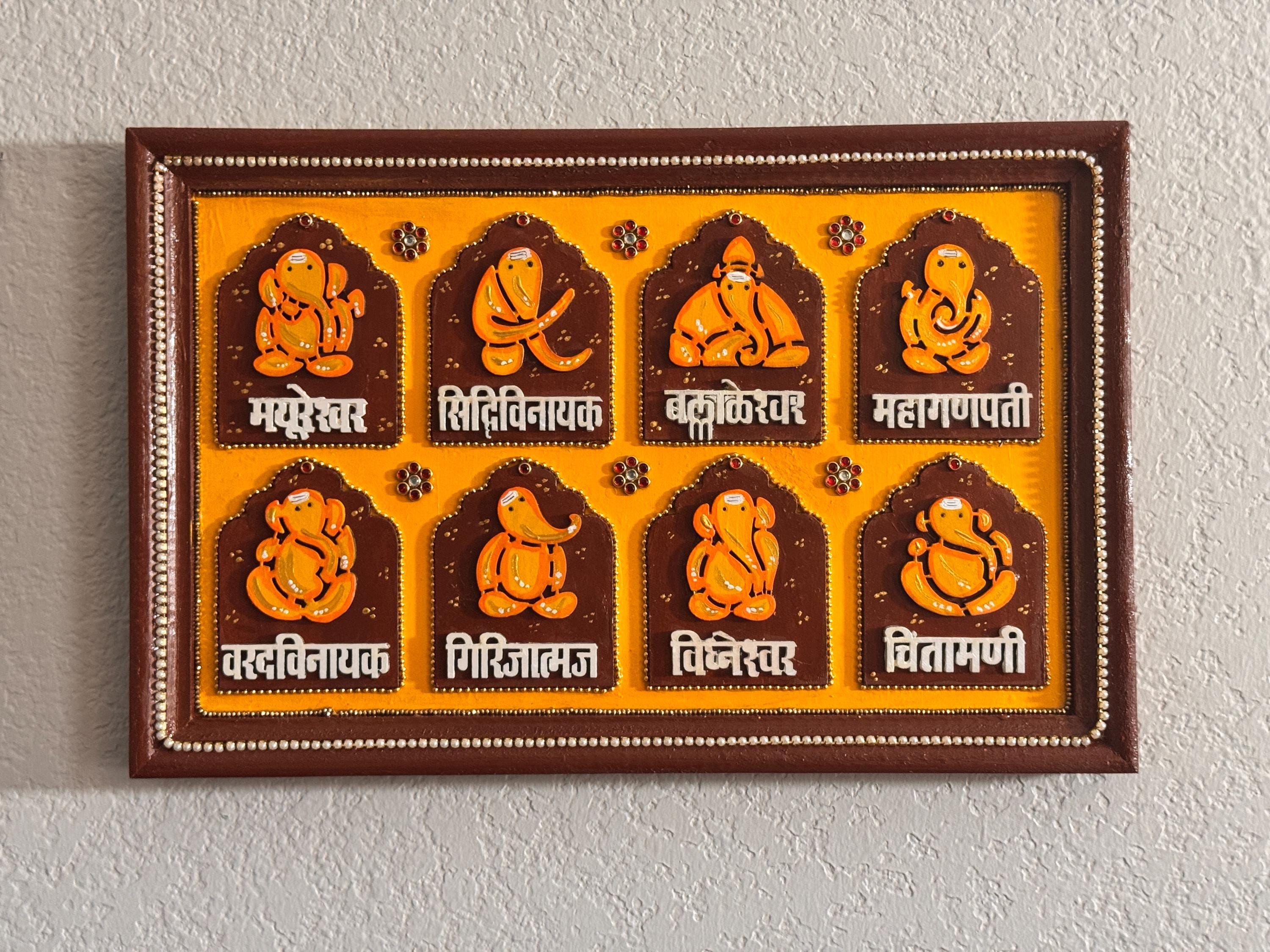 A wooden frame containing eight forms- depicting the eight Ashtavinayak (Ganapati)deities.