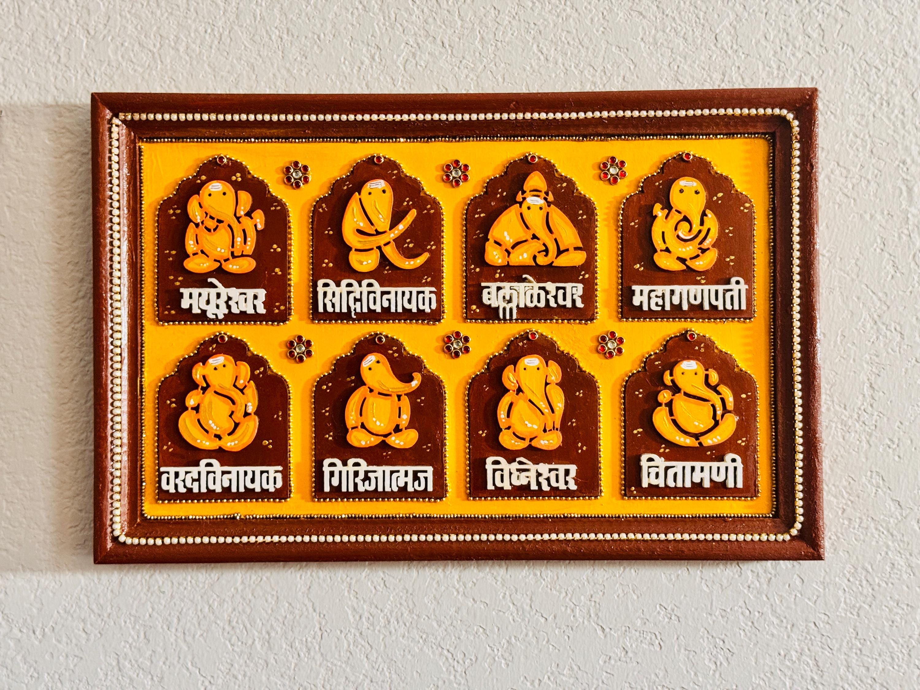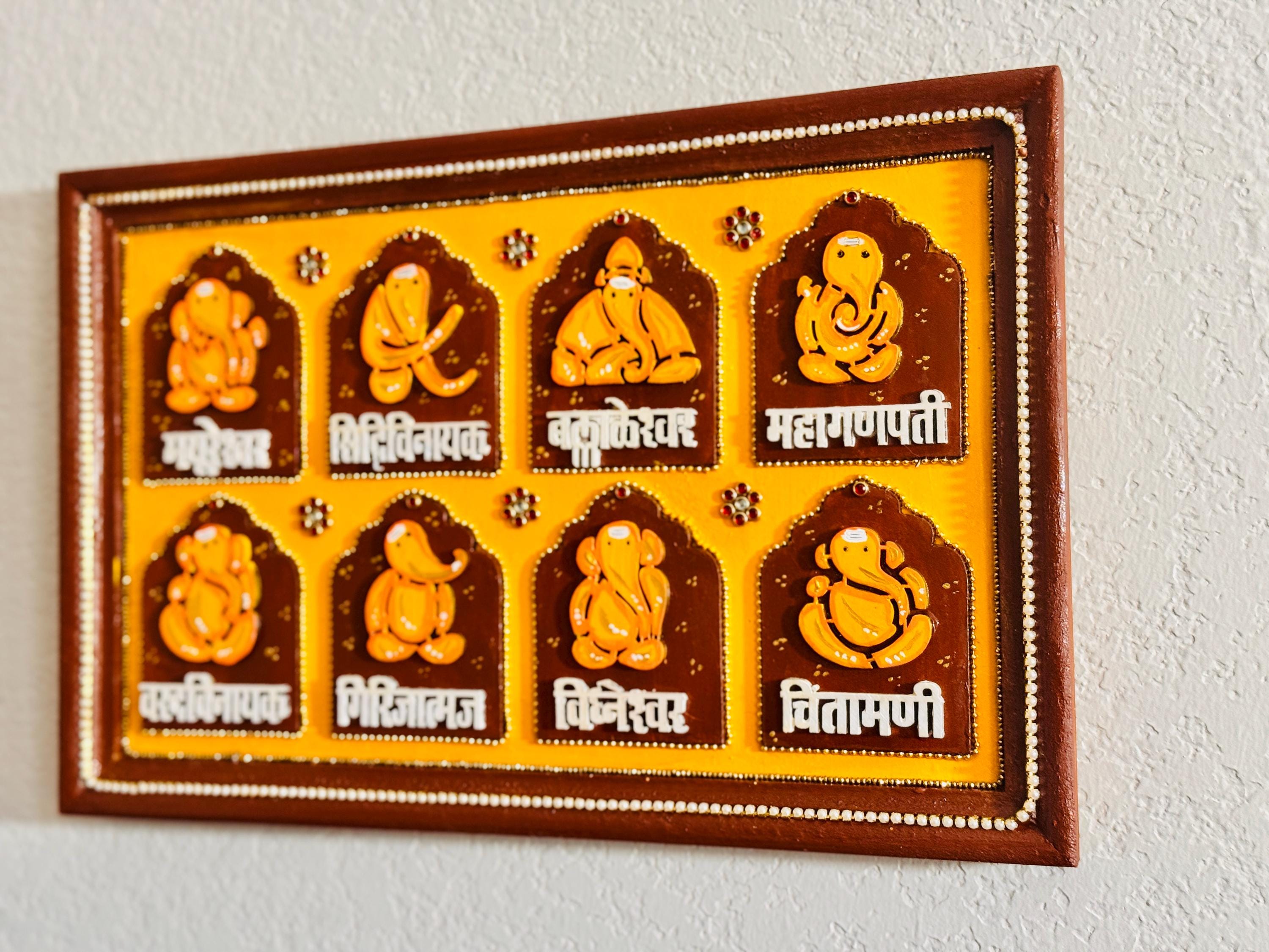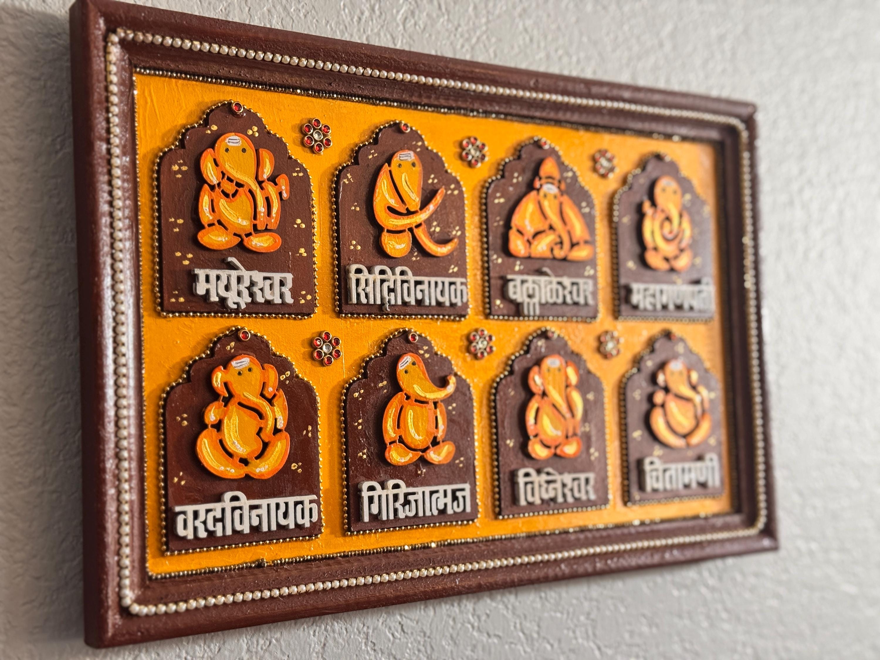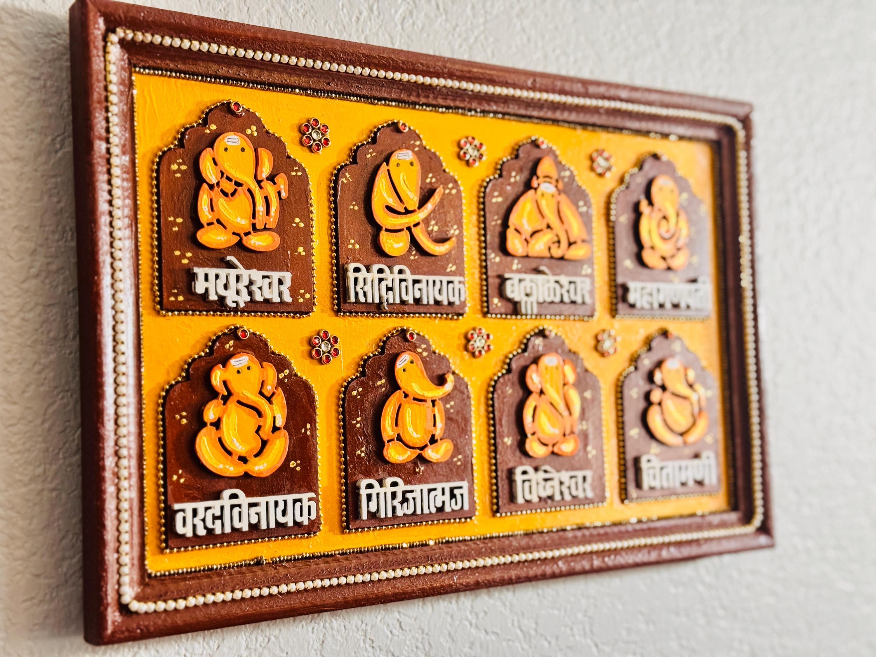 A wooden frame containing eight forms- depicting the eight Ashtavinayak (Ganapati)deities.