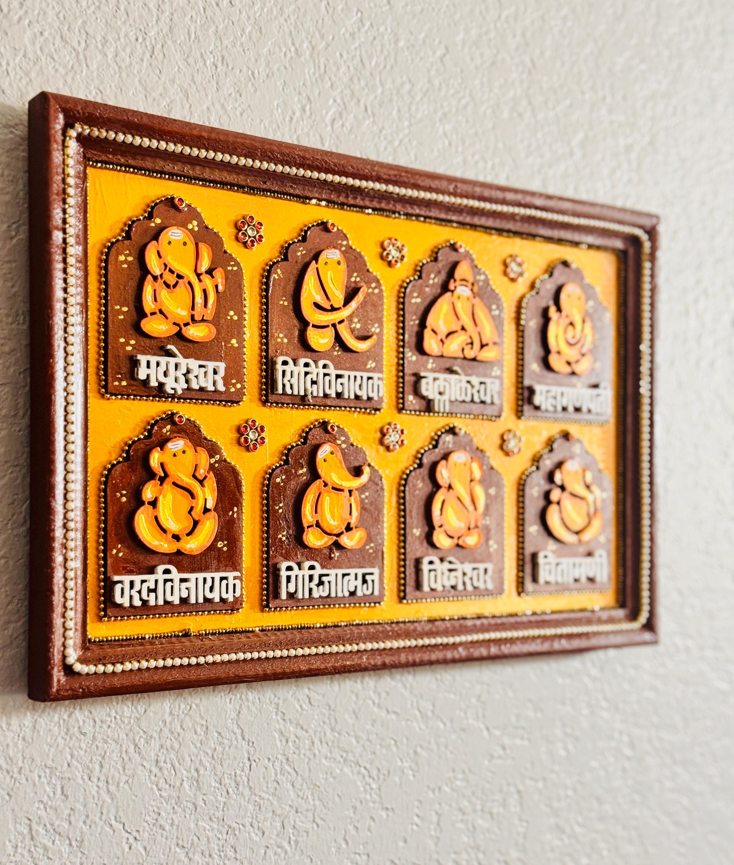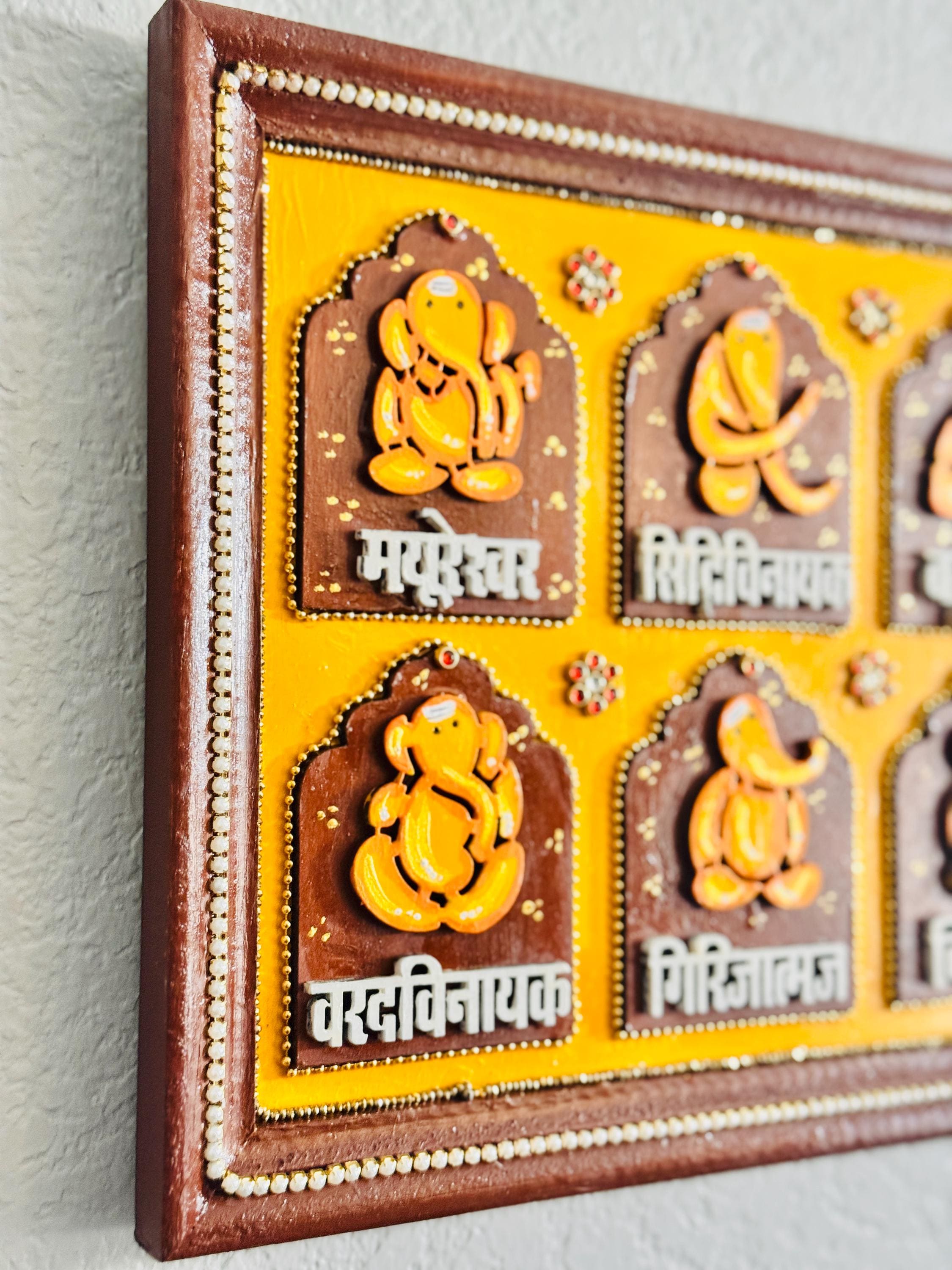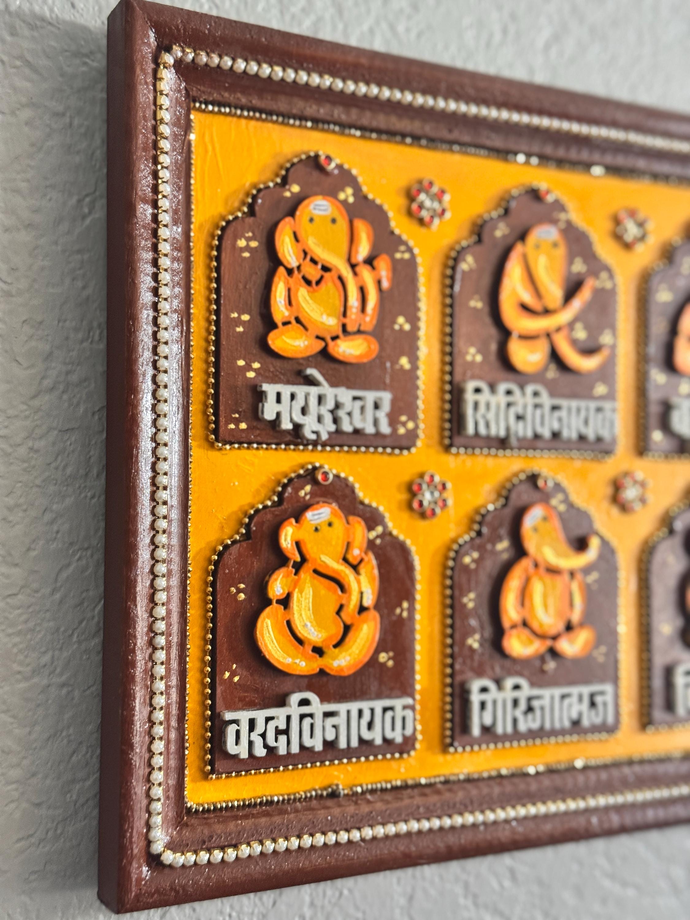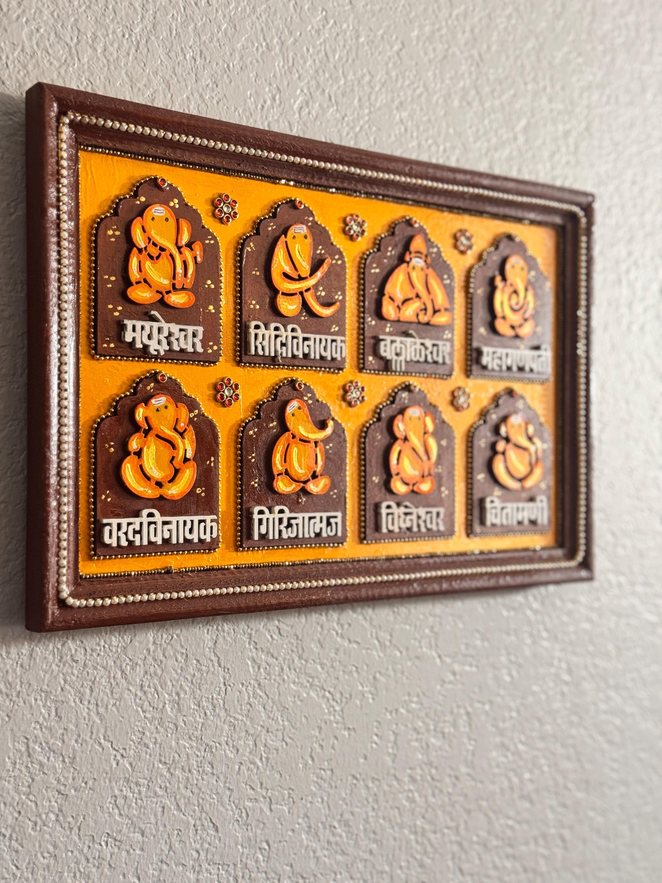 A wooden frame containing eight forms- depicting the eight Ashtavinayak (Ganapati)deities.