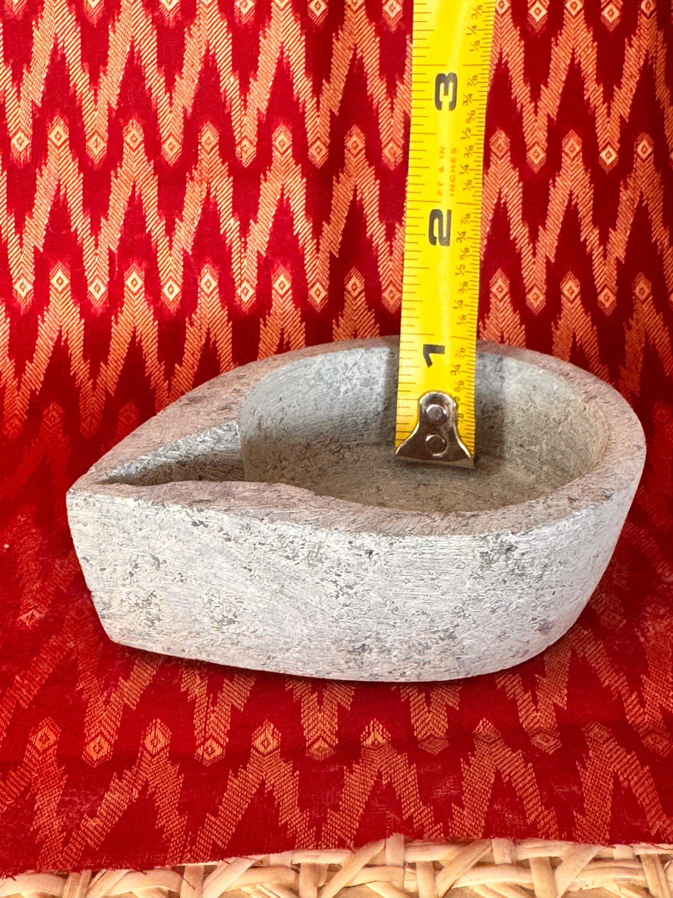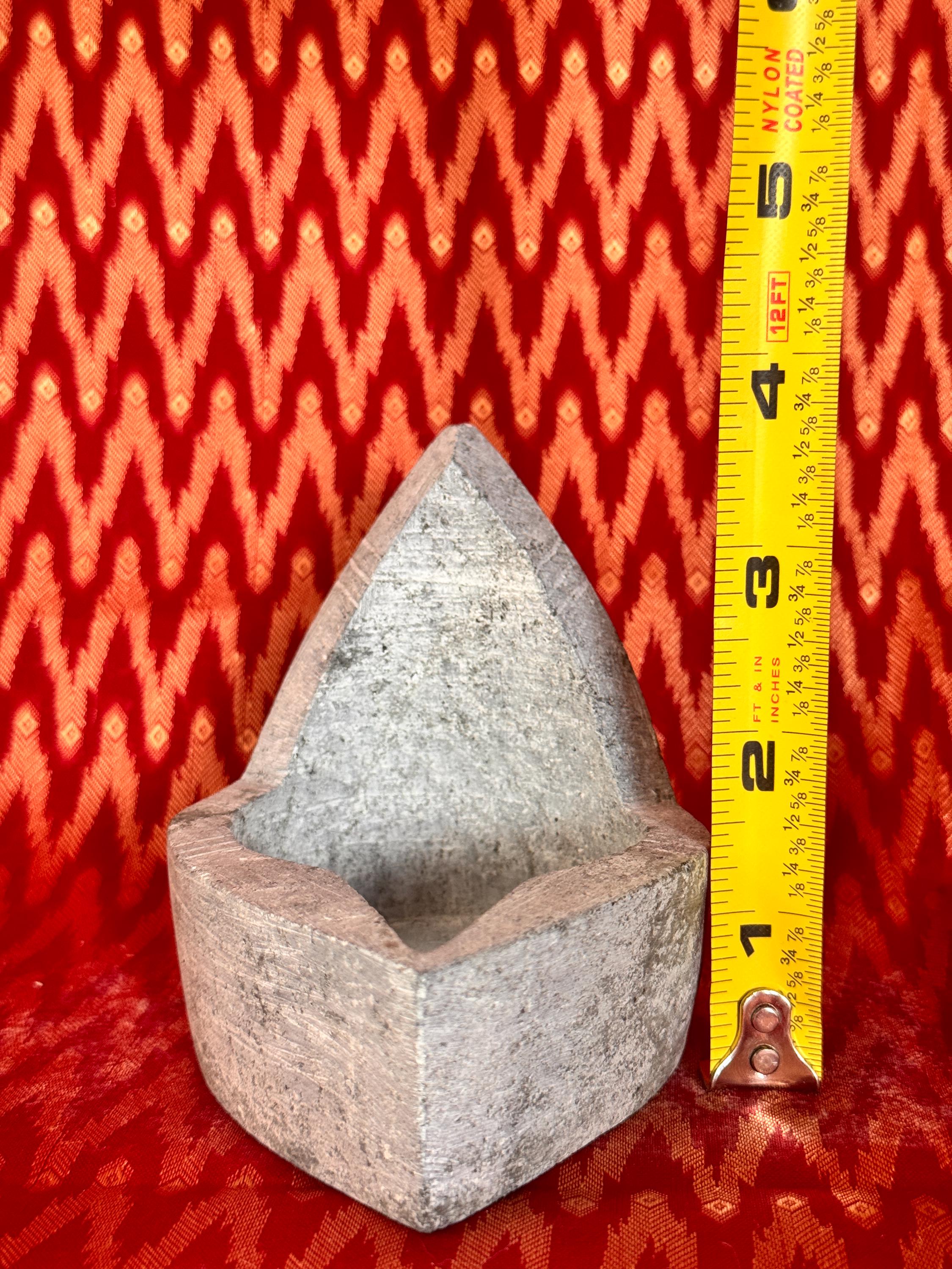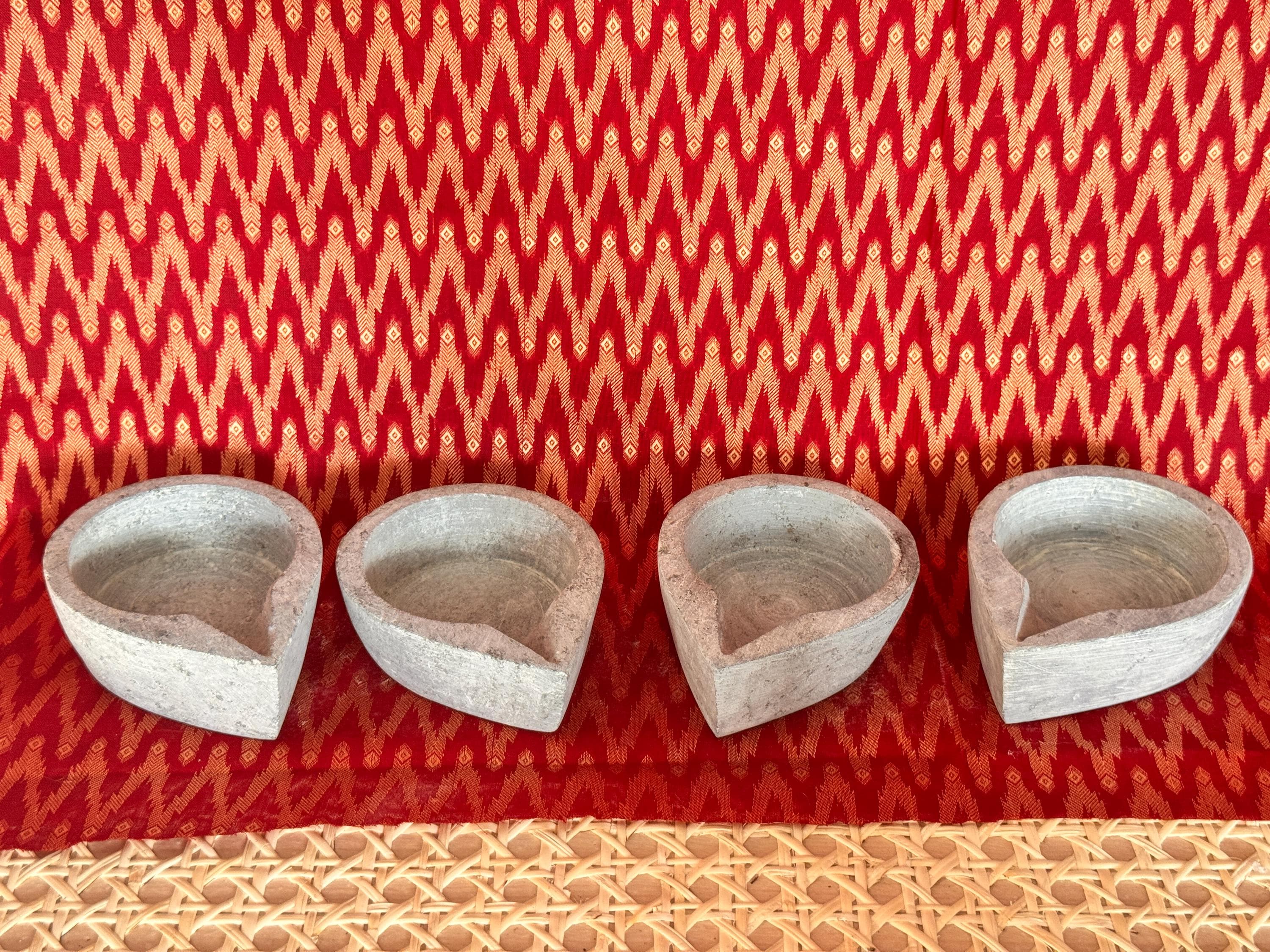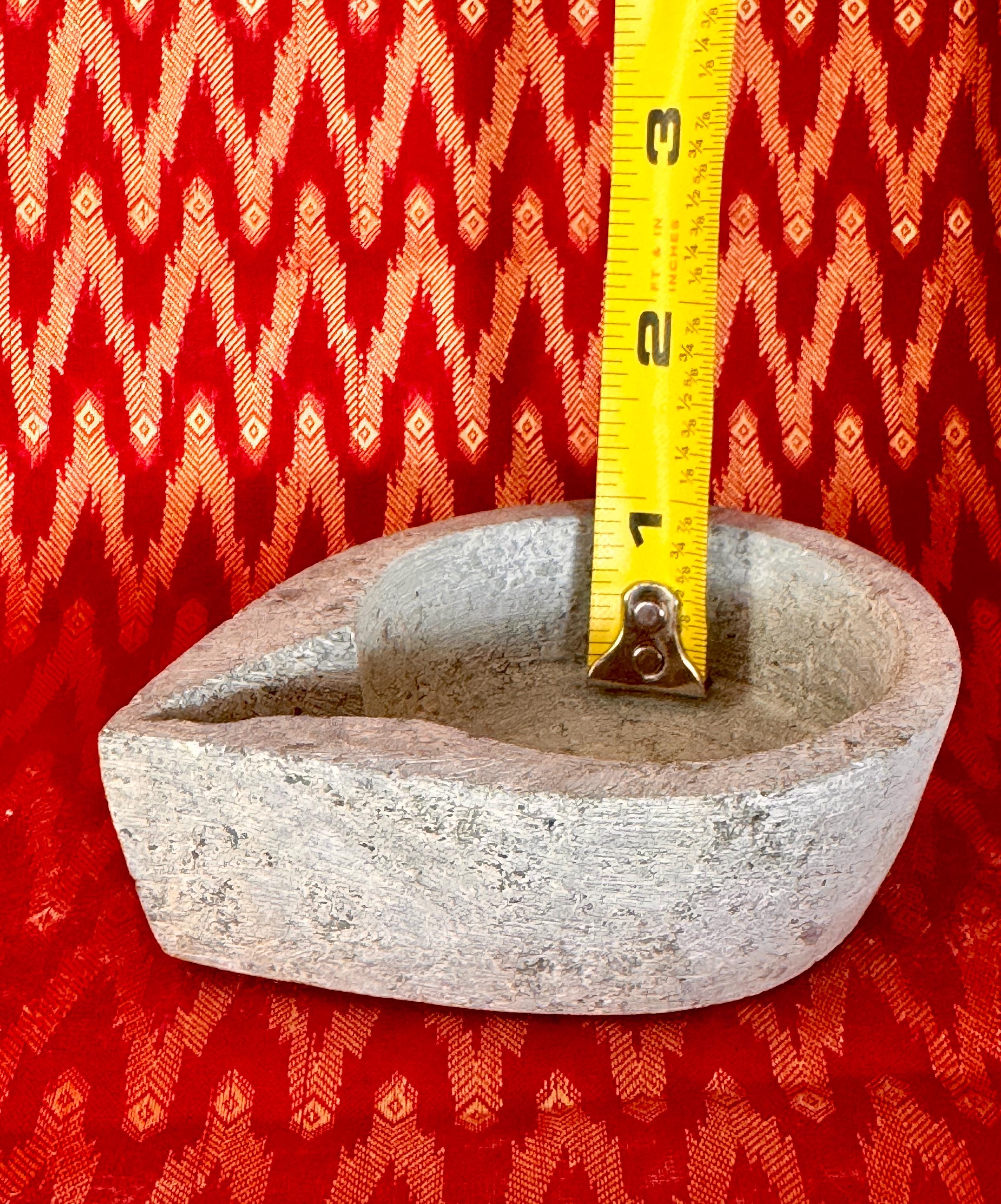 Minimalist and contemporary design - natural soapstone lamps. Soapstone (locally known as maakkal or kalchatti) is a soft, heat-resistant stone. Soapstone’s ability to withstand high heat makes it ideal for oil lamps used in daily rituals at homes and long temple ceremonies. It is believed that lighting a lamp signifies the dispelling of darkness and ignorance. The flame represents jnana (wisdom) and the divine presence. Passed down generations, these lamps often carry ancestral blessings and are lit during auspicious occasions like weddings, housewarmings, and naming ceremonies. The use of natural stone and oil-based lighting aligns with eco-conscious, sustainable practices rooted in tradition. Contemporary artisans are reimagining soapstone lamps with minimalist or heritage-inspired designs for modern homes. Listing is for one lamp/diya with variations as indicated below in dropdown.