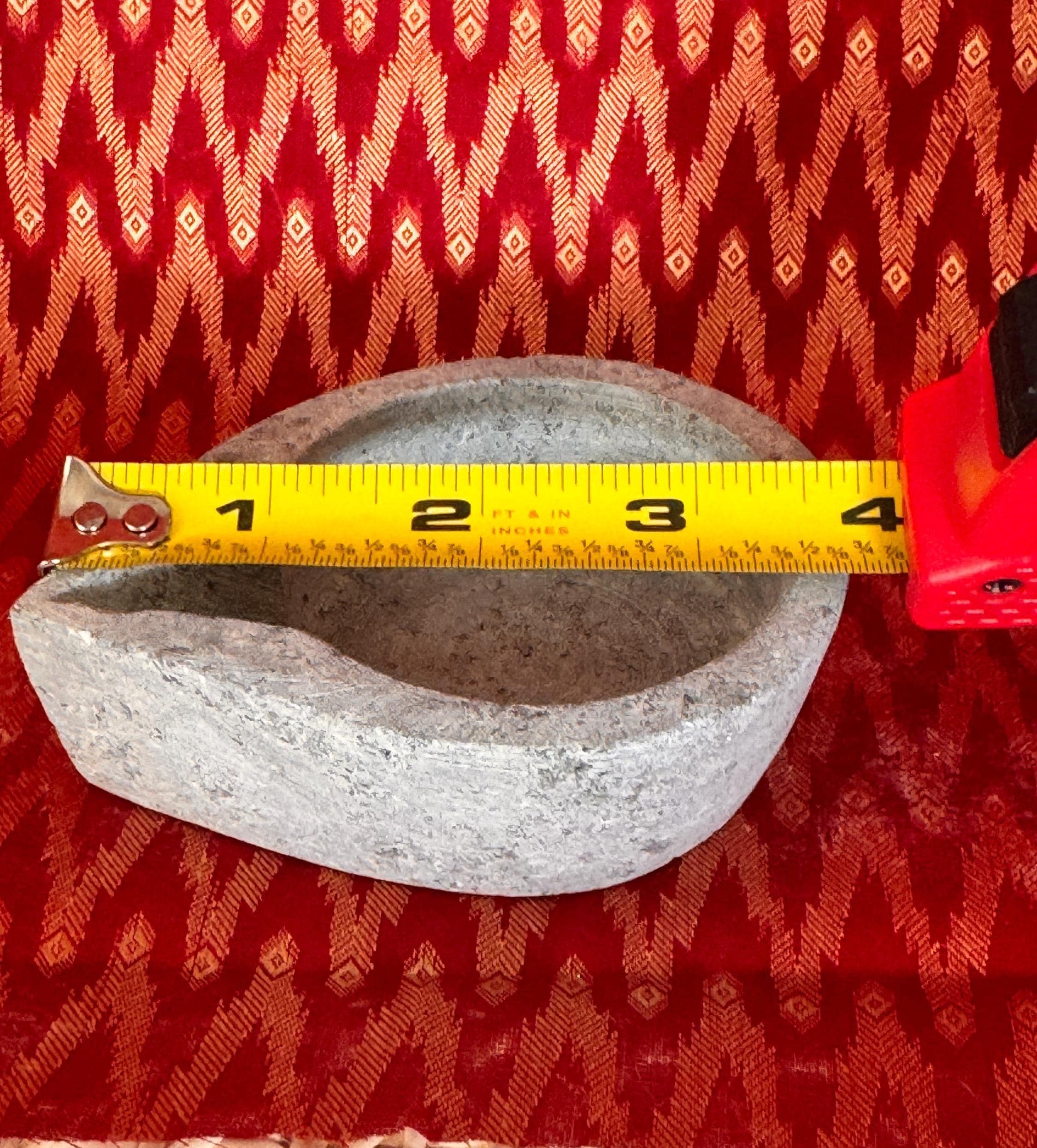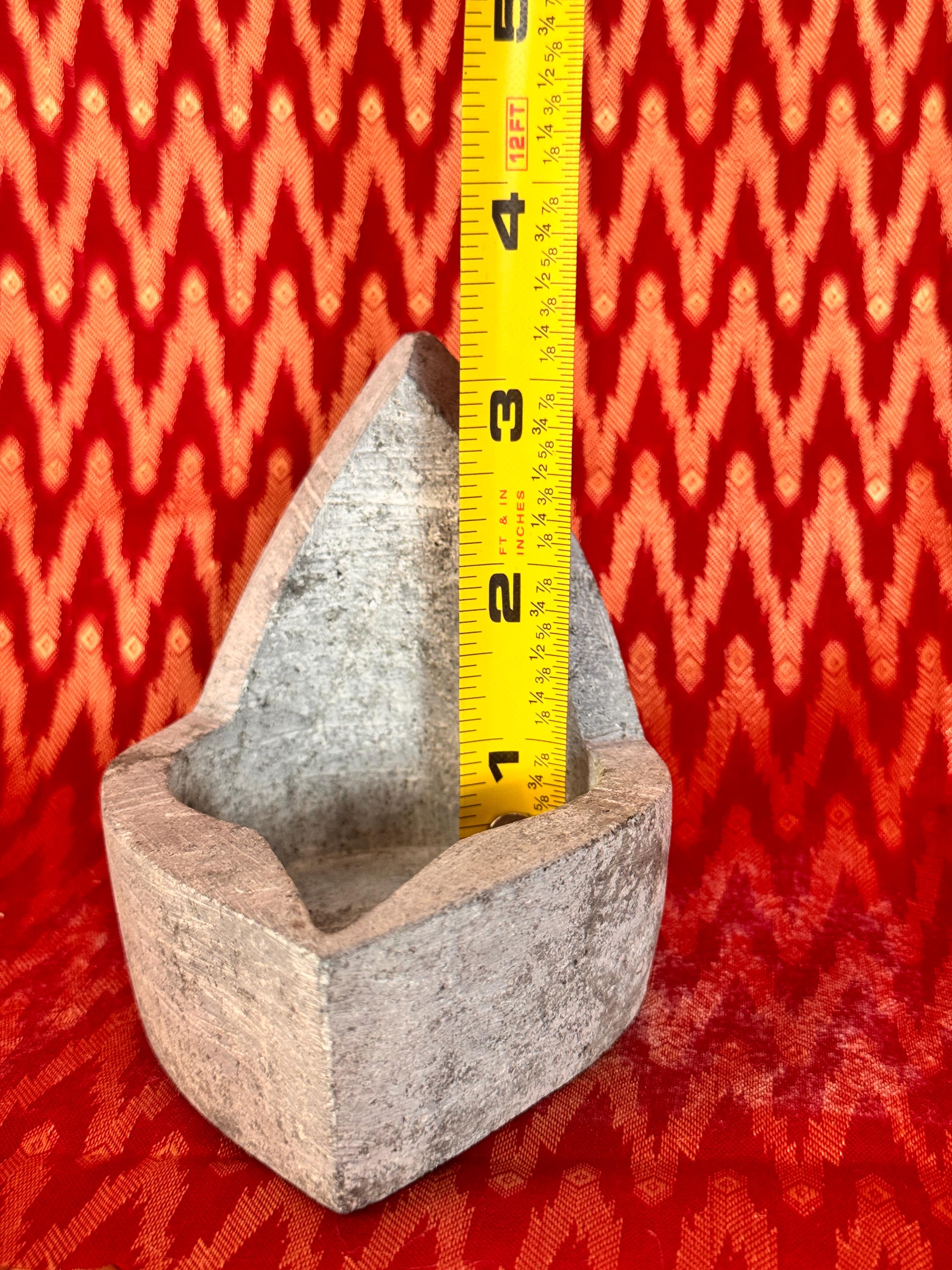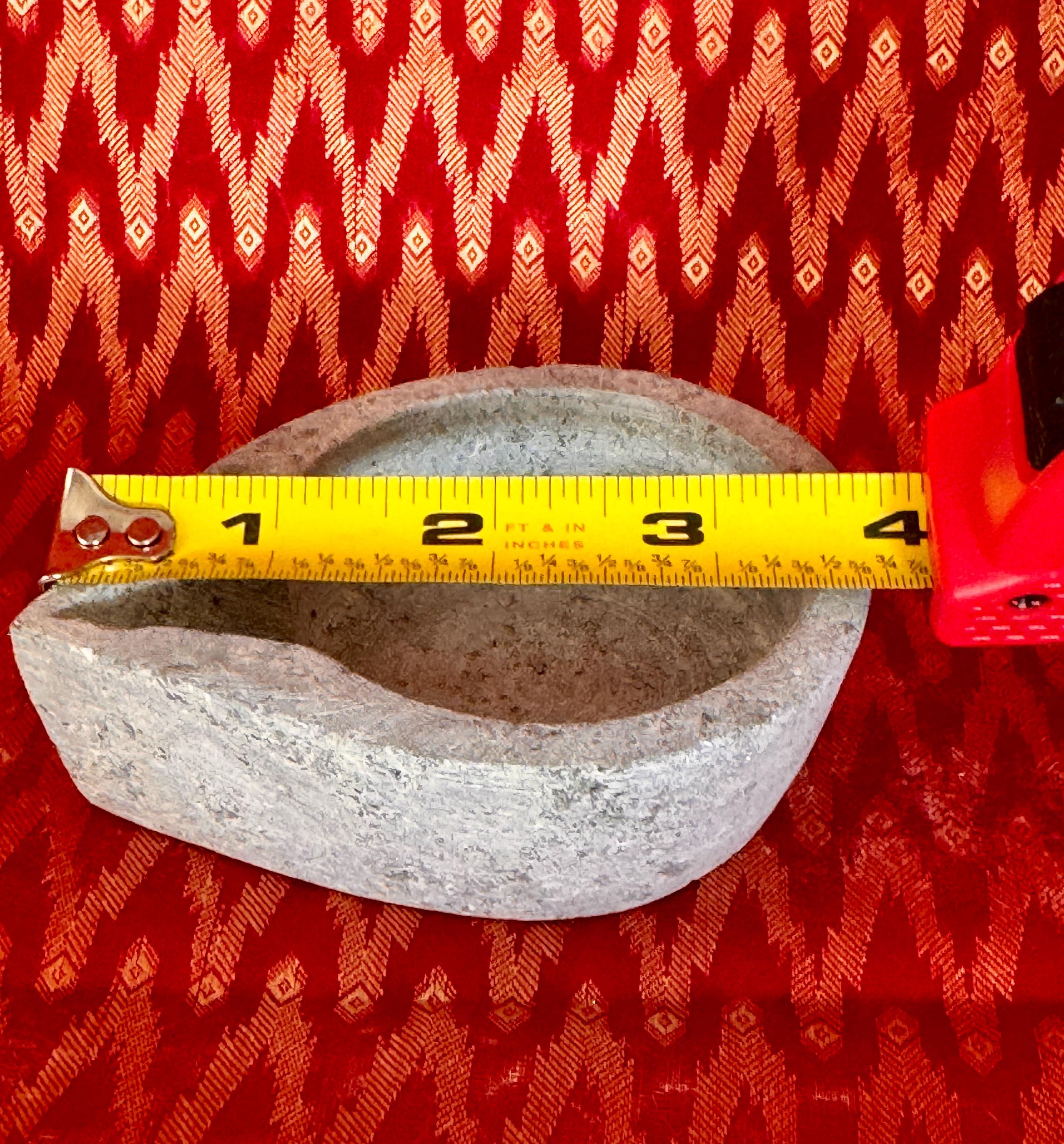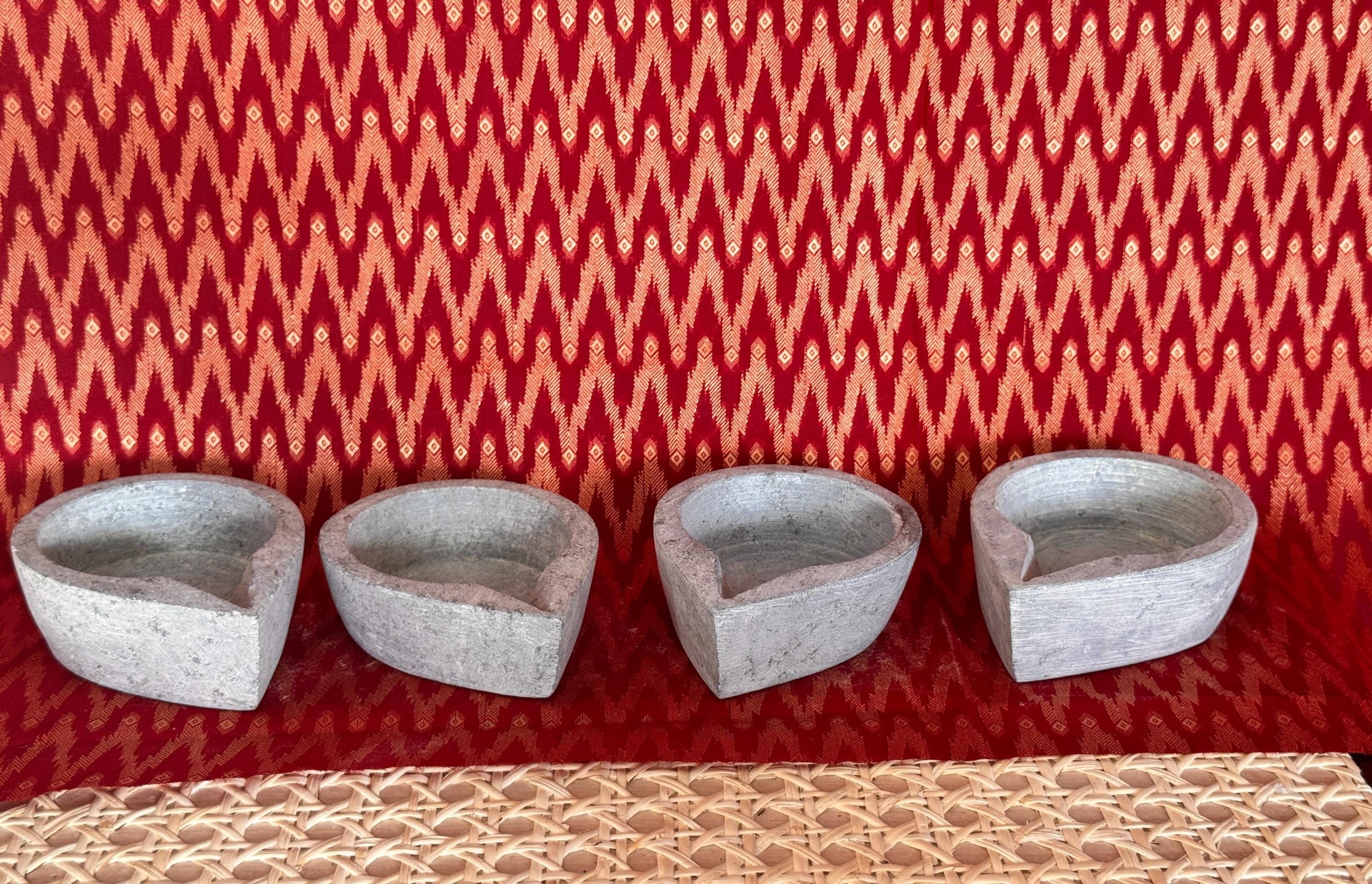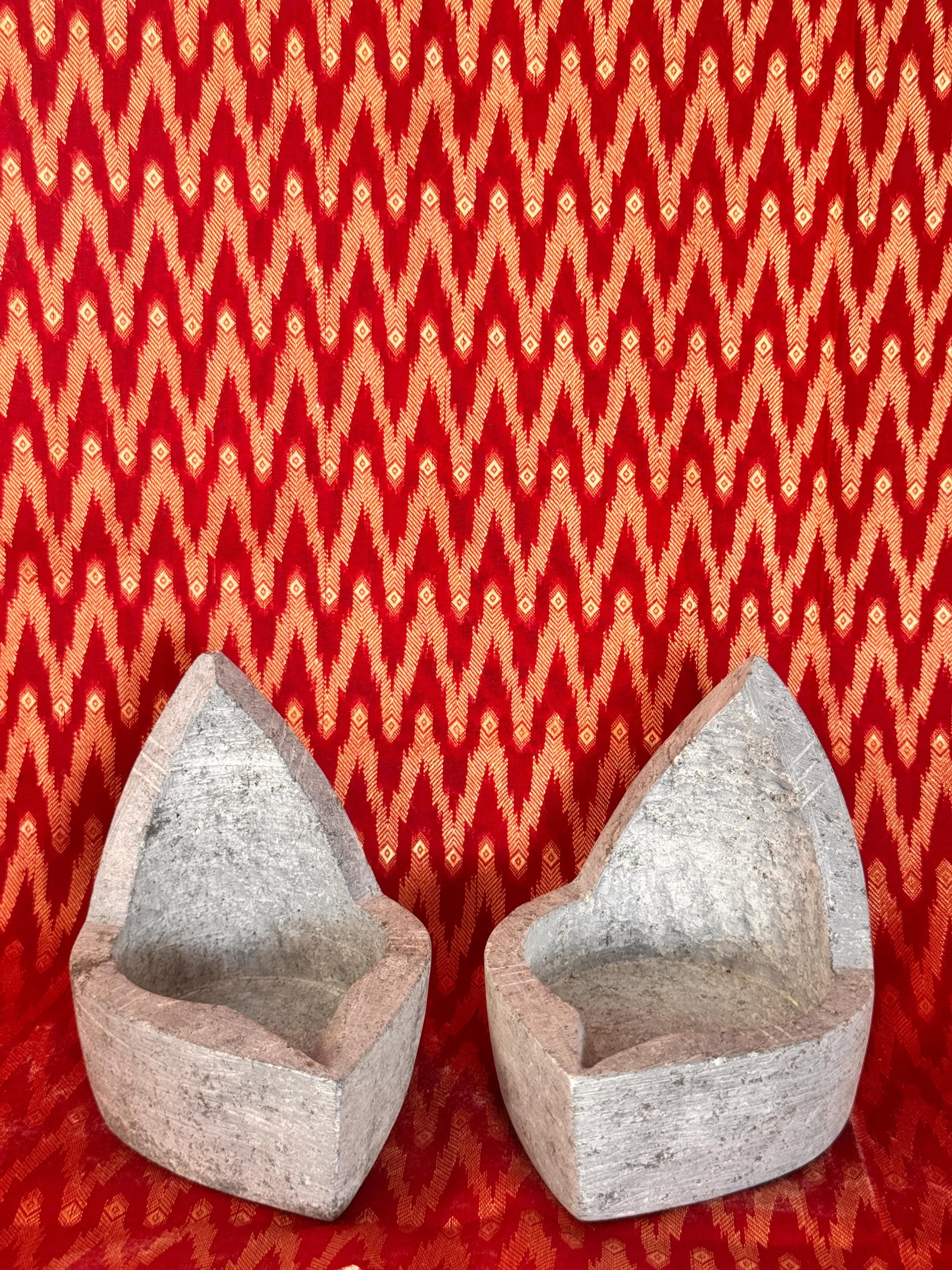 Minimalist and contemporary design - natural soapstone lamps. Soapstone (locally known as maakkal or kalchatti) is a soft, heat-resistant stone. Soapstone’s ability to withstand high heat makes it ideal for oil lamps used in daily rituals at homes and long temple ceremonies. It is believed that lighting a lamp signifies the dispelling of darkness and ignorance. The flame represents jnana (wisdom) and the divine presence. Passed down generations, these lamps often carry ancestral blessings and are lit during auspicious occasions like weddings, housewarmings, and naming ceremonies. The use of natural stone and oil-based lighting aligns with eco-conscious, sustainable practices rooted in tradition. Contemporary artisans are reimagining soapstone lamps with minimalist or heritage-inspired designs for modern homes. Listing is for one lamp/diya with variations as indicated below in dropdown.