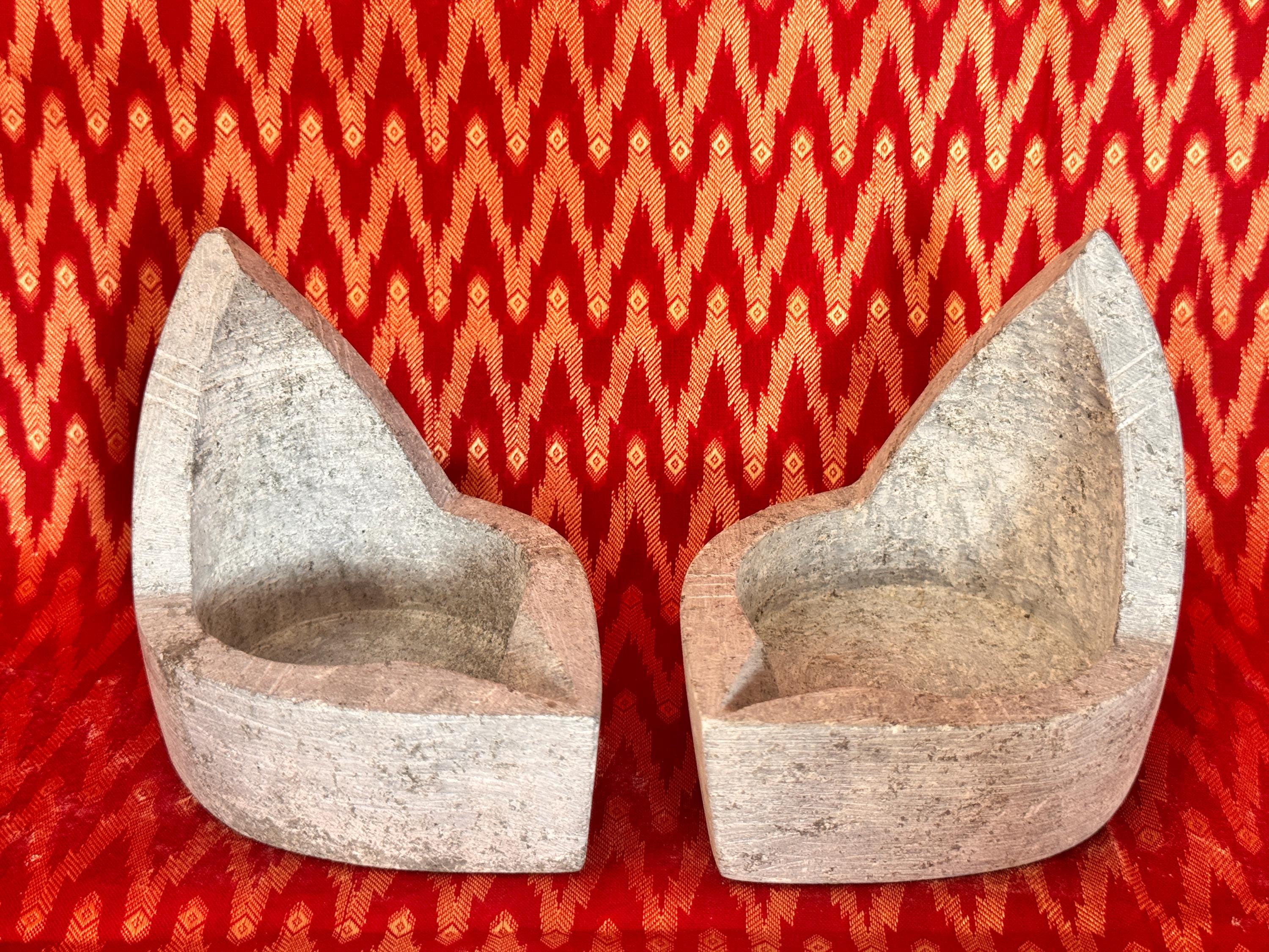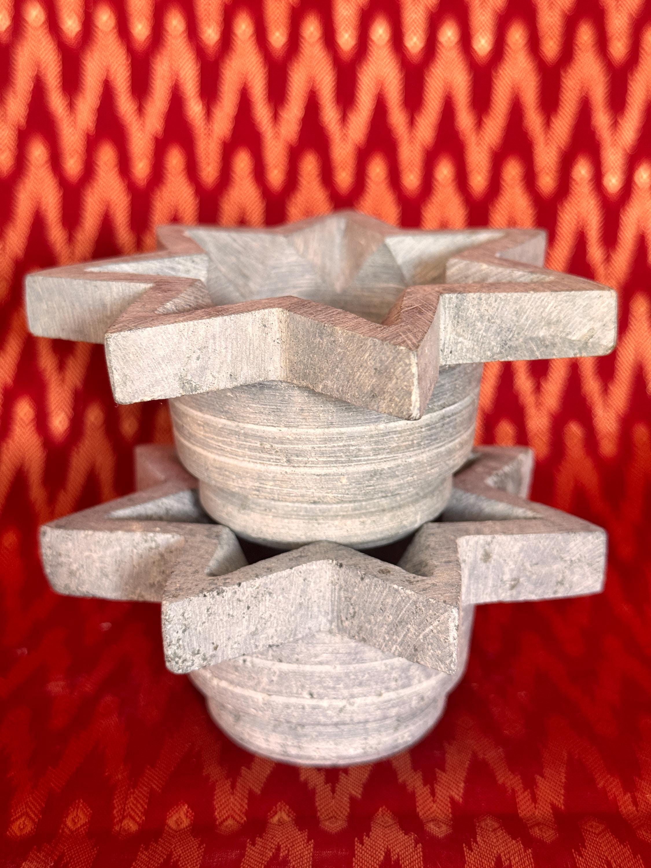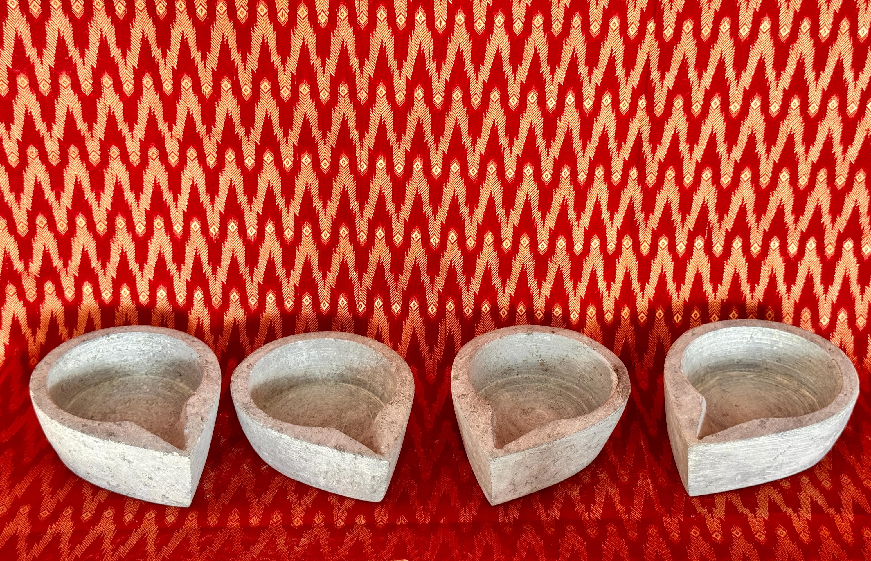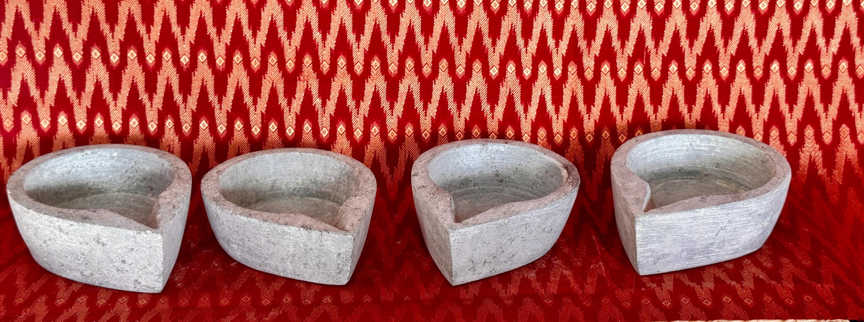 Minimalist and contemporary design - natural soapstone lamps. Soapstone (locally known as maakkal or kalchatti) is a soft, heat-resistant stone. Soapstone’s ability to withstand high heat makes it ideal for oil lamps used in daily rituals at homes and long temple ceremonies. It is believed that lighting a lamp signifies the dispelling of darkness and ignorance. The flame represents jnana (wisdom) and the divine presence. Passed down generations, these lamps often carry ancestral blessings and are lit during auspicious occasions like weddings, housewarmings, and naming ceremonies. The use of natural stone and oil-based lighting aligns with eco-conscious, sustainable practices rooted in tradition. Contemporary artisans are reimagining soapstone lamps with minimalist or heritage-inspired designs for modern homes. Listing is for one lamp/diya with variations as indicated below in dropdown.