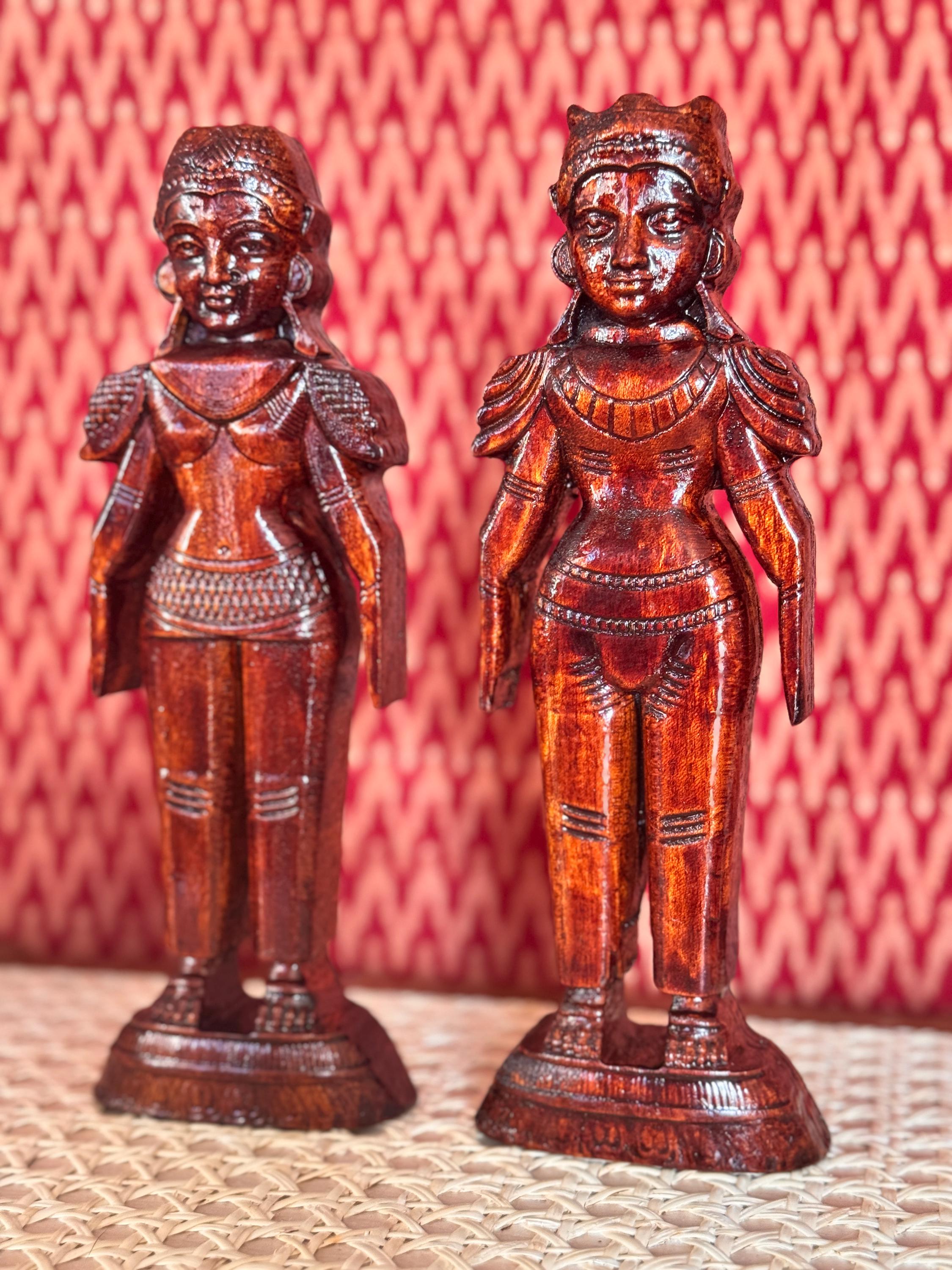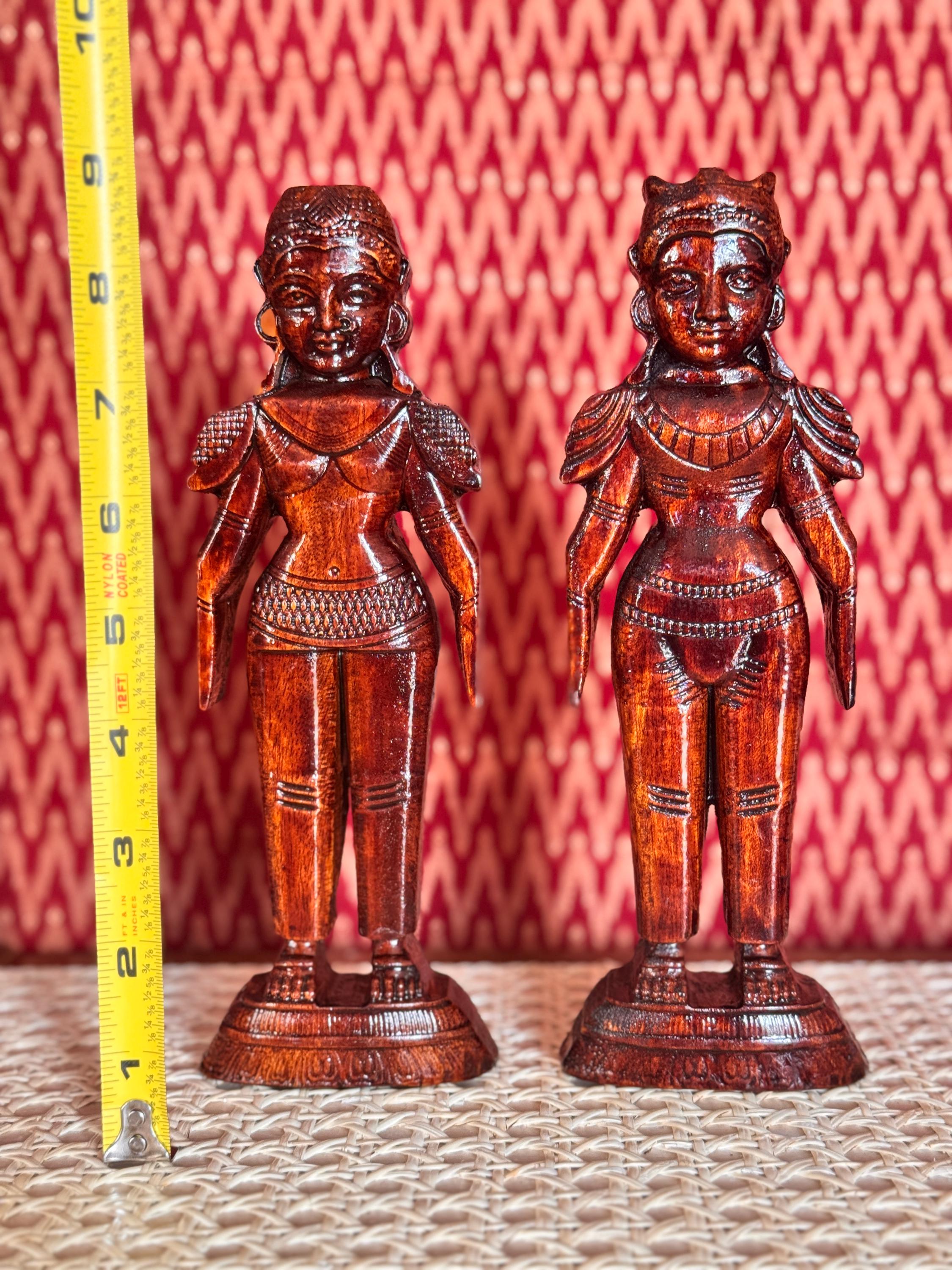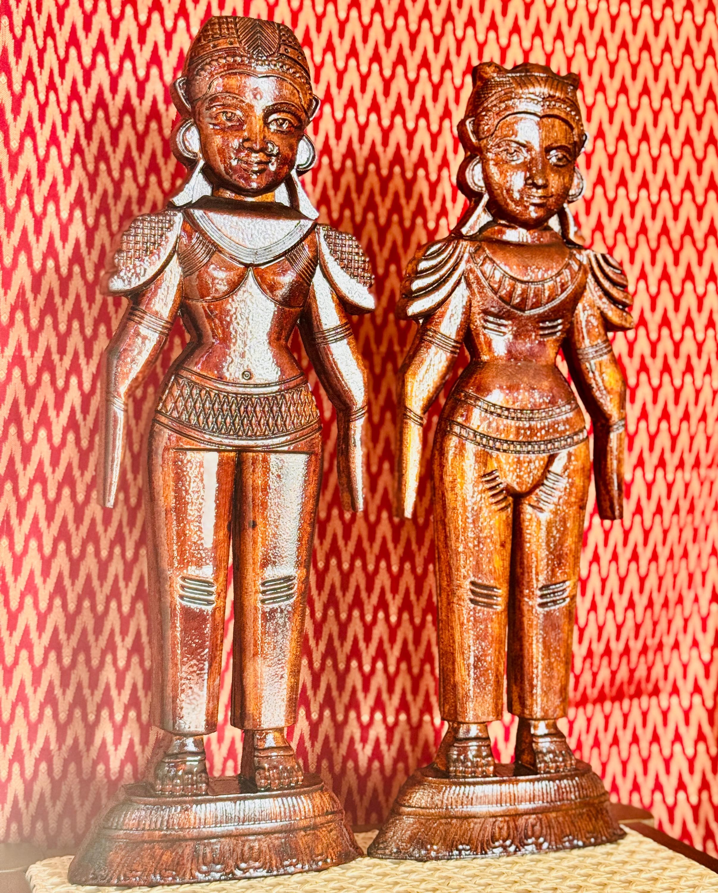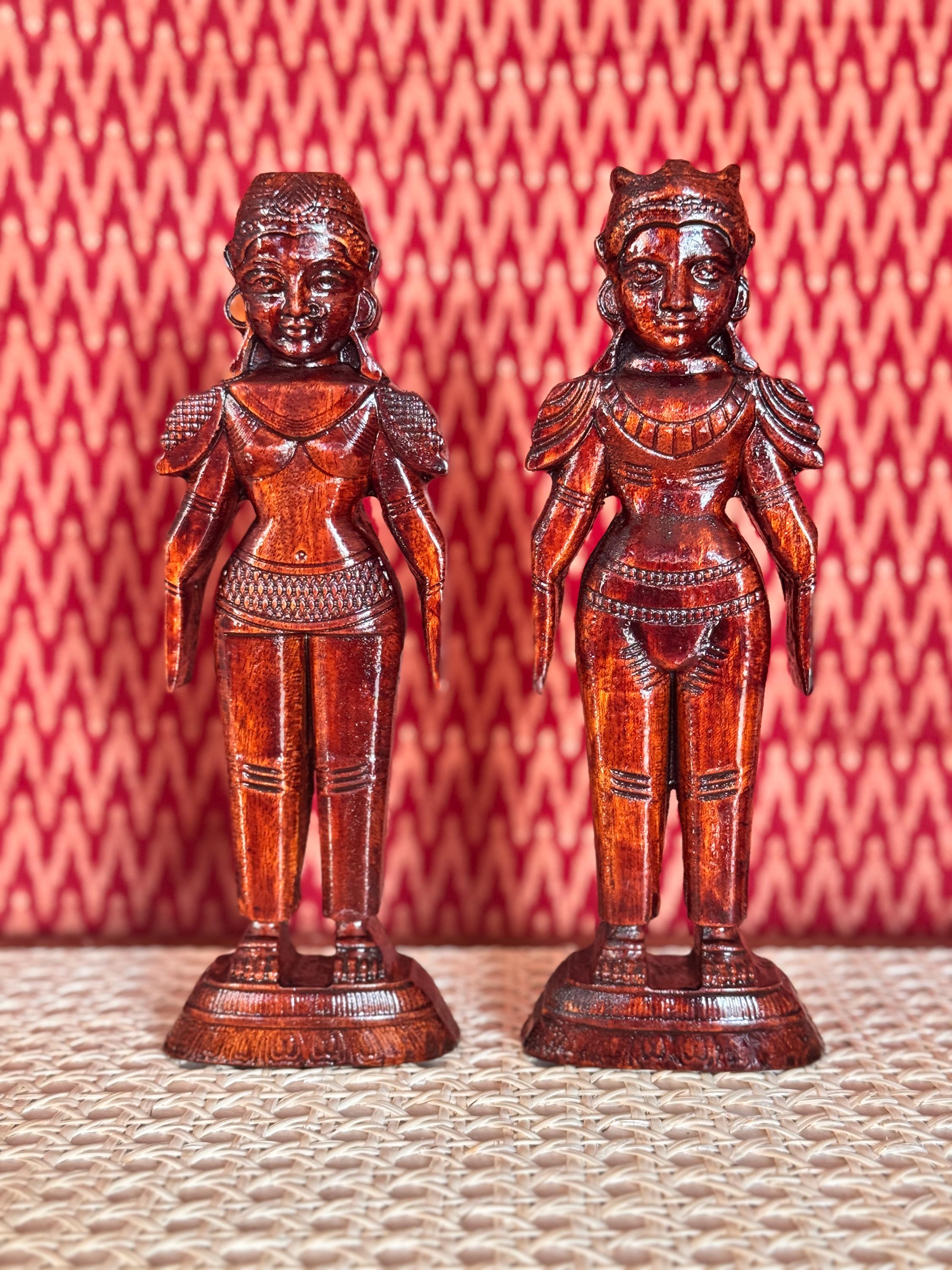 Original, handcrafted pair of wood dolls - known for prosperity and well being. Marapachi dolls are traditional South Indian wooden dolls, typically carved from wood, and are deeply symbolic during festivals and weddings in India. They represent fertility, prosperity, and the continuity of family traditions. Traditionally made from red sandalwood (marapachi), silk-cotton wood, or redwood. These woods are believed to have medicinal properties, especially beneficial for children who play with the dolls.Always crafted in pairs—a male and female figure—often dressed as a king and queen. Their minimalistic, unpainted look highlights the natural beauty of the wood. Marapachi dolls are placed prominently in homes/prayer rooms, symbolizing divine blessings and auspicious beginnings.These dolls are cherished across generations, passed down as sacred keepsakes. They carry emotional and spiritual resonance, often wrapped and stored with care between festivals. The dolls are believed to bless the household with children and good health. Their wooden composition is thought to have healing properties. Material: Hand carved, mahogany wood. Pair of 2 dolls, male and female is listed as a pair.