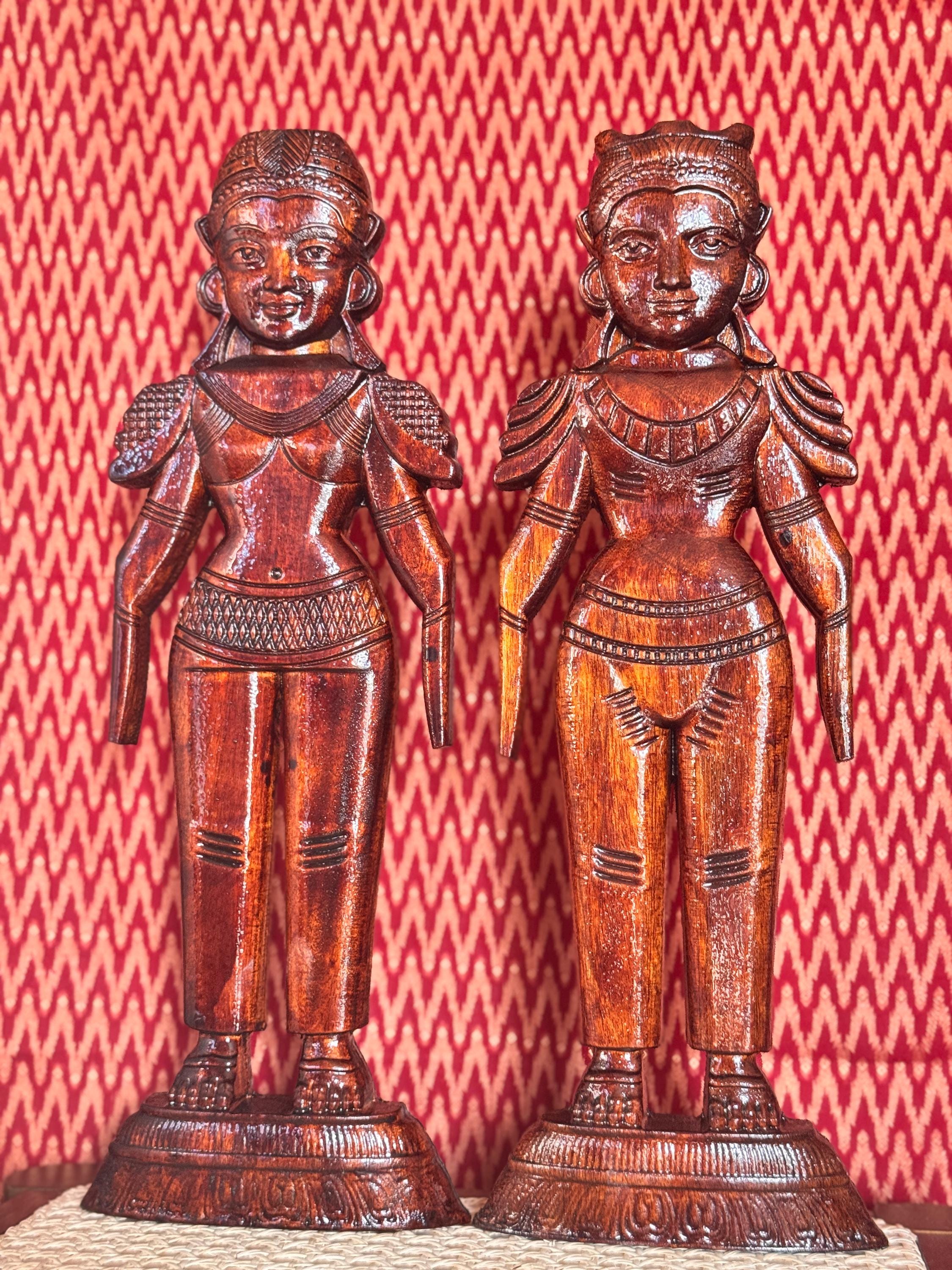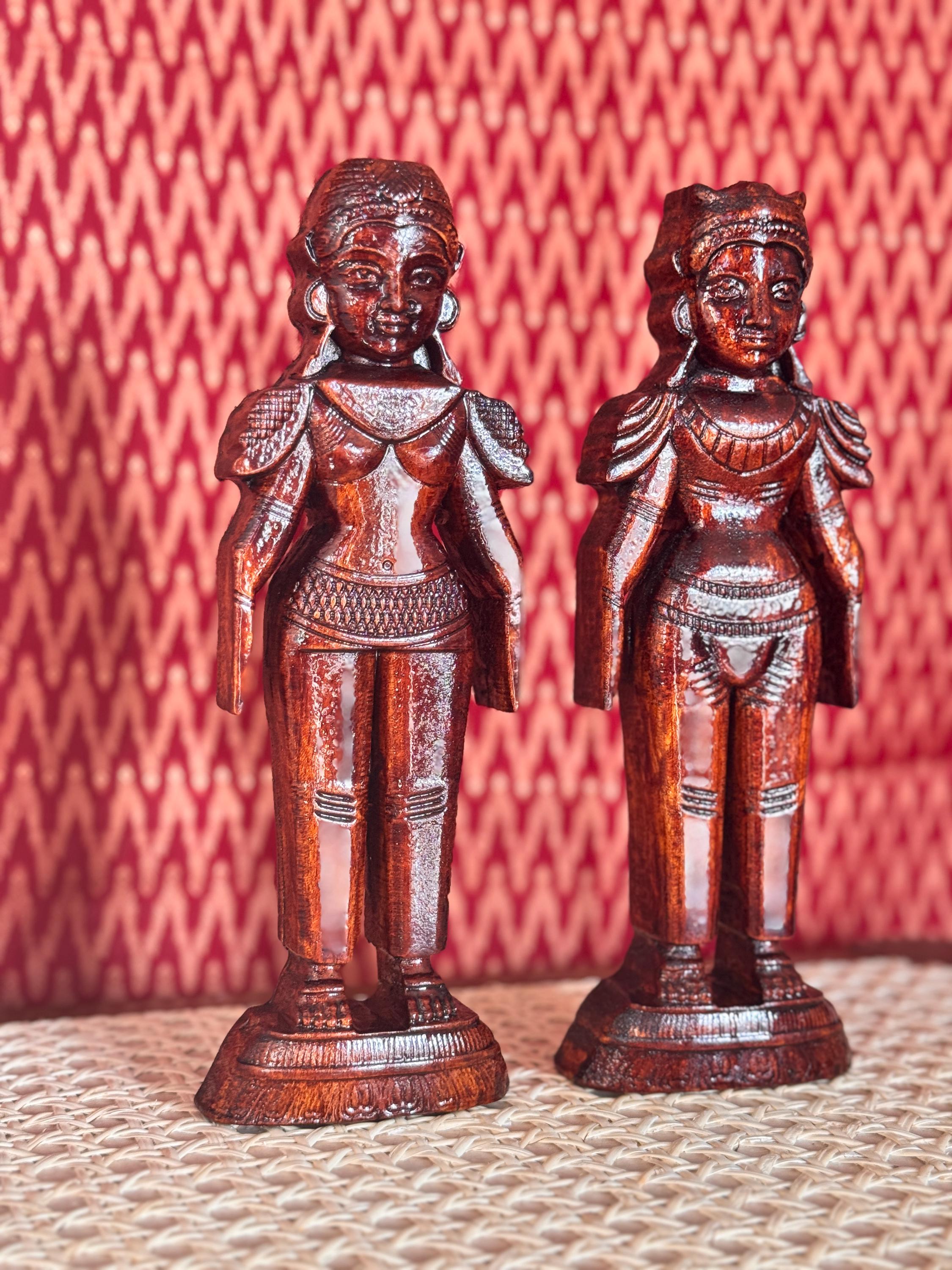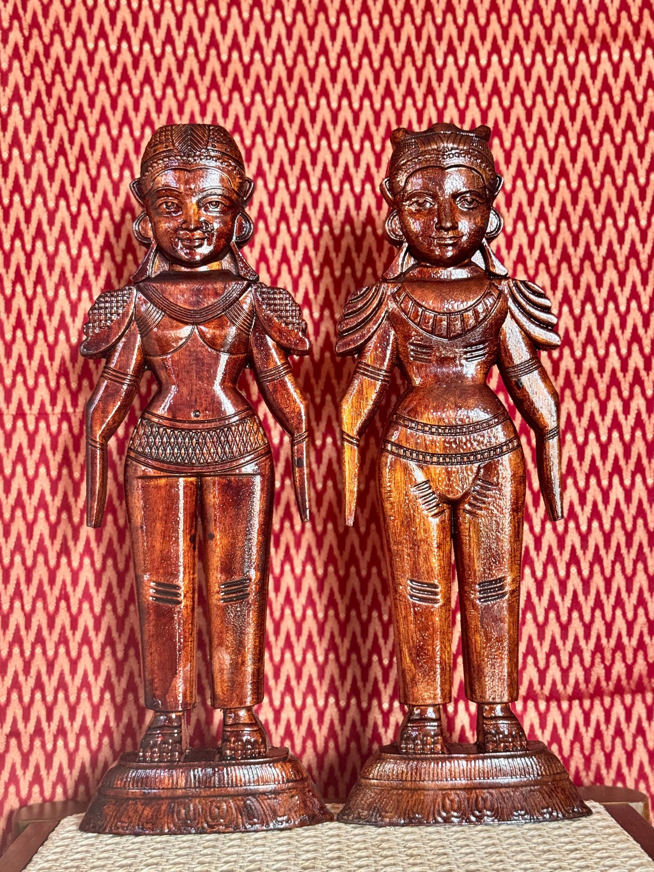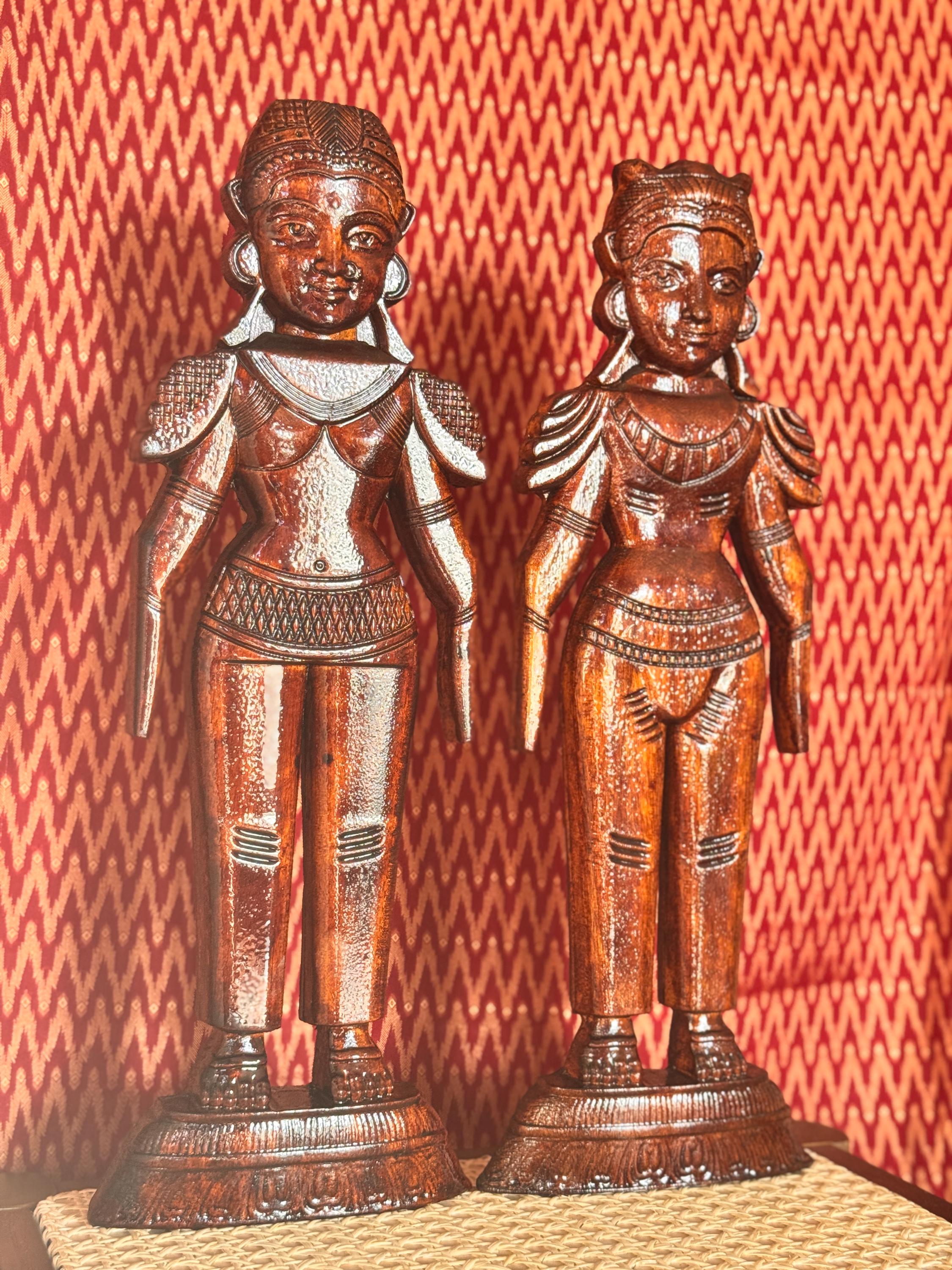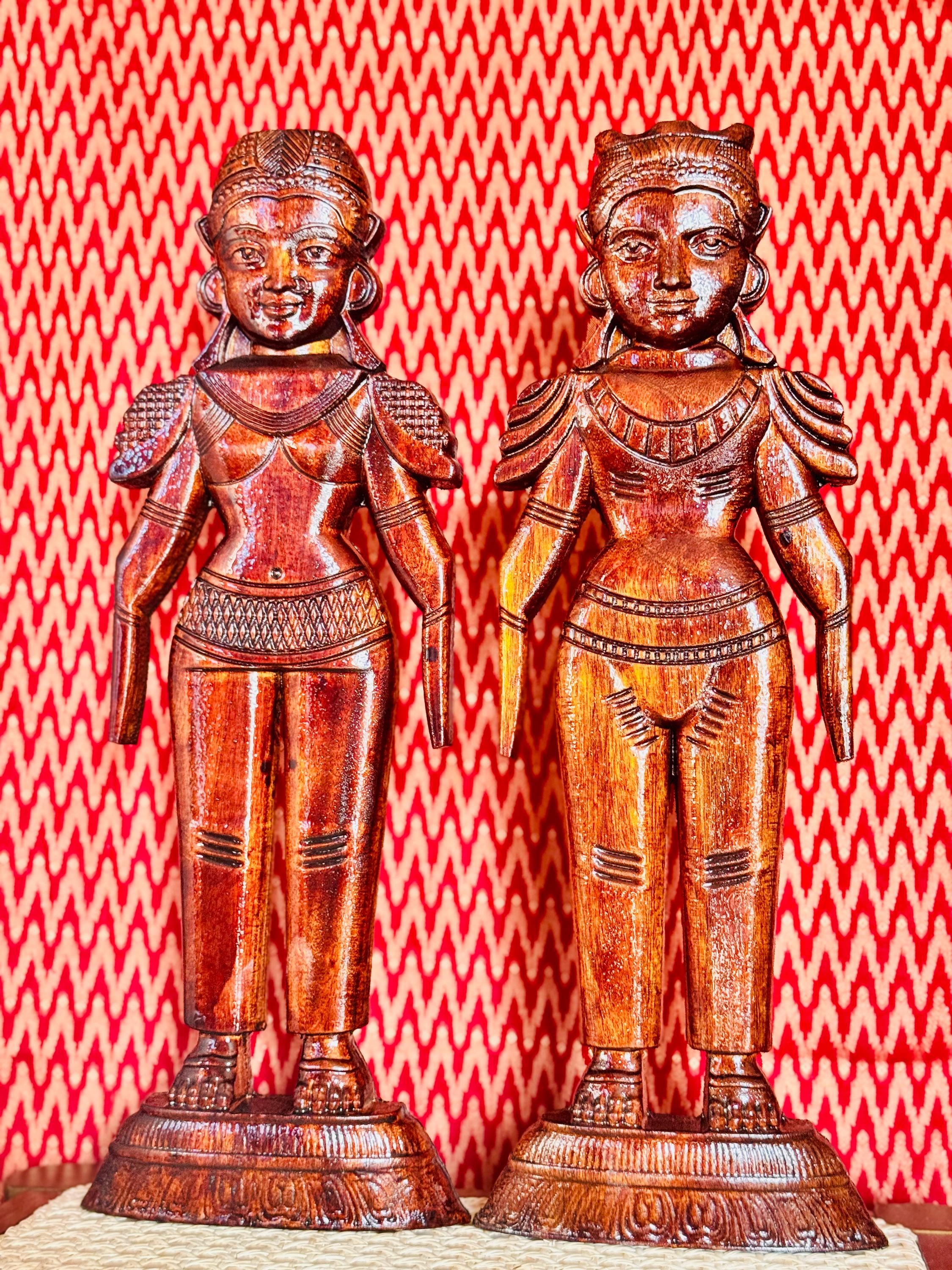 Original, handcrafted pair of wood dolls - known for prosperity and well being. Marapachi dolls are traditional South Indian wooden dolls, typically carved from wood, and are deeply symbolic during festivals and weddings in India. They represent fertility, prosperity, and the continuity of family traditions. Traditionally made from red sandalwood (marapachi), silk-cotton wood, or redwood. These woods are believed to have medicinal properties, especially beneficial for children who play with the dolls.Always crafted in pairs—a male and female figure—often dressed as a king and queen. Their minimalistic, unpainted look highlights the natural beauty of the wood. Marapachi dolls are placed prominently in homes/prayer rooms, symbolizing divine blessings and auspicious beginnings.These dolls are cherished across generations, passed down as sacred keepsakes. They carry emotional and spiritual resonance, often wrapped and stored with care between festivals. The dolls are believed to bless the household with children and good health. Their wooden composition is thought to have healing properties. Material: Hand carved, mahogany wood. Pair of 2 dolls, male and female is listed as a pair.