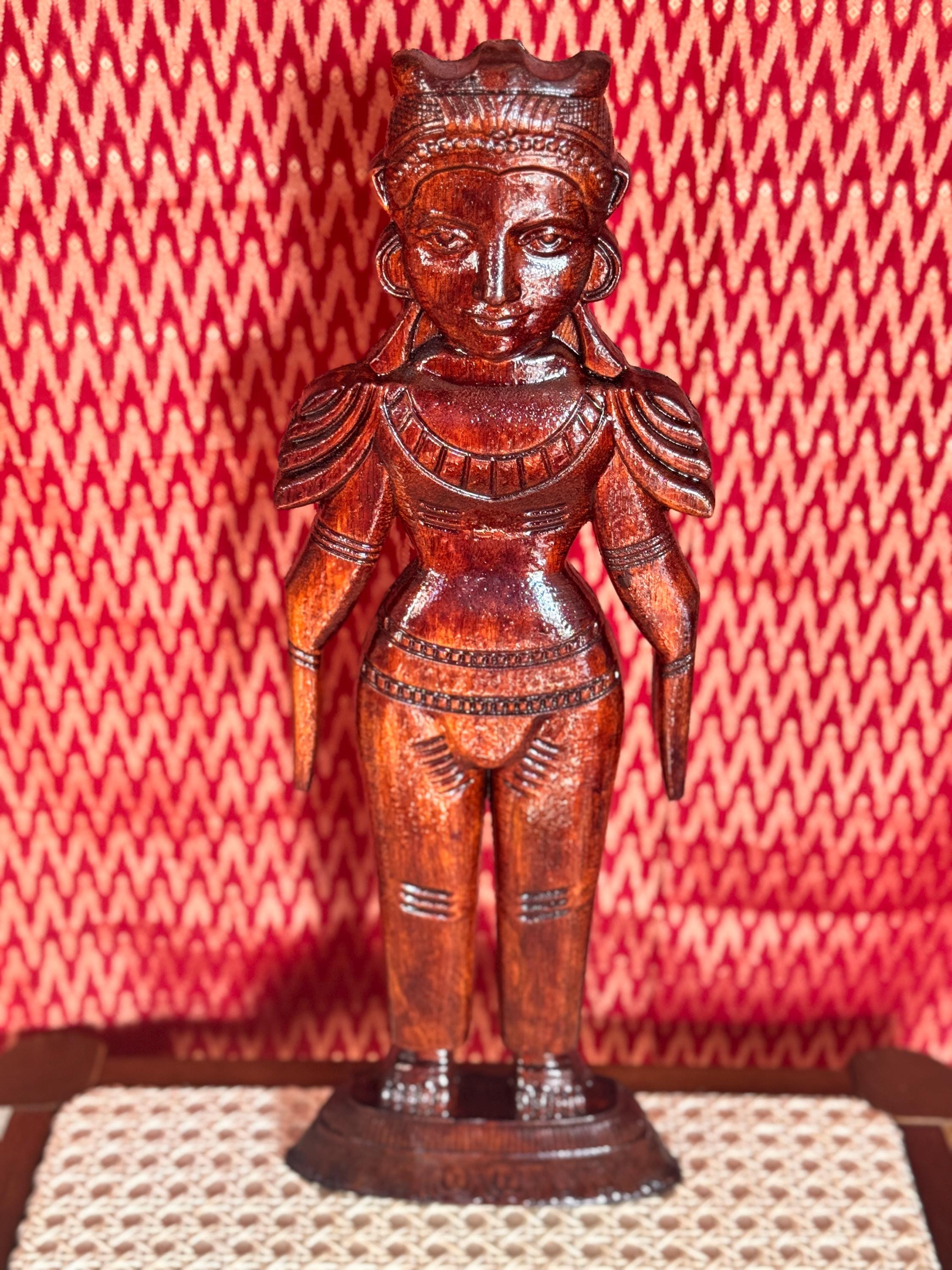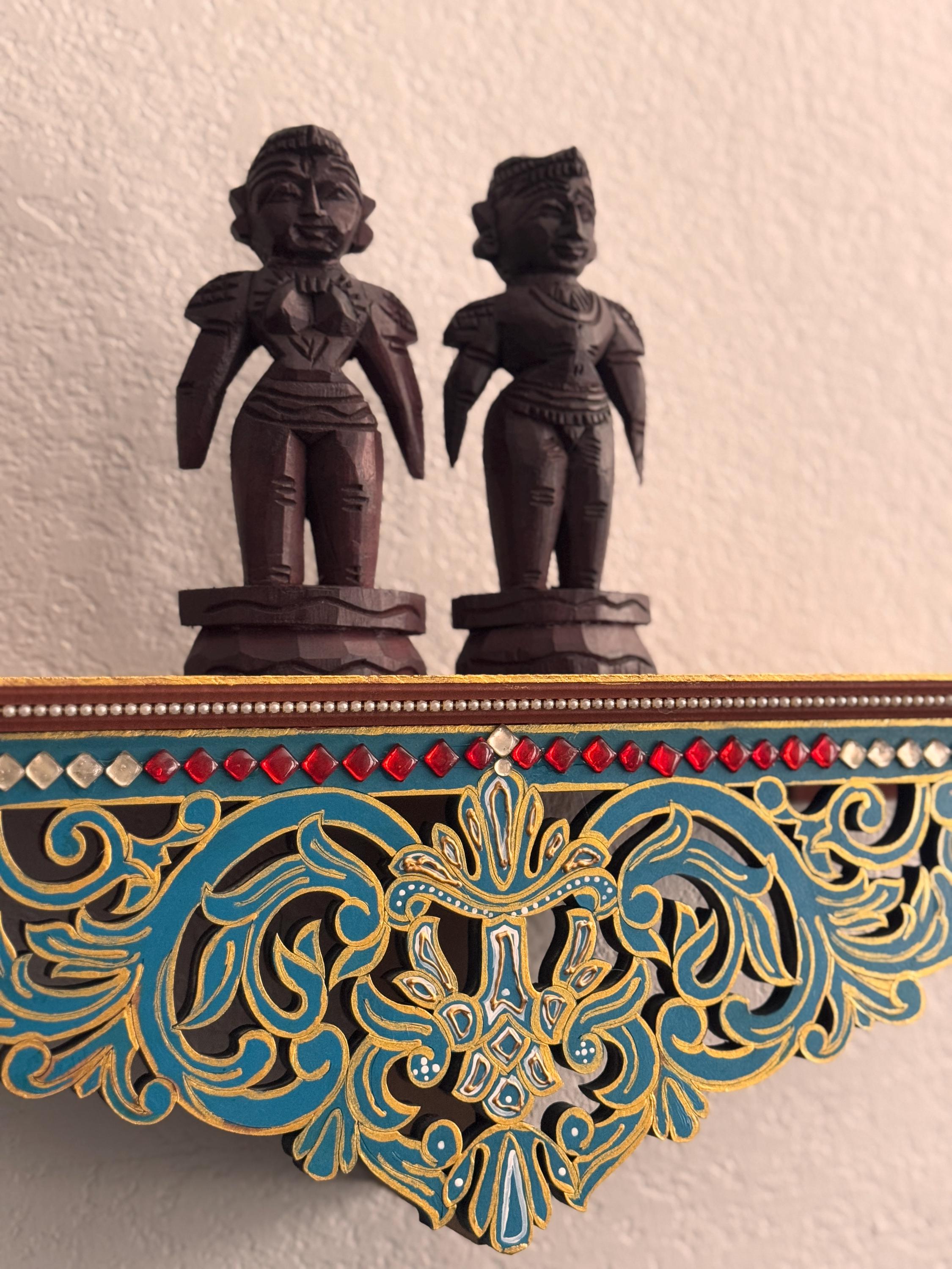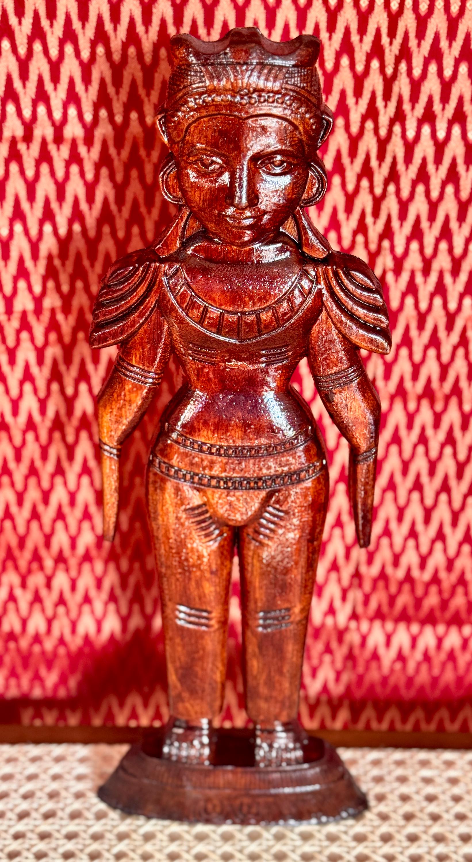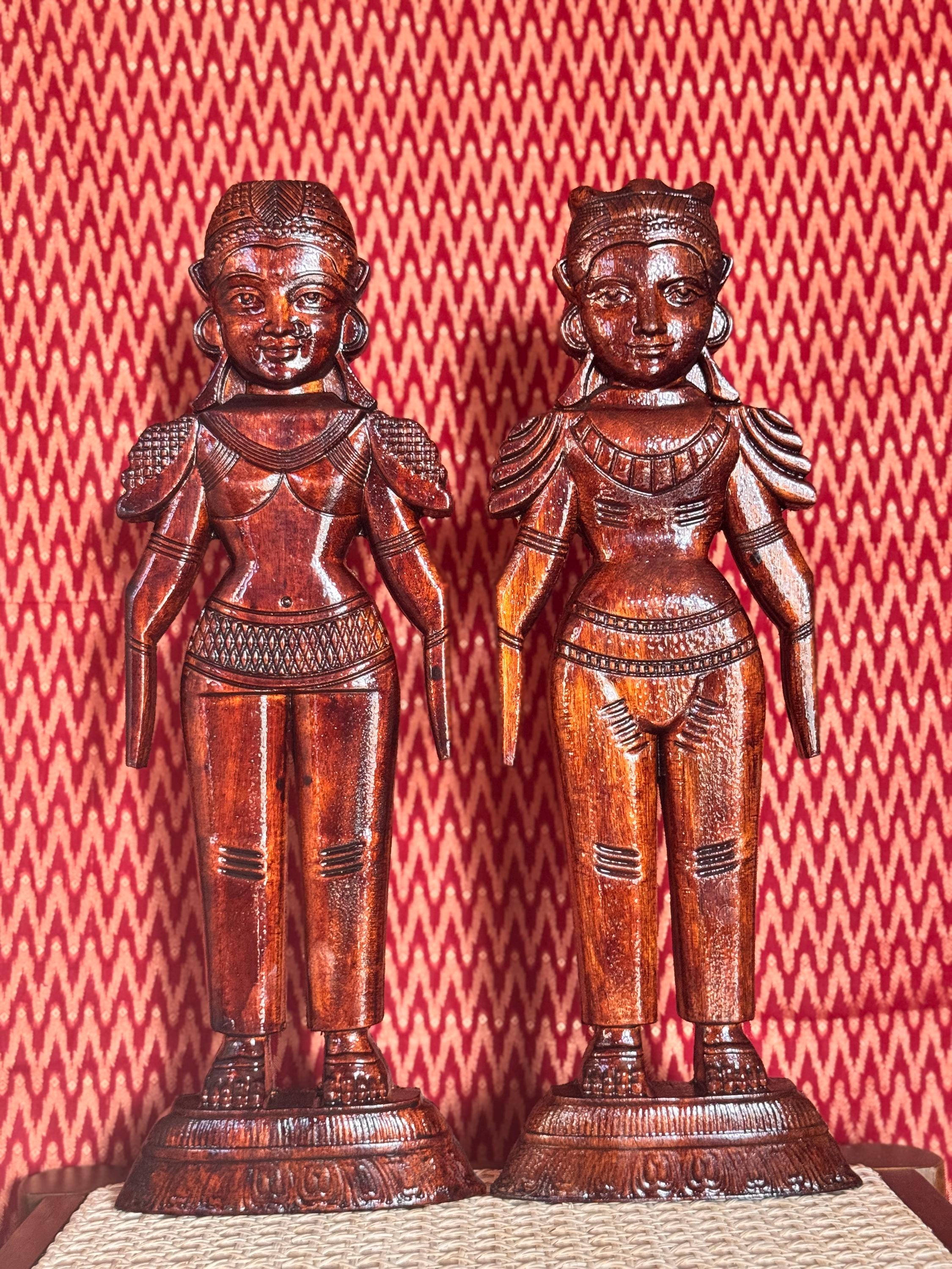 Original, handcrafted pair of wood dolls - known for prosperity and well being. Marapachi dolls are traditional South Indian wooden dolls, typically carved from wood, and are deeply symbolic during festivals and weddings in India. They represent fertility, prosperity, and the continuity of family traditions. Traditionally made from red sandalwood (marapachi), silk-cotton wood, or redwood. These woods are believed to have medicinal properties, especially beneficial for children who play with the dolls.Always crafted in pairs—a male and female figure—often dressed as a king and queen. Their minimalistic, unpainted look highlights the natural beauty of the wood. Marapachi dolls are placed prominently in homes/prayer rooms, symbolizing divine blessings and auspicious beginnings.These dolls are cherished across generations, passed down as sacred keepsakes. They carry emotional and spiritual resonance, often wrapped and stored with care between festivals. The dolls are believed to bless the household with children and good health. Their wooden composition is thought to have healing properties. Material: Hand carved, mahogany wood. Pair of 2 dolls, male and female is listed as a pair.