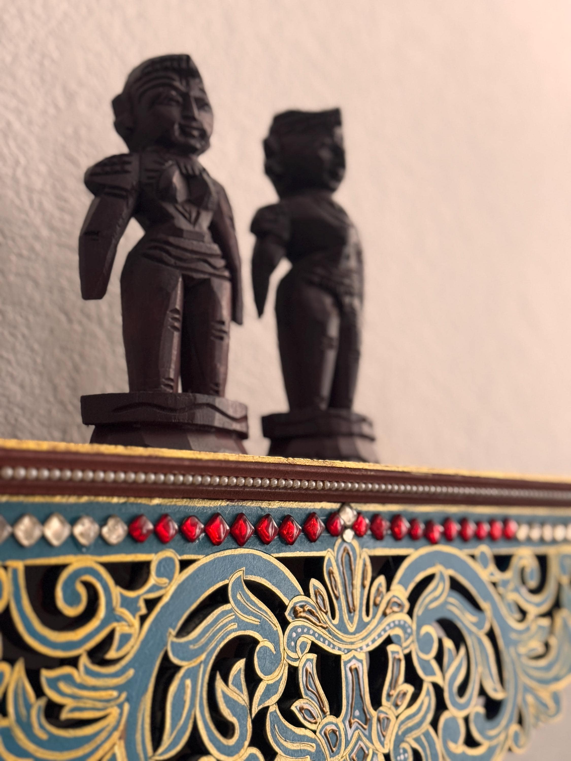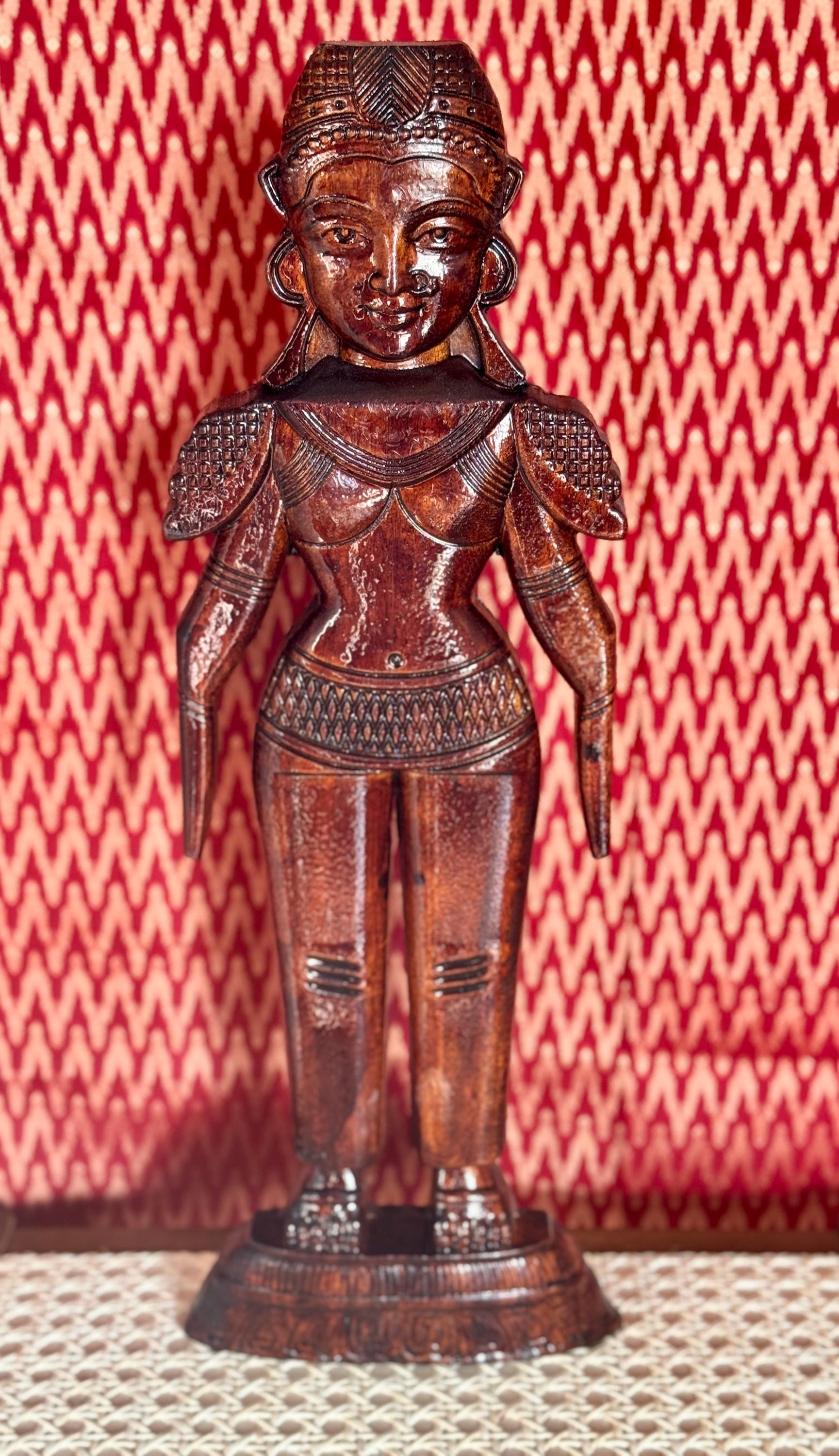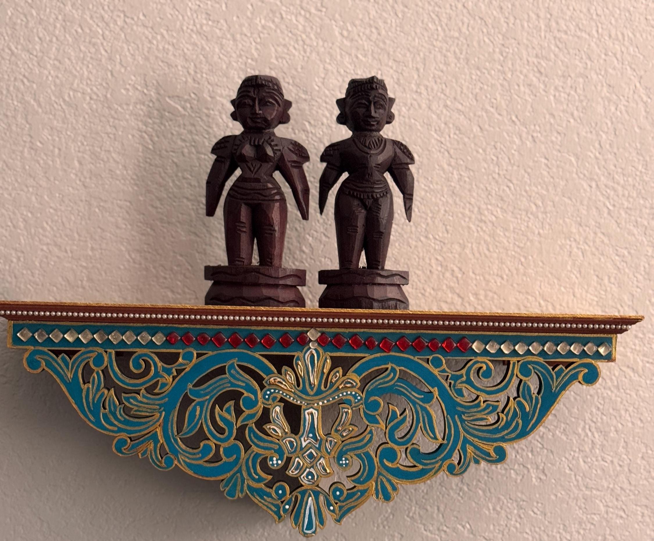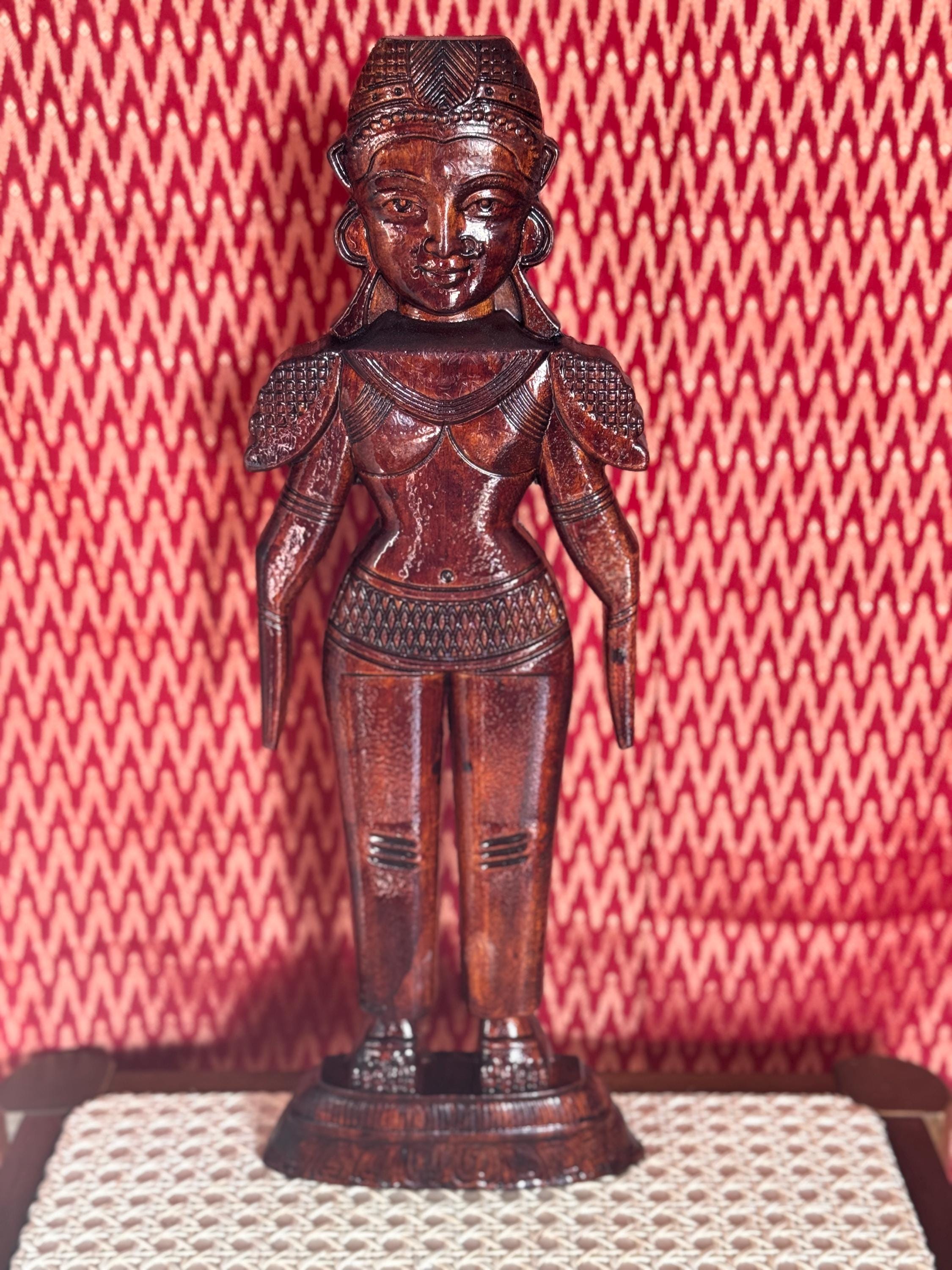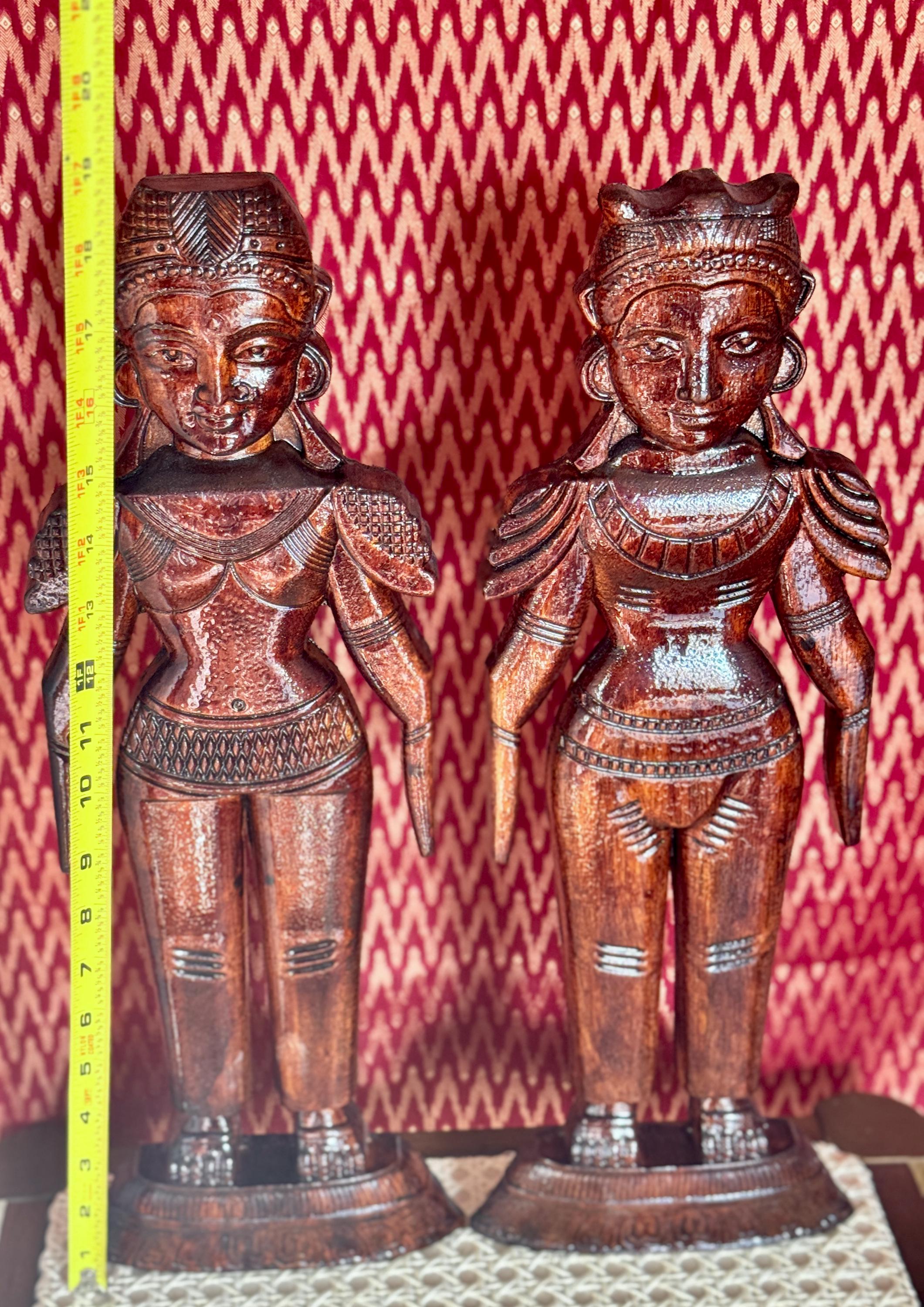 Original, handcrafted pair of wood dolls - known for prosperity and well being. Marapachi dolls are traditional South Indian wooden dolls, typically carved from wood, and are deeply symbolic during festivals and weddings in India. They represent fertility, prosperity, and the continuity of family traditions. Traditionally made from red sandalwood (marapachi), silk-cotton wood, or redwood. These woods are believed to have medicinal properties, especially beneficial for children who play with the dolls.Always crafted in pairs—a male and female figure—often dressed as a king and queen. Their minimalistic, unpainted look highlights the natural beauty of the wood. Marapachi dolls are placed prominently in homes/prayer rooms, symbolizing divine blessings and auspicious beginnings.These dolls are cherished across generations, passed down as sacred keepsakes. They carry emotional and spiritual resonance, often wrapped and stored with care between festivals. The dolls are believed to bless the household with children and good health. Their wooden composition is thought to have healing properties. Material: Hand carved, mahogany wood. Pair of 2 dolls, male and female is listed as a pair.
