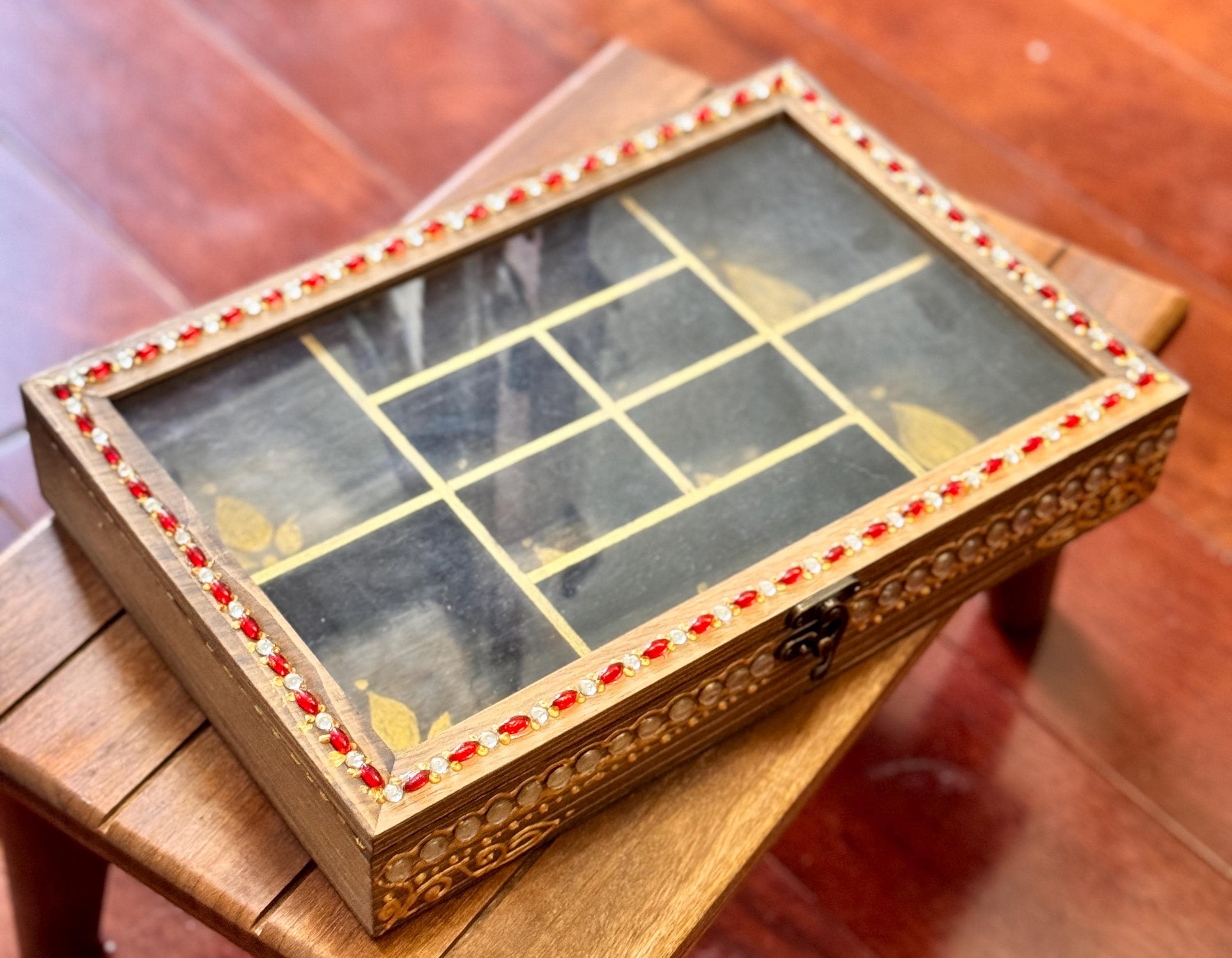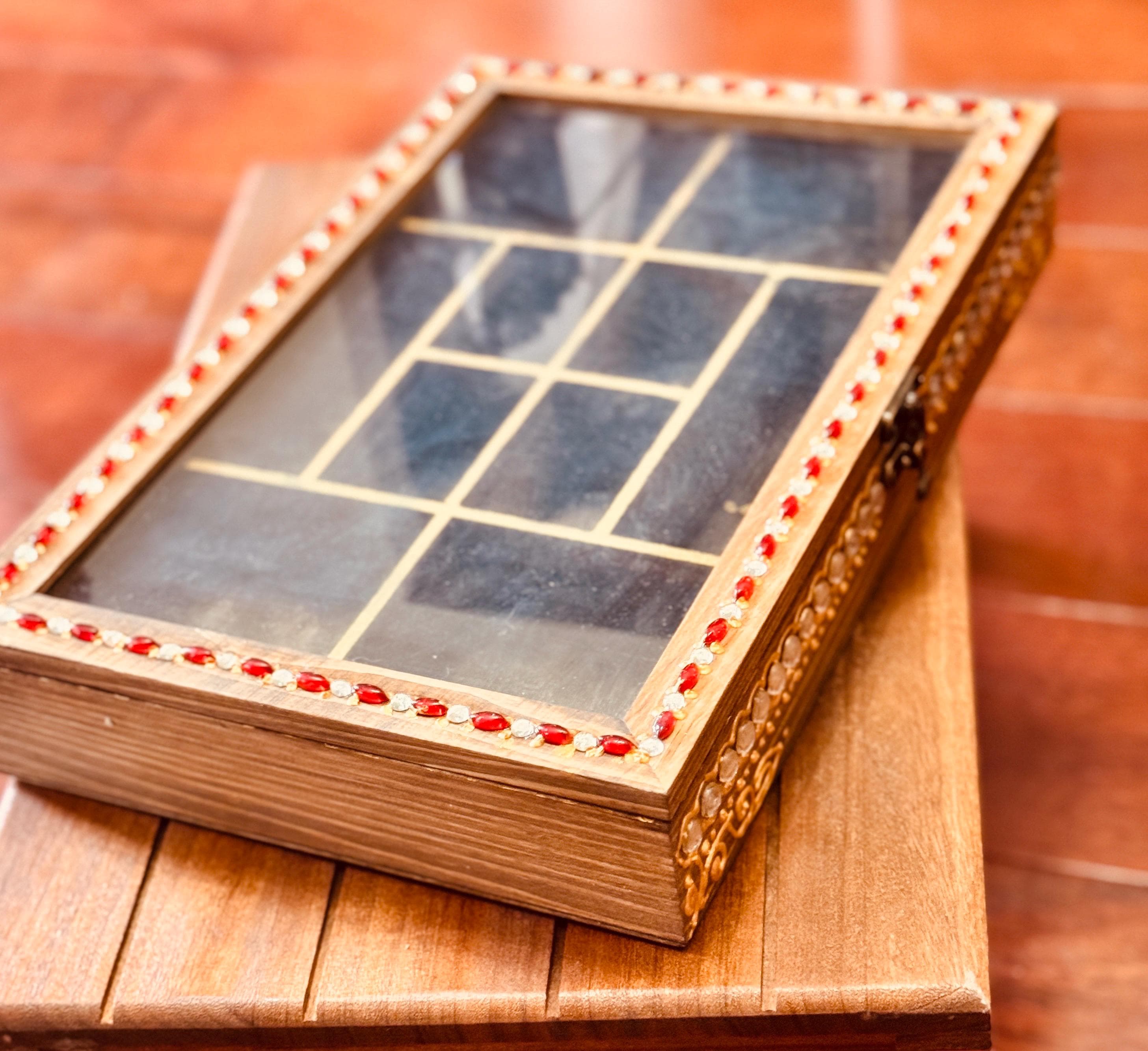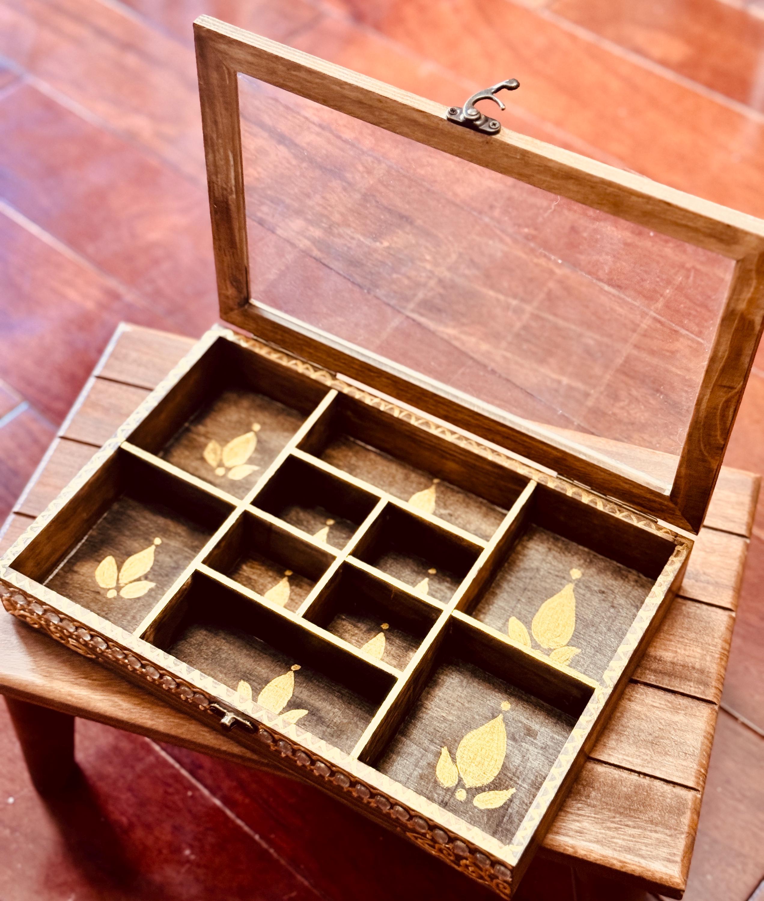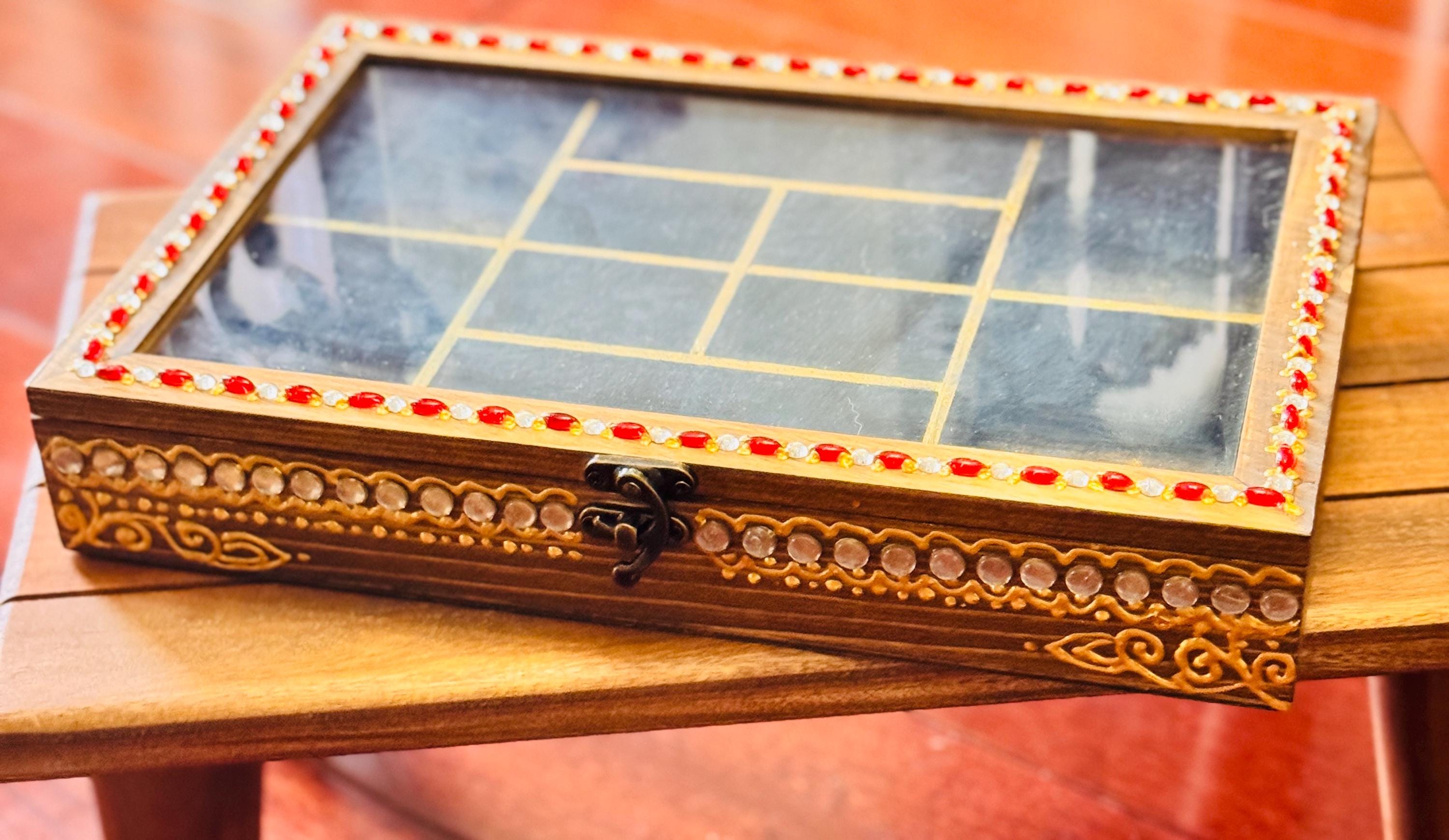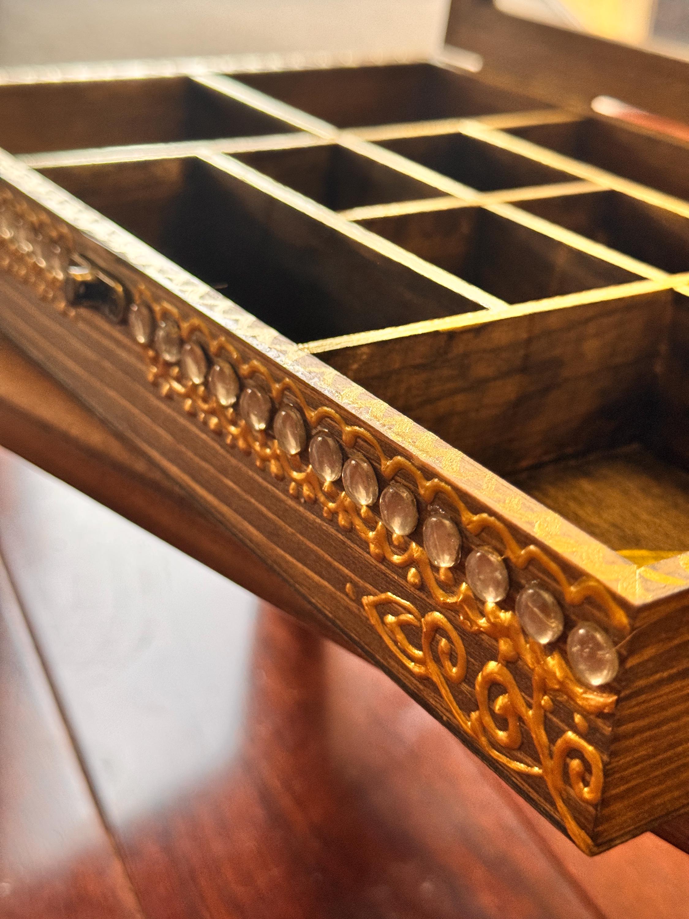 A beautiful jewelry box for your precious jewelry. Functional yet elegant model. Original Tanjore stones have been embedded in this handcrafted jewelry box to bring that aesthetic charm.