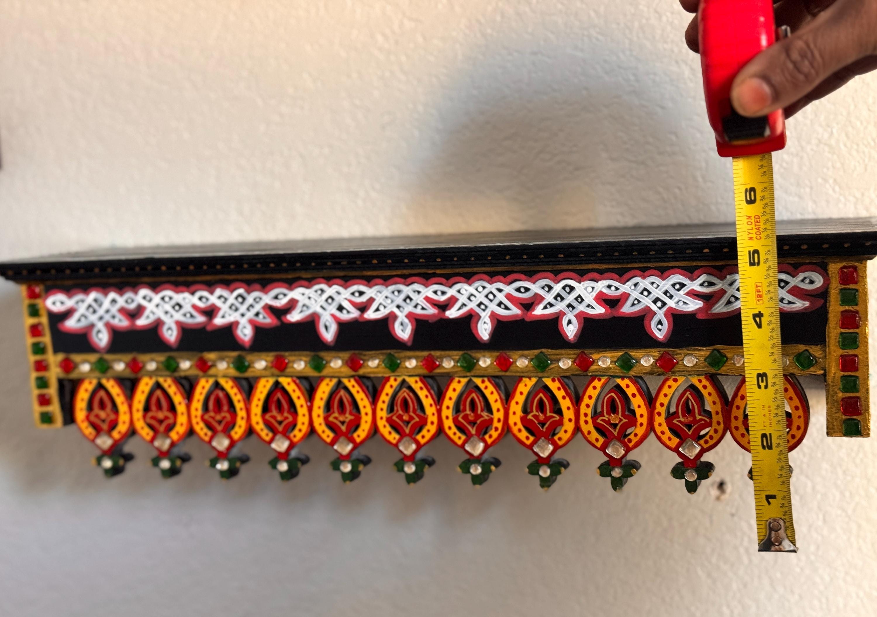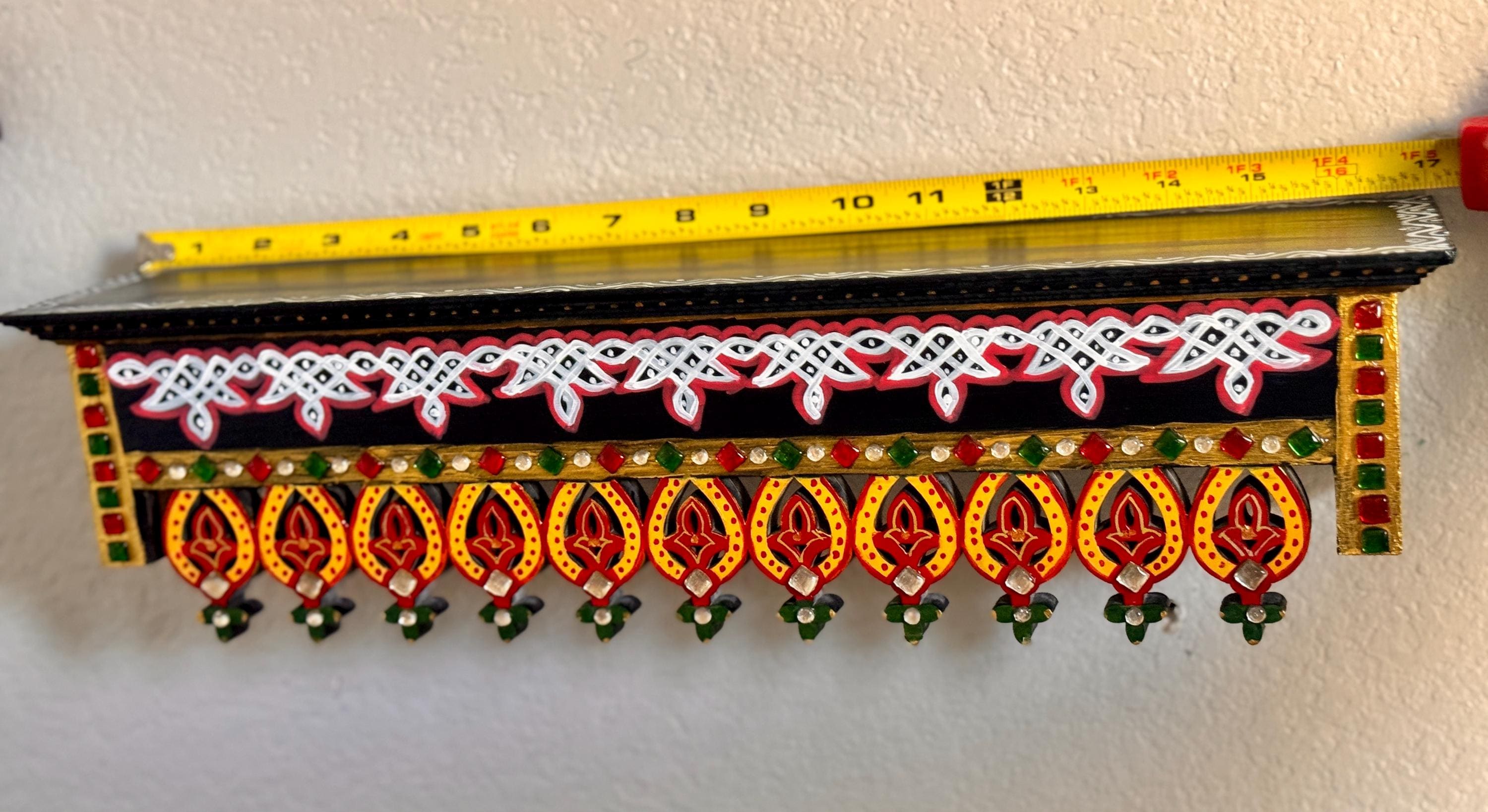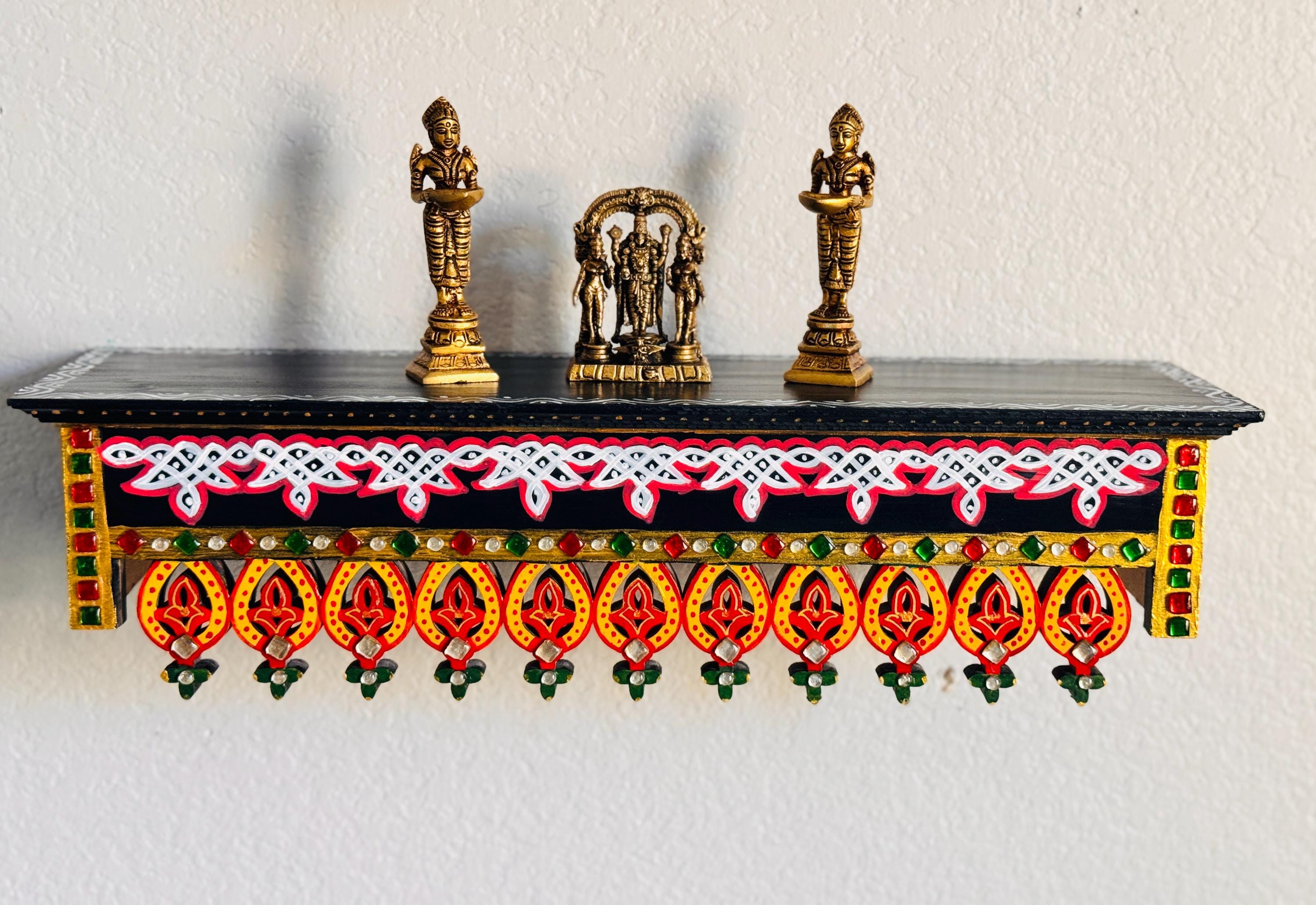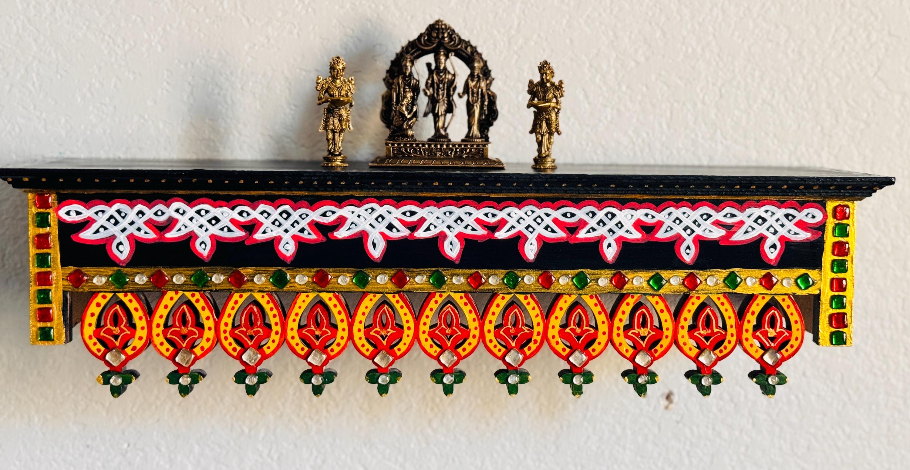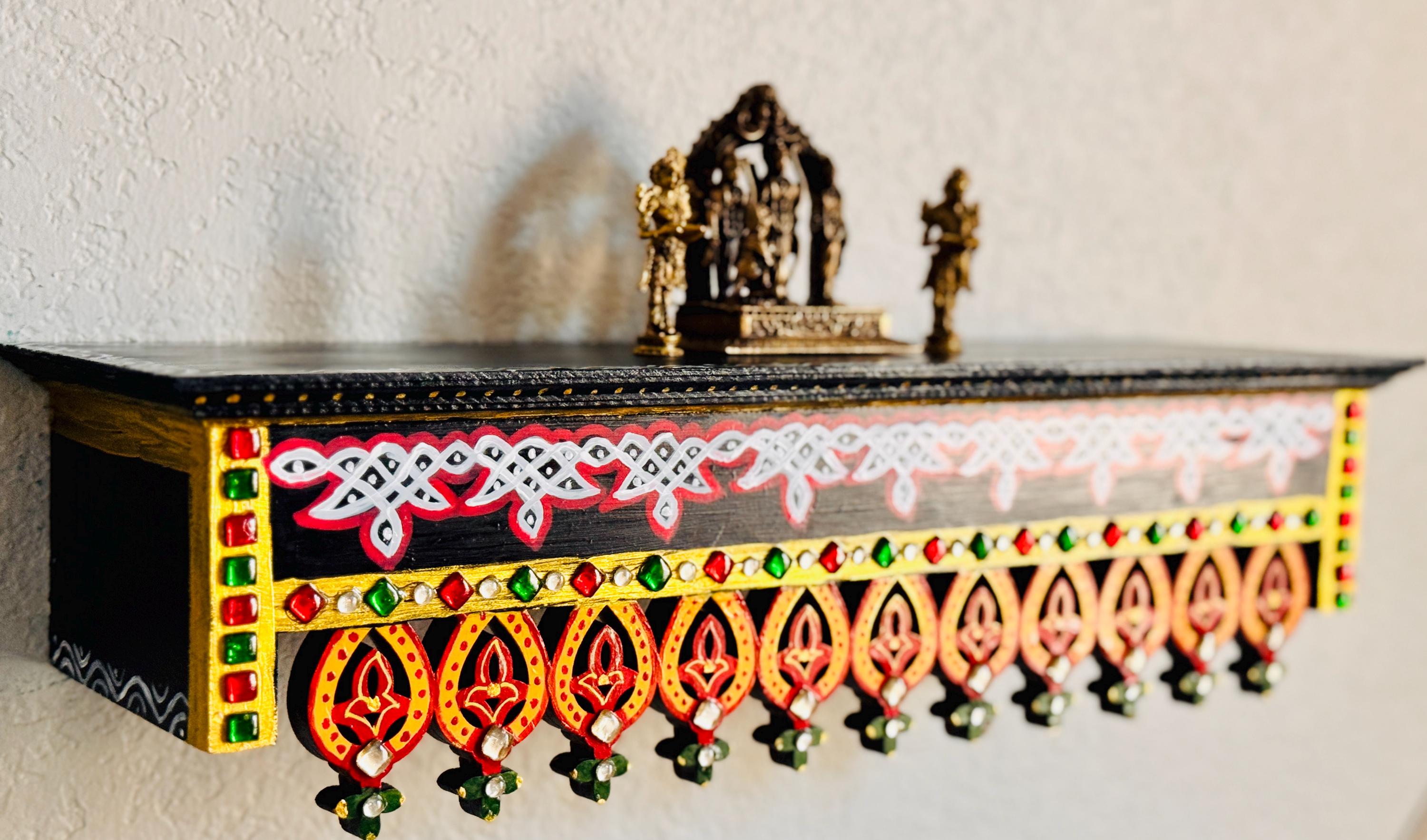 A very unique, eye catching floating shelf for your home/gifting. Handcrafted, pinewood creation - embellished with Tanjore stones (in select models) for showcasing figurines, idols, Diyas, collectibles, artefacts and more! Perfect for those who love handcrafted finish in wood shelves/traditional patterns.