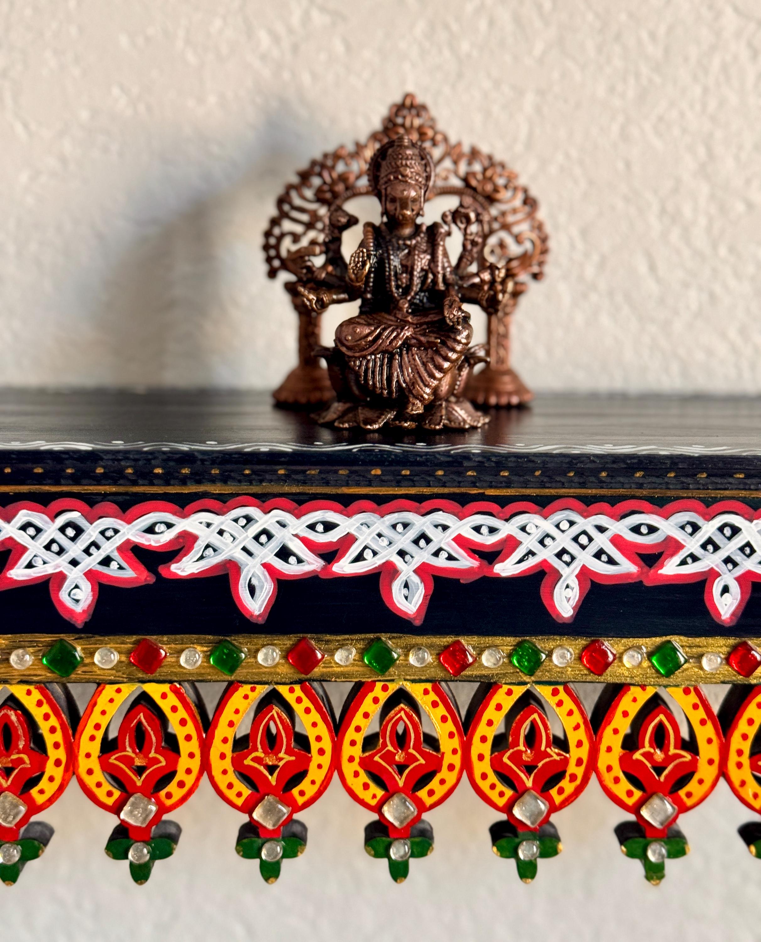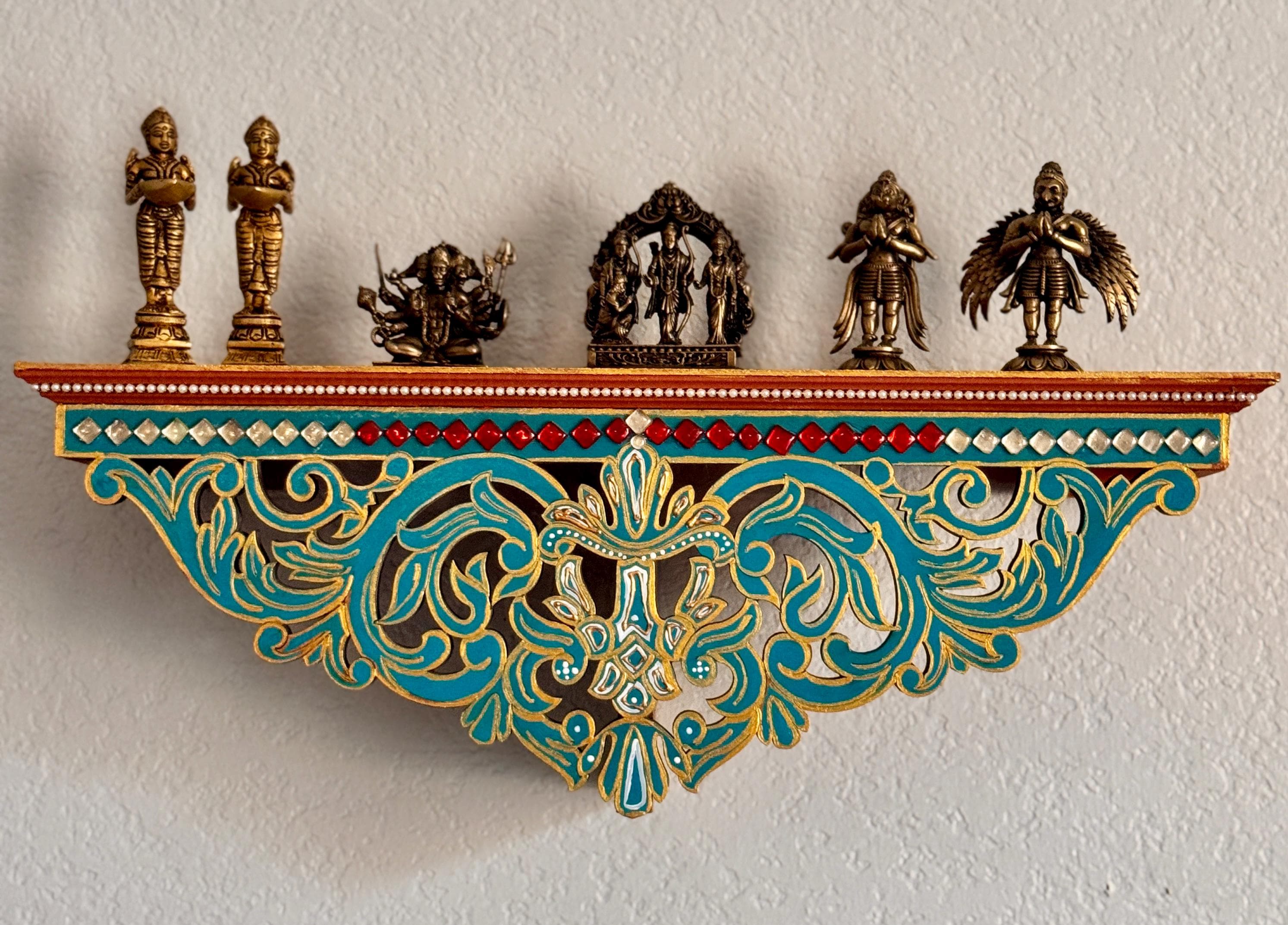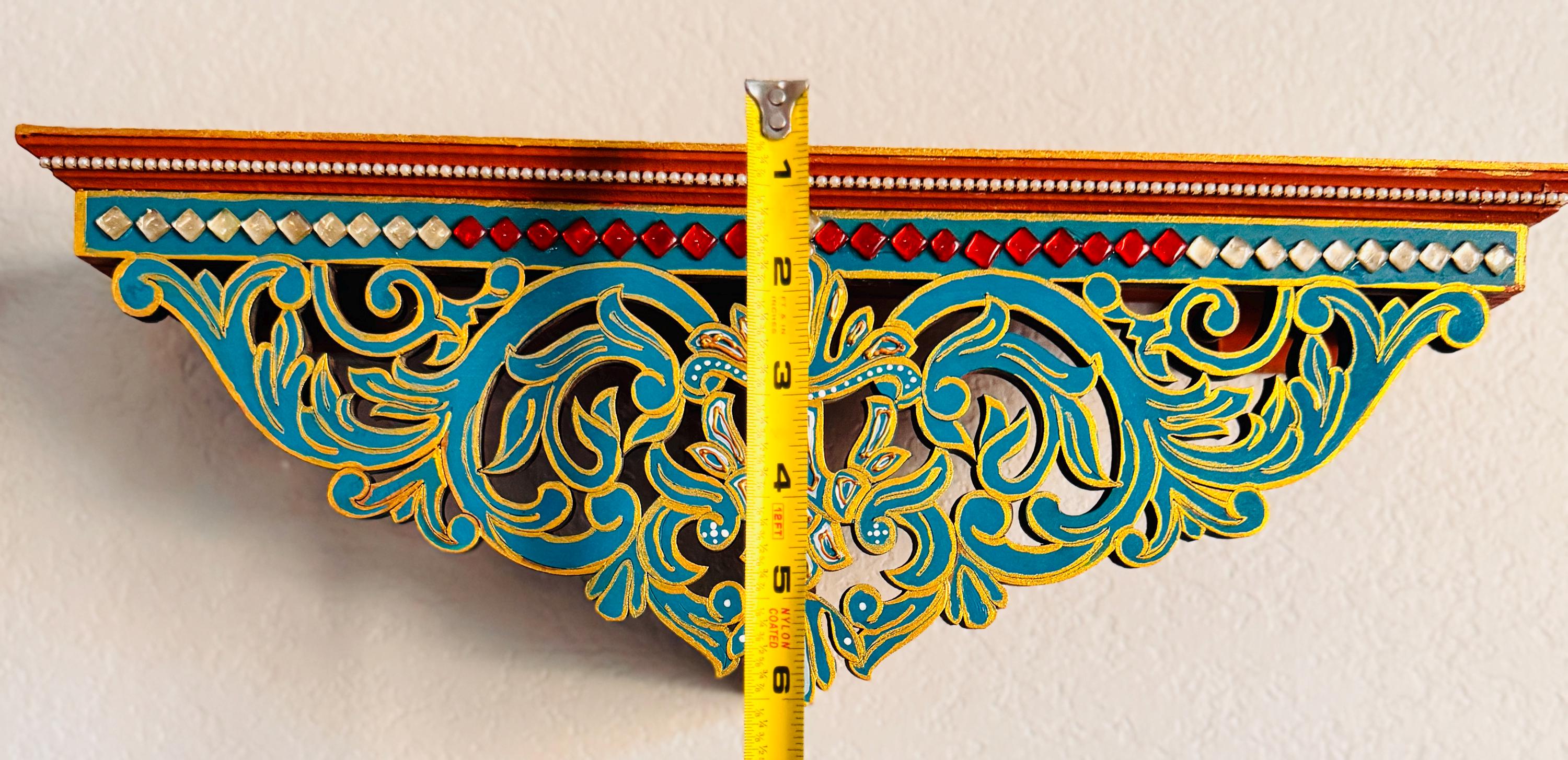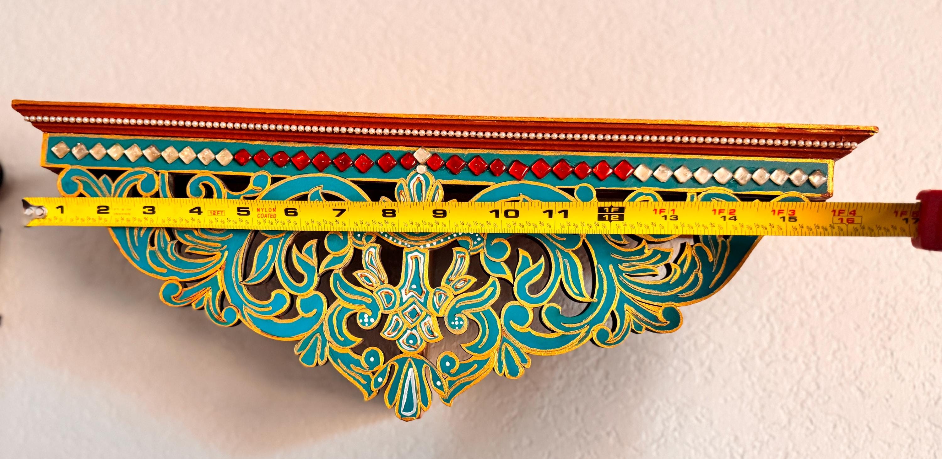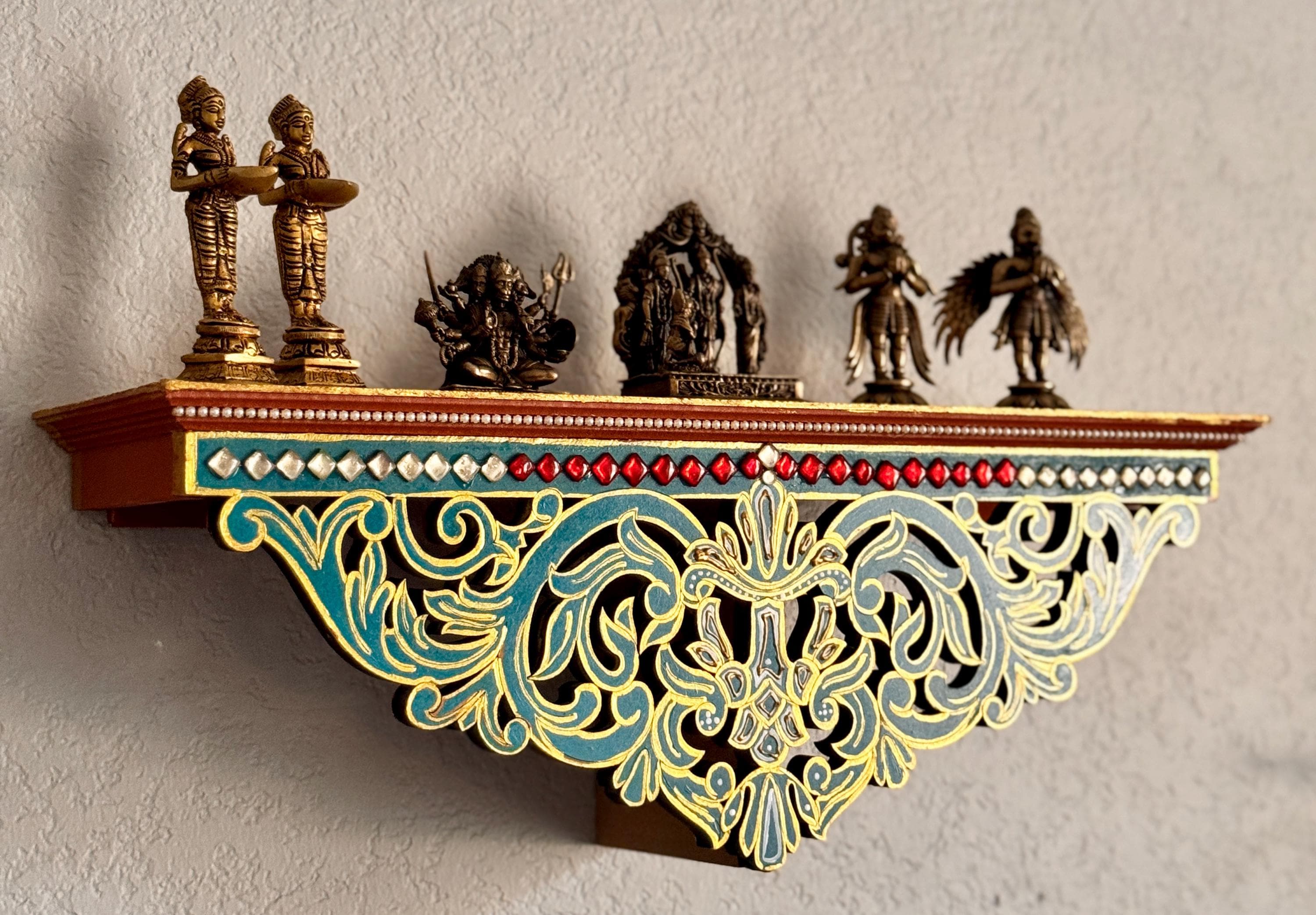 A very unique, eye catching floating shelf for your home/gifting. Handcrafted, pinewood creation - embellished with Tanjore stones (in select models) for showcasing figurines, idols, Diyas, collectibles, artefacts and more! Perfect for those who love handcrafted finish in wood shelves/traditional patterns.
