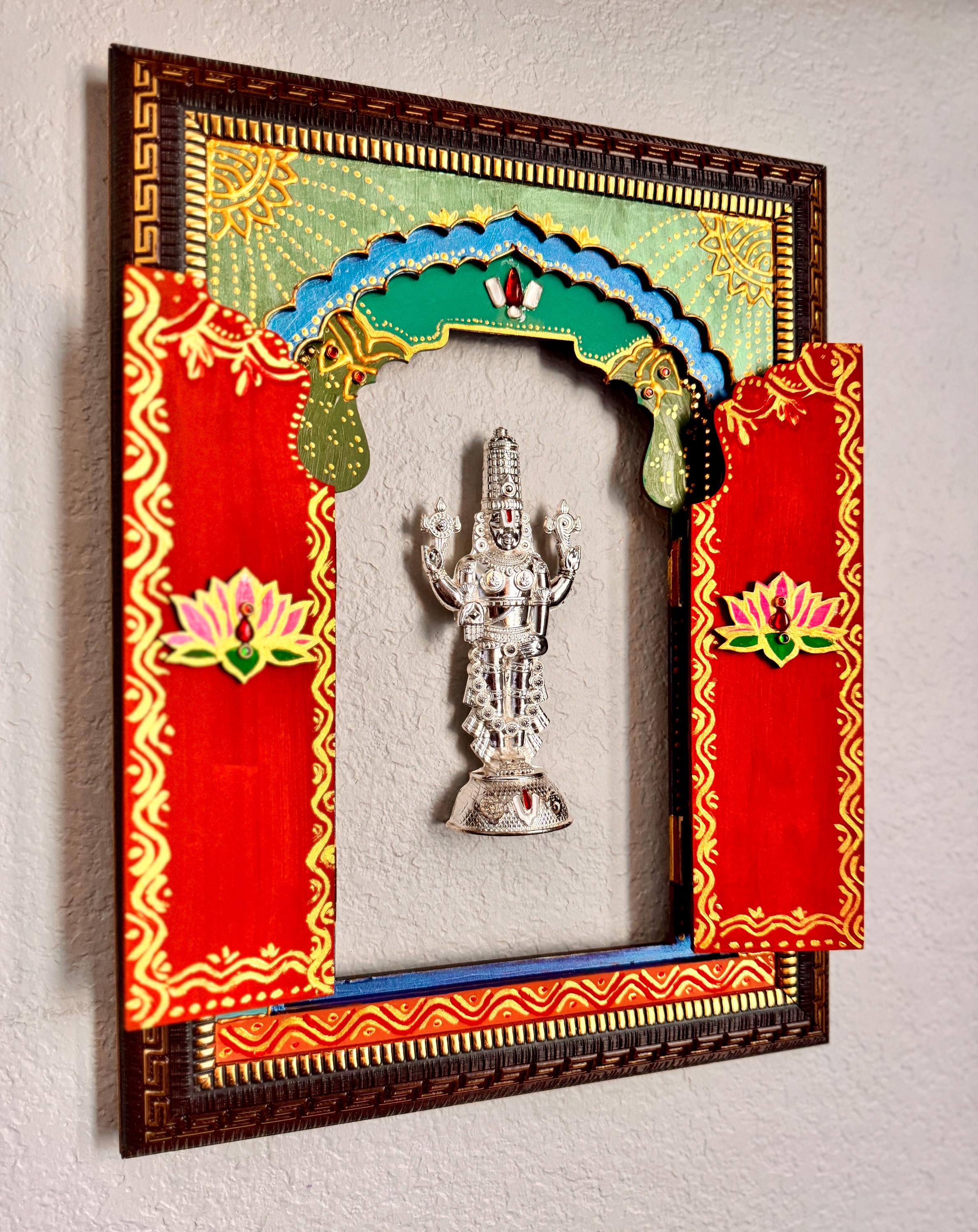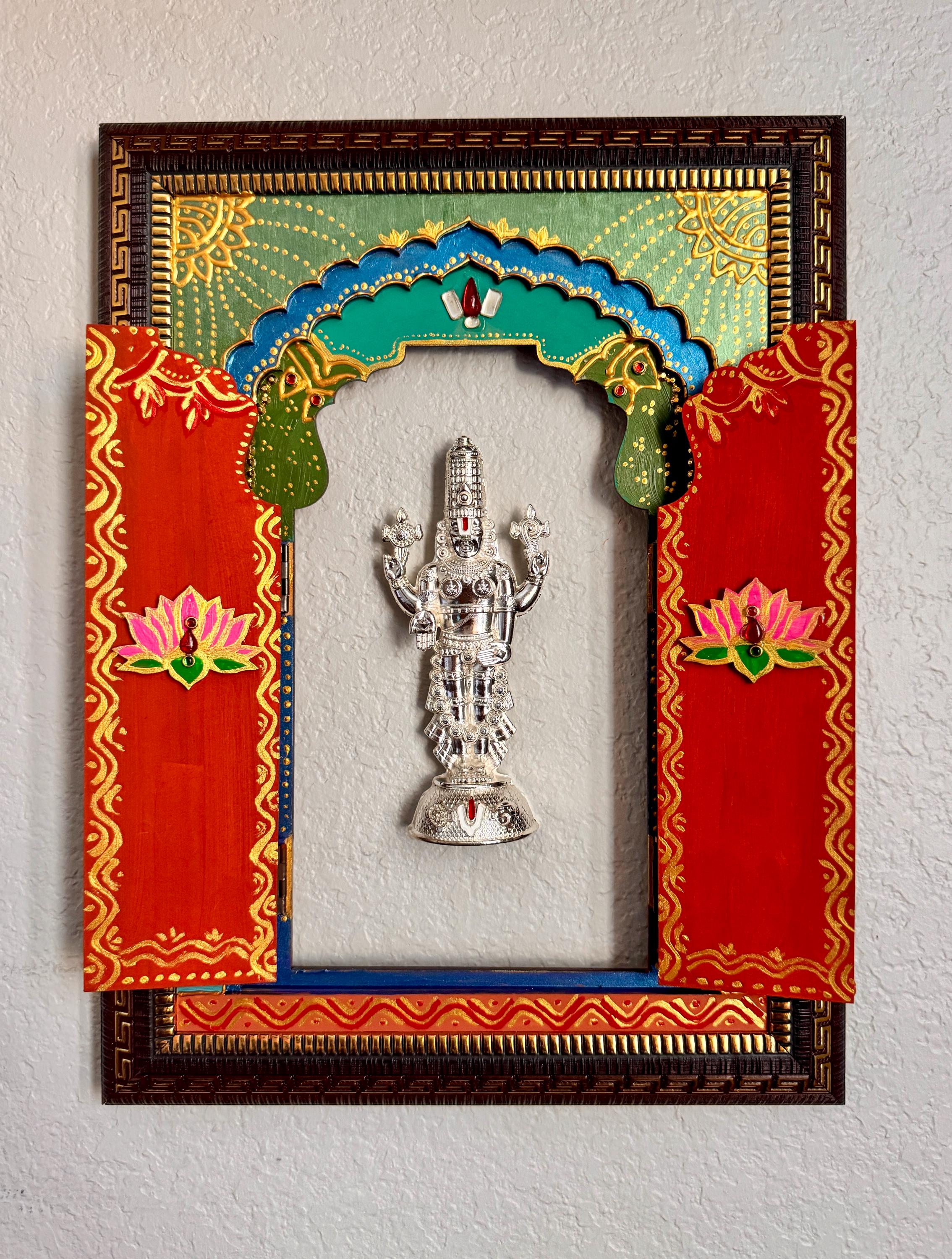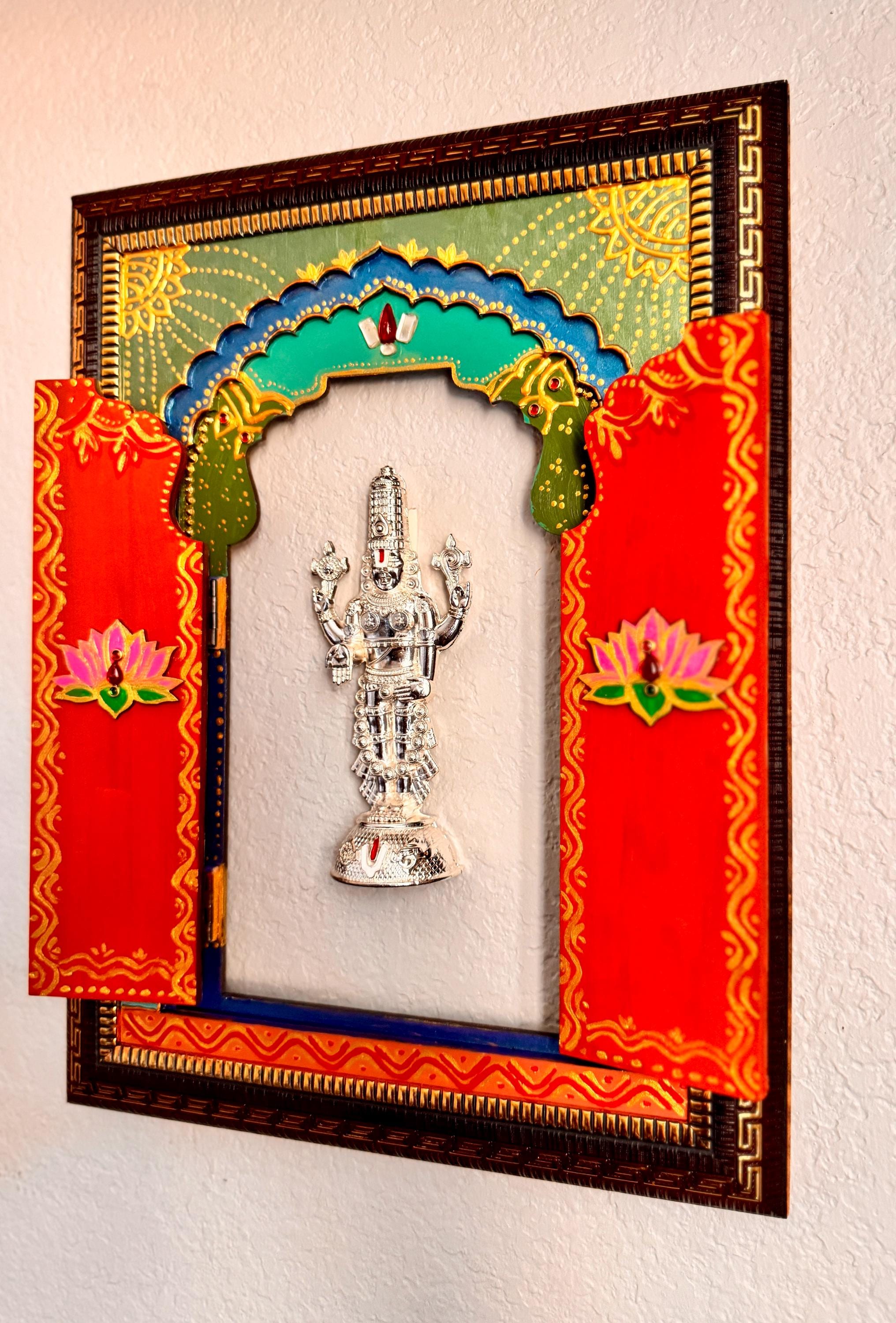Original, handcrafted wood frame with premium stonework and accents for your home/puja/altar. Perfect for those who love handcrafted finish in traditional patterns for idols/figurines. Each accent, color, design and pattern is carefully curated to bring a touch of royal beauty and grace to your home decor.