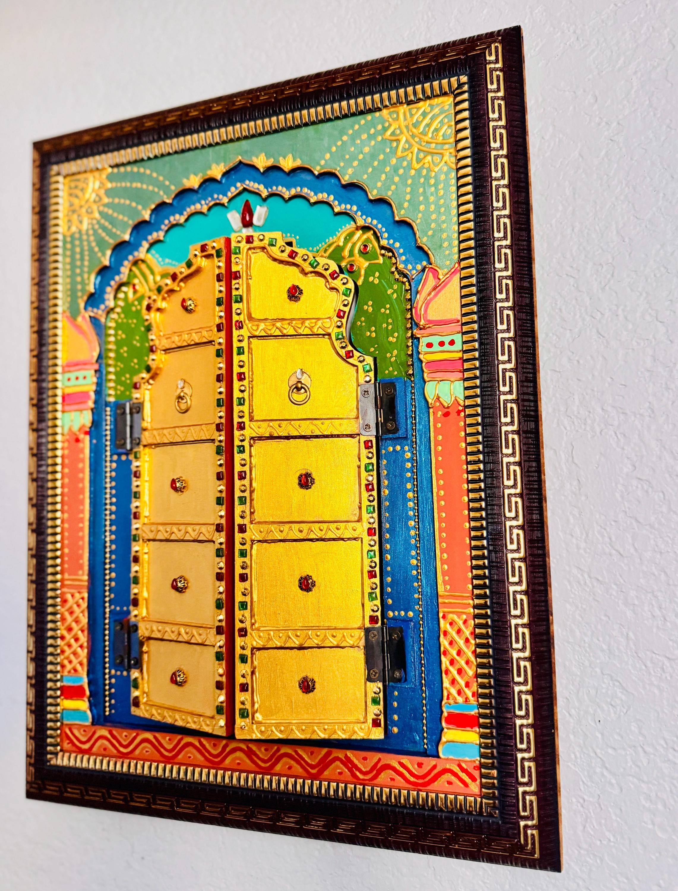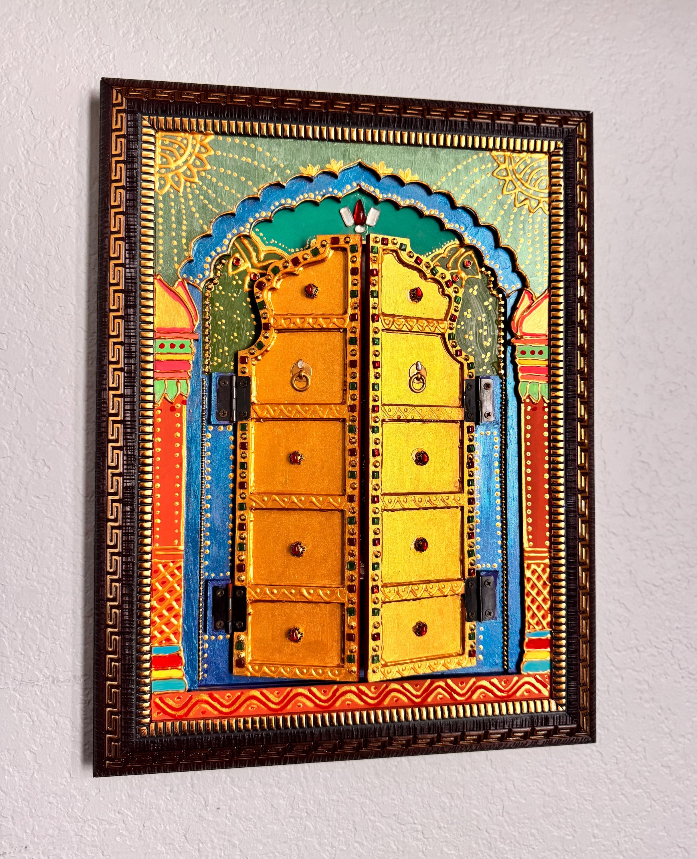 The theme is inspired by Gopuram/Dwarams/Gate in temples - a traditional yet elegant finish to vibe with your home decor. One of a kind, hand carved and hand painted.