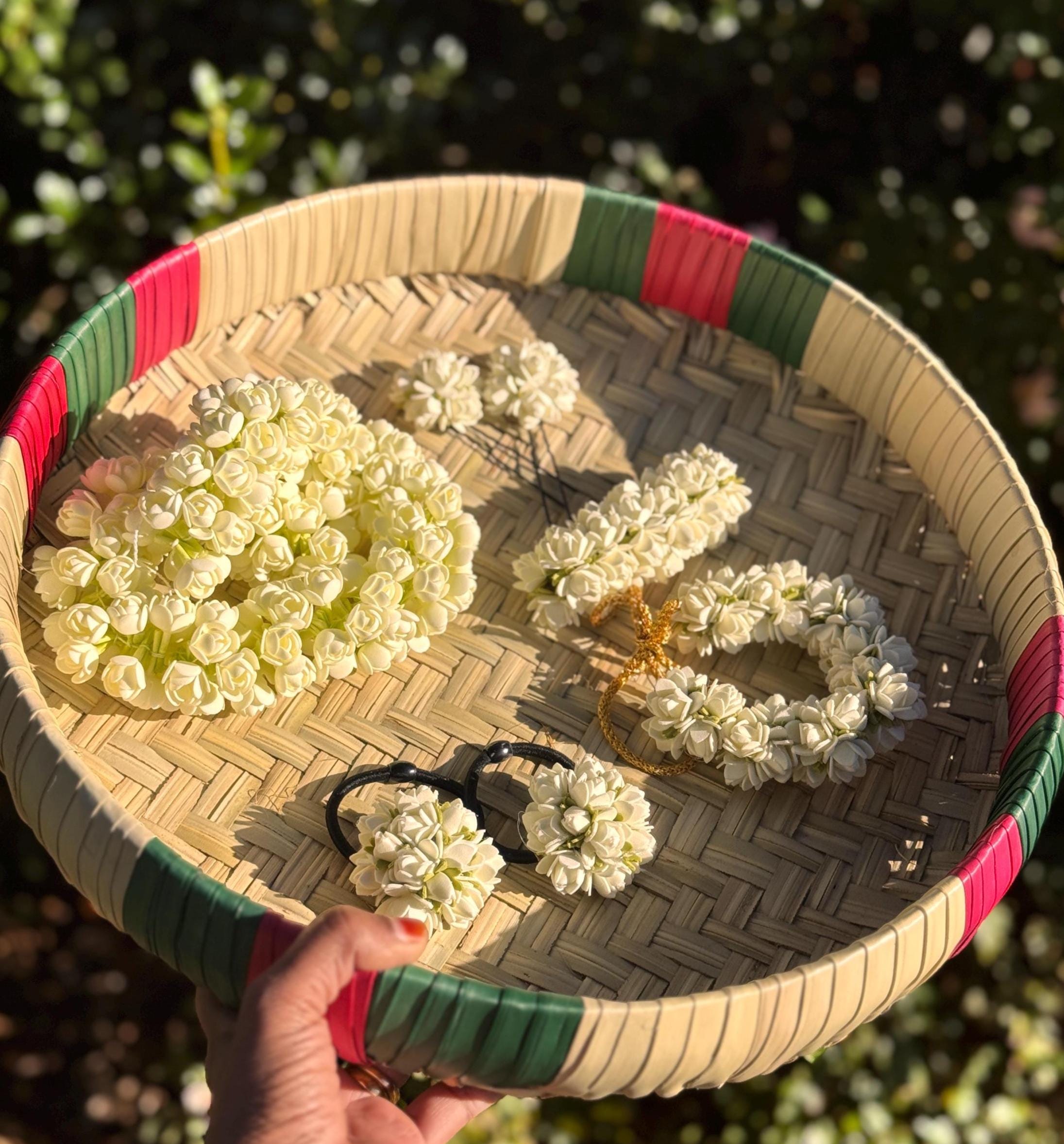 Option 2:6 items in a package 1) Jaathmalli/Poet's Jasmine flower String, measuring 16 inches (ONE STRING). Please choose between BLOOMED string or. BUD string DURING CHECKOUT. 2) Jaathmalli/Poet's Jasmine U pin: 2 numbers 3) Jaathimalli Jasmine hair tie: 2 numbers 4) Jaathmalli Jasmine Veni: 1 number