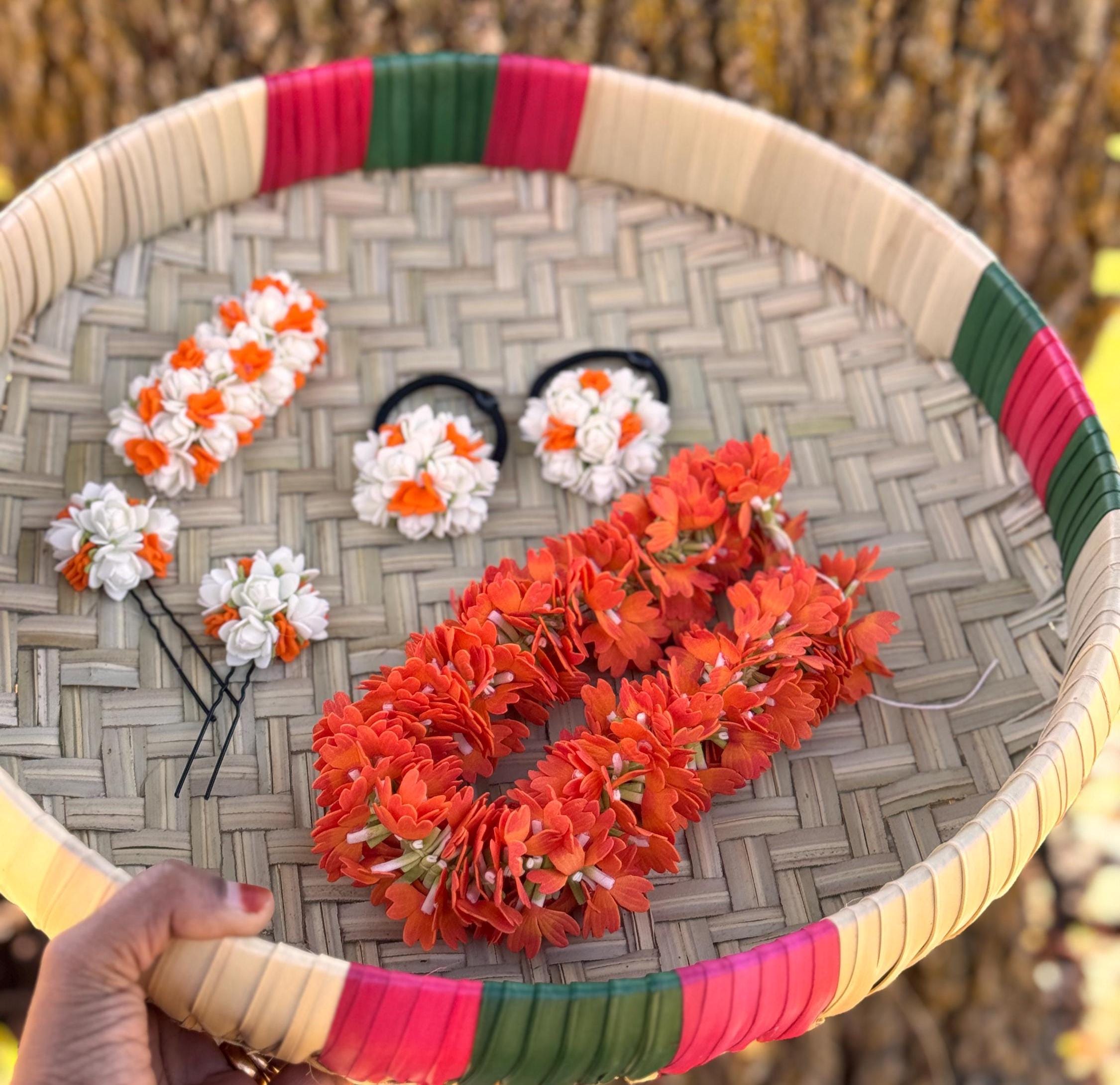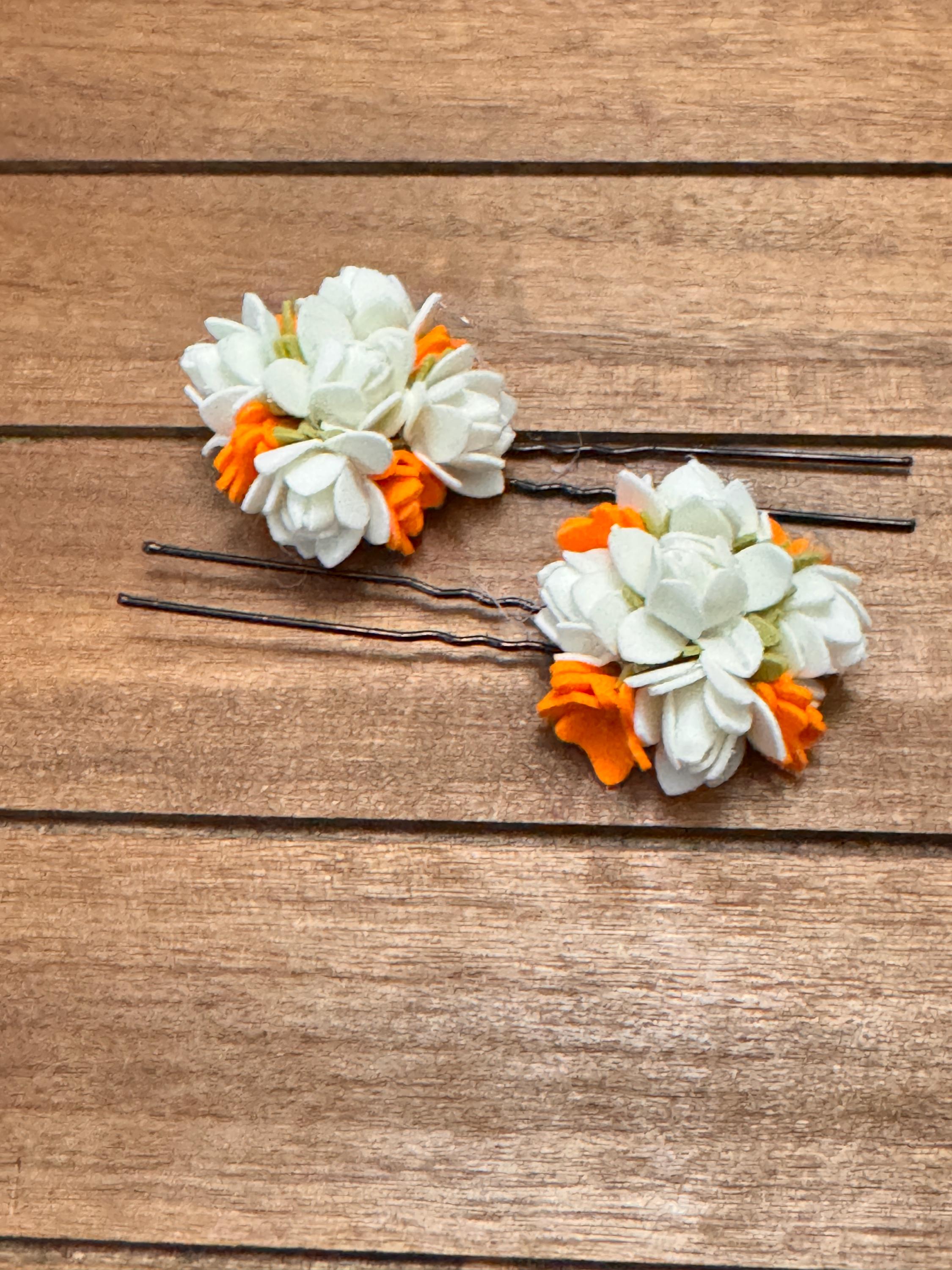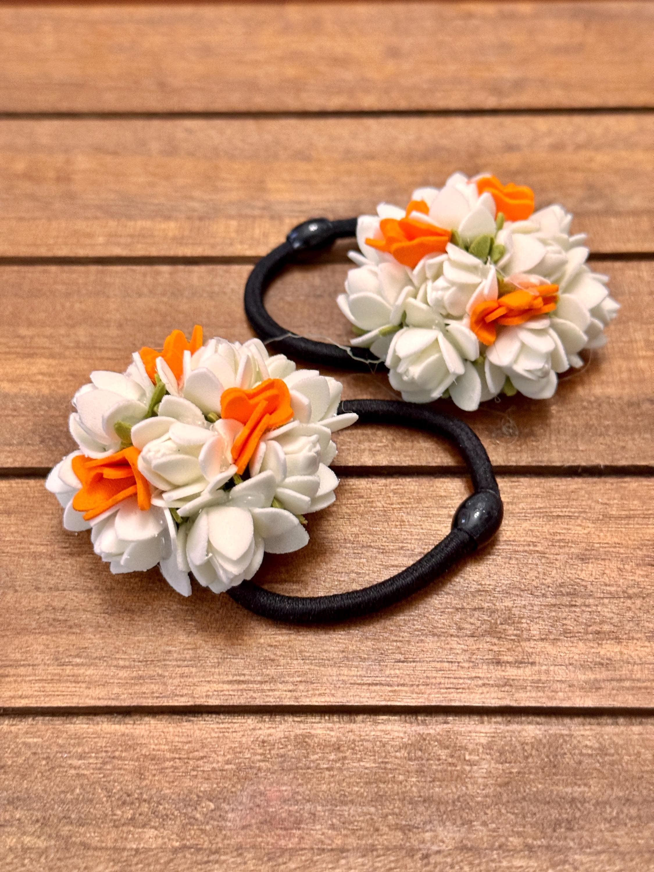 You will be amazed at the beautiful, bloomed flowers strung together that is so realistic. Experience the delicate beauty of our very beautiful jasmine/kanakambaram(crossandra) combo 1: What you will receive: 1) Kanakambaram flower String, measuring 16 inches (ONE STRING). 2) White n Orange U pin: 2 numbers 3) White n Orange hair tie: 2 numbers 4) Center Clip: 1 number Expertly crafted to mimic natural flowers/buds, this string adds an authentic touch to your décor or traditional attire.
