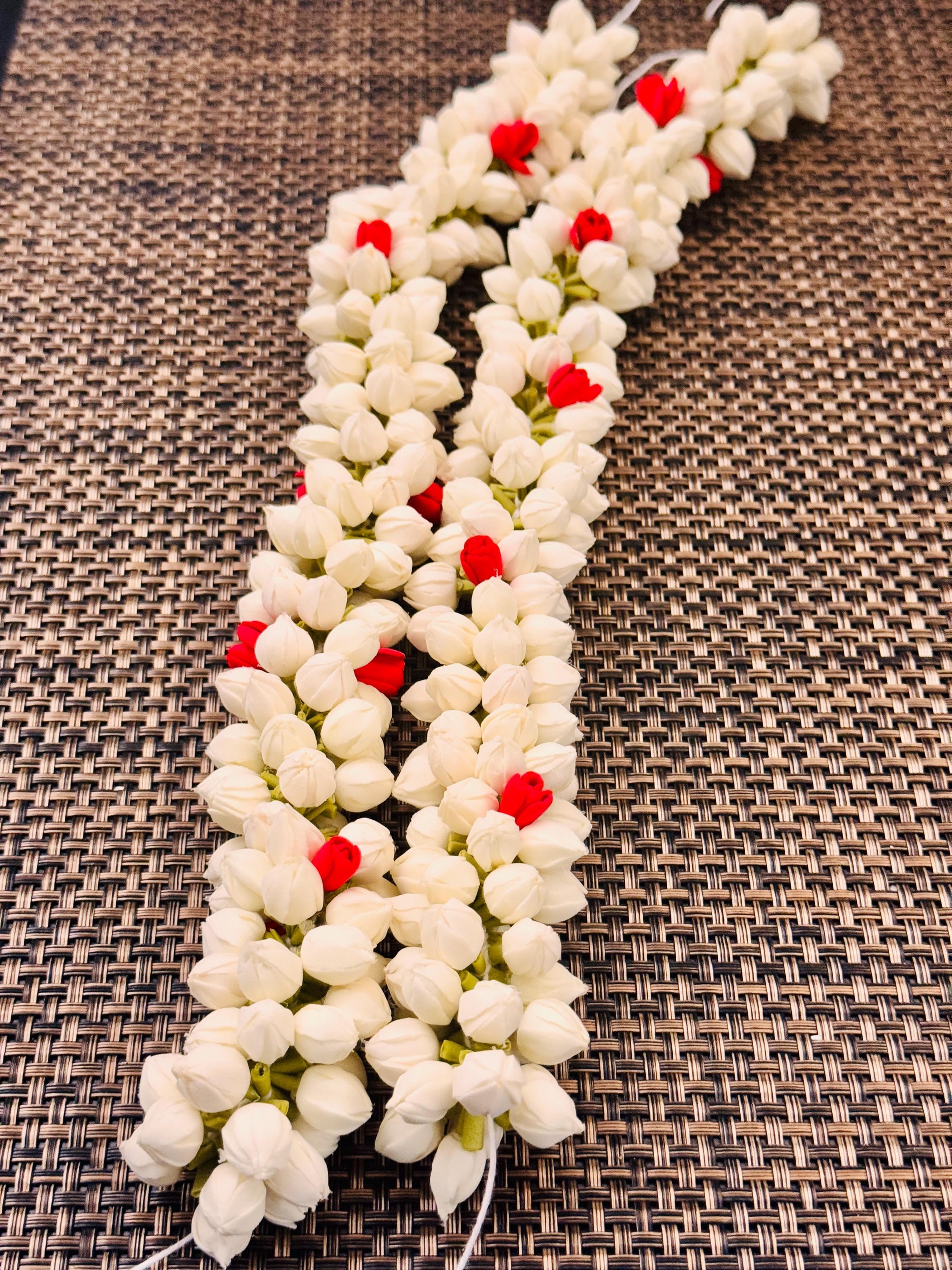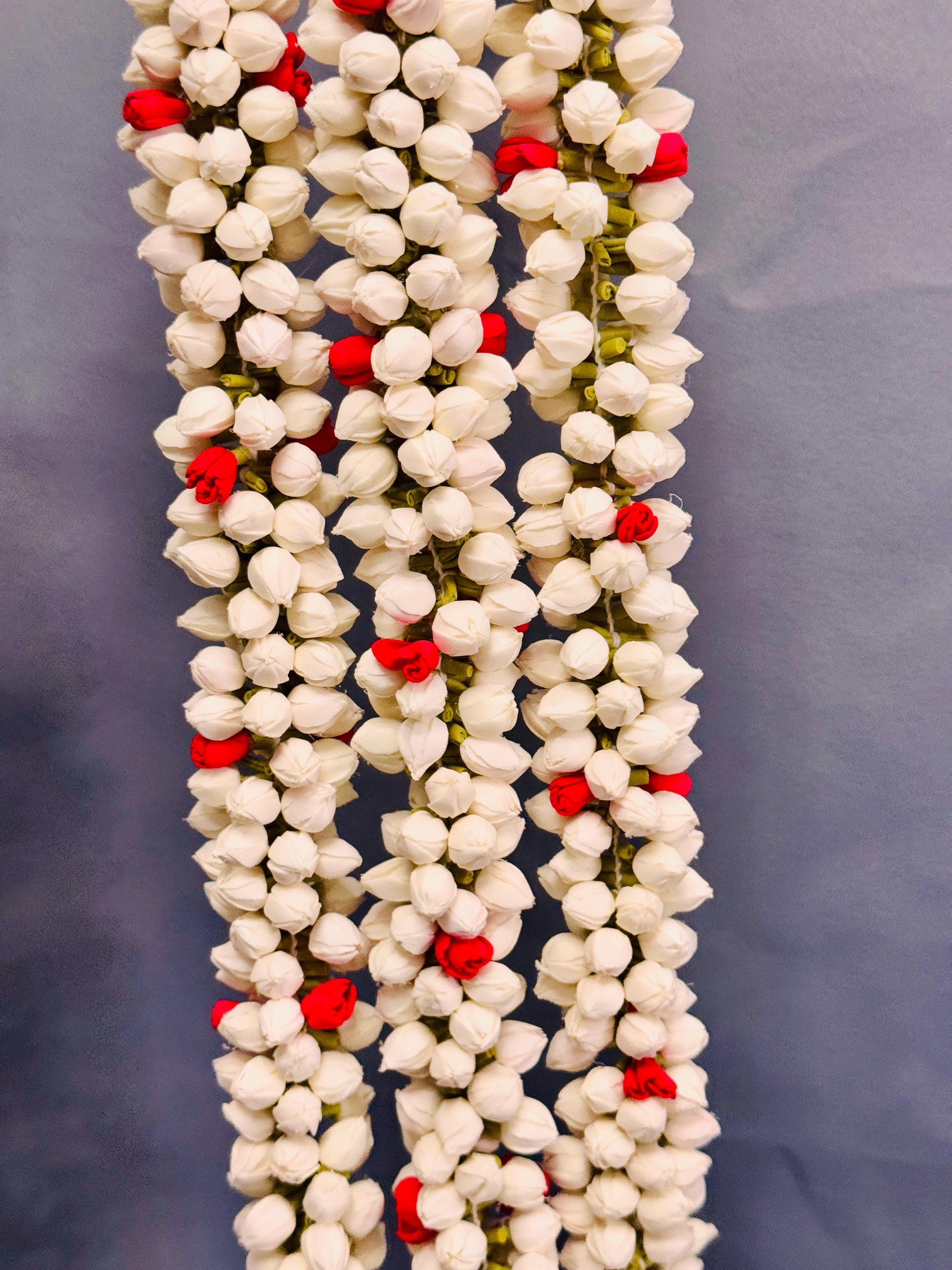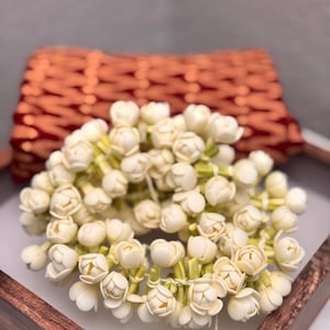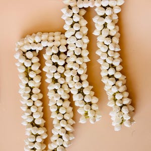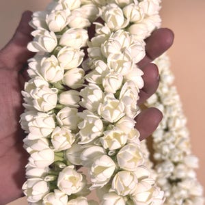 You will be amazed at the beautiful, buds/flowers strung together that is so realistic. Experience the delicate beauty of our realistic Handmade Bloomed Buds Jasmine String, measuring 16 inches (ONE STRING). Expertly handcrafted to mimic natural jasmine flowers, this string adds an authentic touch to outfits/ photo shoot/festivals/ bridal makeup/ weddings and more!
