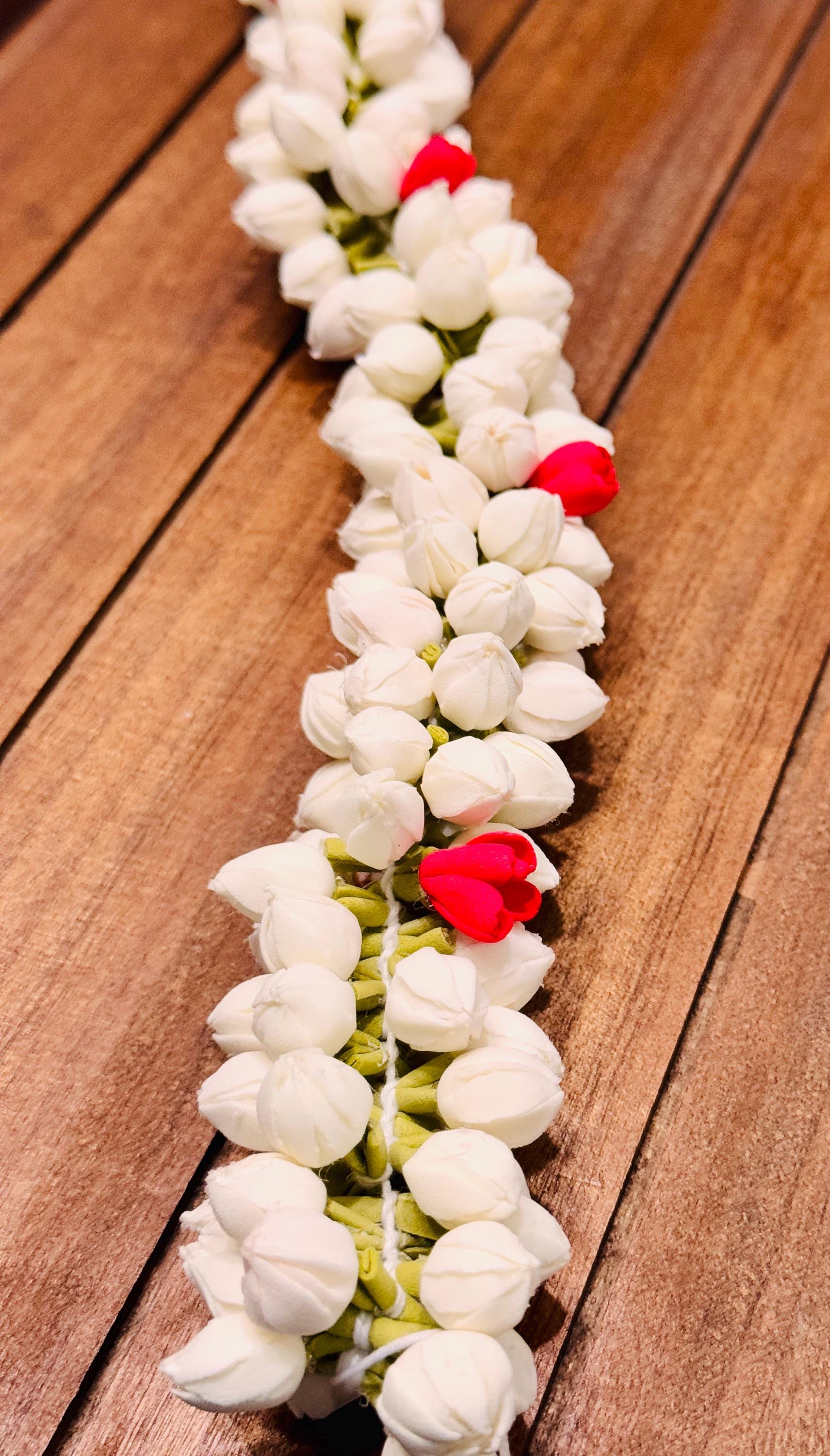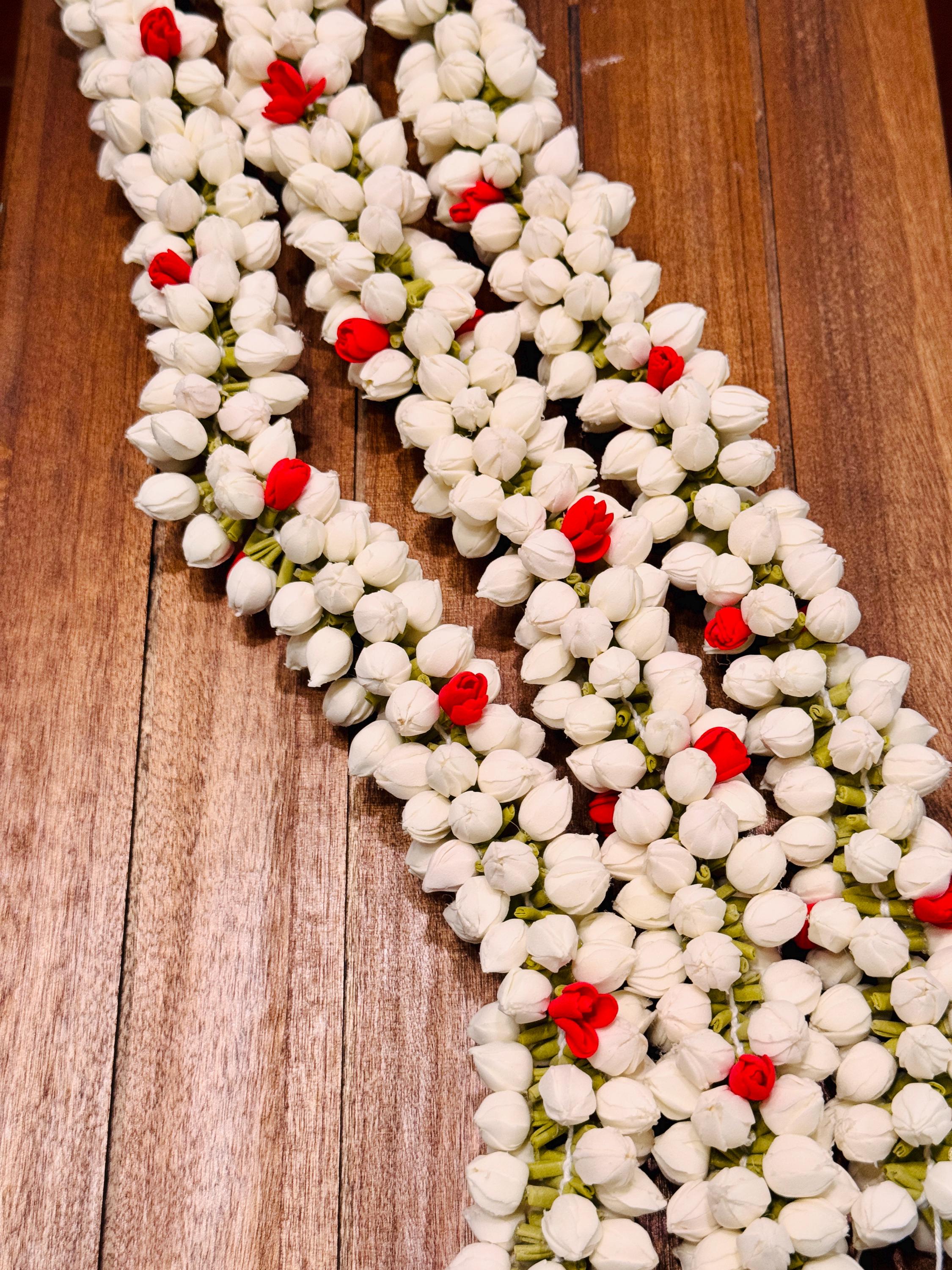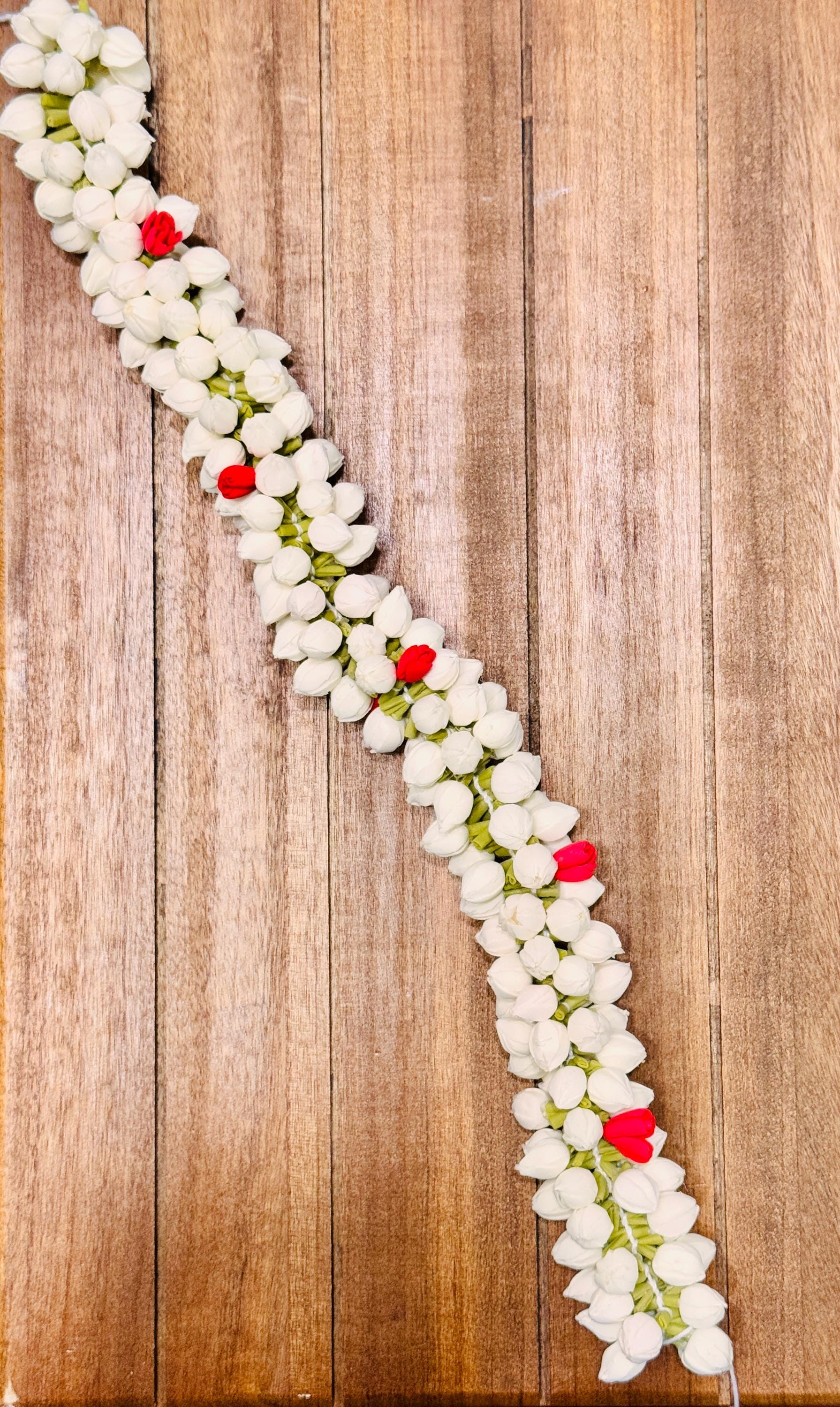 You will be amazed at the beautiful, buds/flowers strung together that is so realistic. Experience the delicate beauty of our realistic Handmade Bloomed Buds Jasmine String, measuring 16 inches (ONE STRING). Expertly handcrafted to mimic natural jasmine flowers, this string adds an authentic touch to outfits/ photo shoot/festivals/ bridal makeup/ weddings and more!