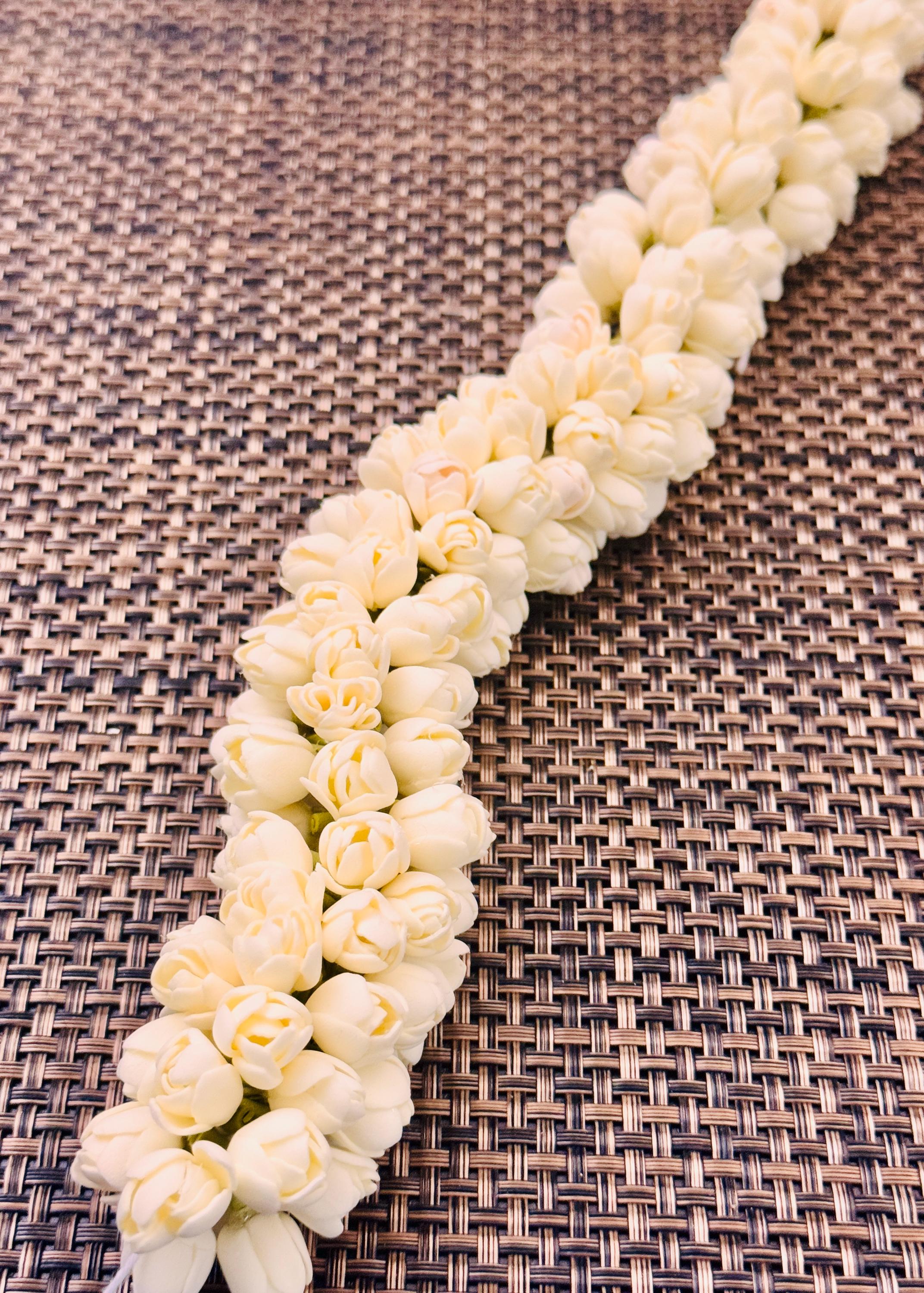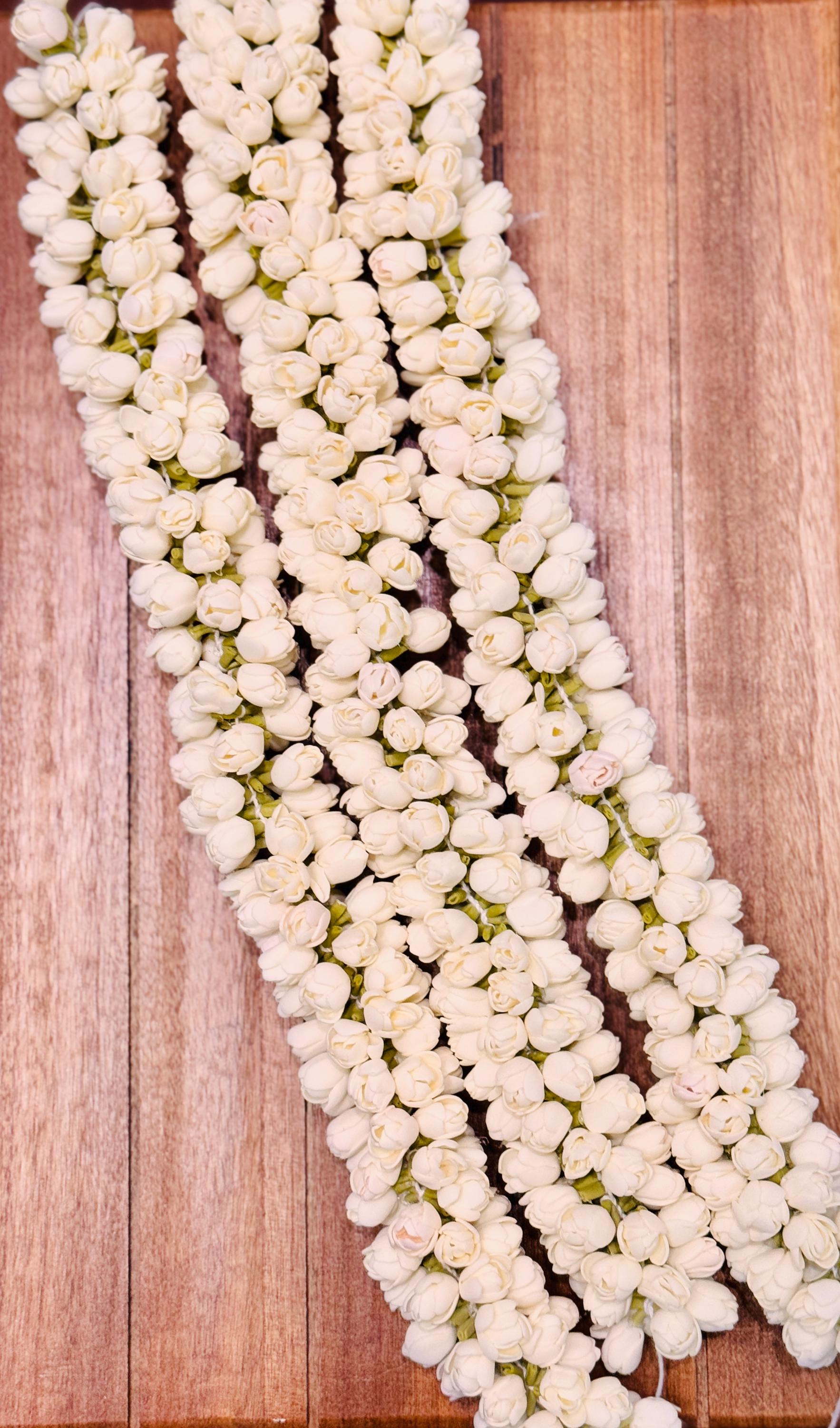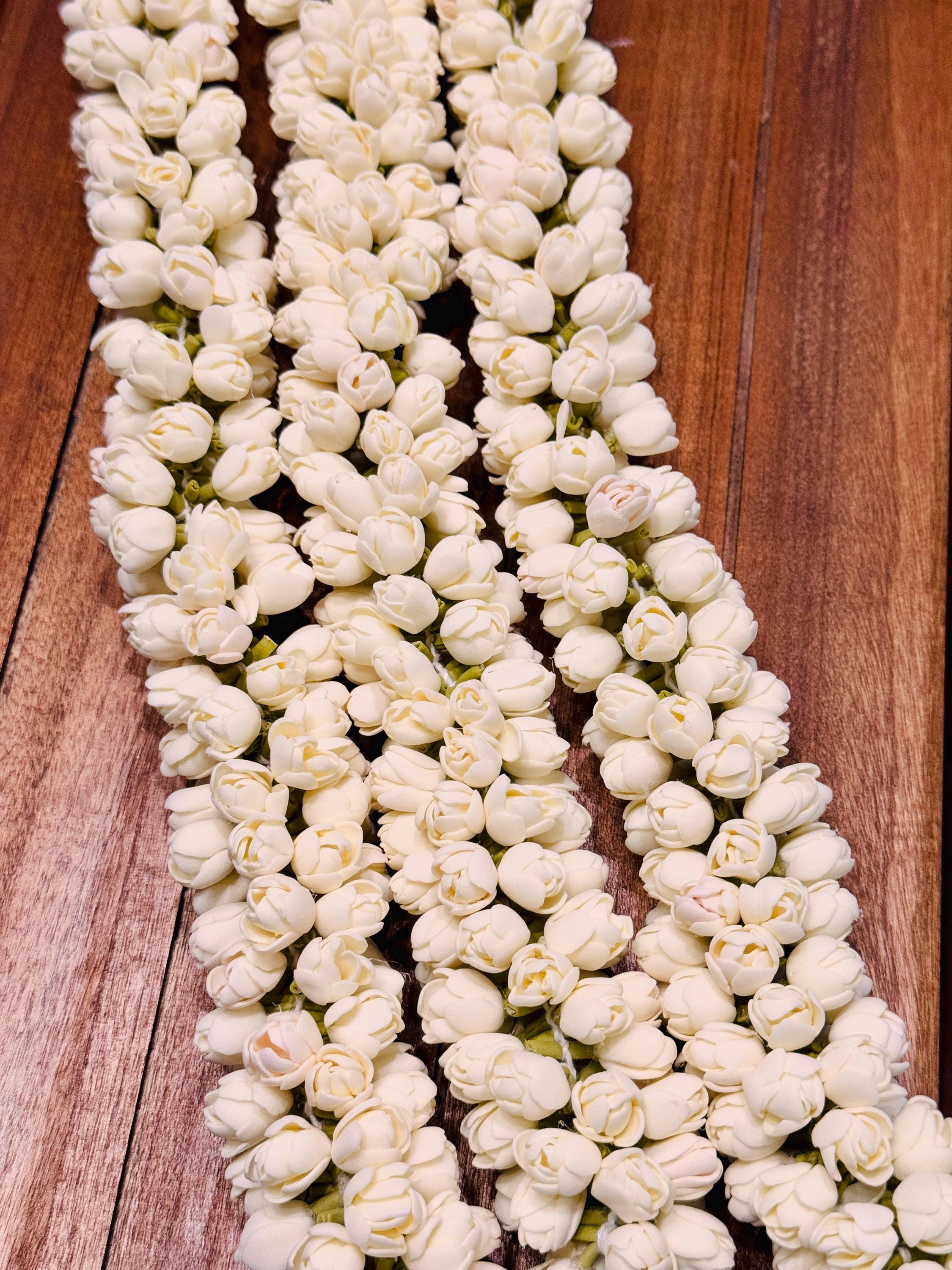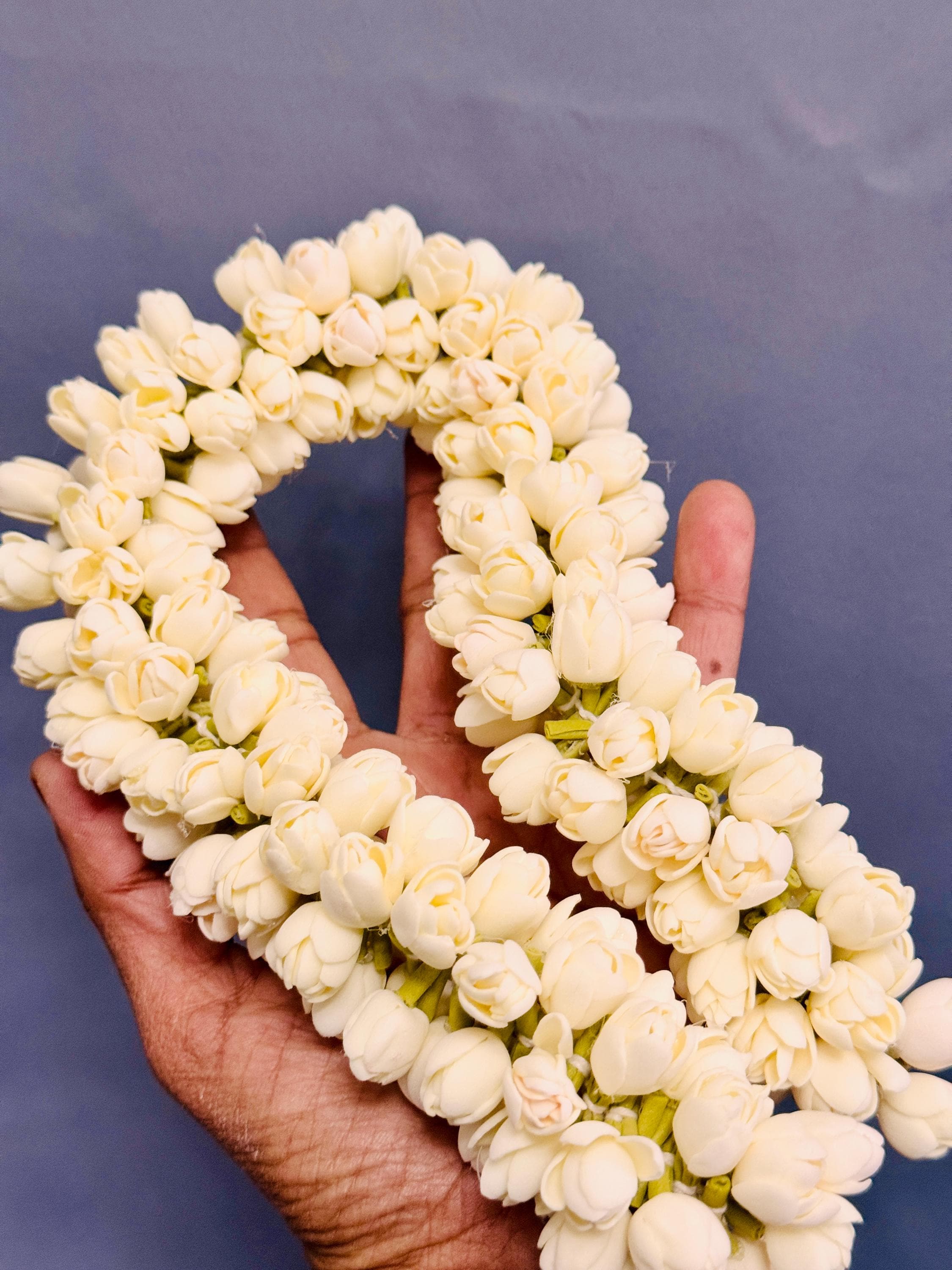 You will be amazed at the beautiful, bloomed buds strung together that is so realistic. Experience the delicate beauty of our handmade Bloomed Buds Jasmine String, measuring 16 inches (ONE STRING). Expertly handcrafted to mimic natural jasmine flowers, this string adds an authentic touch to your outfits- be it a photoshoot/ weddings/ special occasions and more!