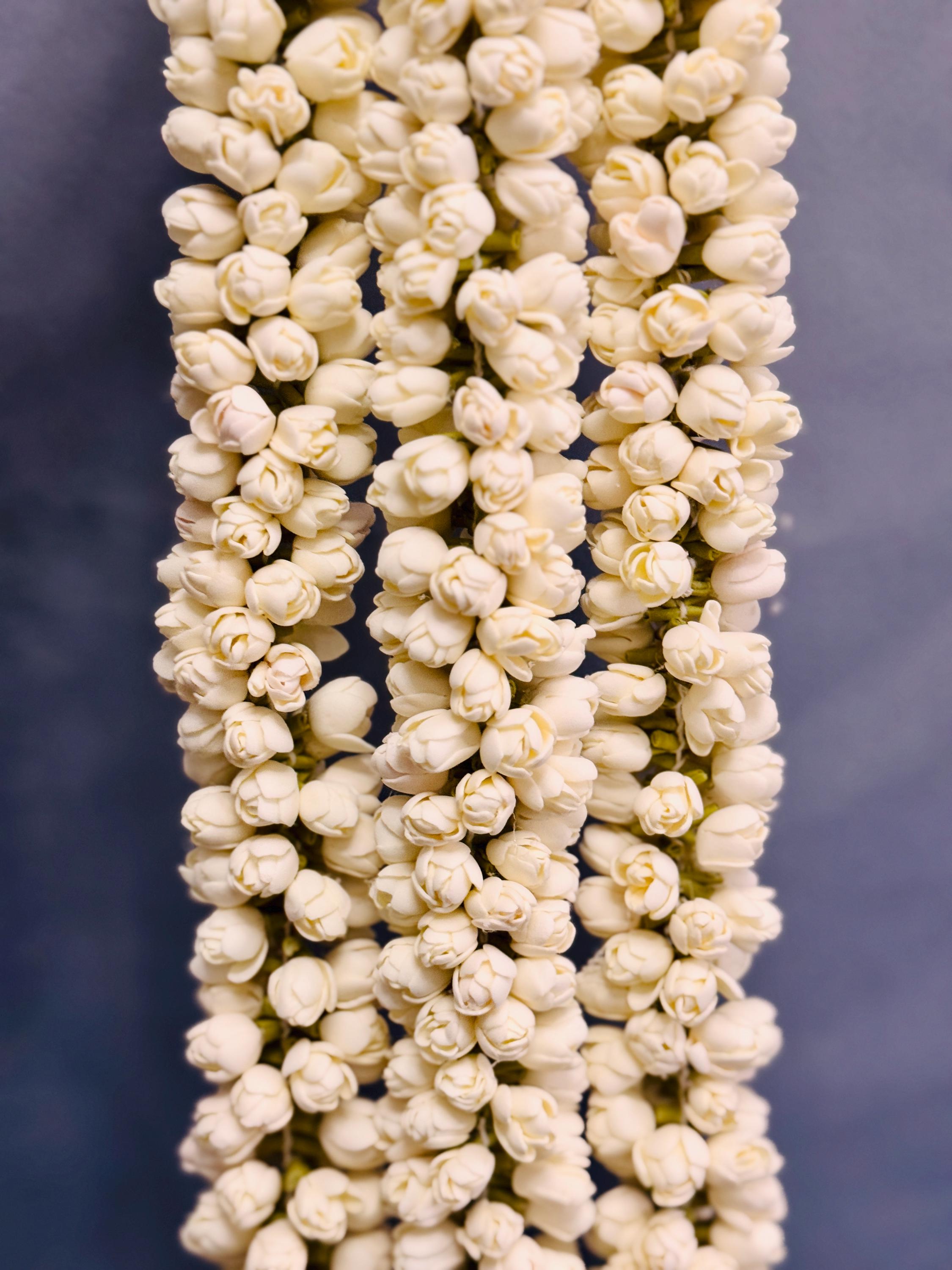 We have newly launched the bloomed bud Jasmine variety - which is known for its unique stringing method, where the flowers are tied closely without much gap. This presents a much fuller look and is visually appealing though all jasmines have a unique pattern and are beautiful in their own way.