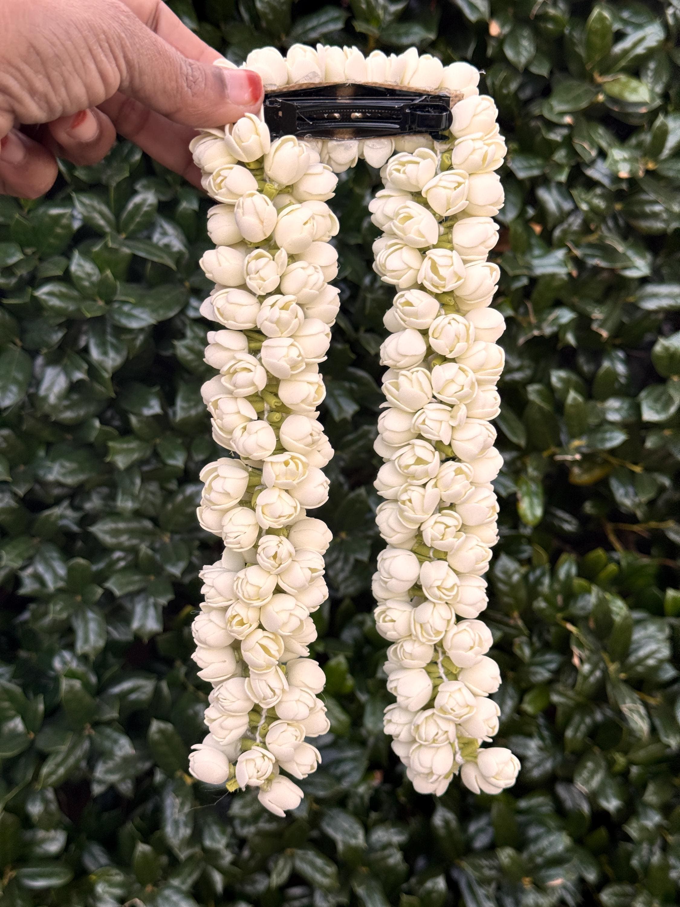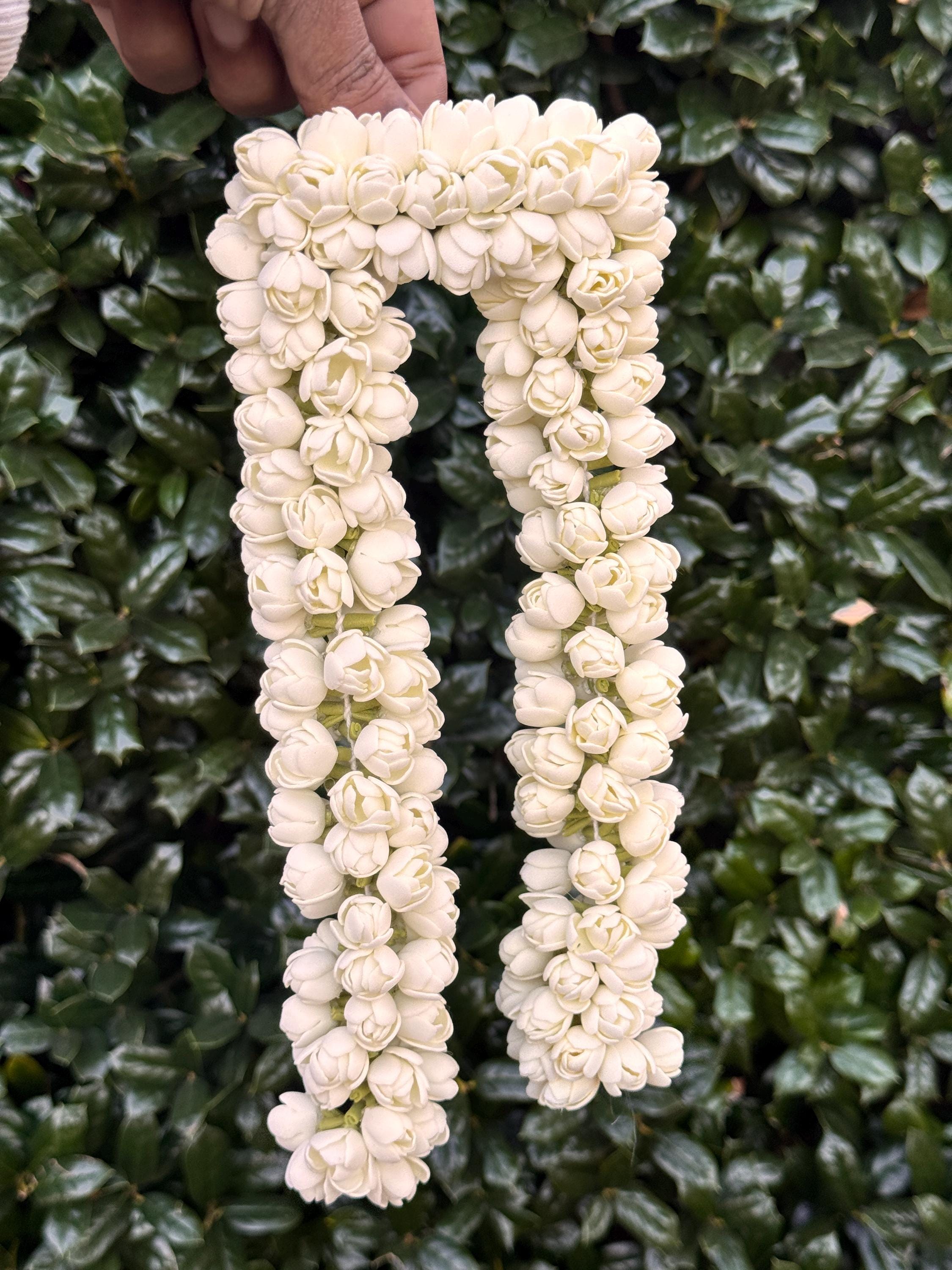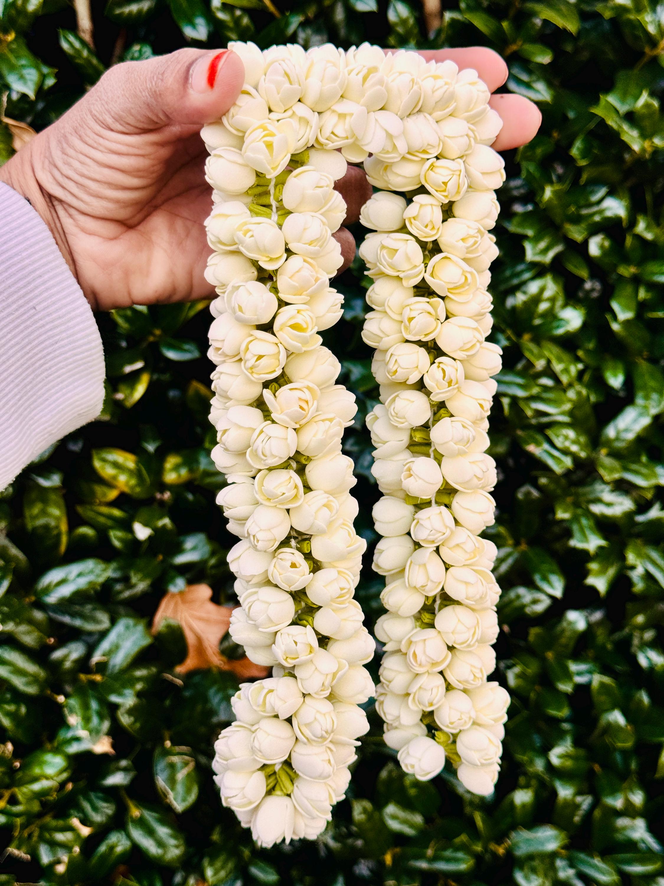 You will be amazed at the beautiful, bloomed buds strung together that is so realistic. Experience the delicate beauty of our handmade Bloomed Buds Jasmine String, measuring 16 inches (ONE STRING). Expertly handcrafted to mimic natural jasmine flowers, this string adds an authentic touch to your outfits- be it a photoshoot/ weddings/ special occasions and more!