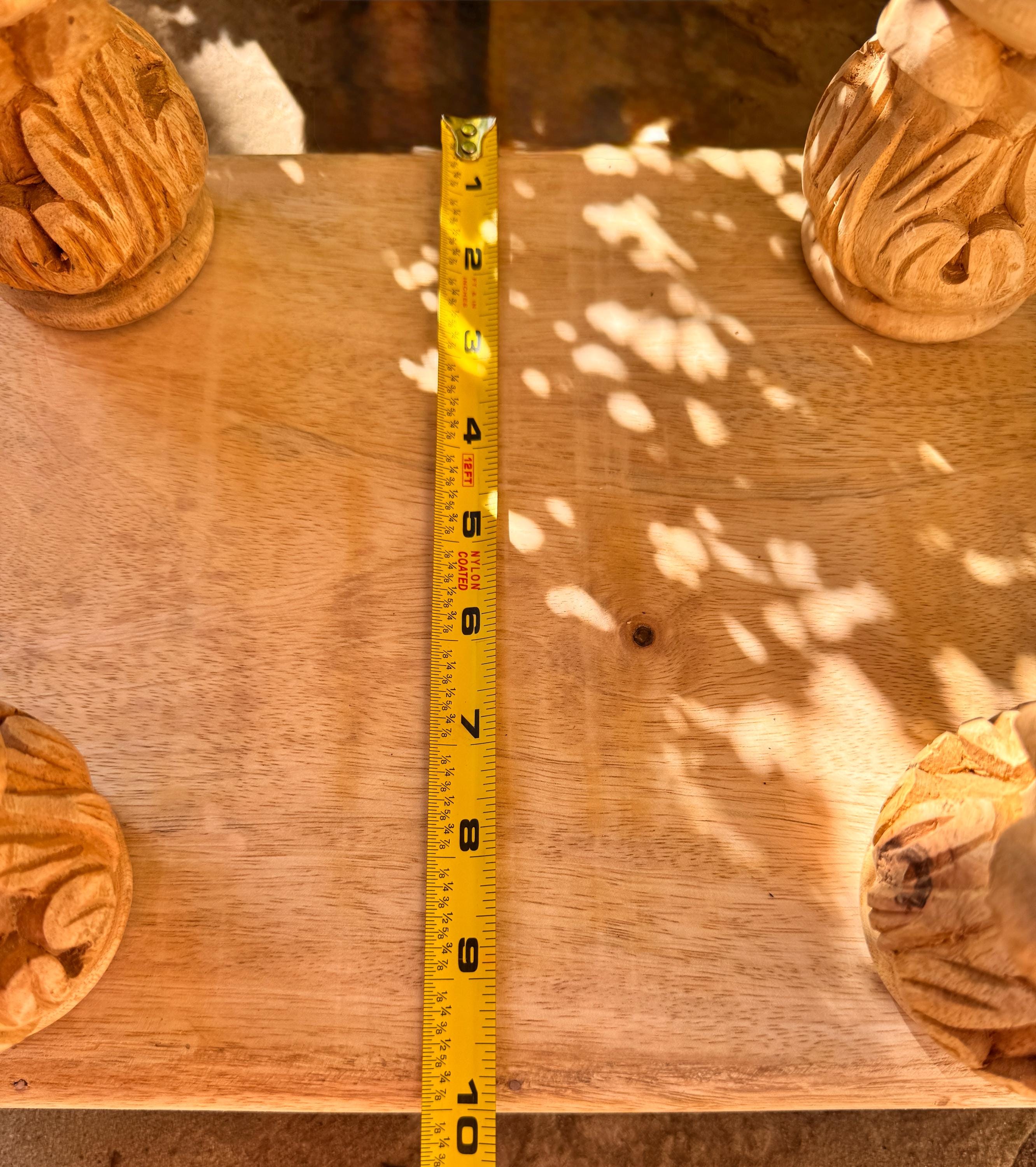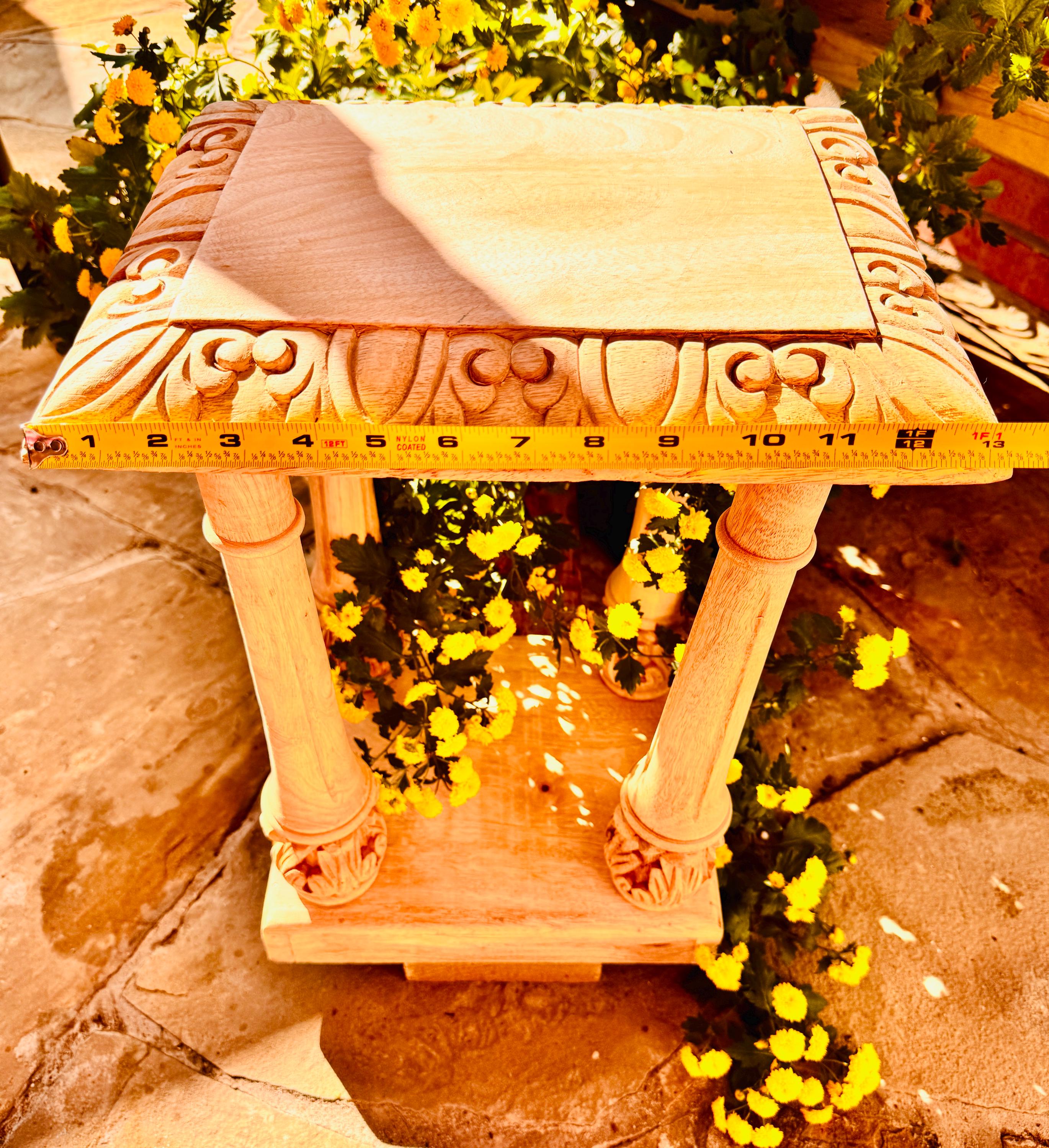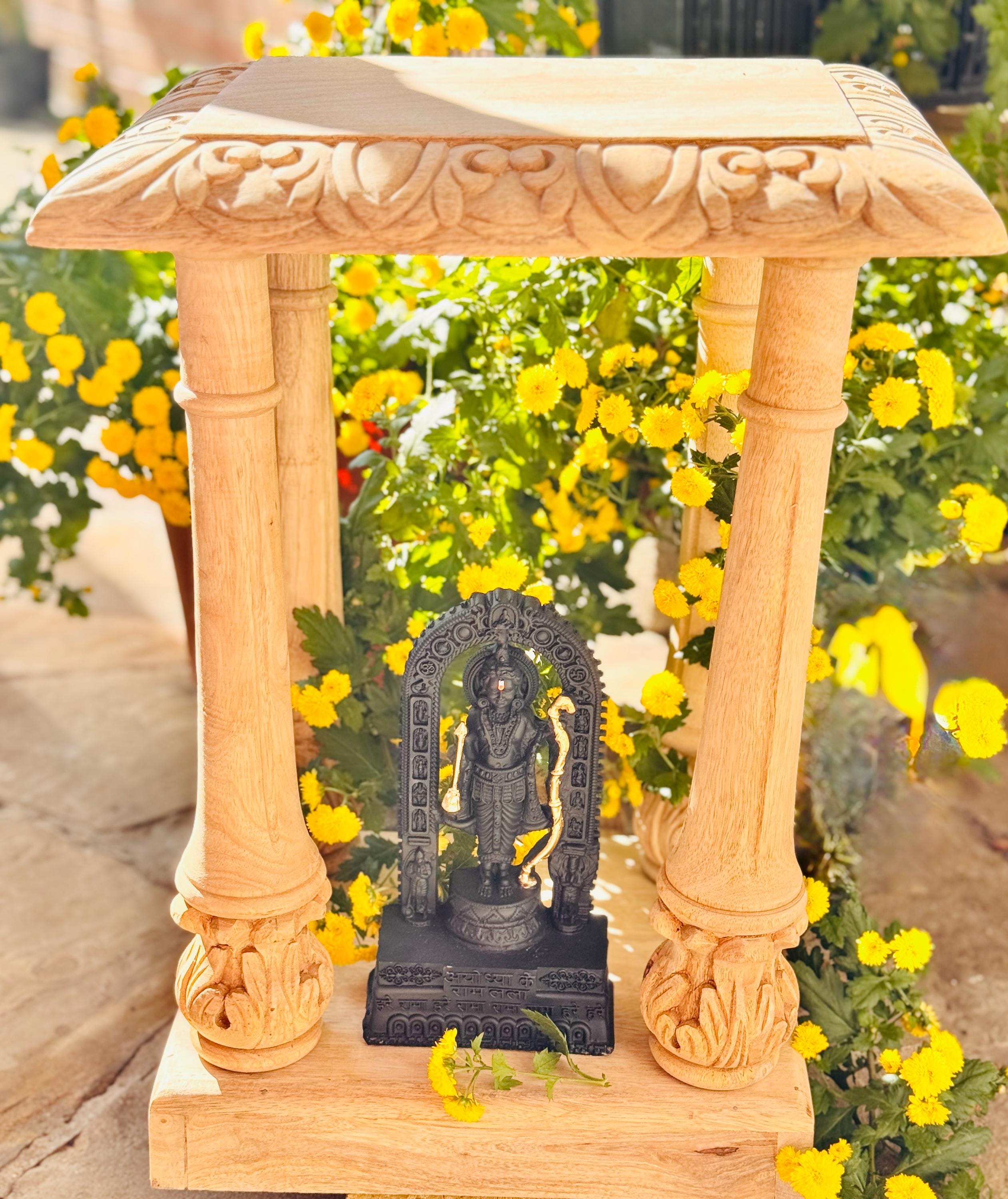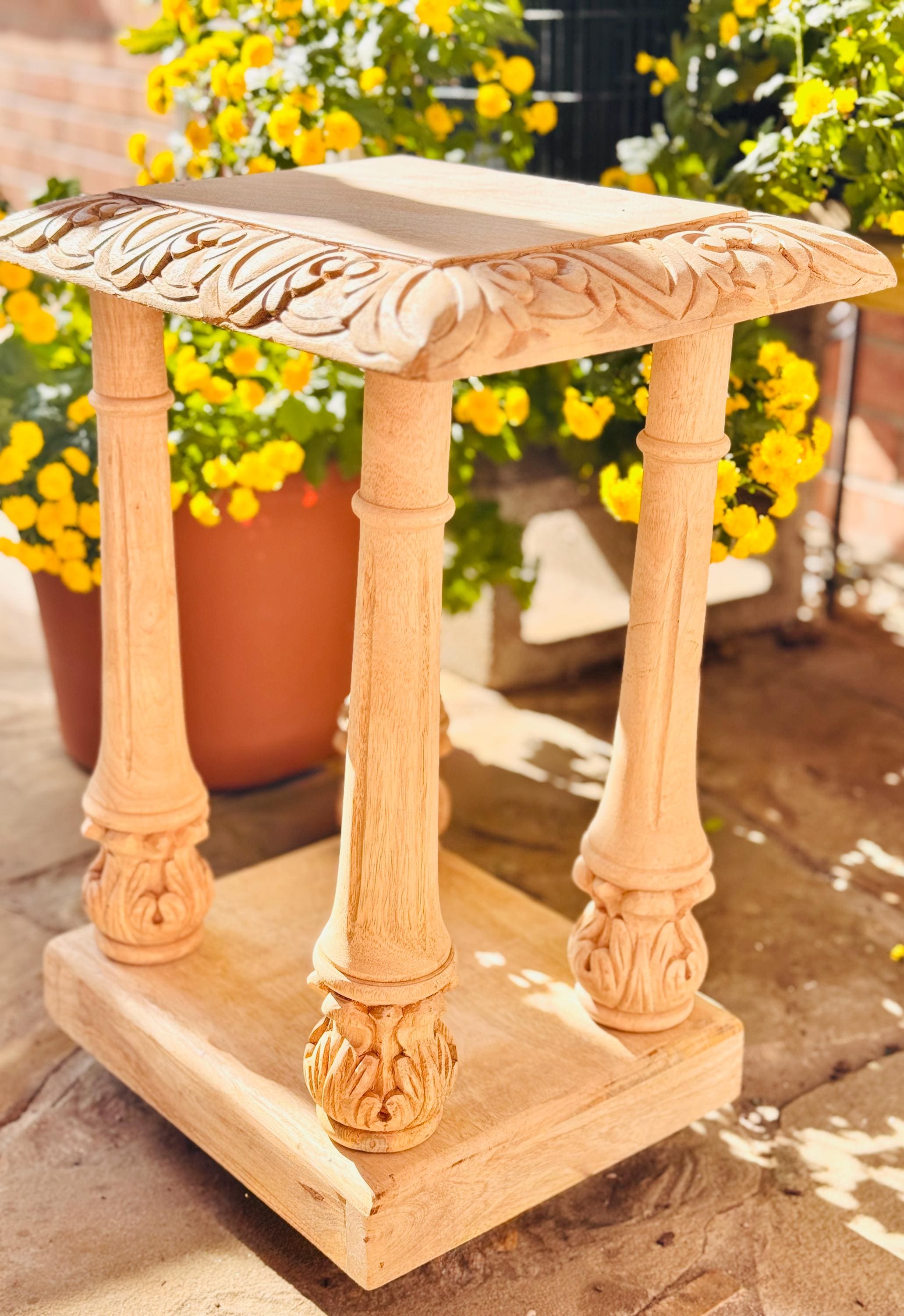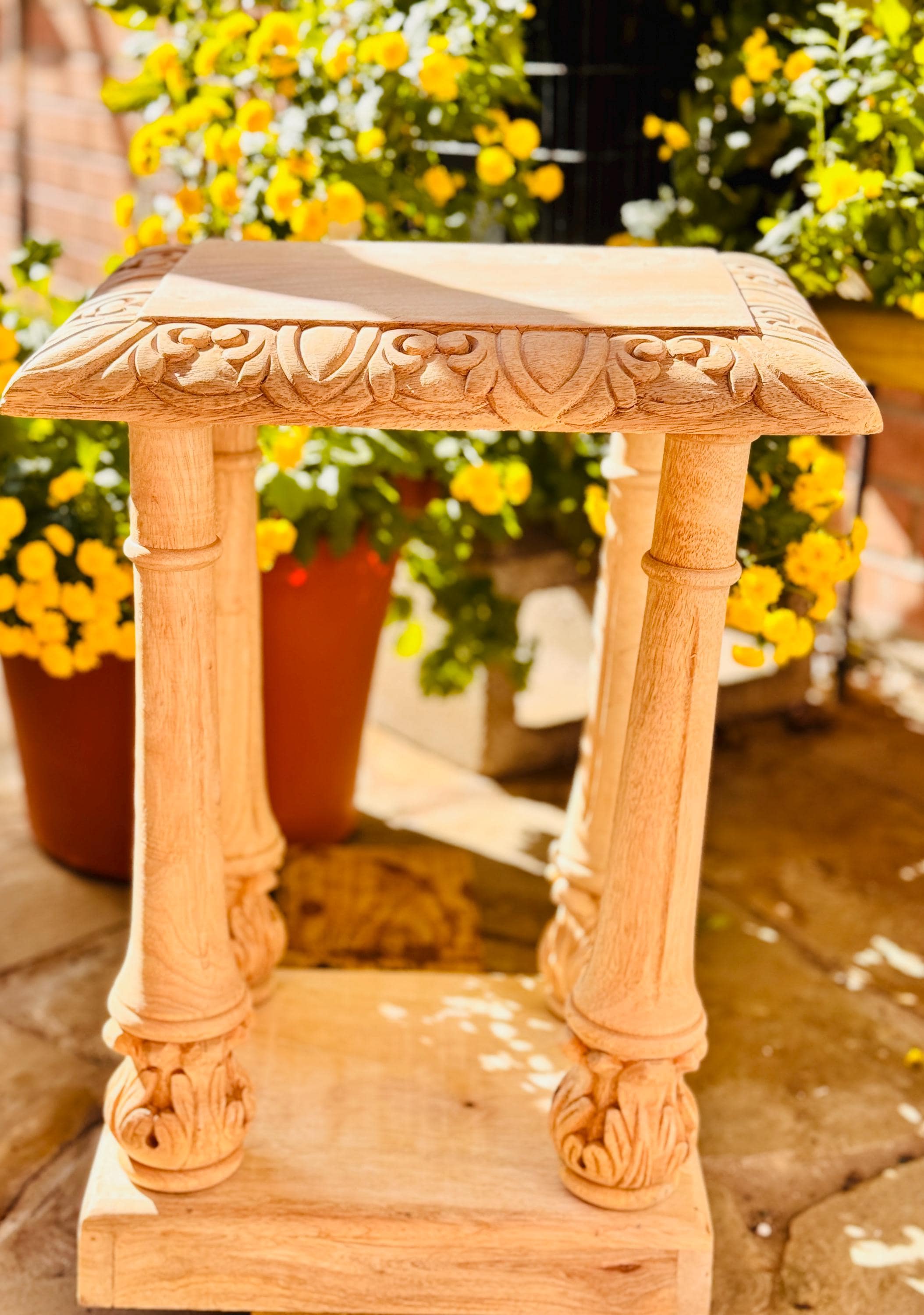 Hand-Carved Wooden Mandir/Temple – Ornate design for Home /Housewarming gifts and more! Infuse your sacred space with timeless grace through this exquisitely hand-carved wooden mandir. Designed as a pedestal or table, it features intricate leaf and floral motifs that celebrate traditional artistry and divine elegance. - Artisanal Craftsmanship: Each edge and leg is adorned with detailed carvings—leaf-like patterns along the top and floral flourishes at the base—showcasing heritage woodwork at its finest. - Elevated Design: The square top offers a perfect platform for idols, diyas, or ritual setups, while the sturdy carved legs rest on a square base for balanced elevation. - Natural Setting: Ideal for indoor use only, this mandir pairs beautifully with terracotta pots, fresh flowers, and earthy decor. - Versatile Use: Use it as a puja/prayer table, idols/figurines stand, or a beautiful centerpiece for holiday display