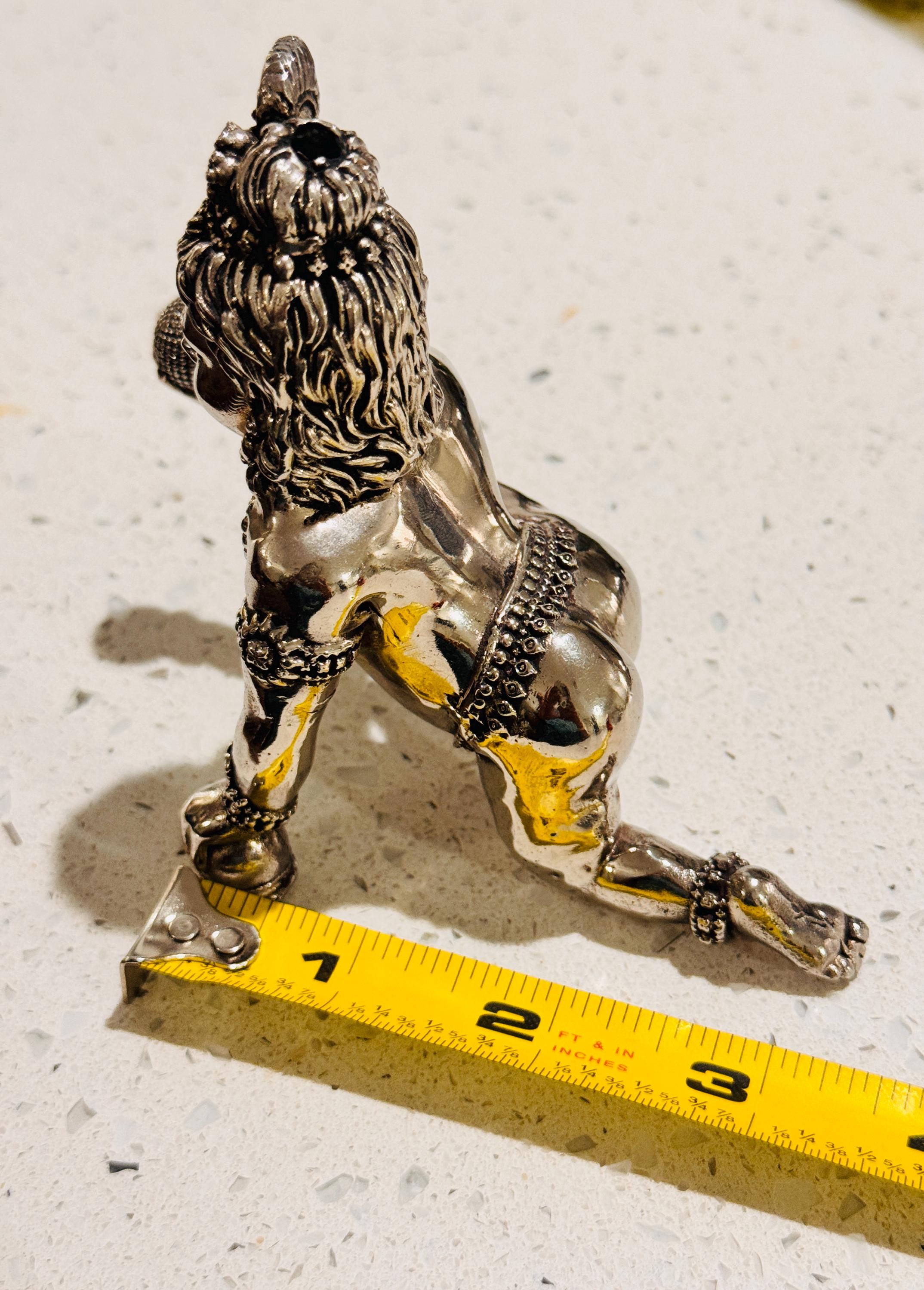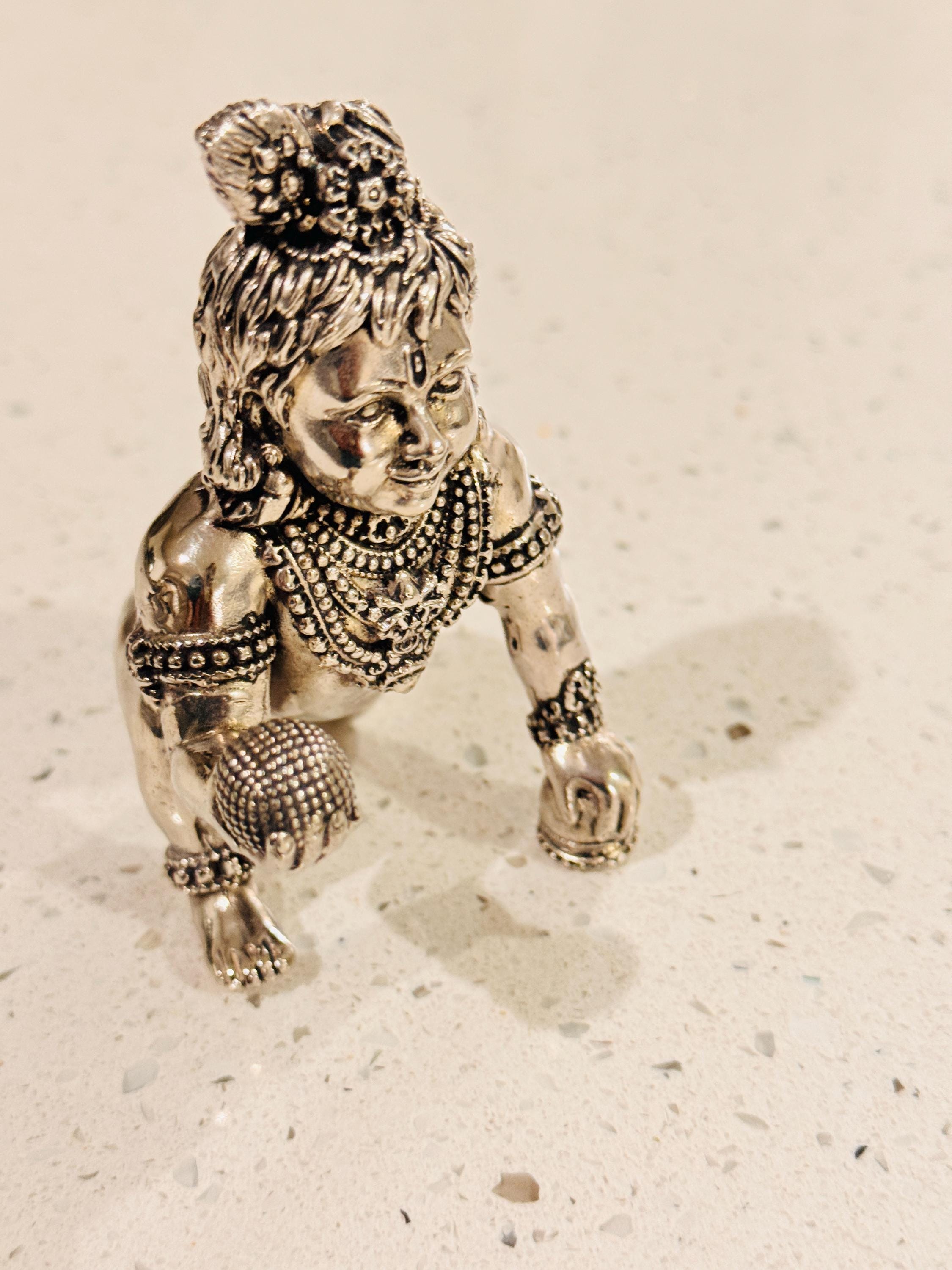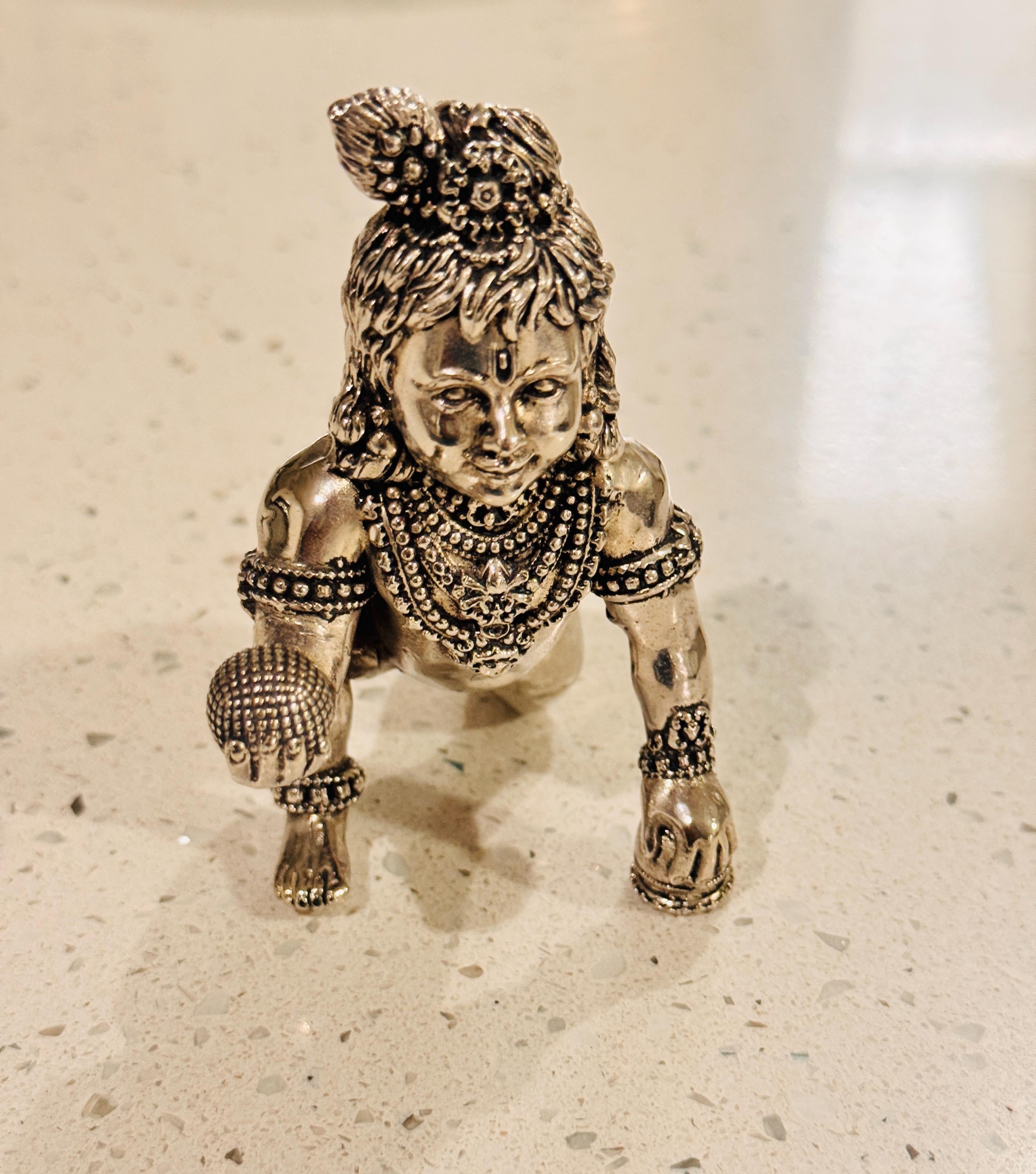 Vibrant German silver idol of baby Krishna/crawling Krishna. Use in prayer room or for gifting for your loved ones. High quality German silver/tarnish resist. Premium Antique finish for long lasting shine/finish.